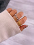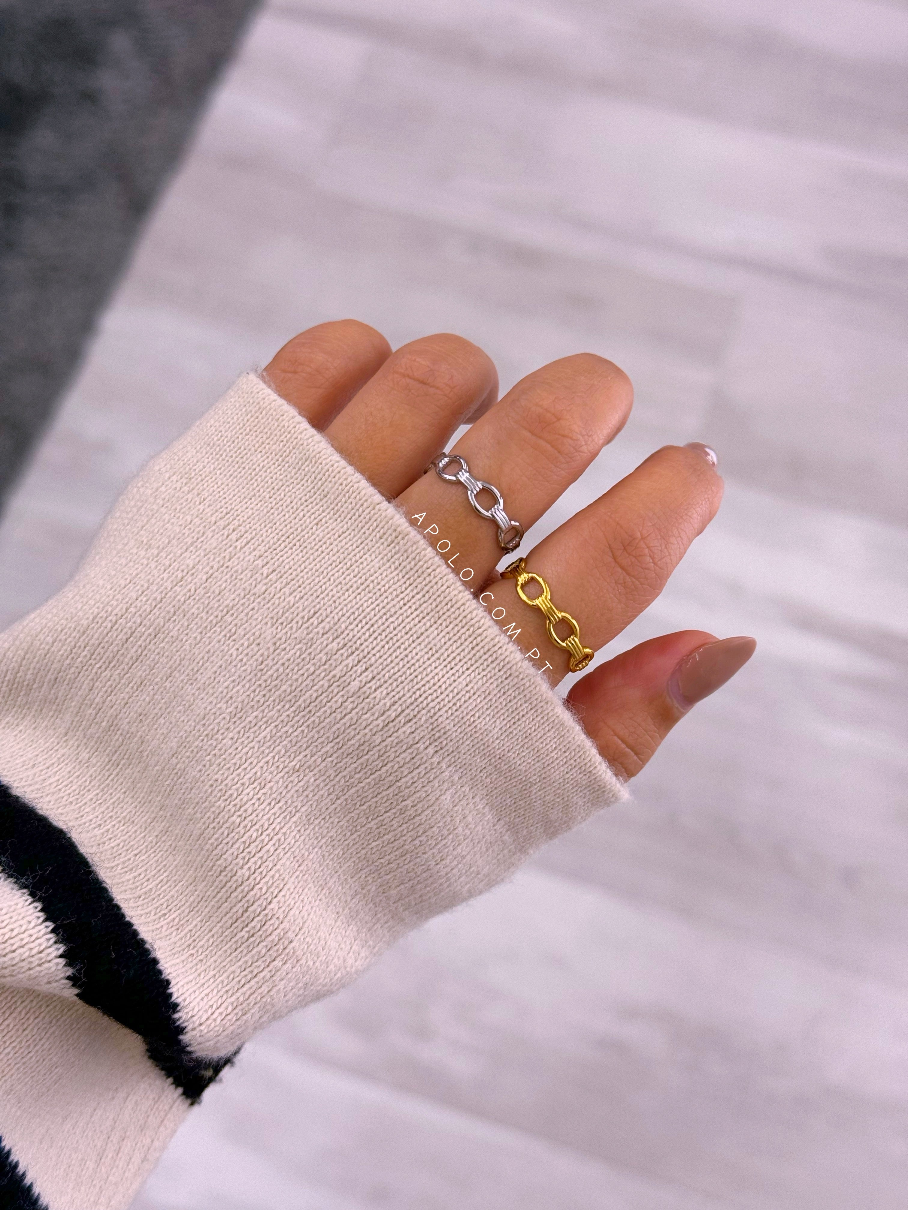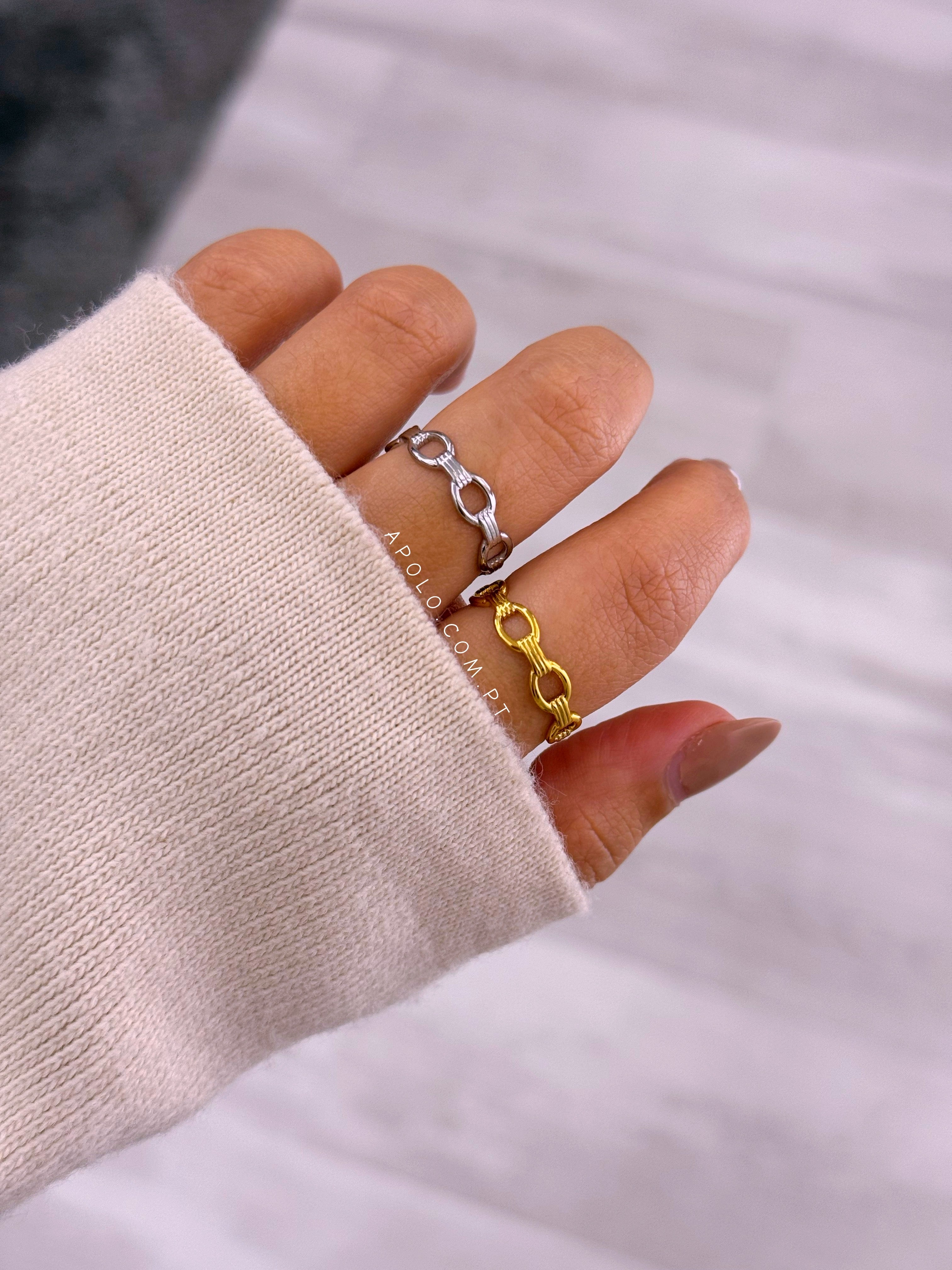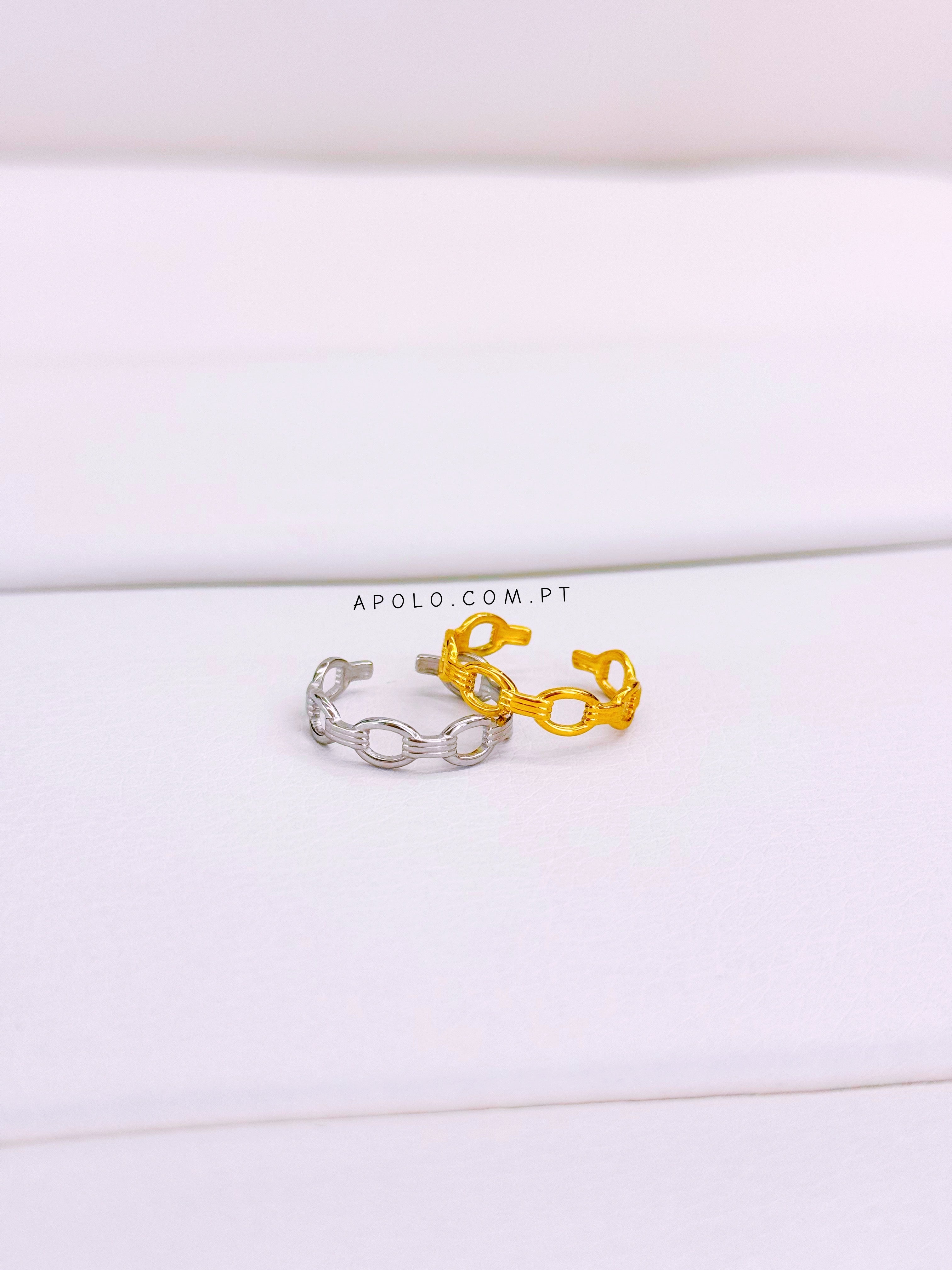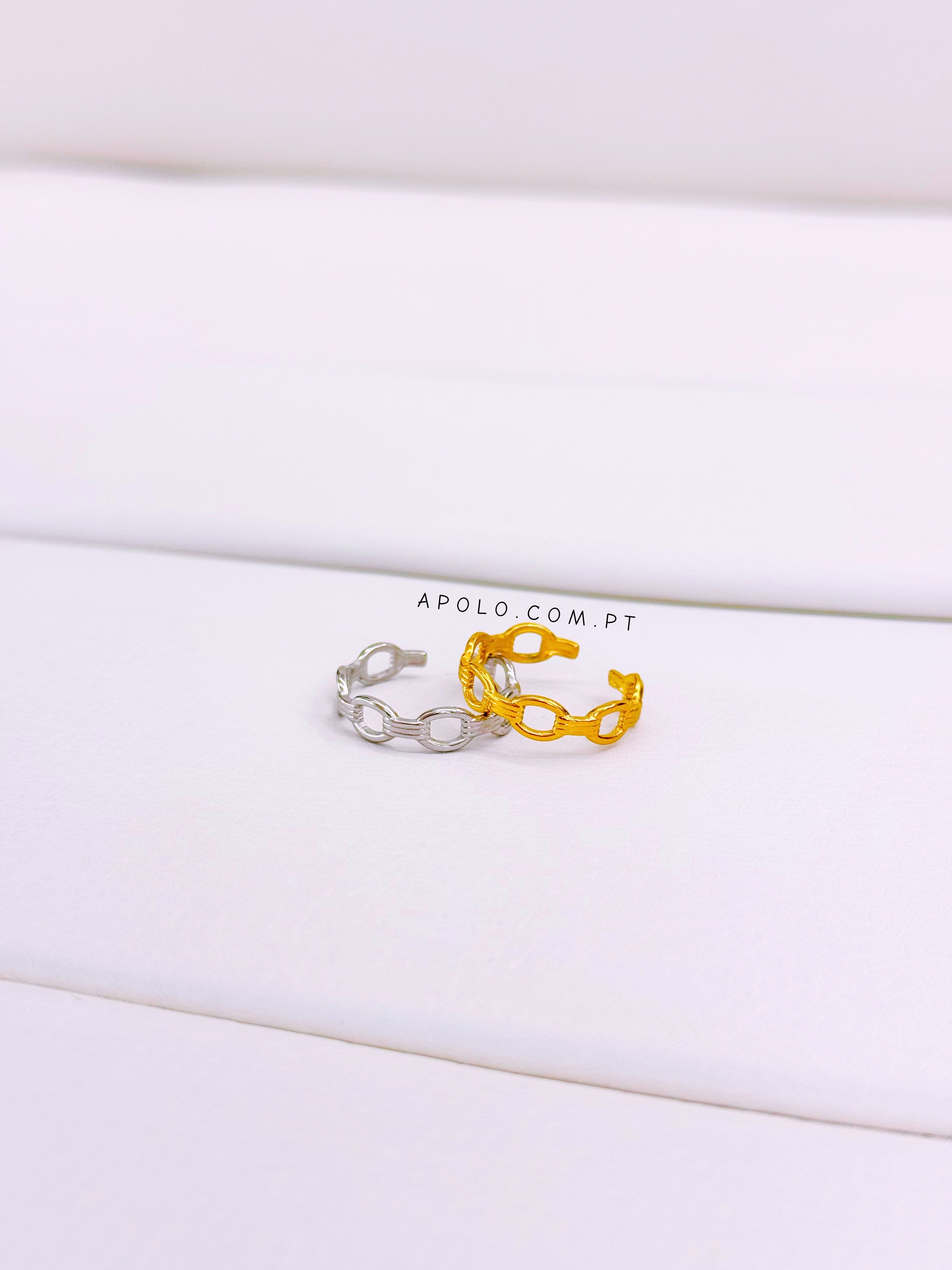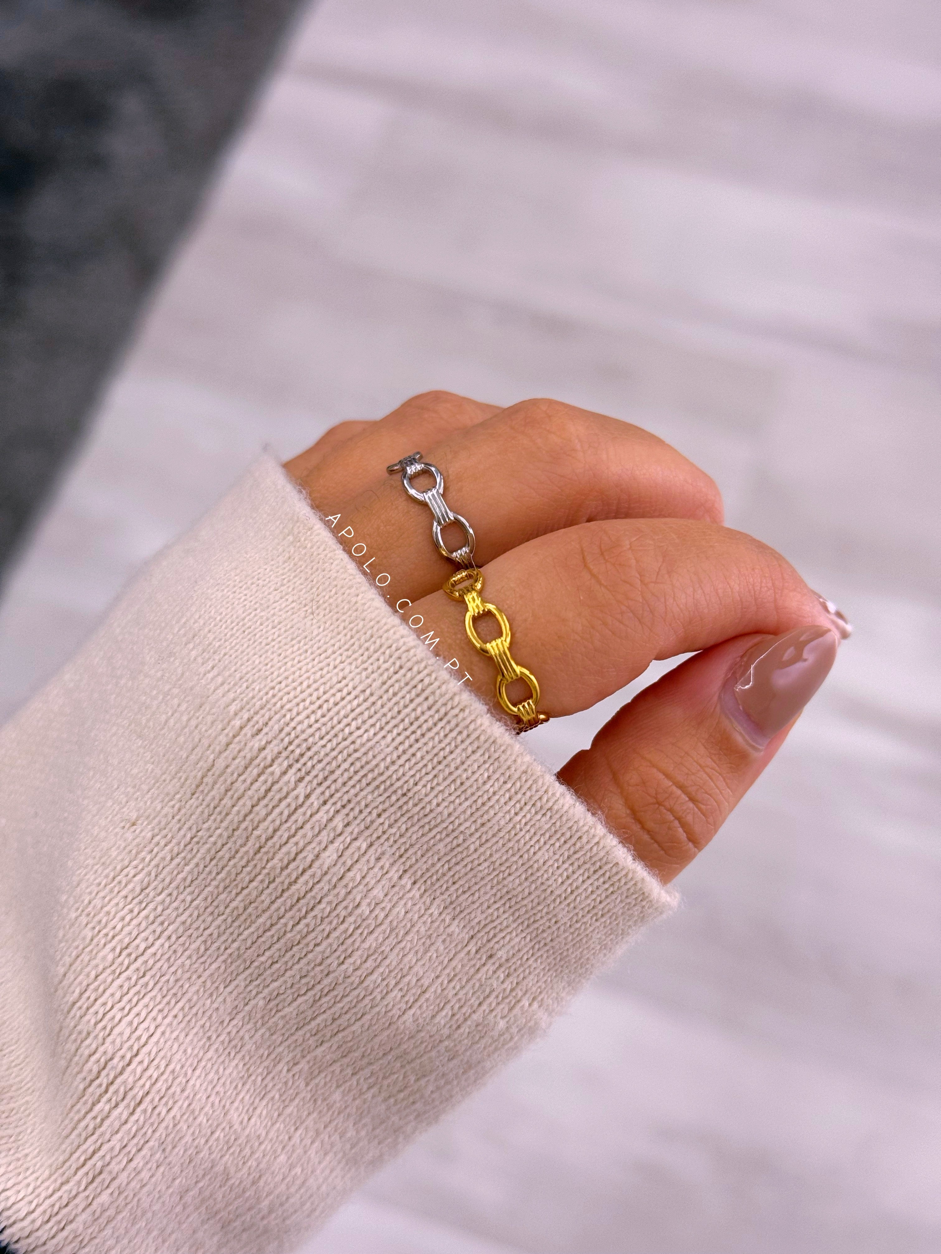 Anel ajustável com efeito de corrente oval, unida com pormenores em relevo  – com 0,4 mm de espessura.