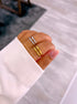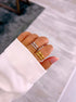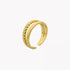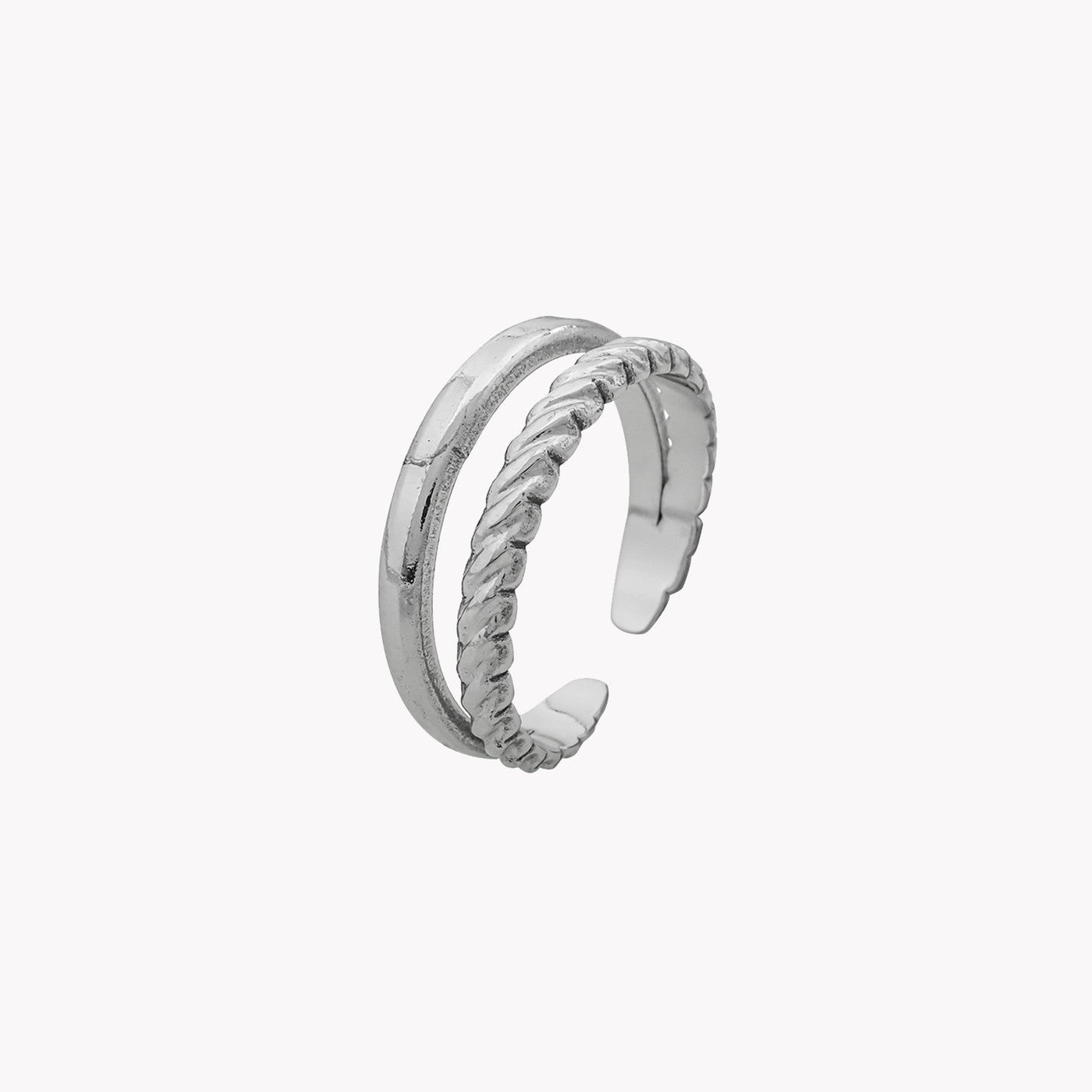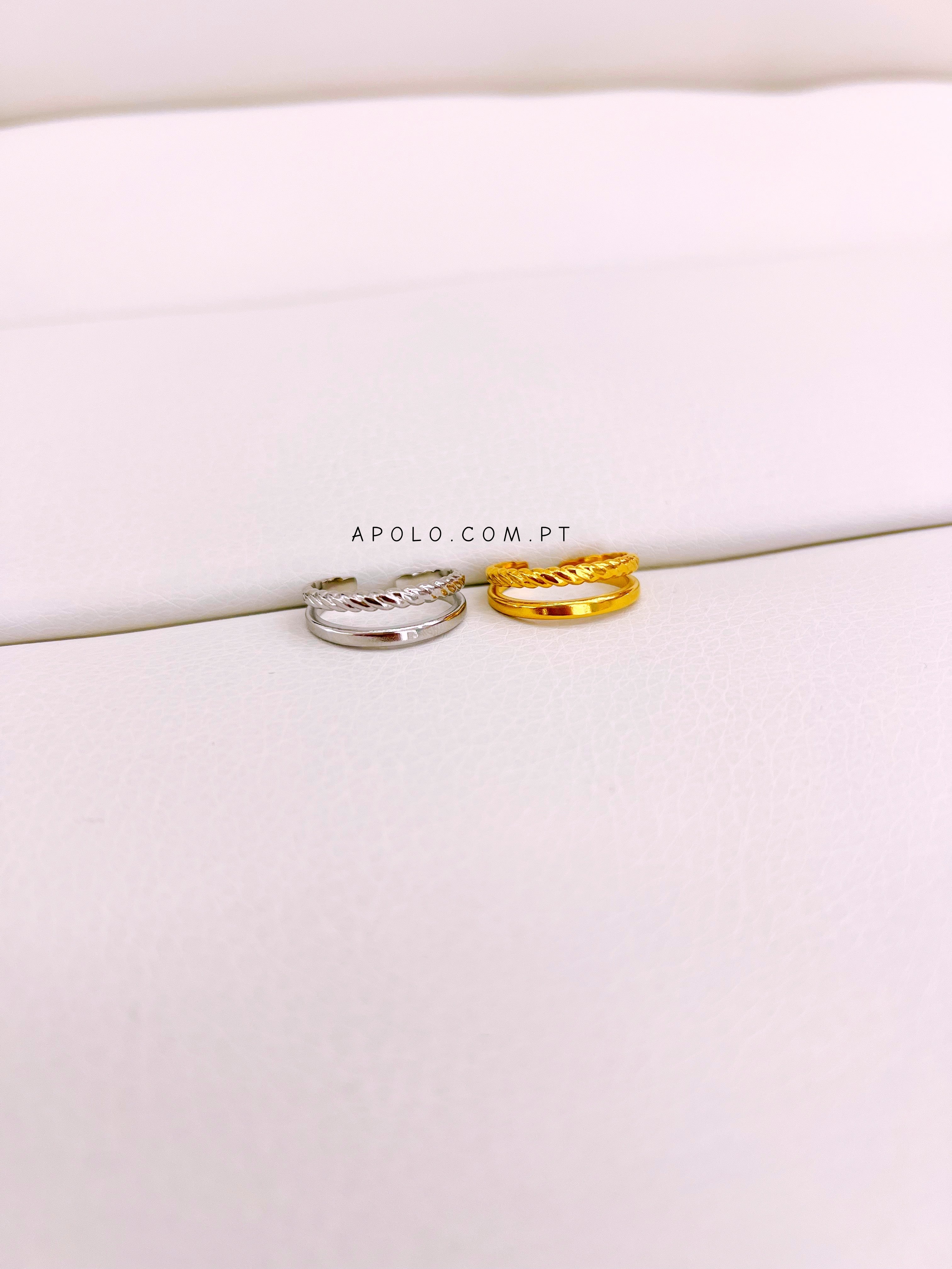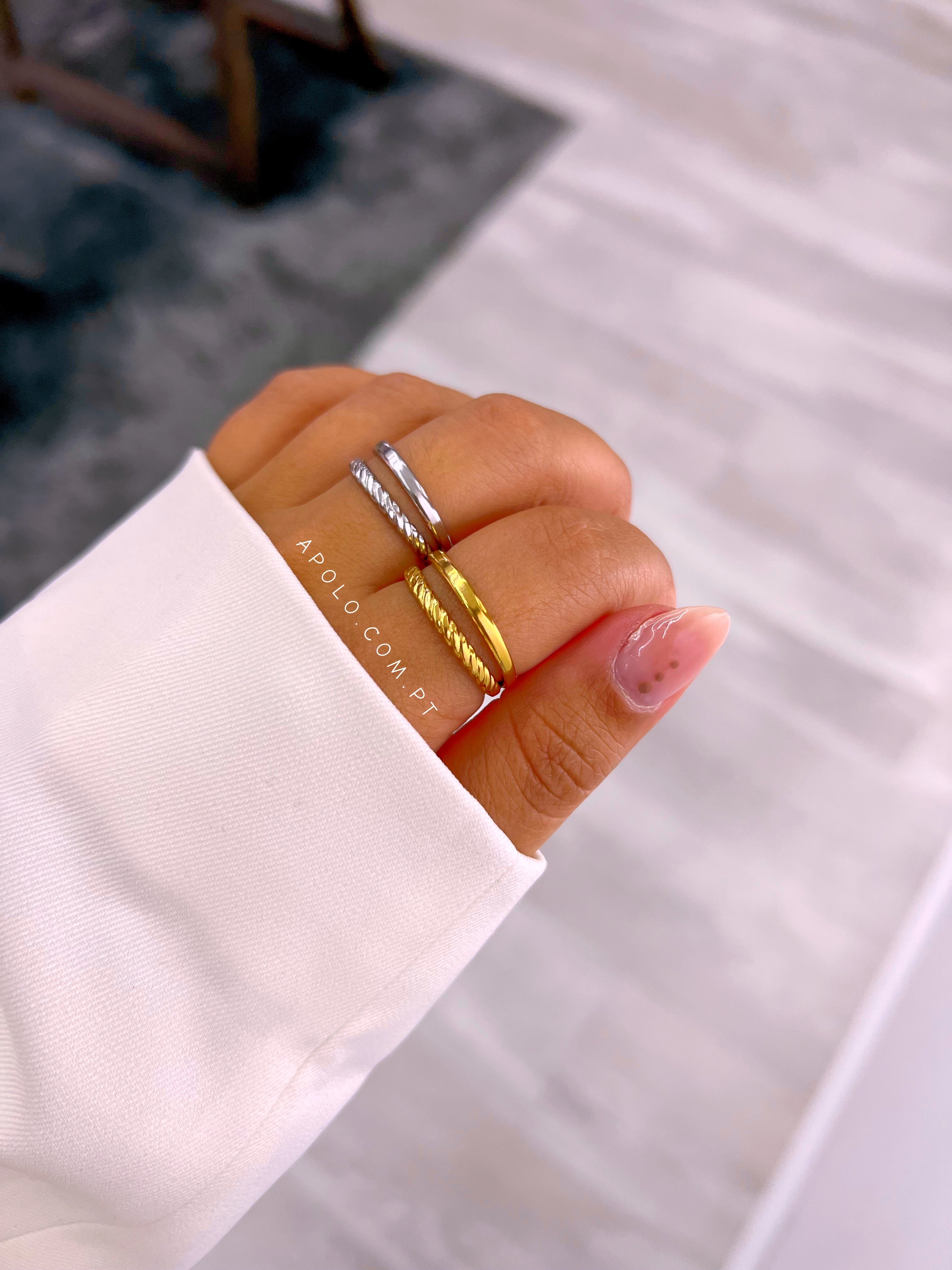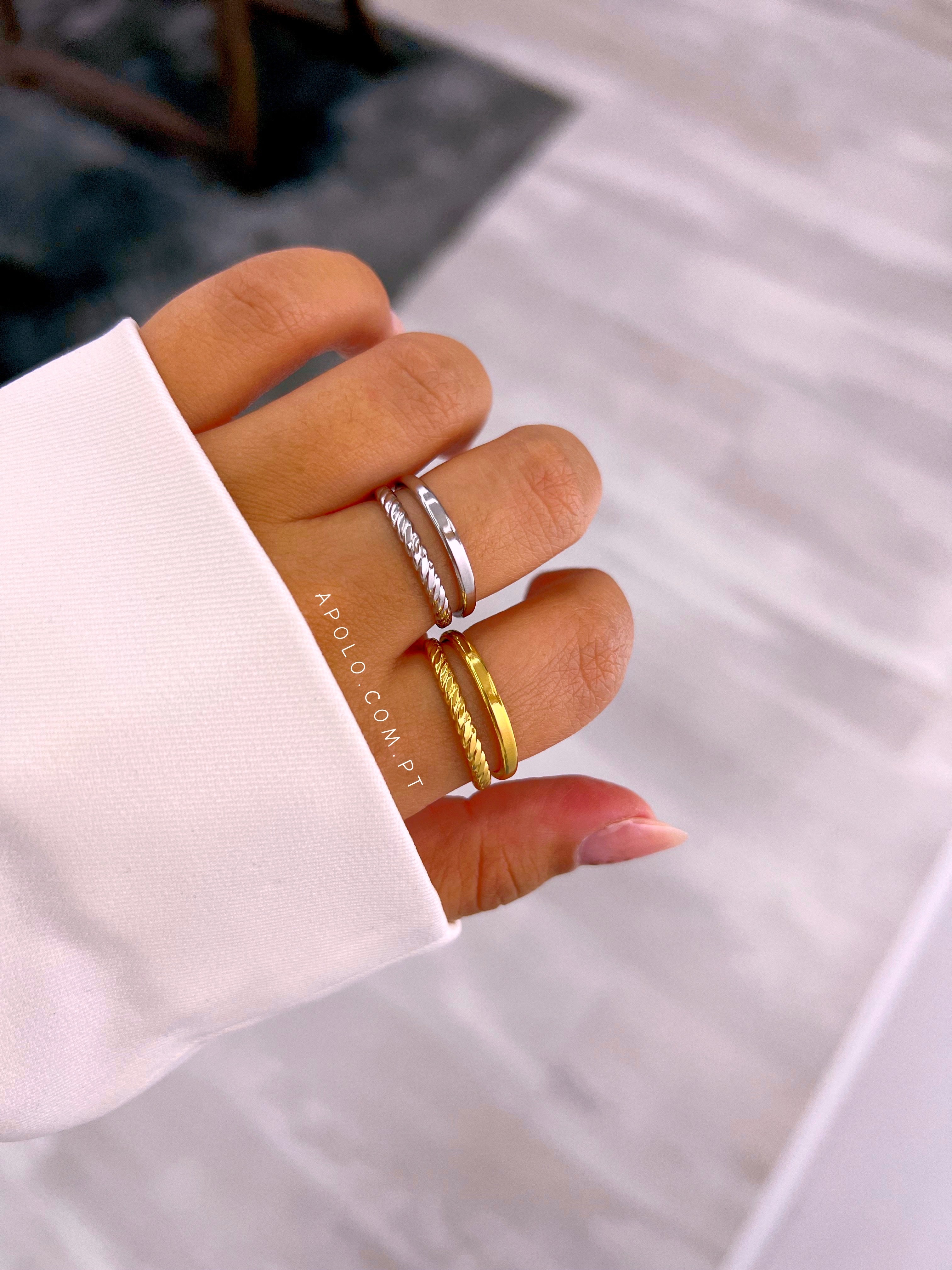 Anel com efeito duplo, num aro é lisinho e no outro tem um efeito torcido com relevos.
