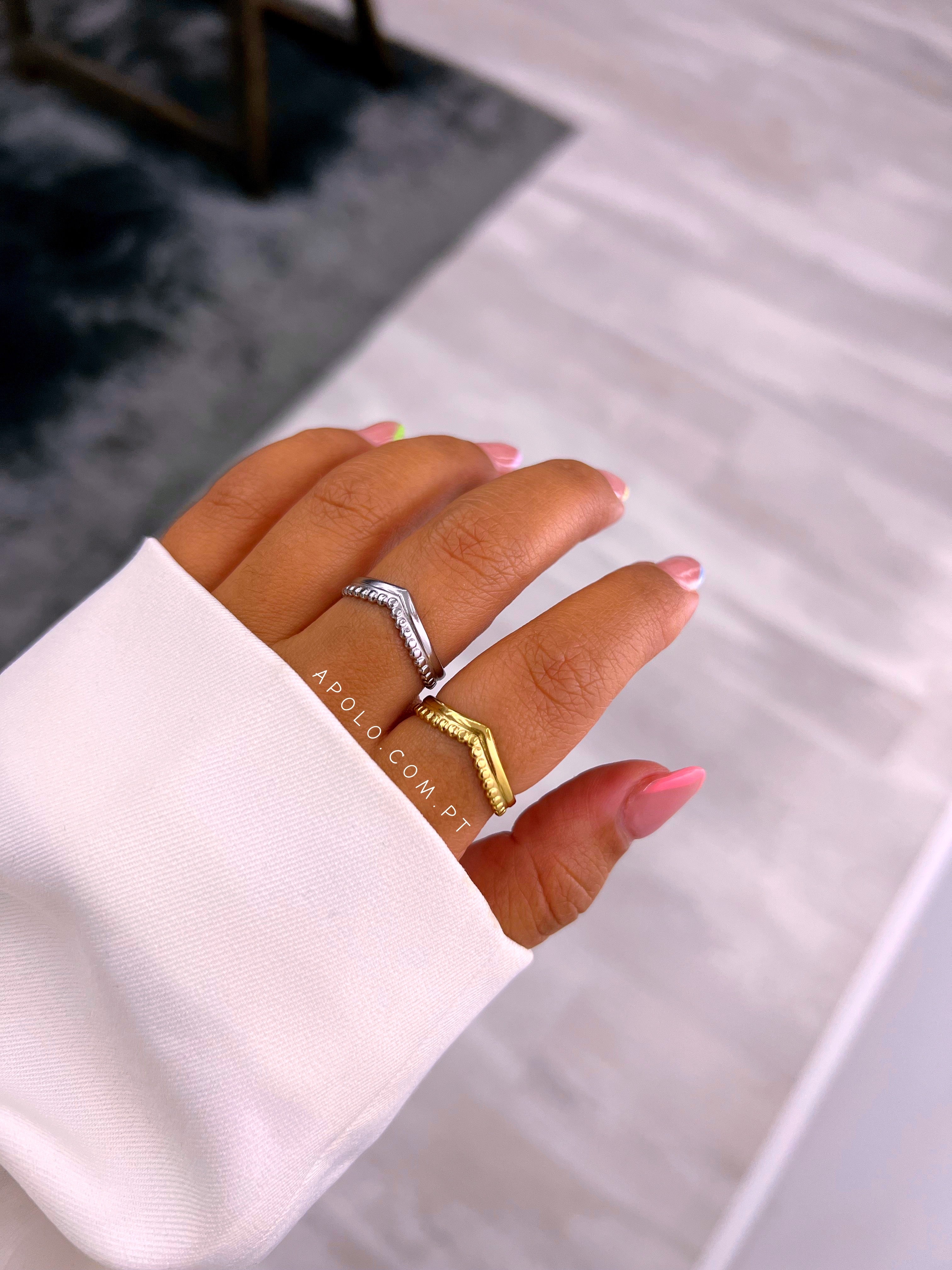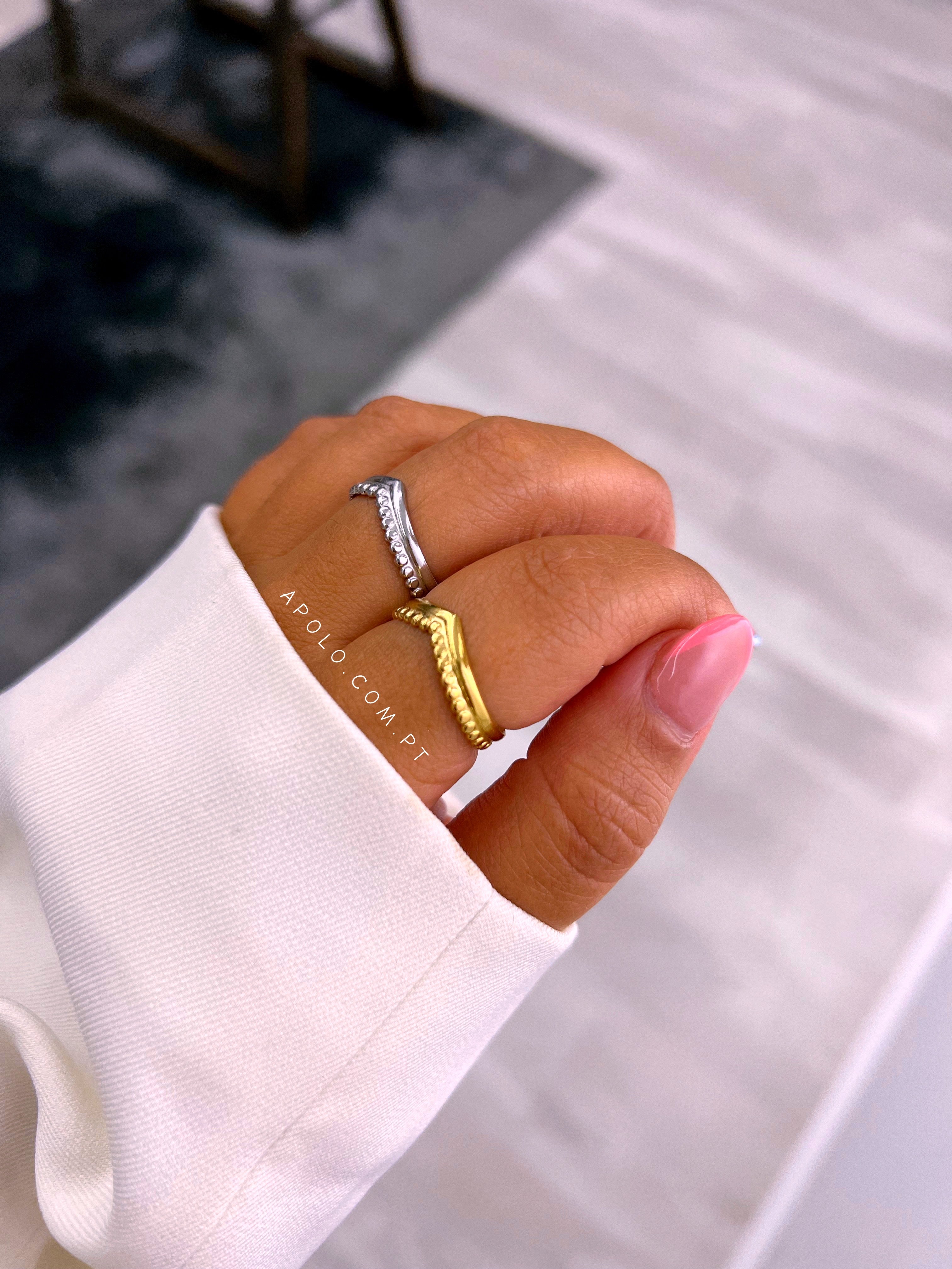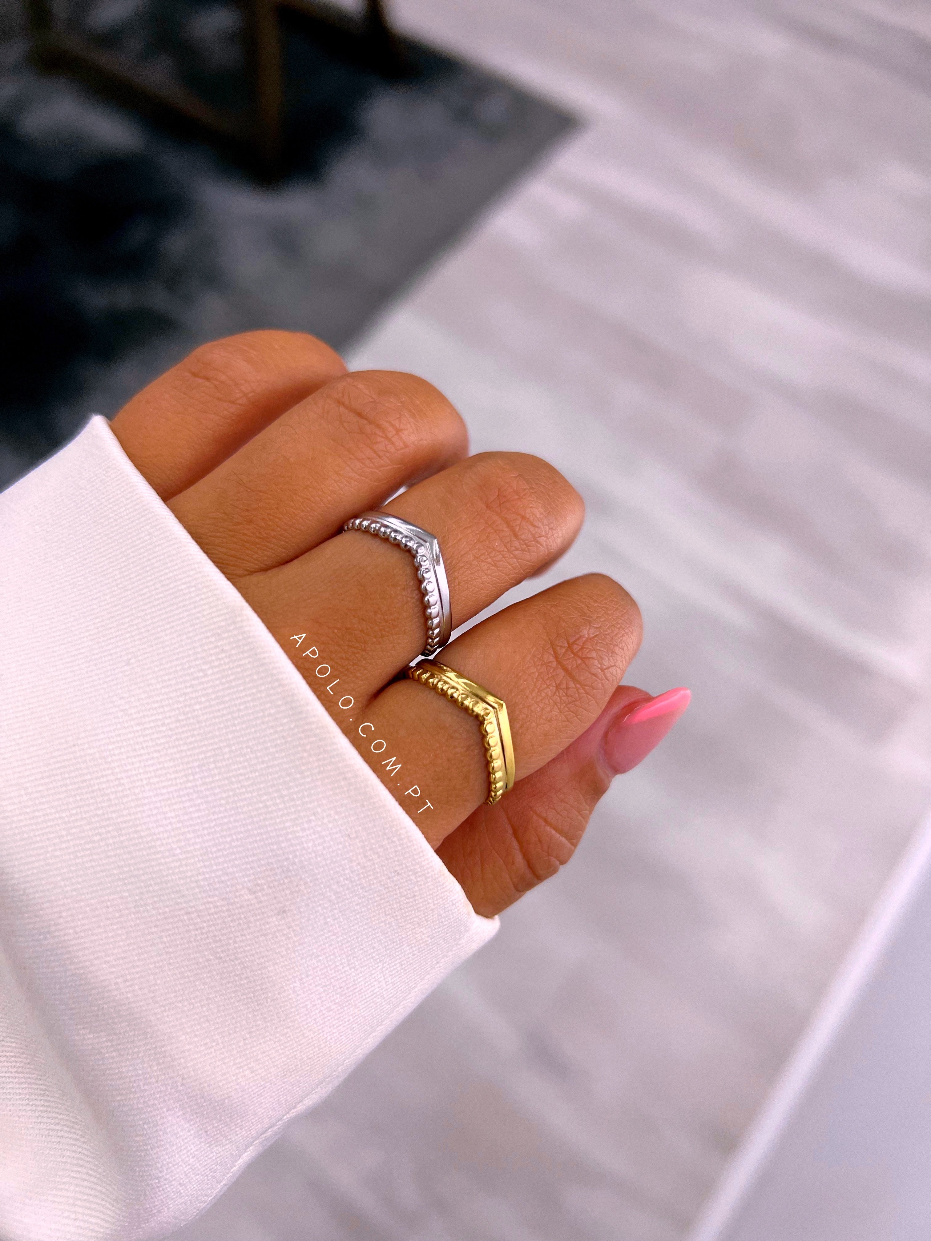 Anel ajustável com efeito de duplo bico, uma parte lisinha e a outra com bolinhas pequeninas.