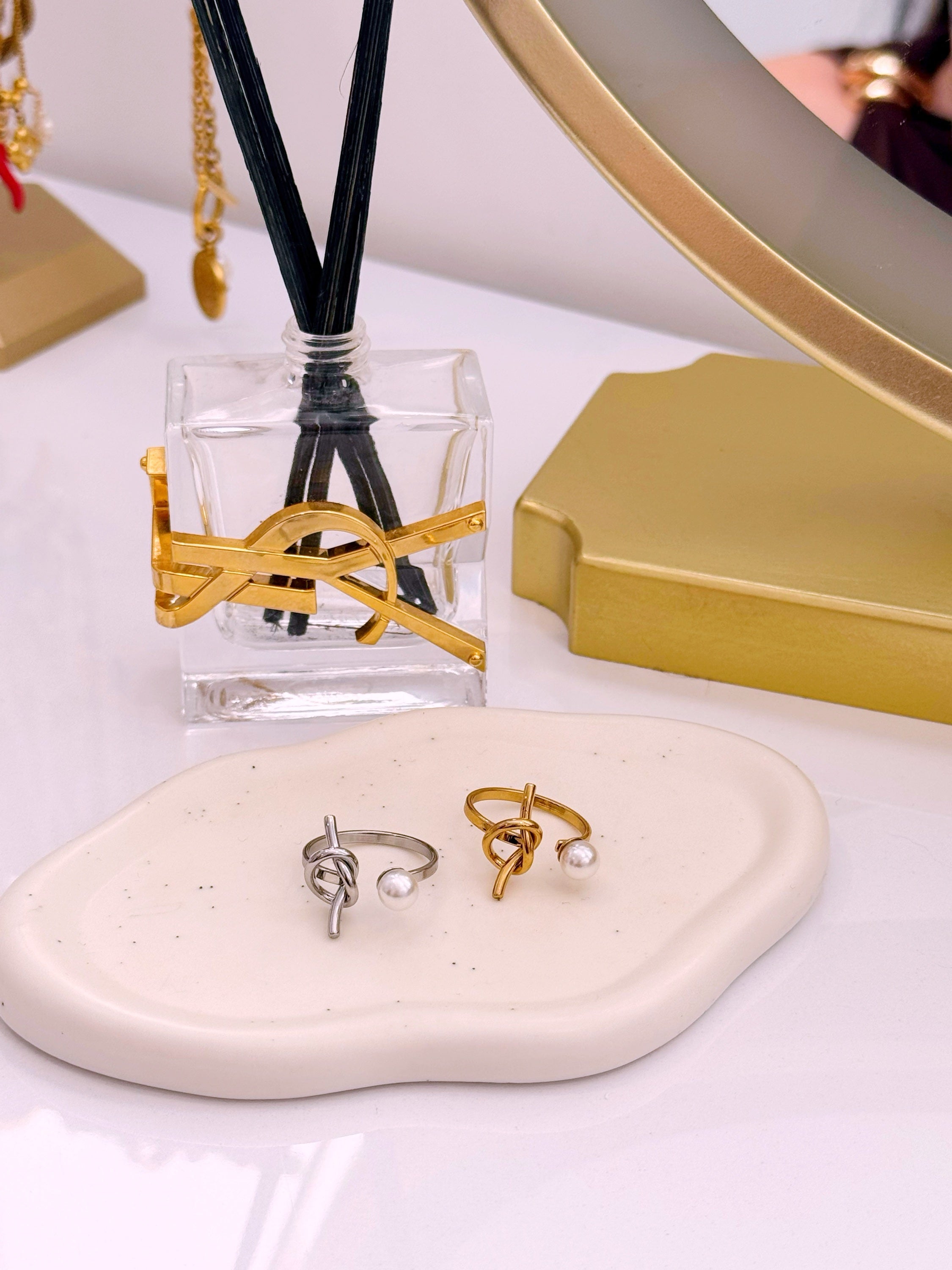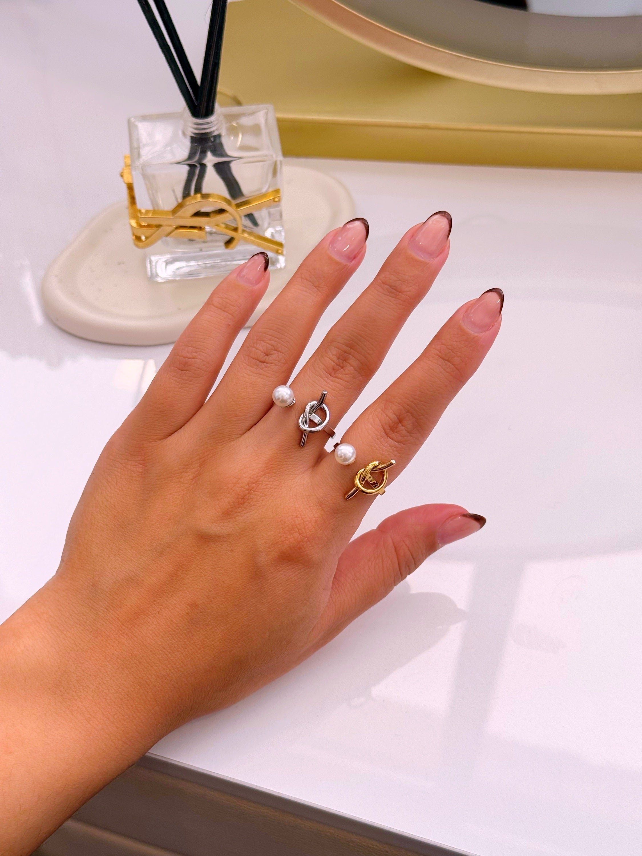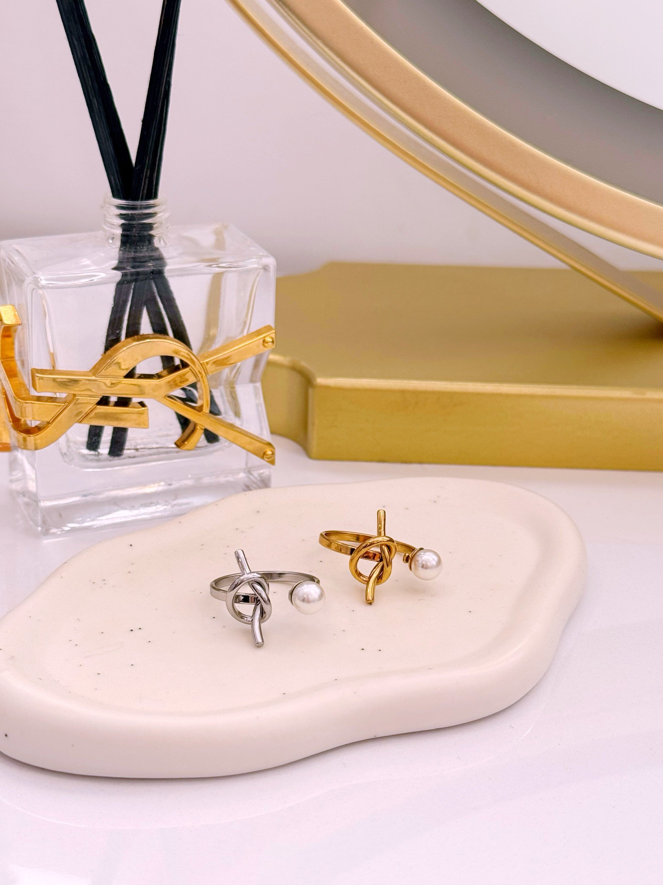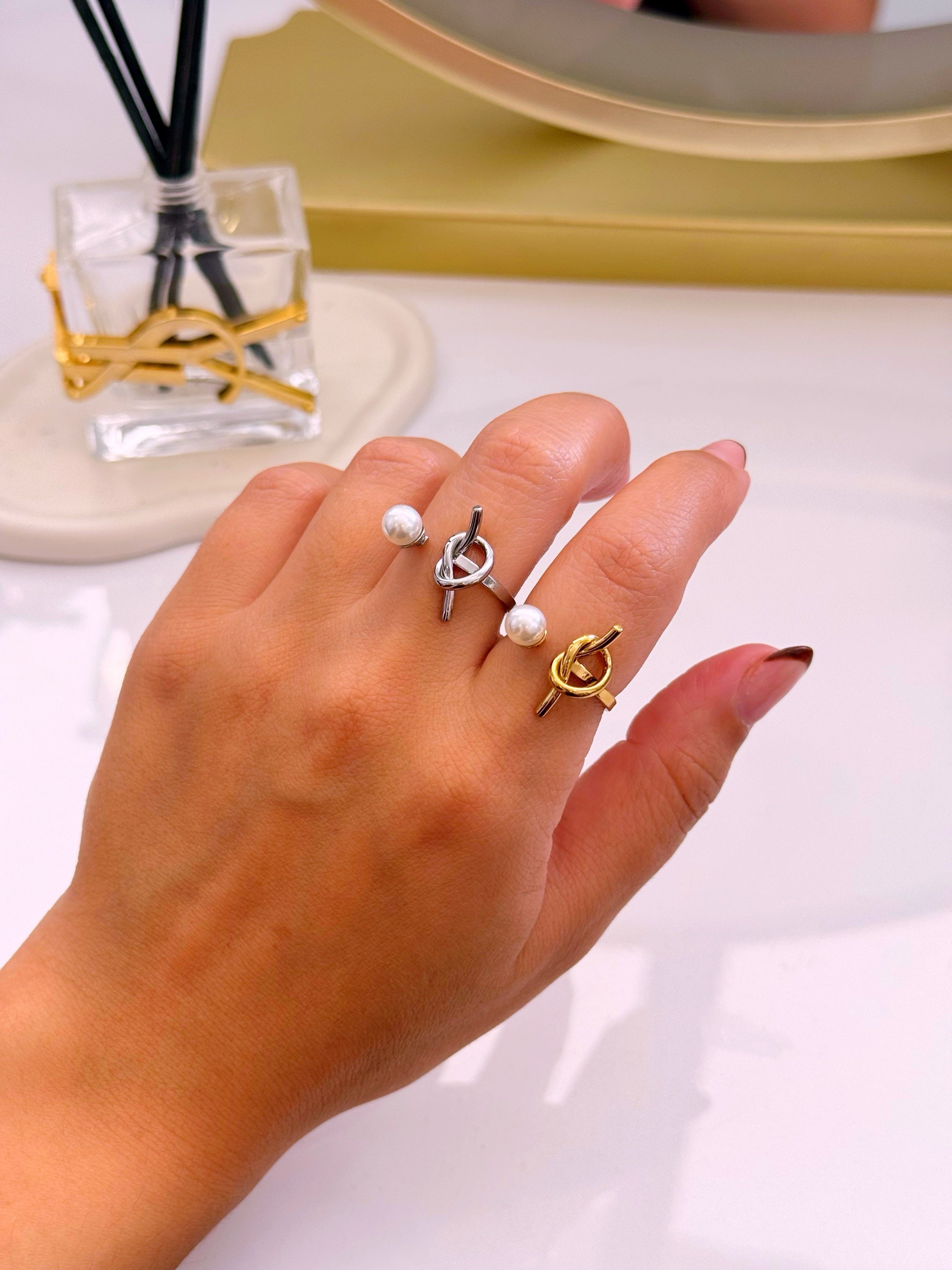 Anel ajustável efeito nó e pérola | 2 Cores