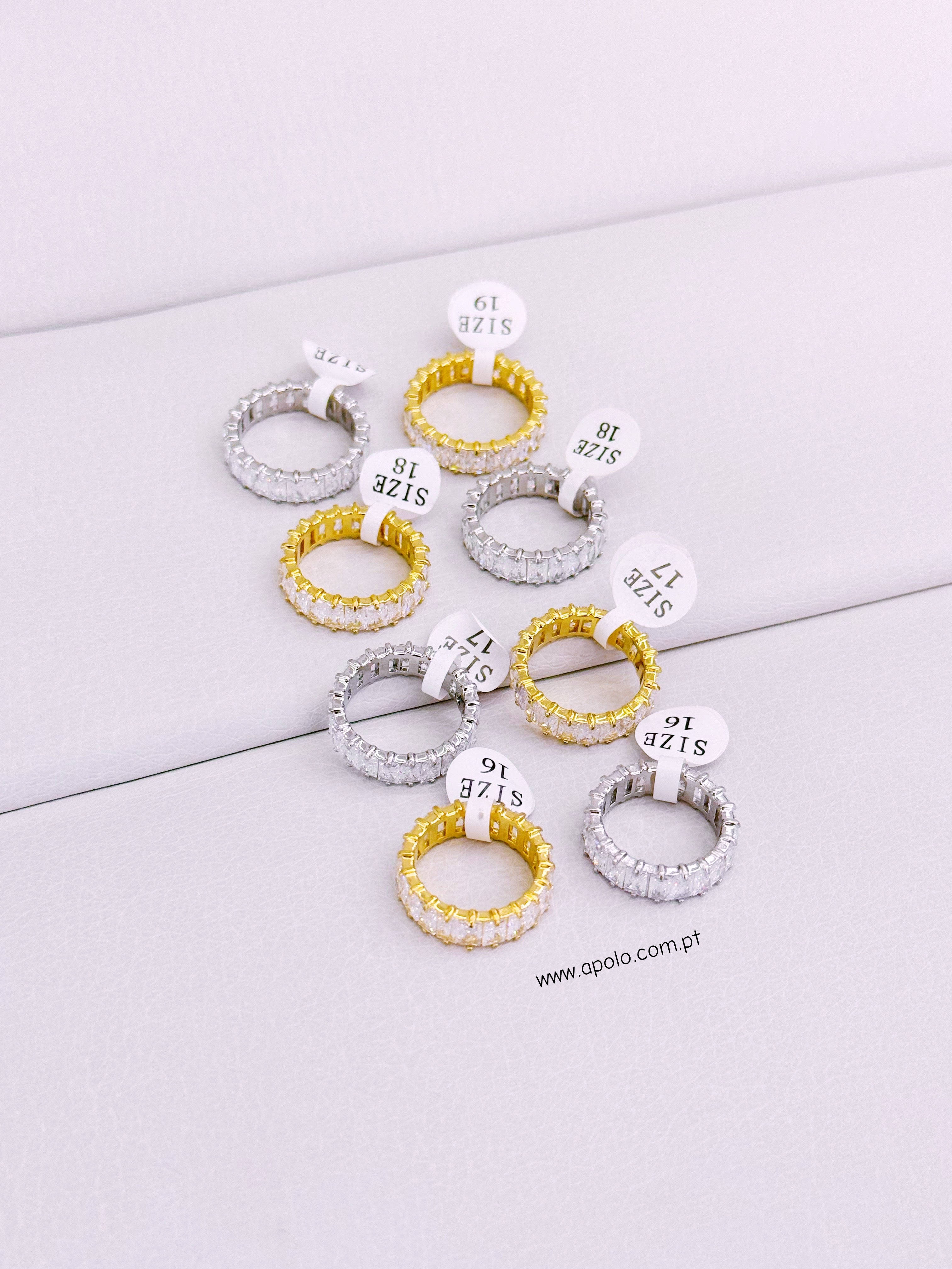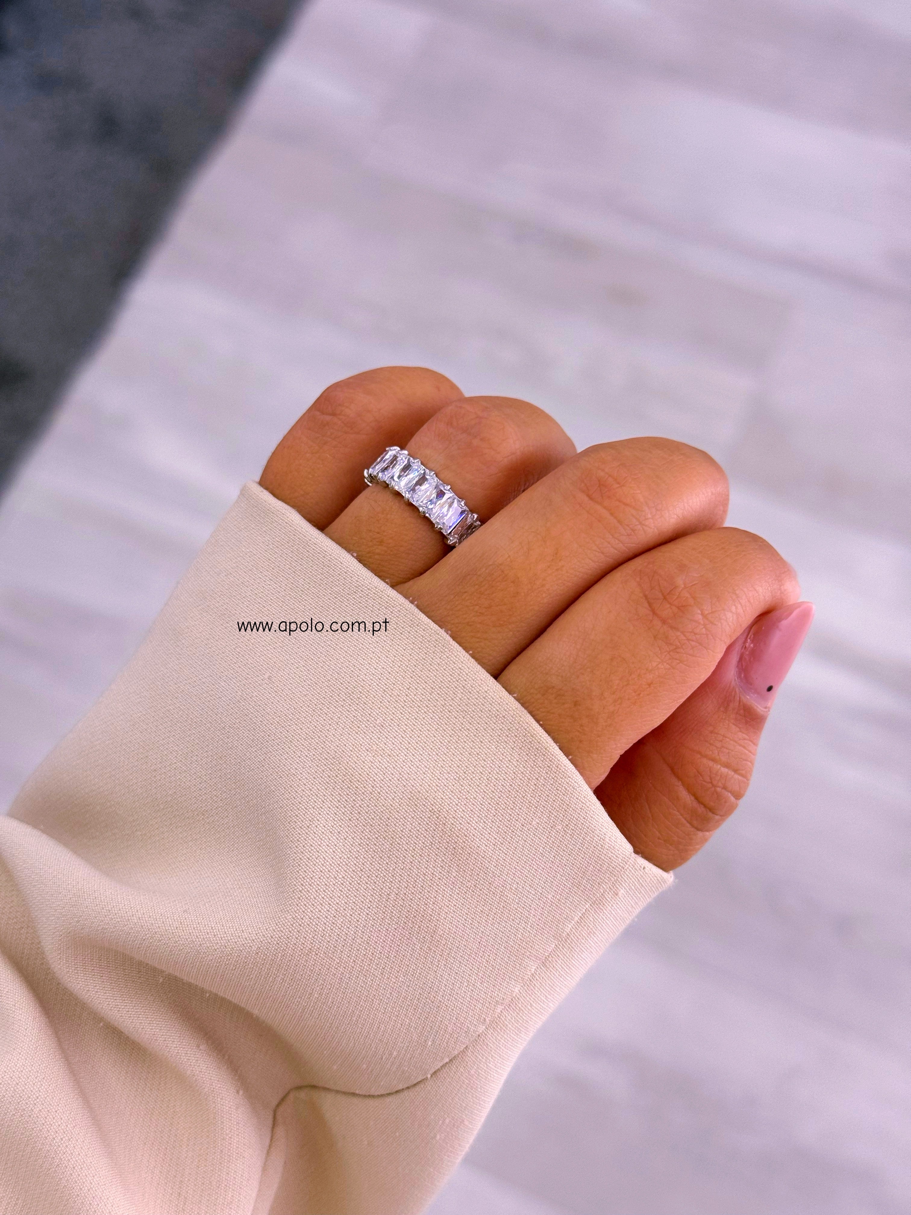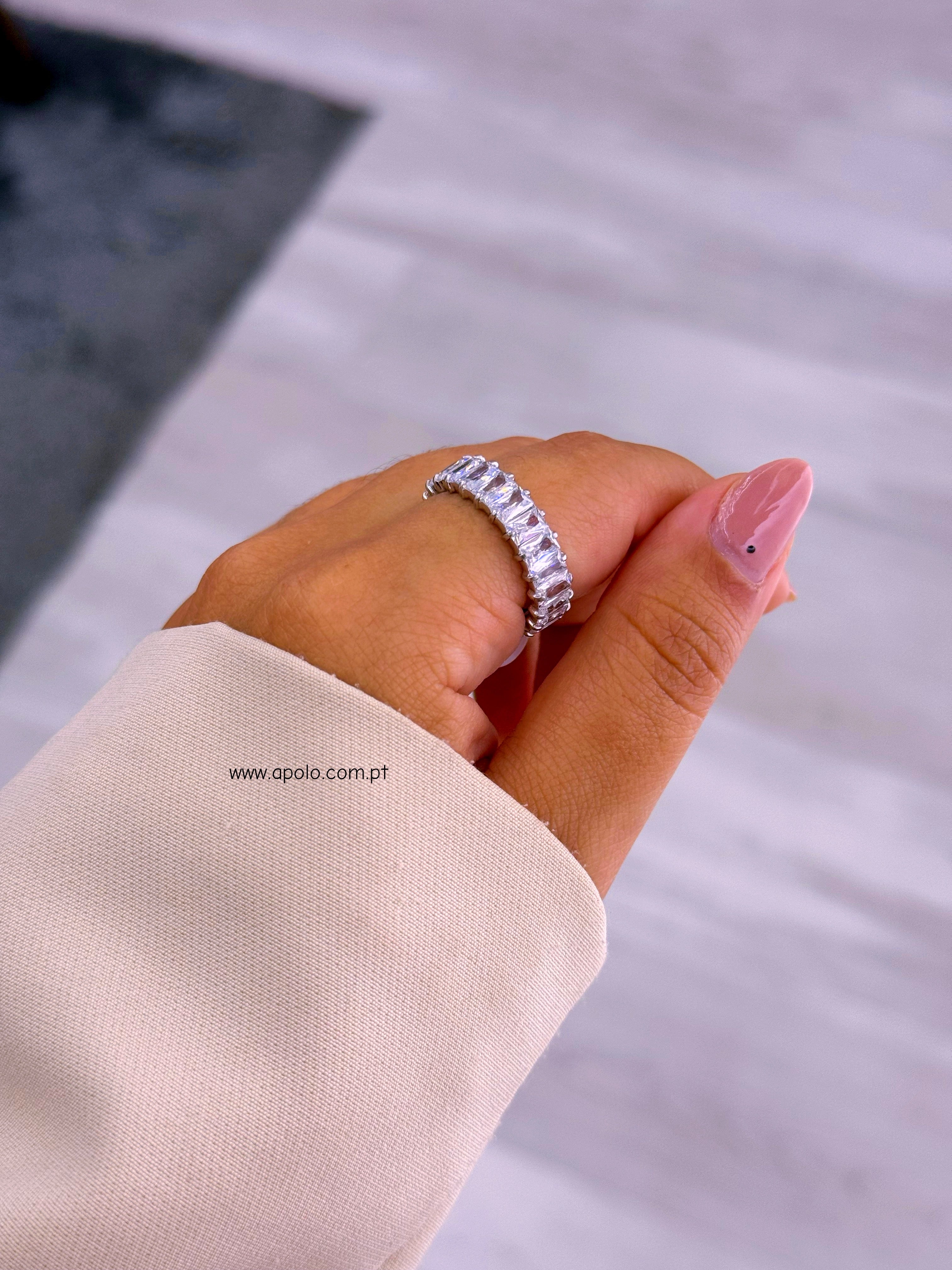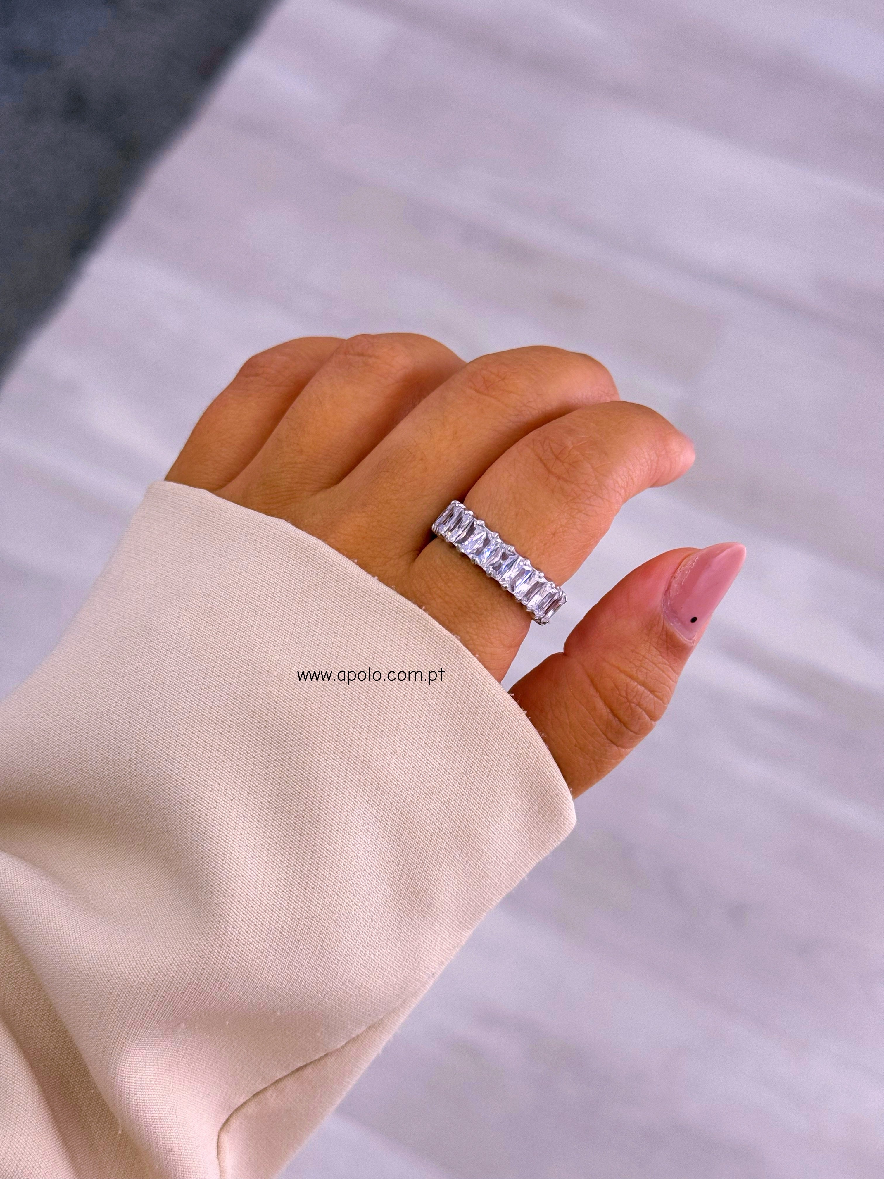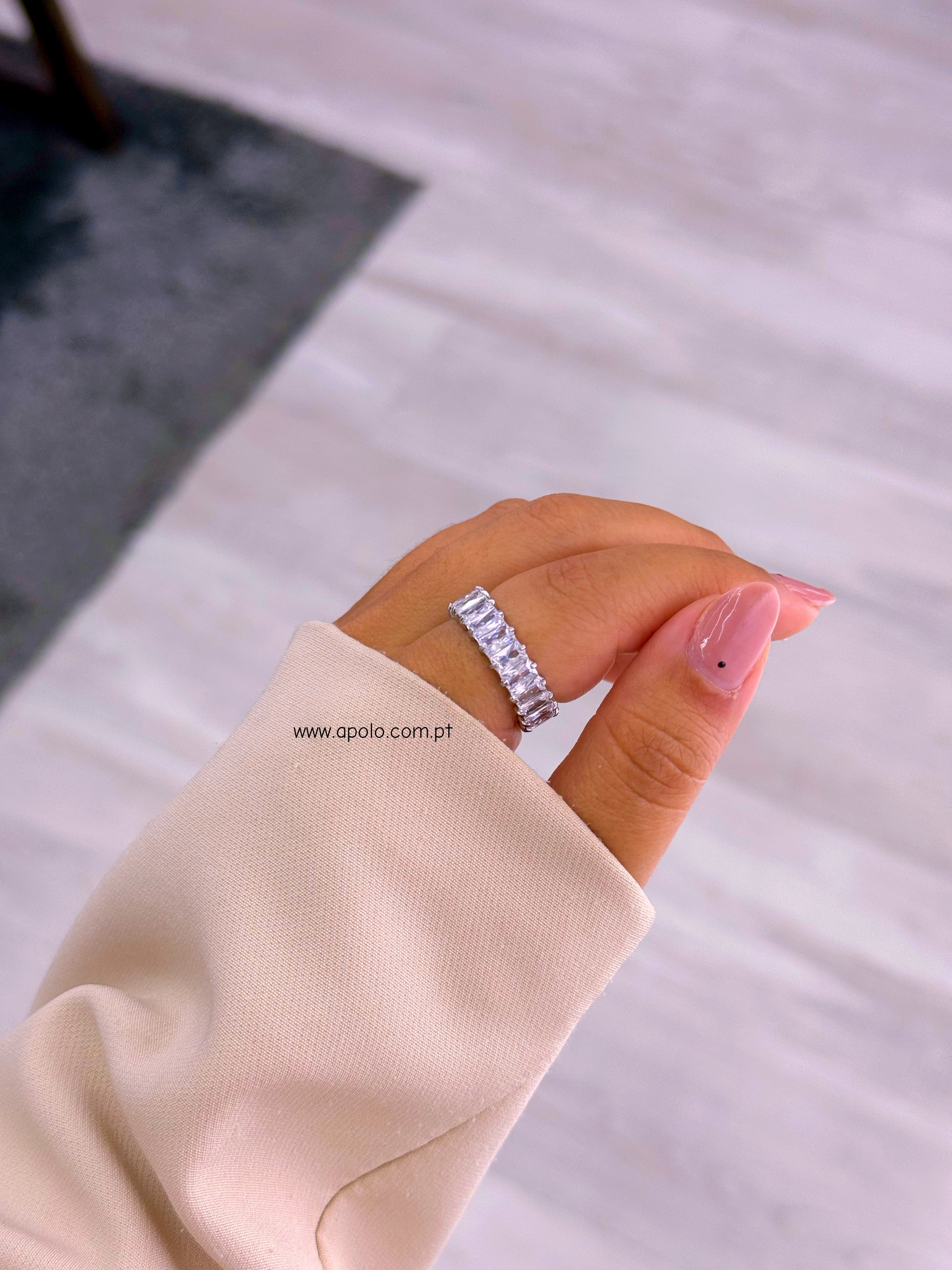 Anel em aço inoxidável, de qualidade e acabamento superior à média, preenchido com cristais brilhantes retangulares.