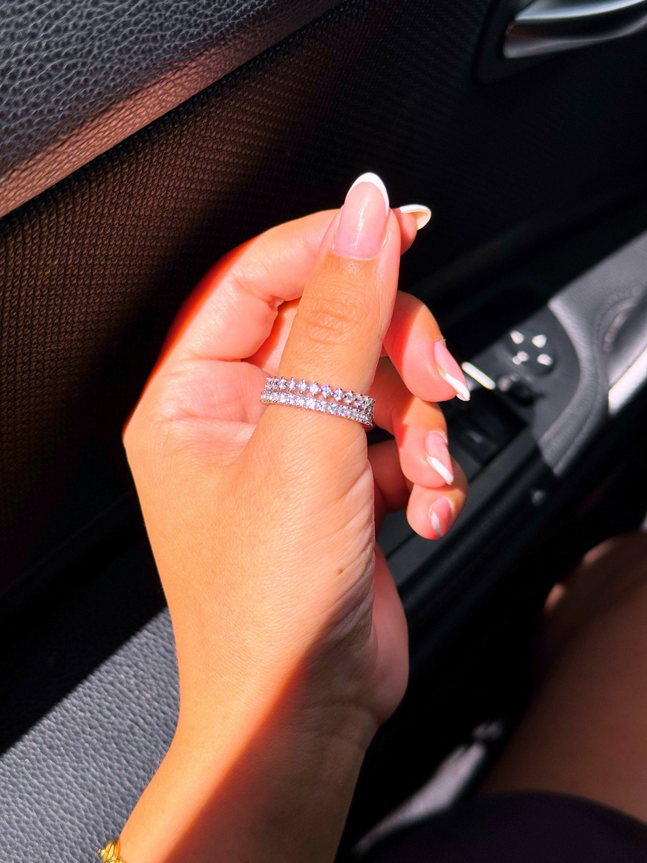Anel delicado, aliança preenchida com zircónias.