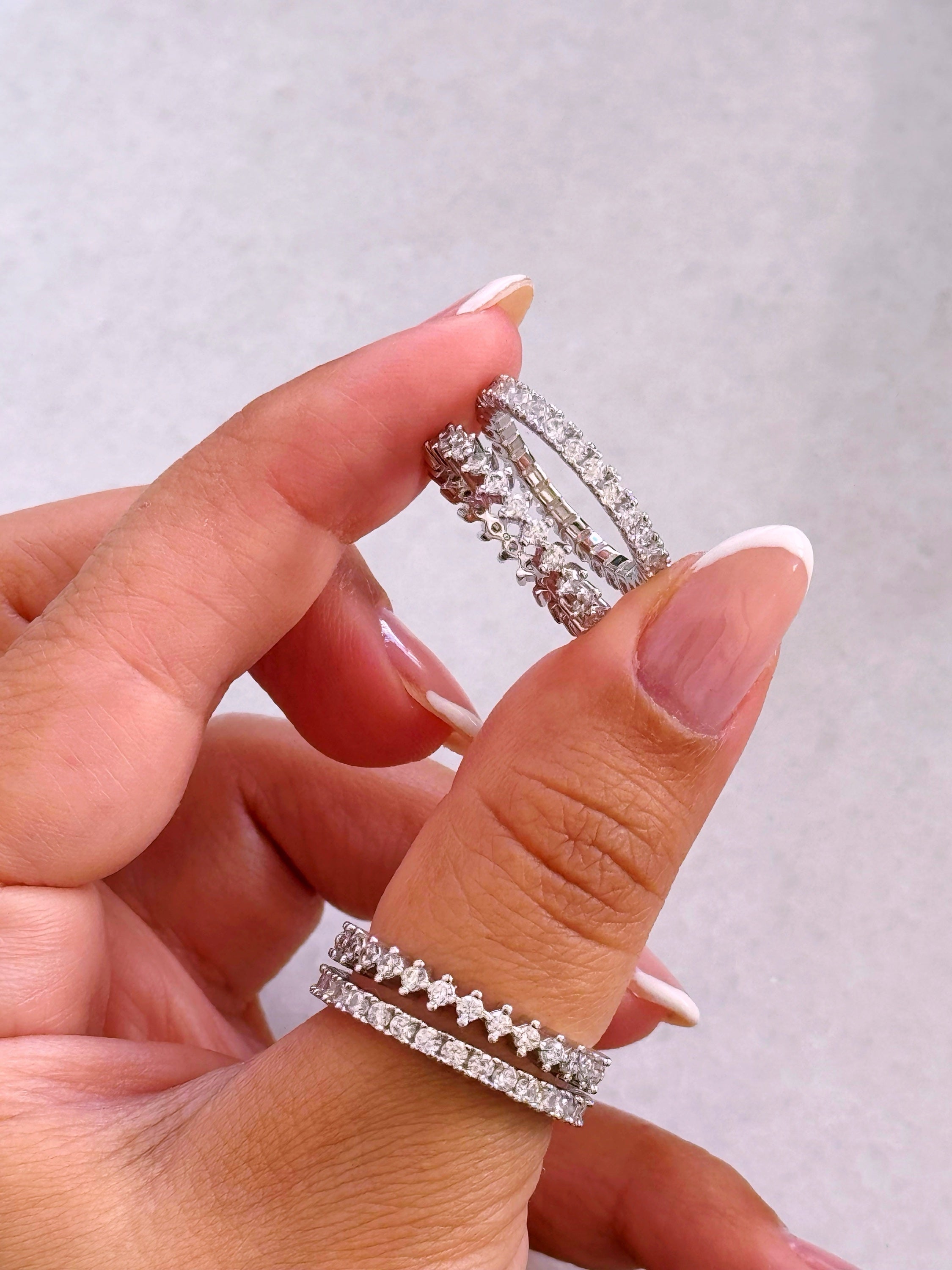 Anel delicado, aliança preenchida com zircónias.