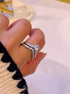 Anel delicado, com efeito de bico, muito elegante, preenchido com zircónias.