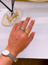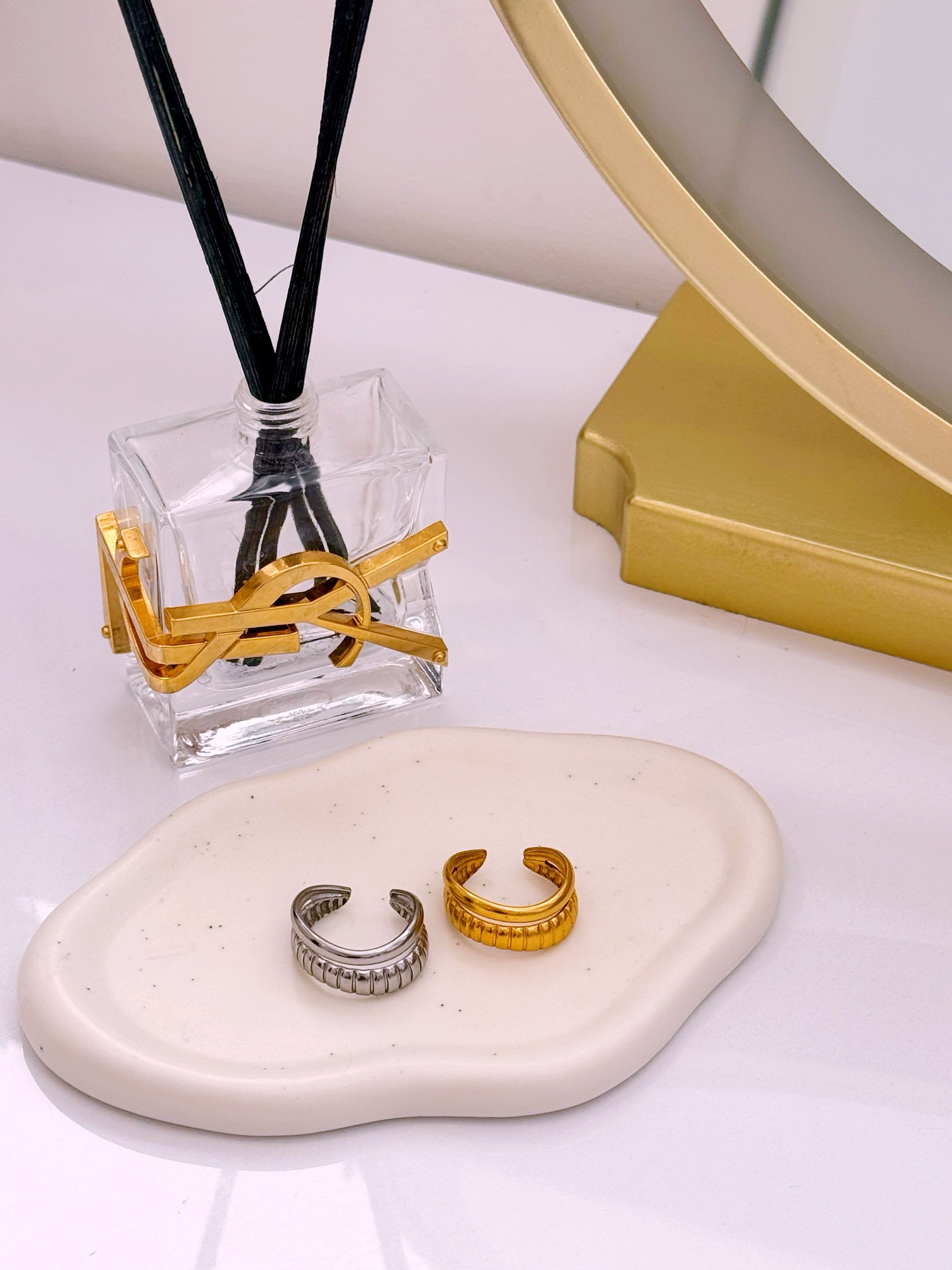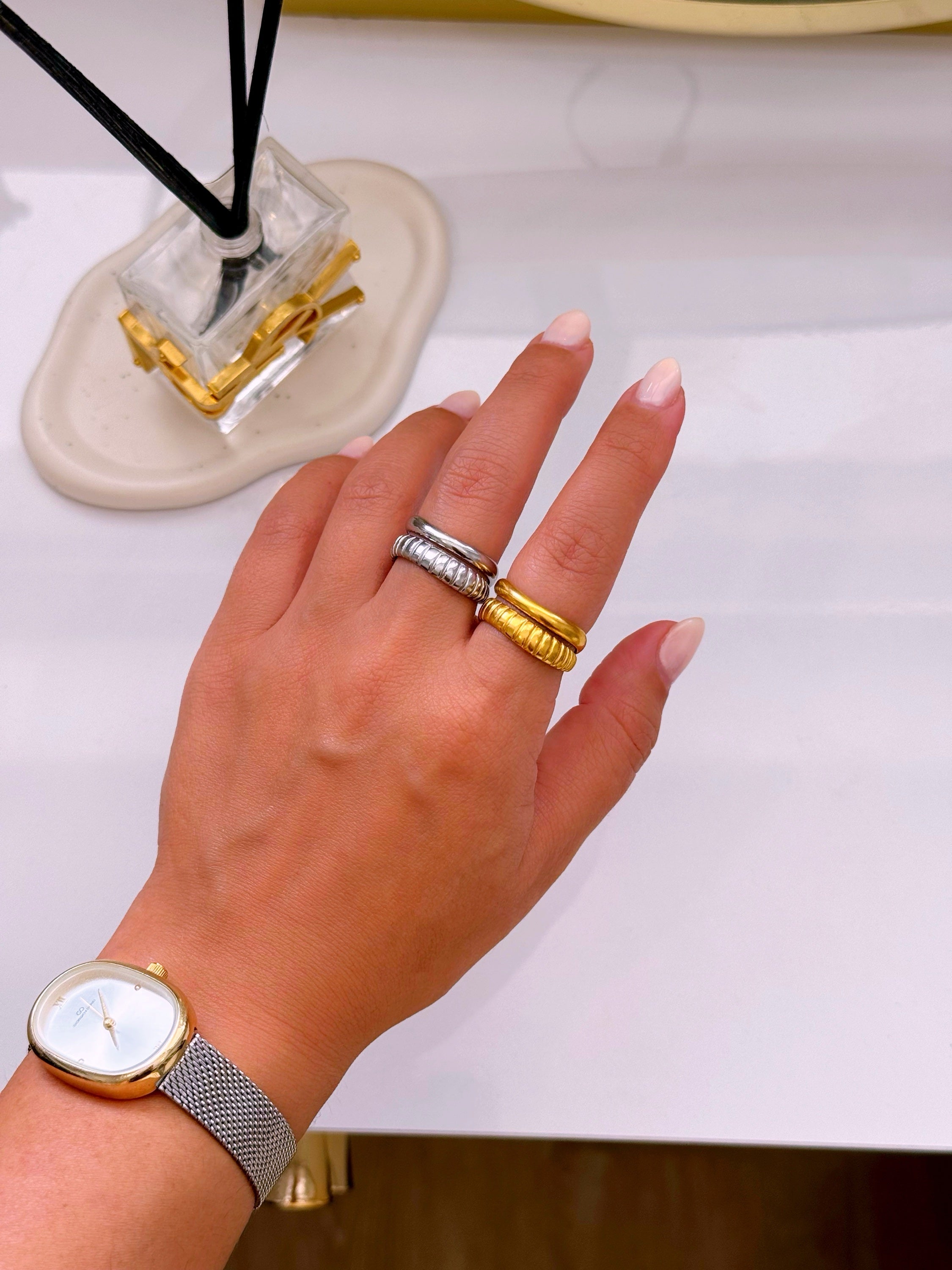 Anel com efeito duplo e ondulado, num aro é lisinho e no outro tem um efeito com relevos. Um básico indispensável.