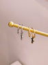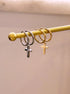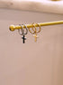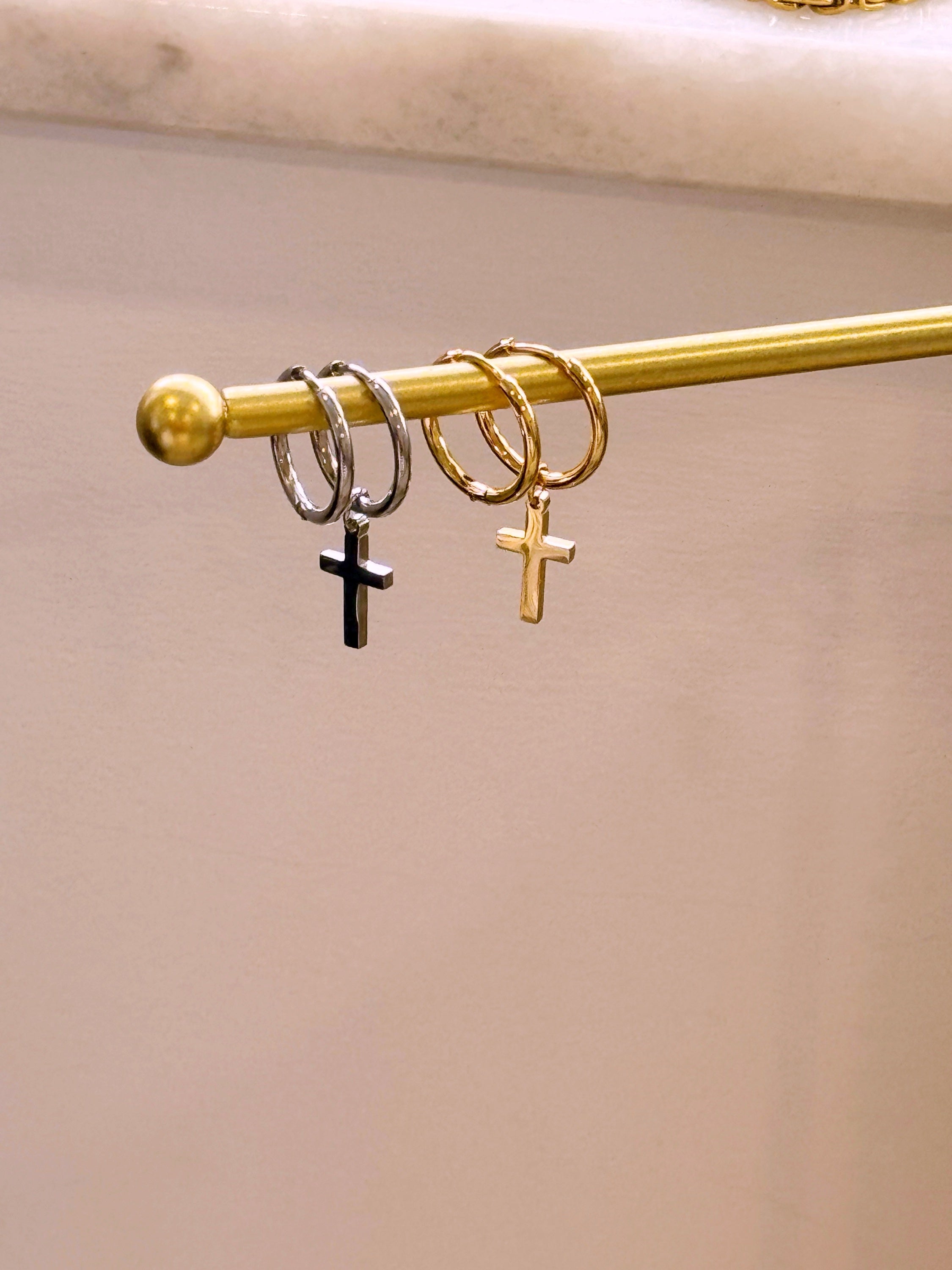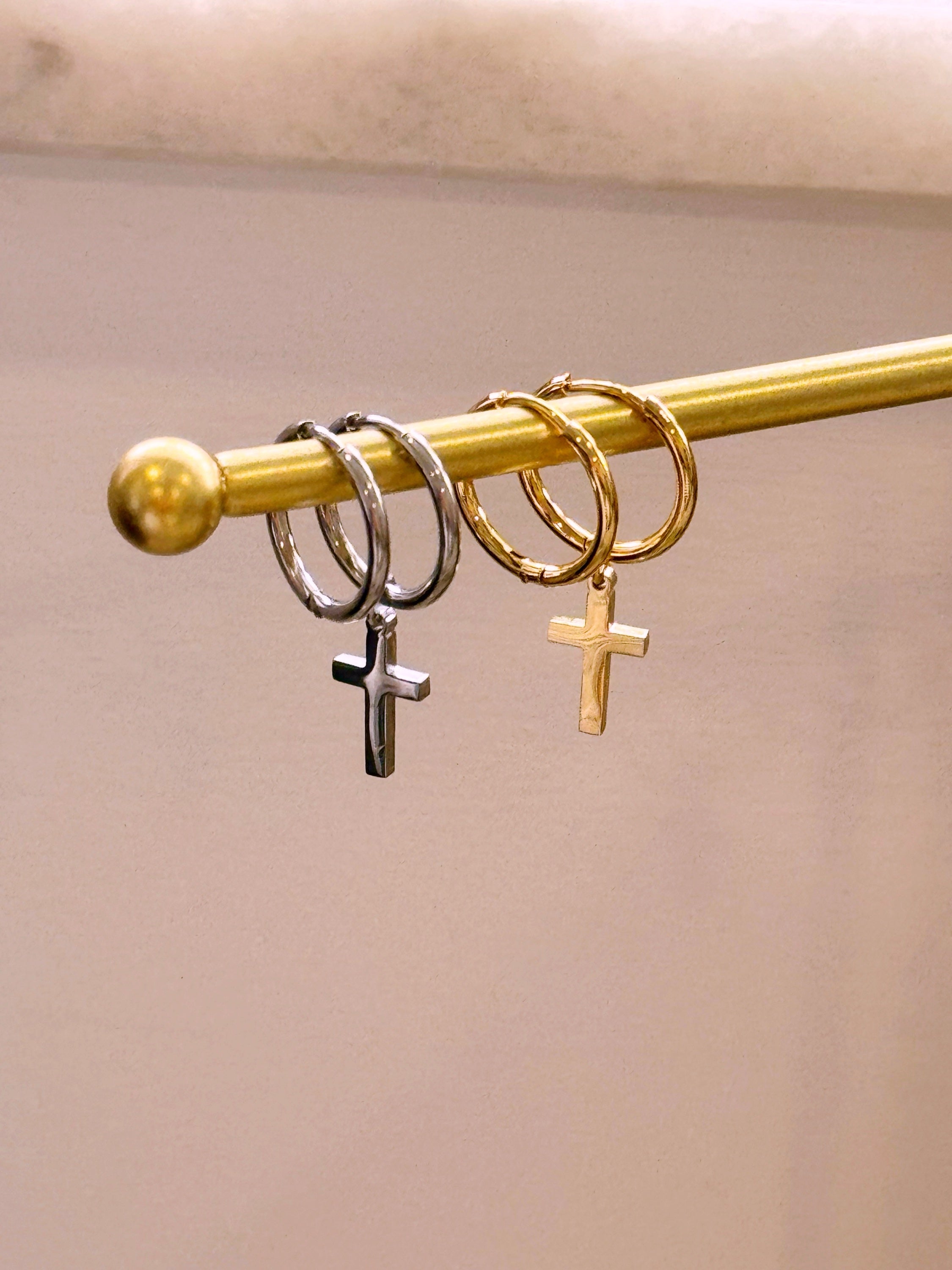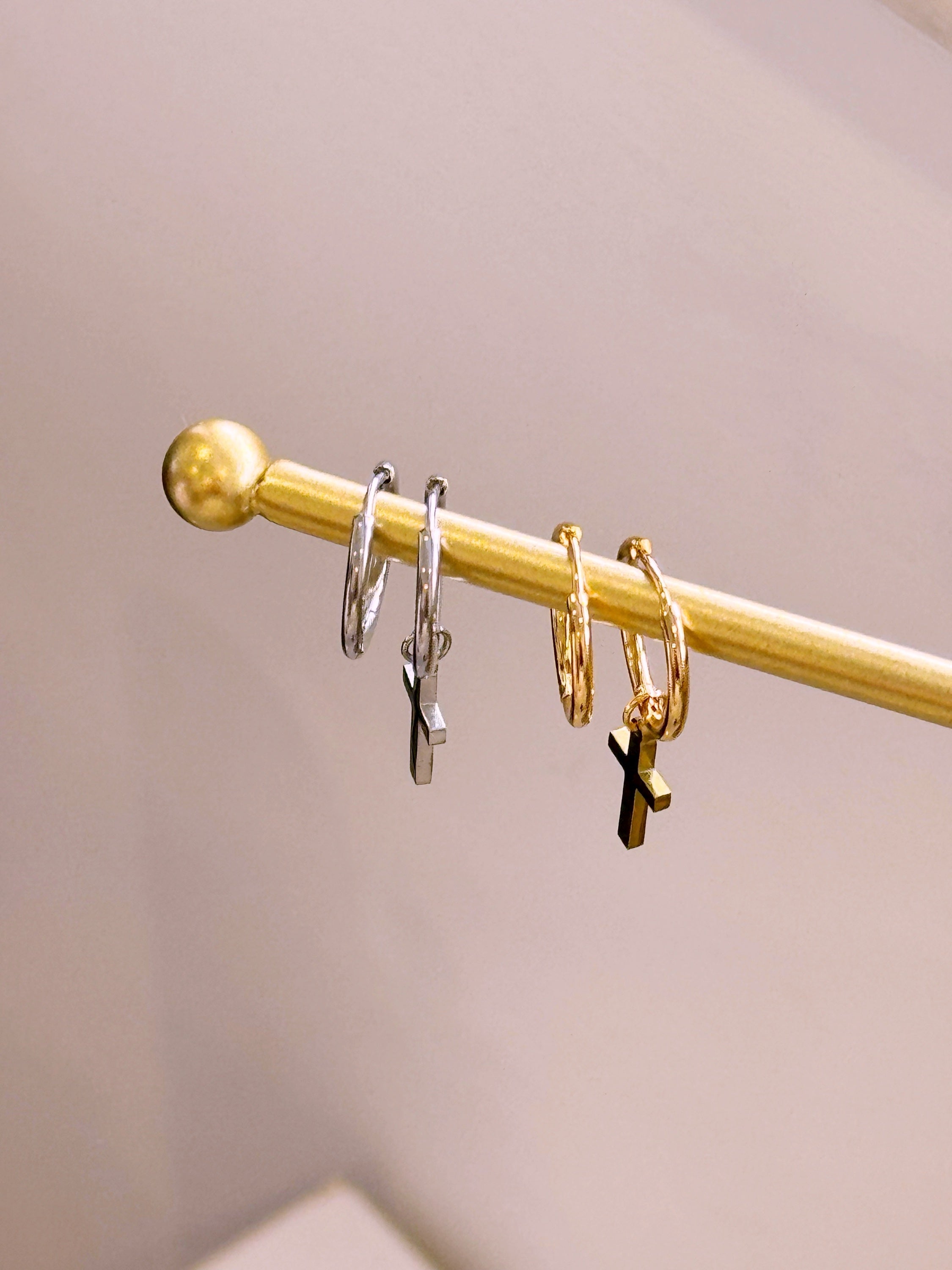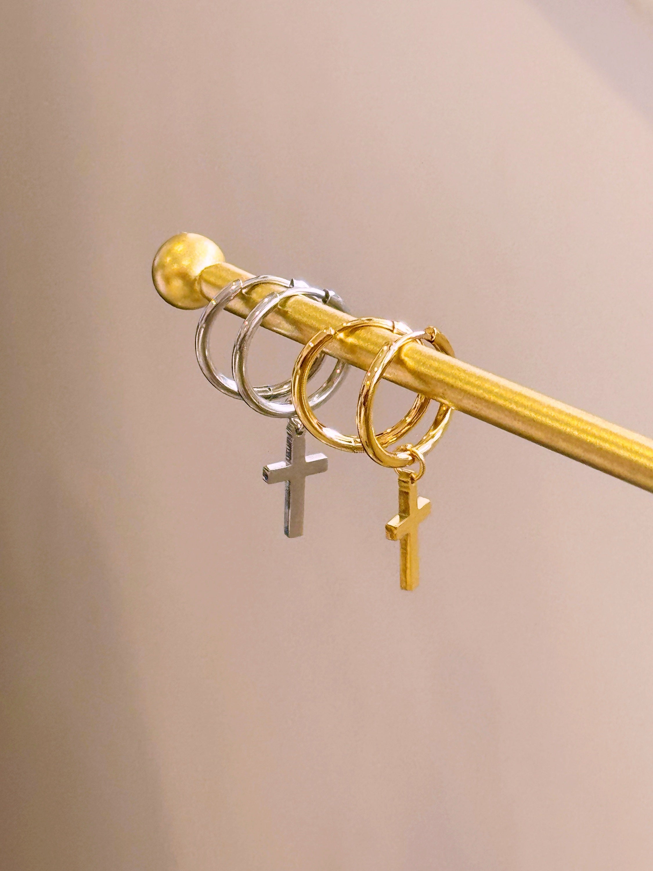 Argolas simples douradas com diâmetro aproximado de 1.3 cm e pendente da cruz.