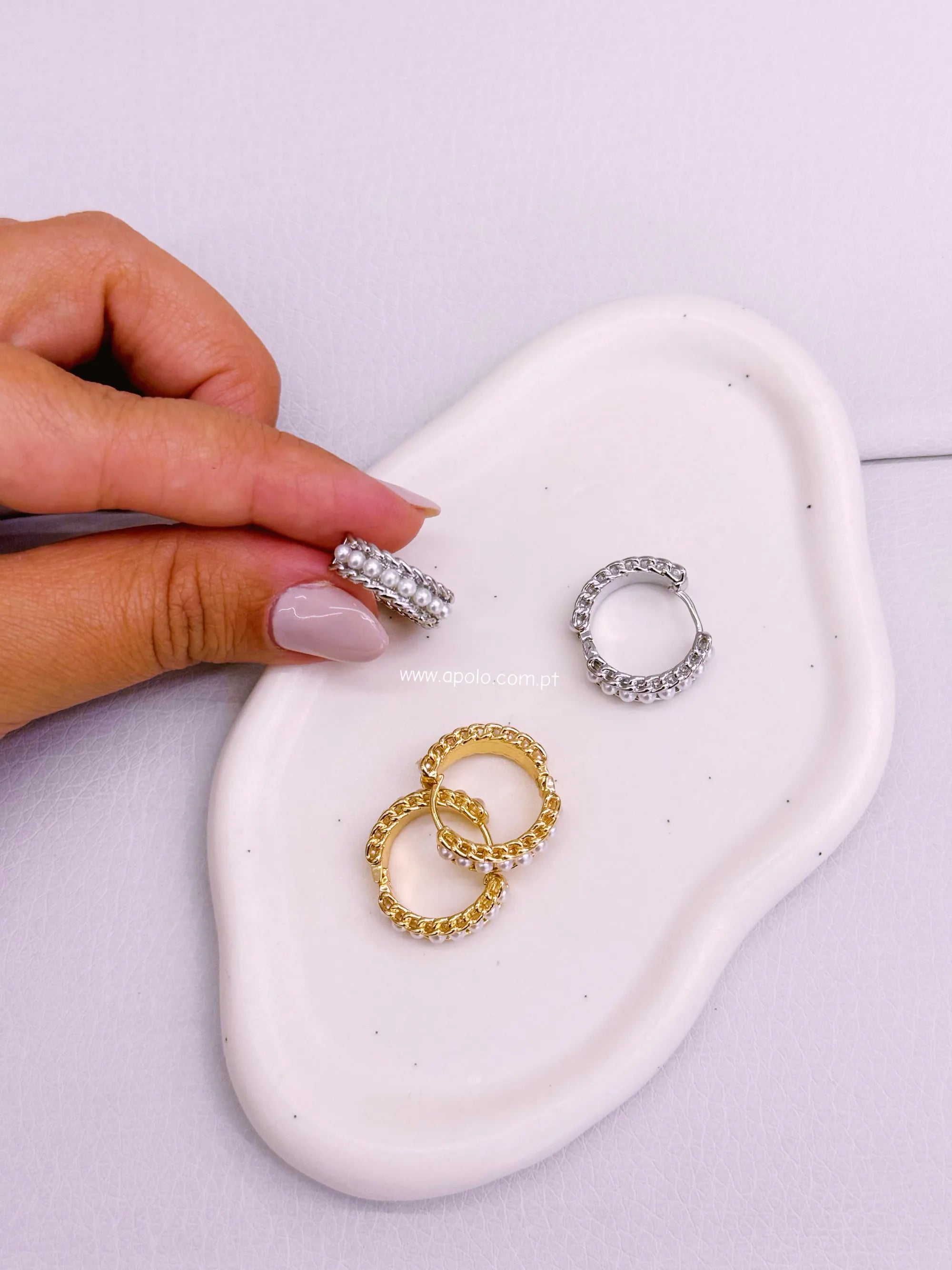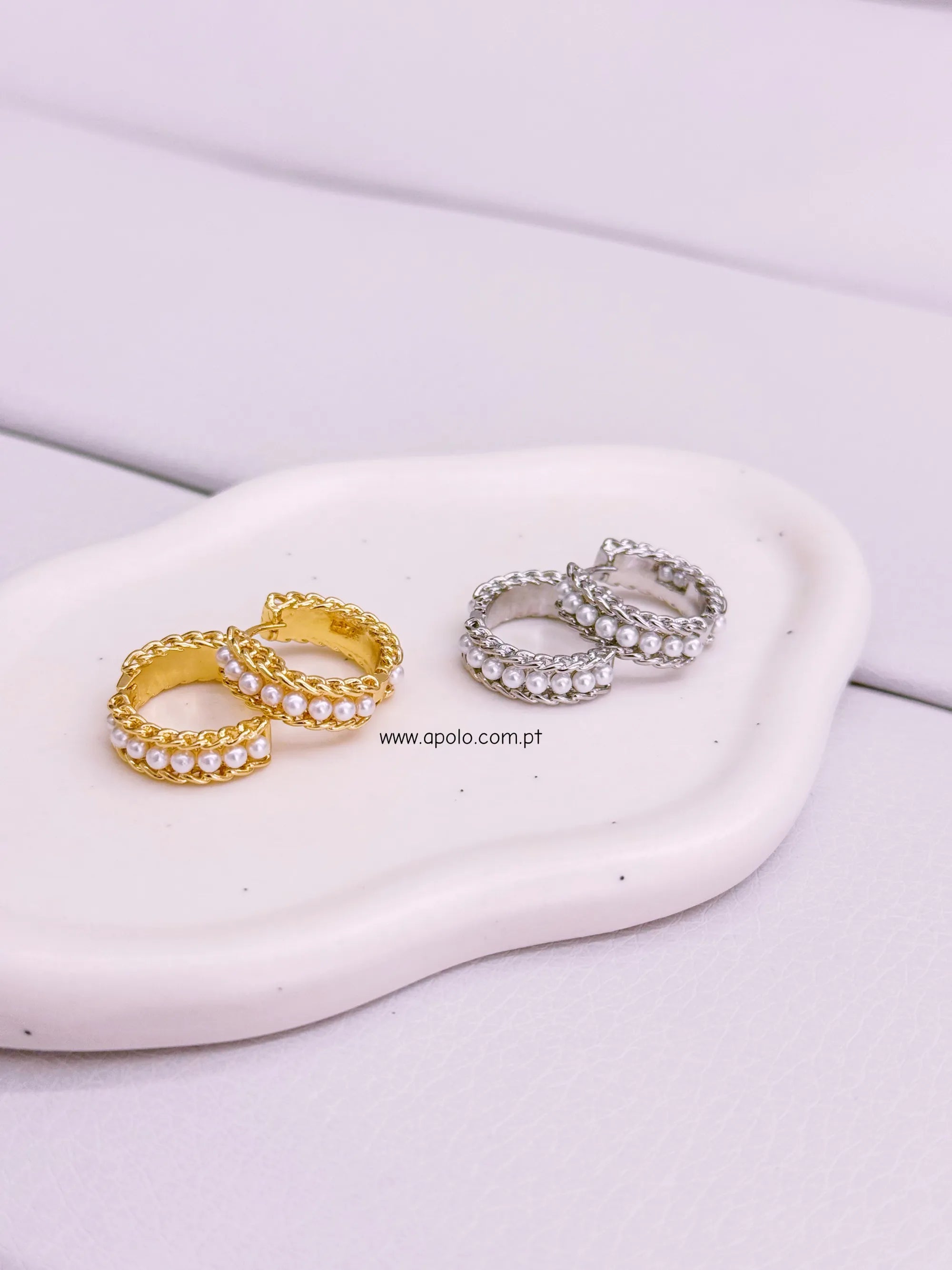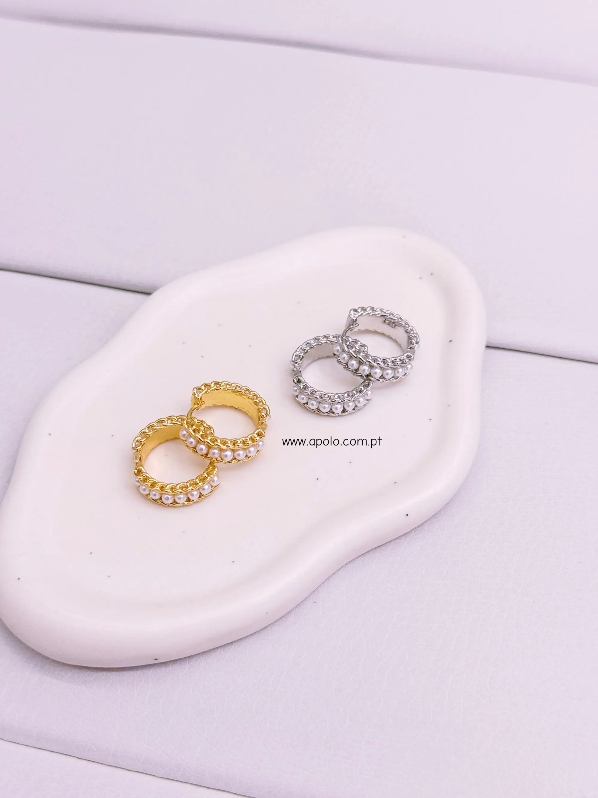 Argolas com efeito corrente e fila de pérolas.