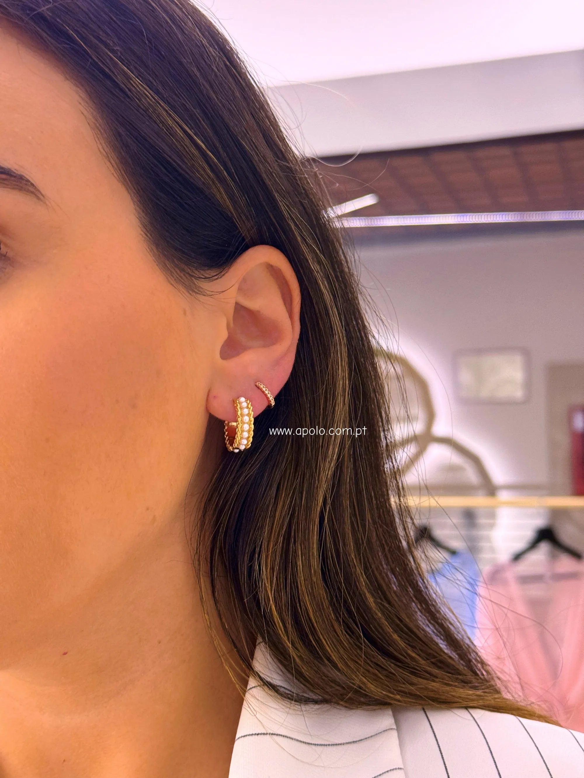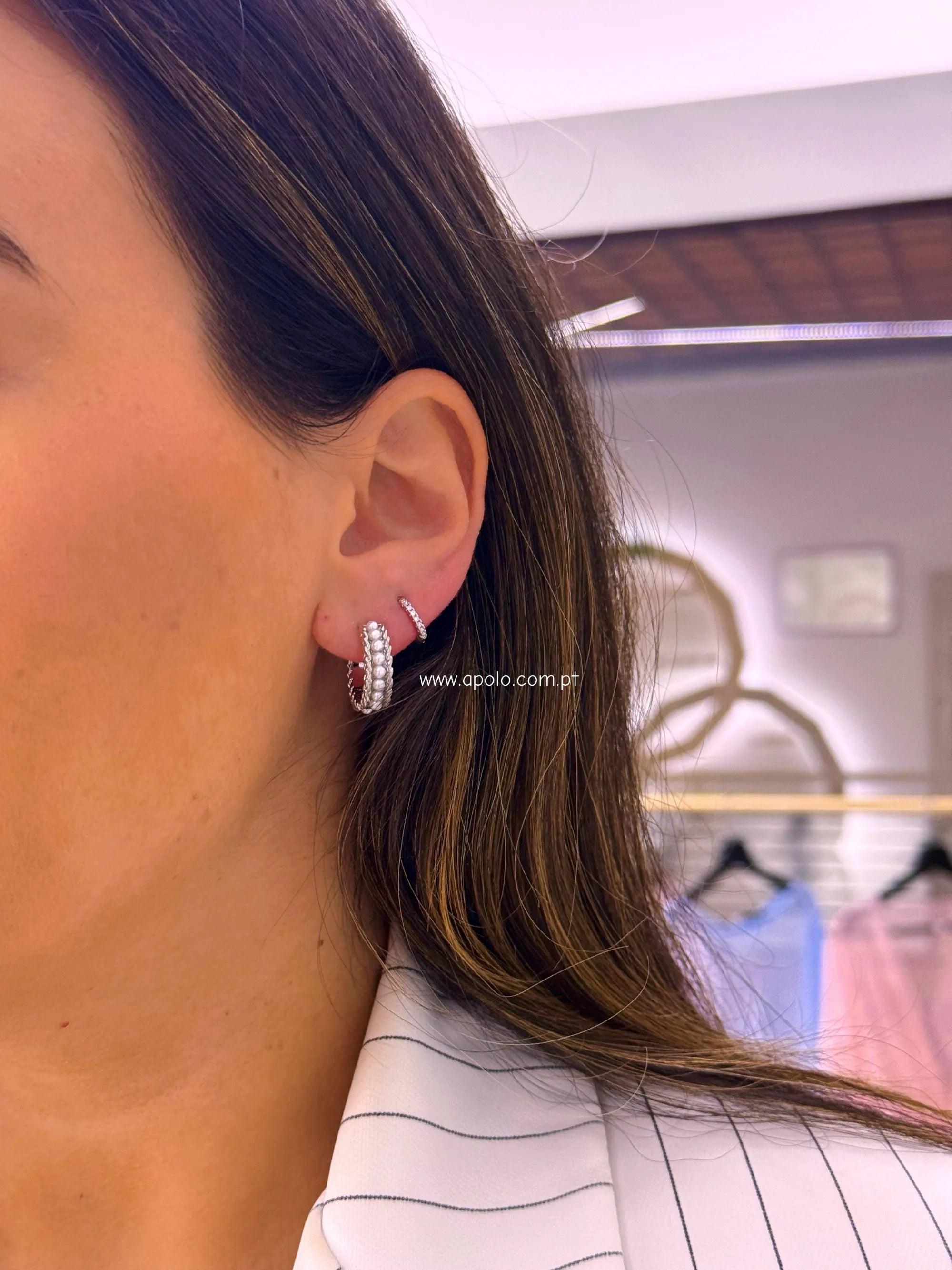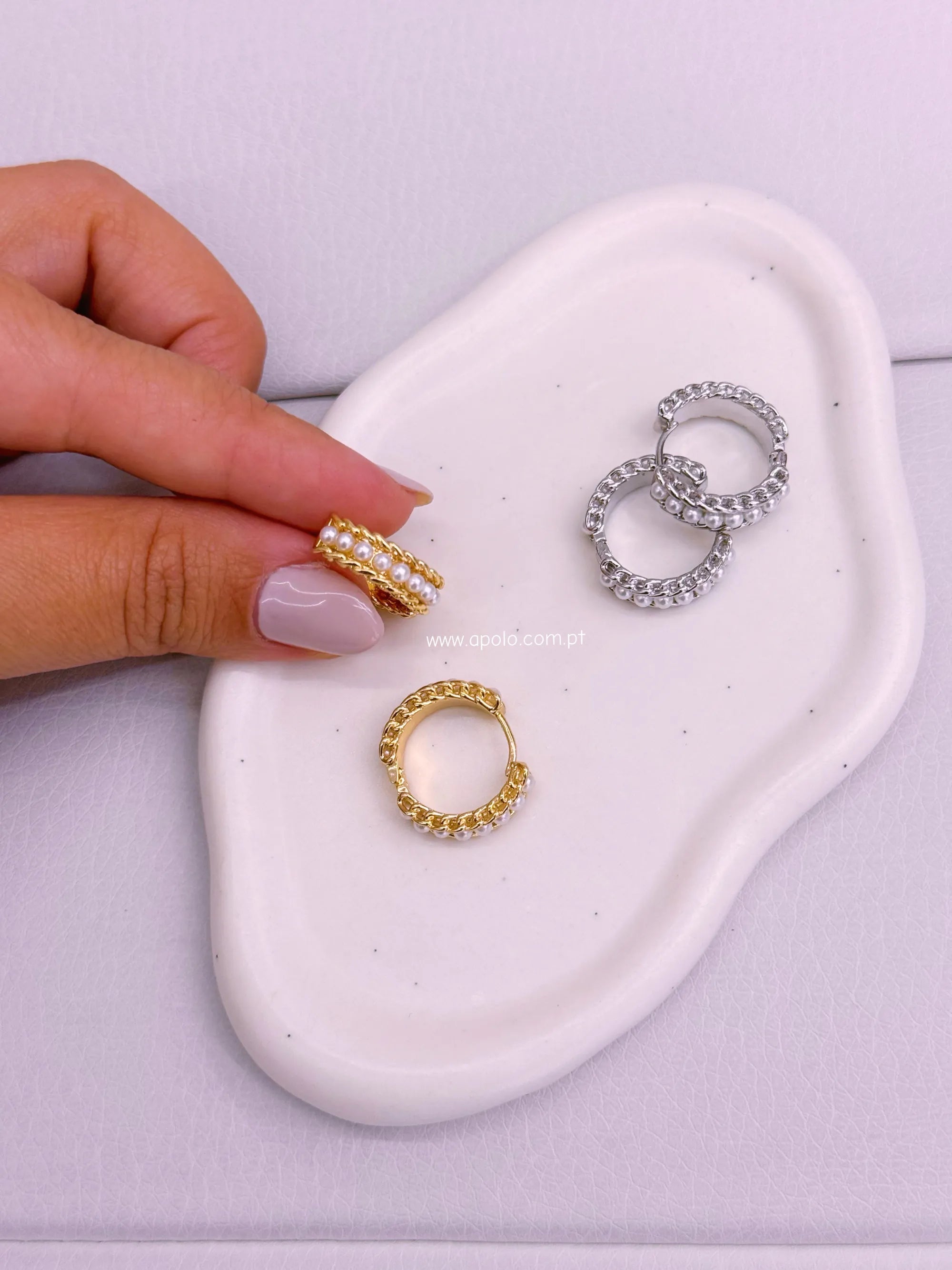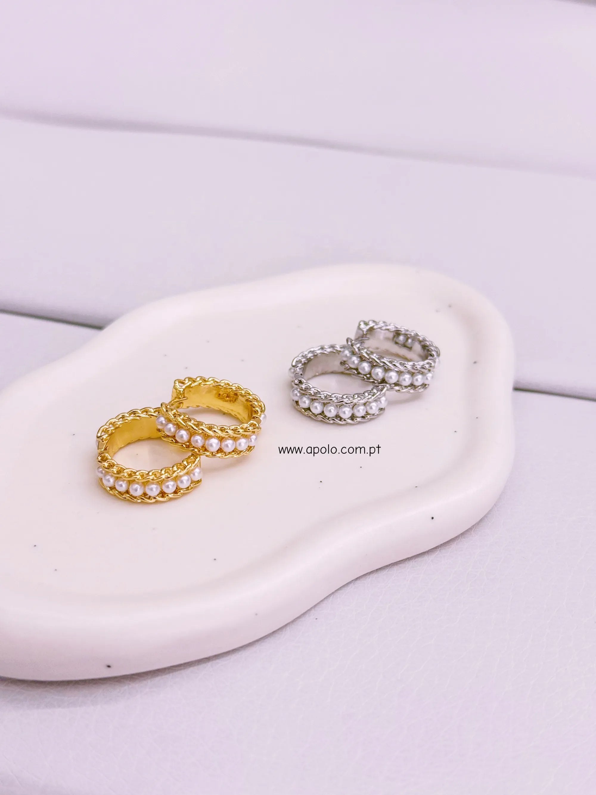 Argolas com efeito corrente e fila de pérolas.