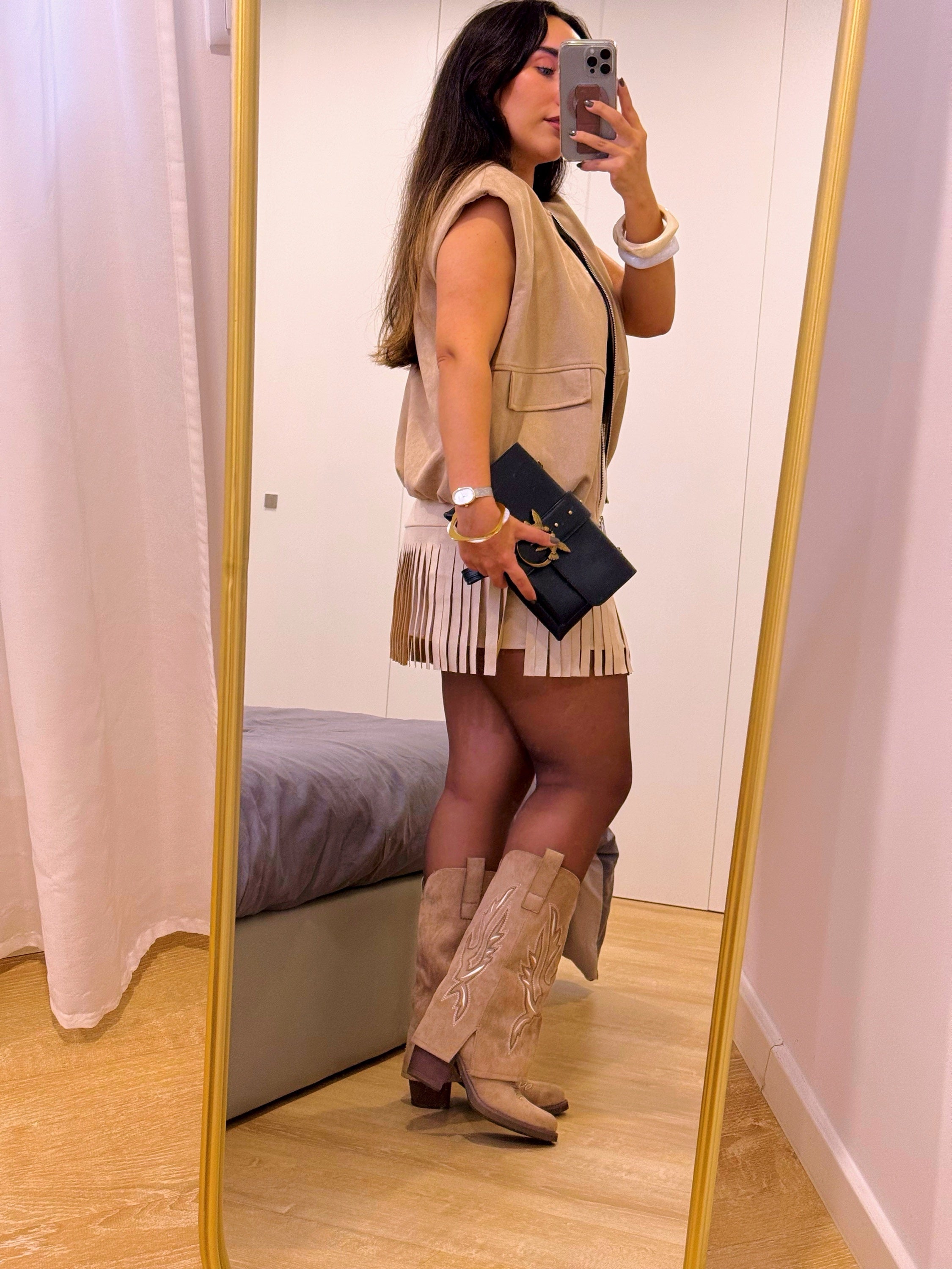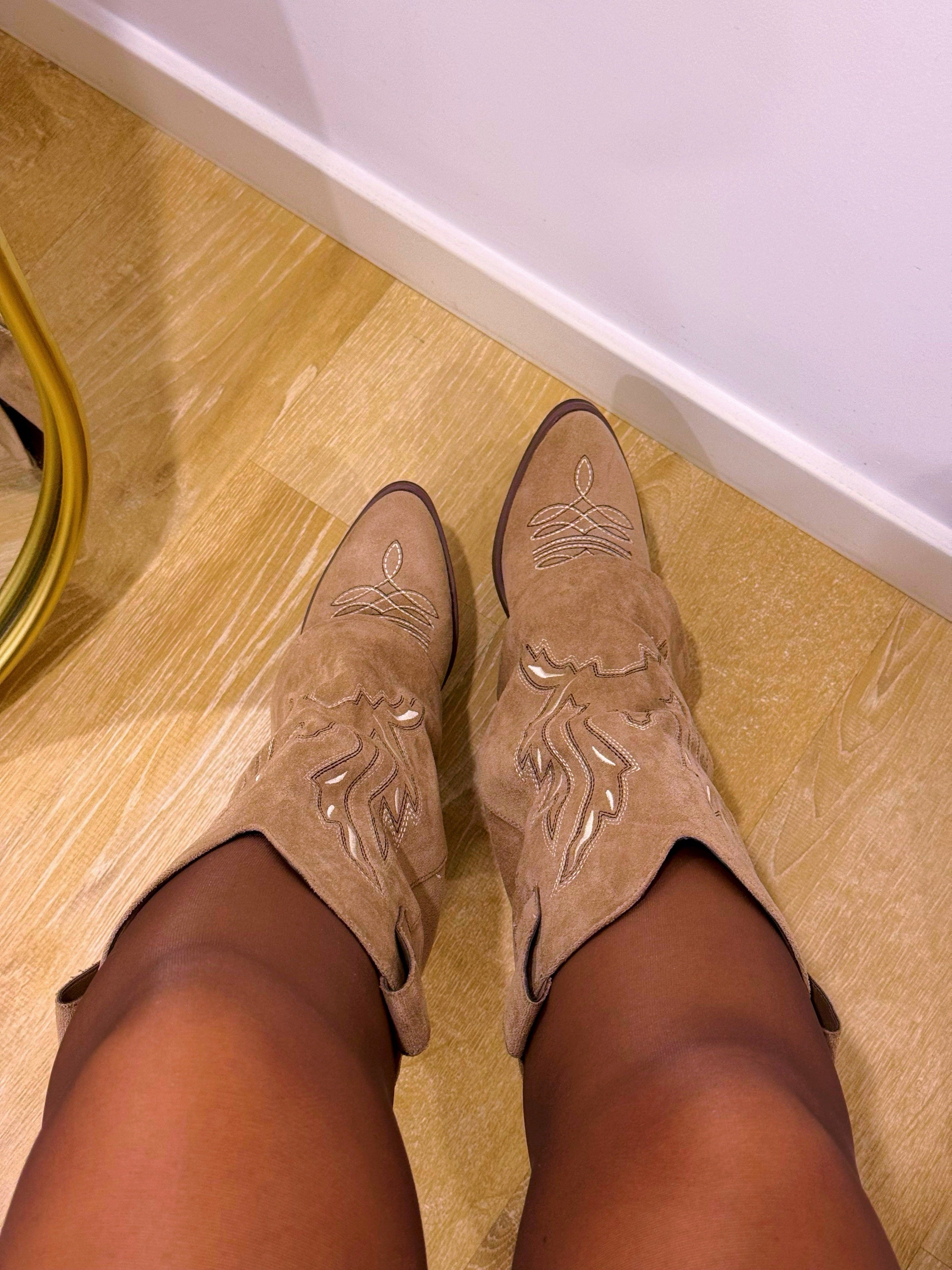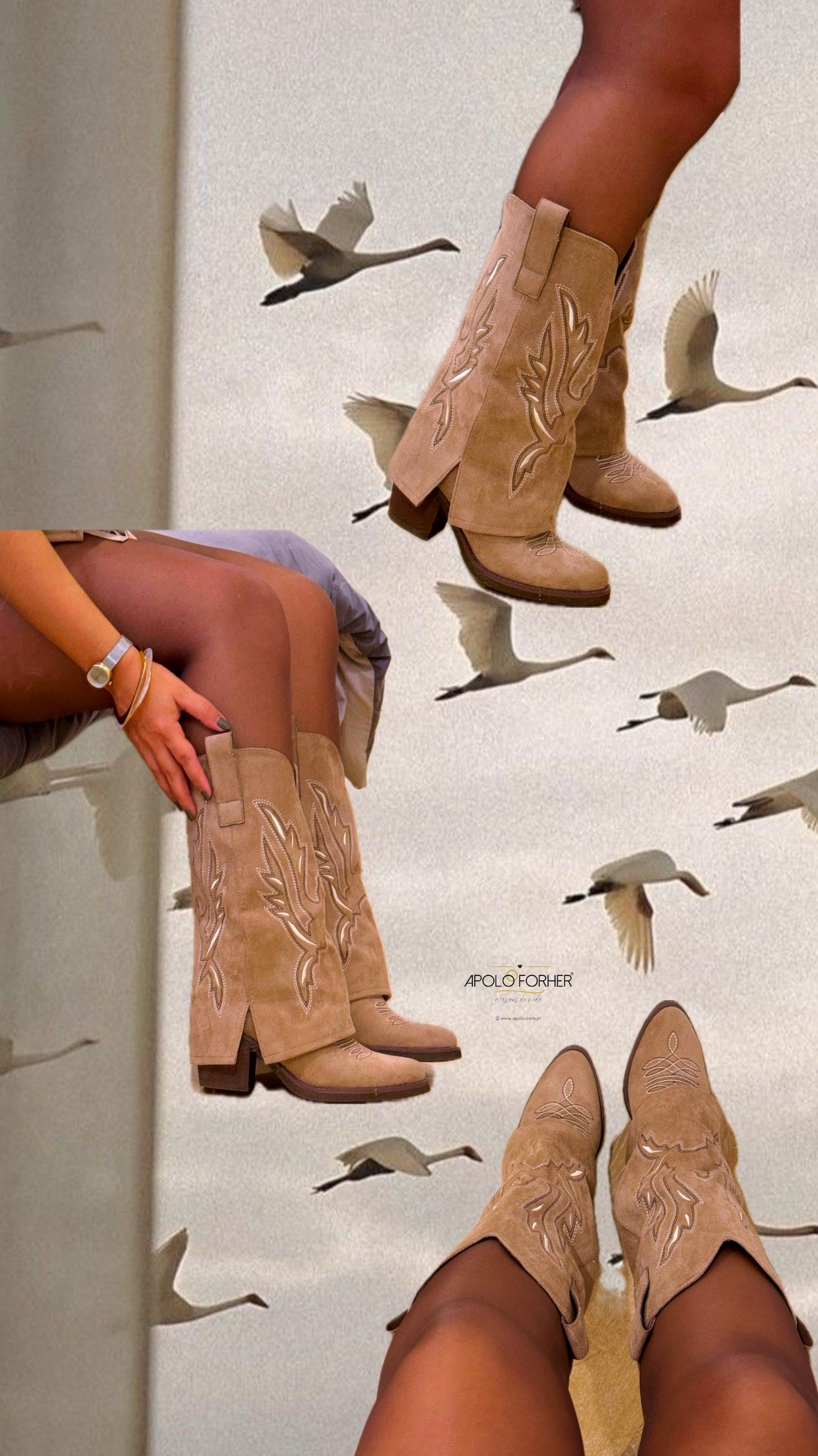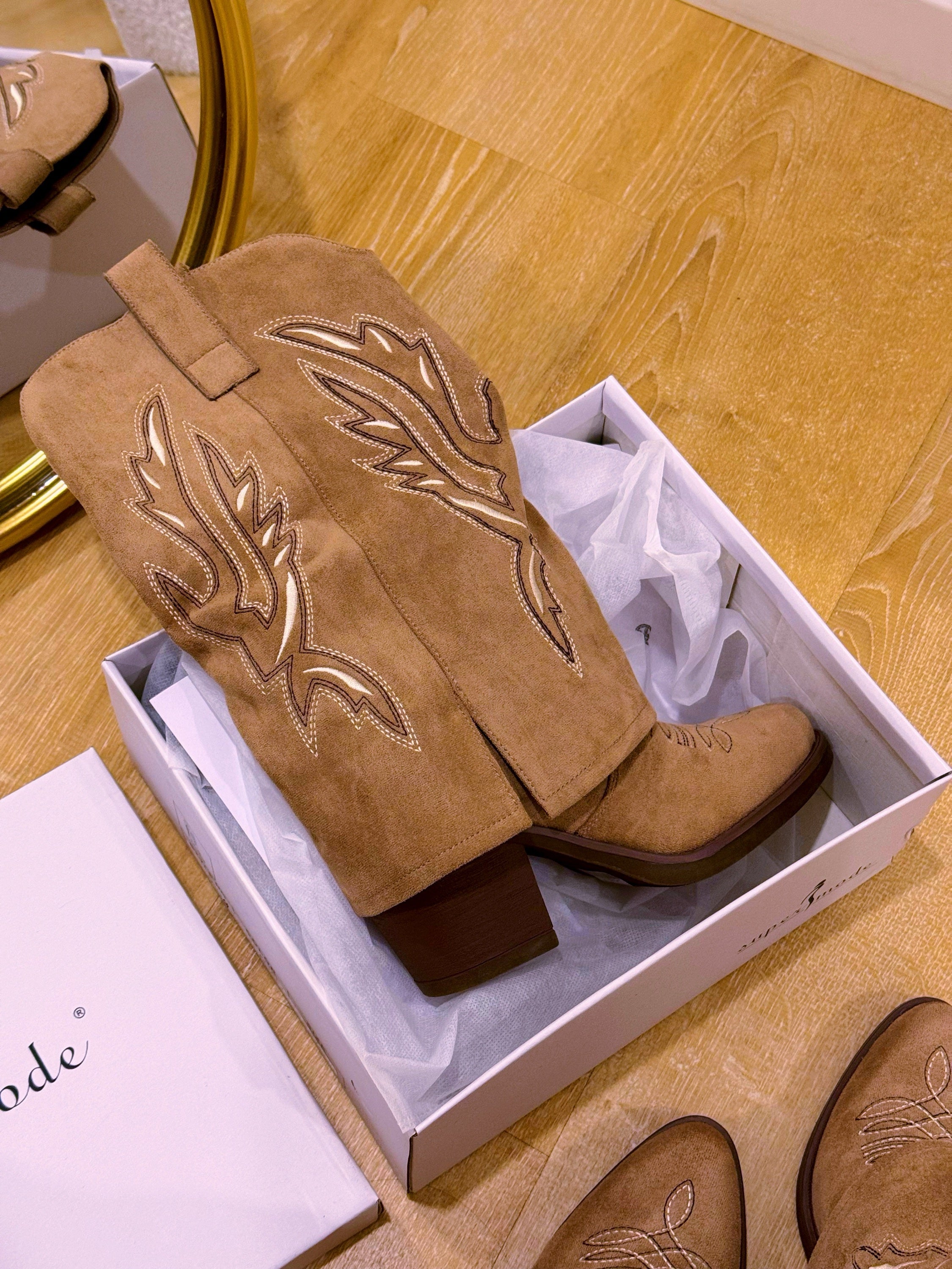 Botas estilo texana, com aba, super tendência e muito confortáveis, todas em efeito camurça, com pormenores bordados. De alta qualidade.