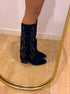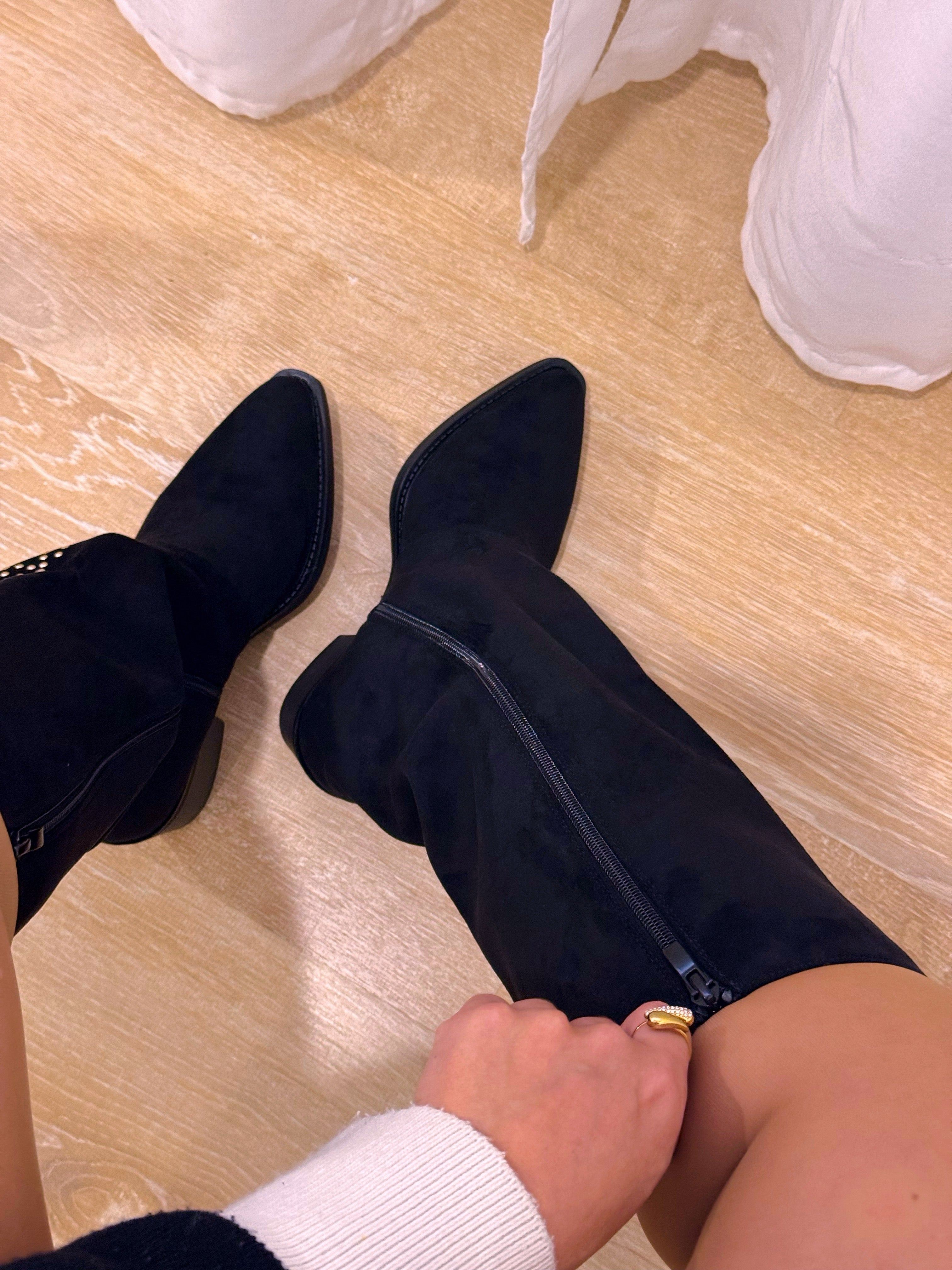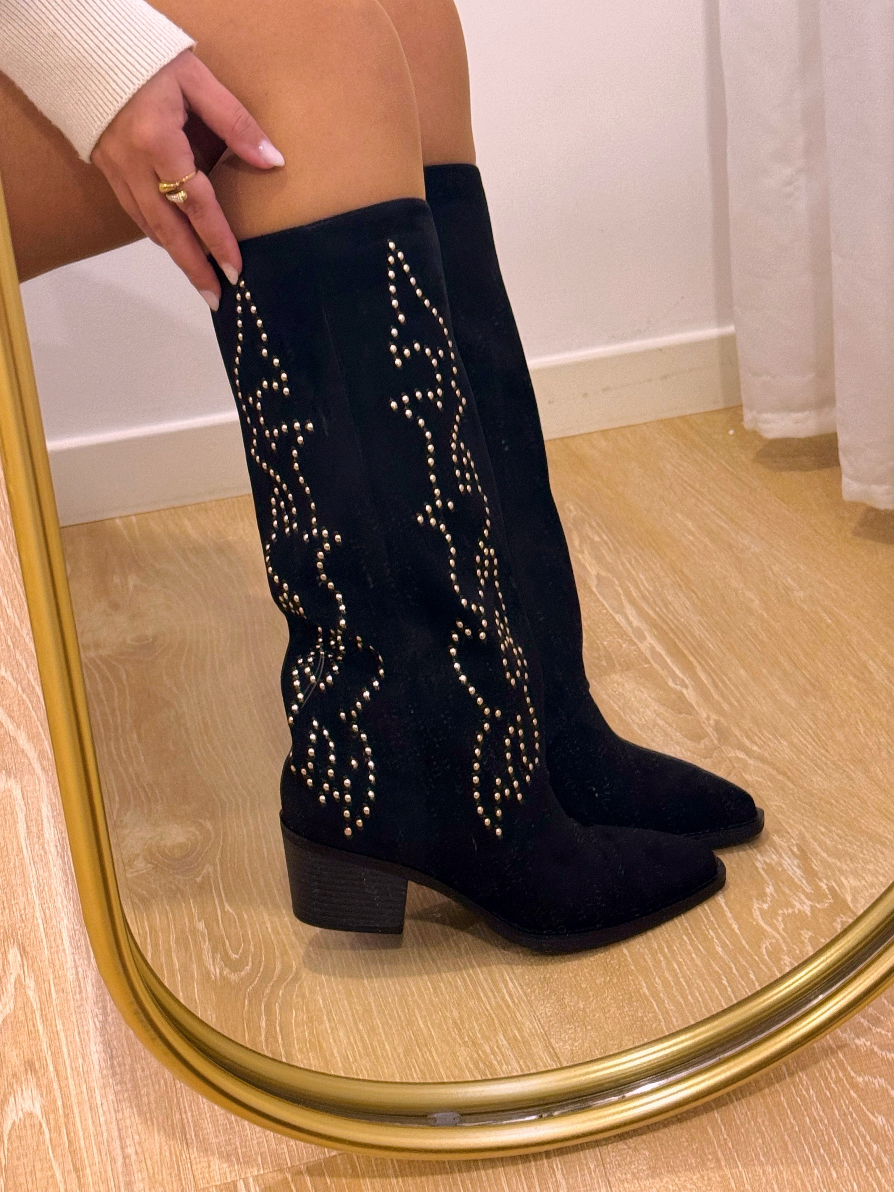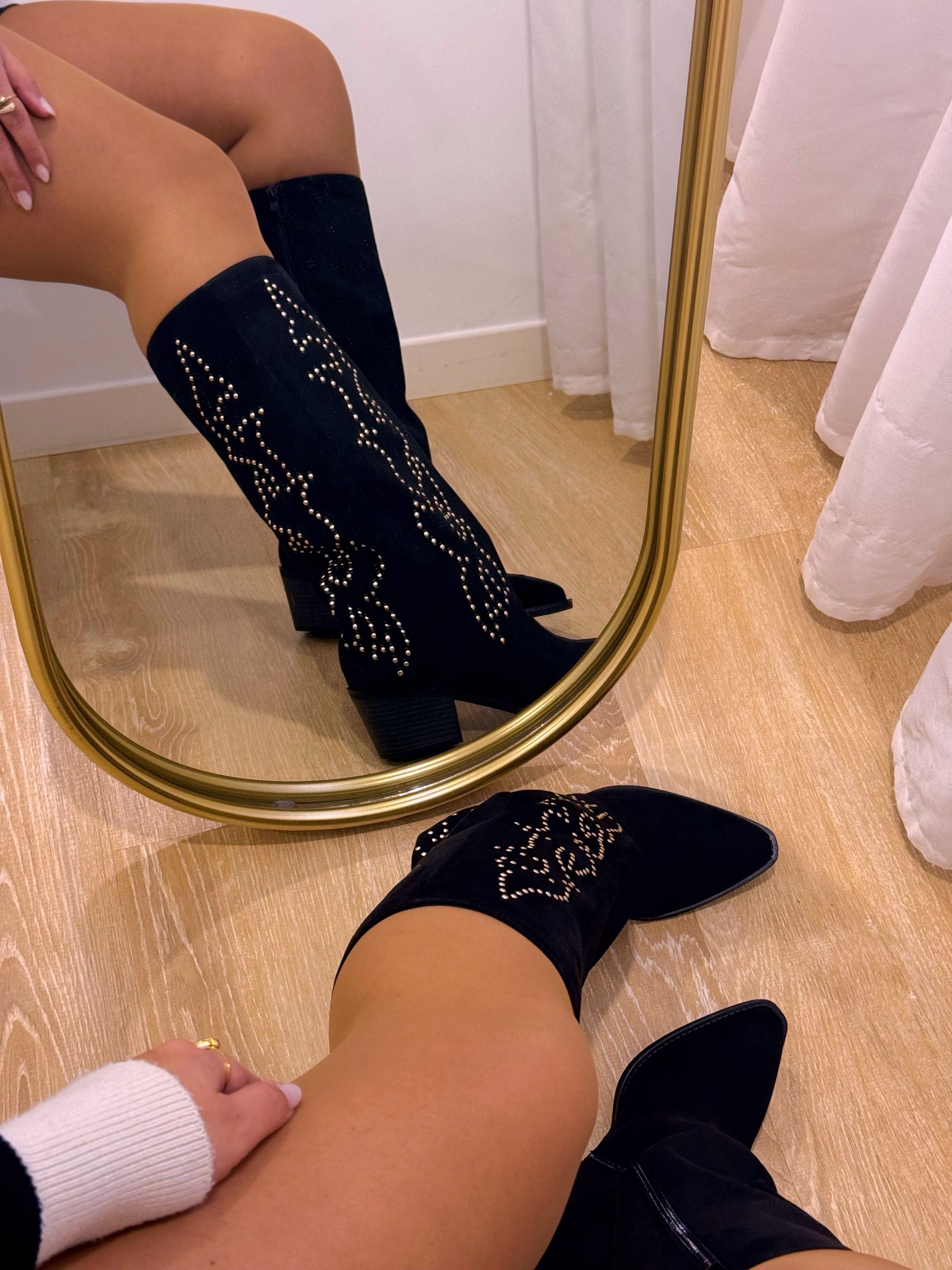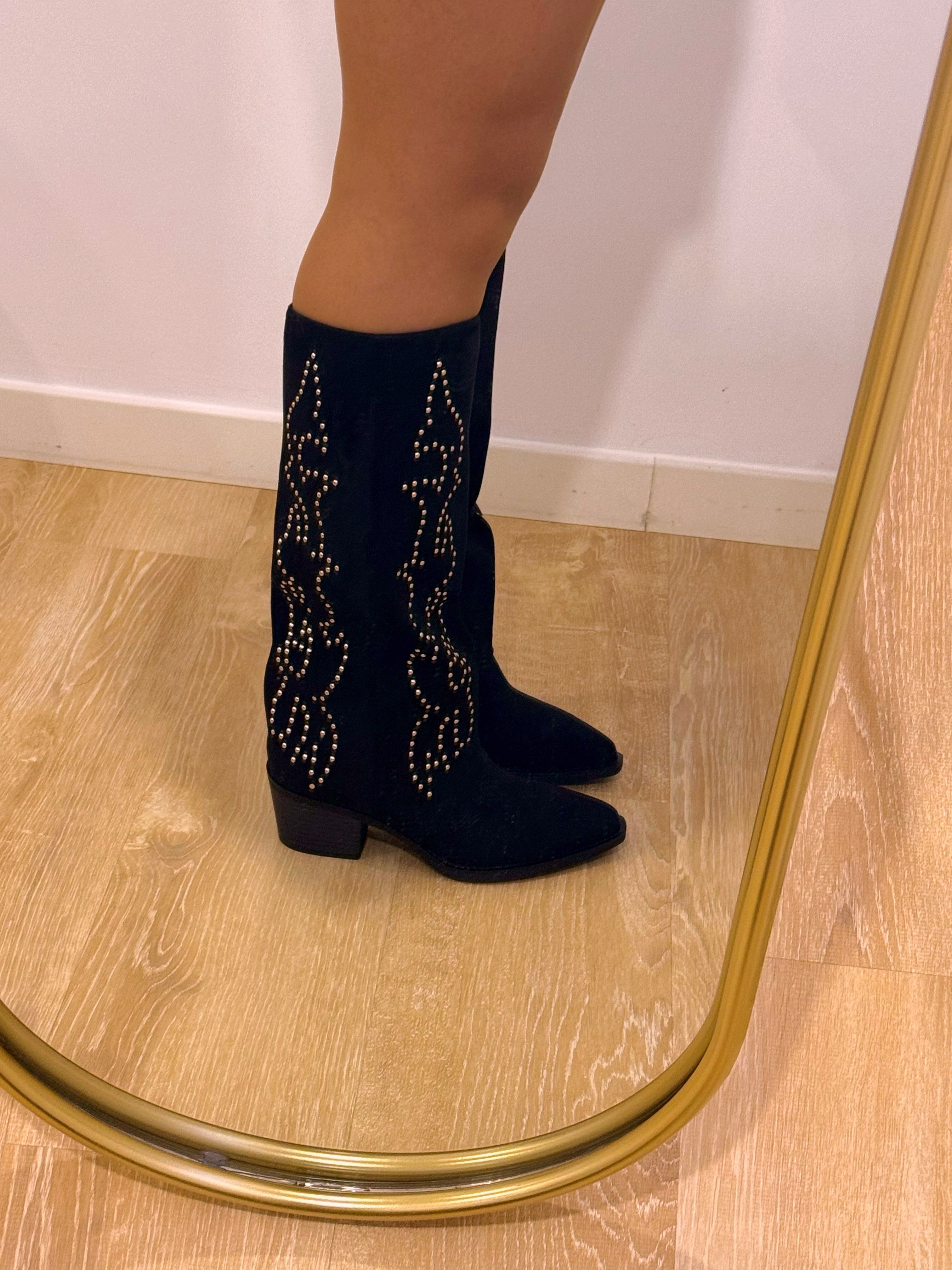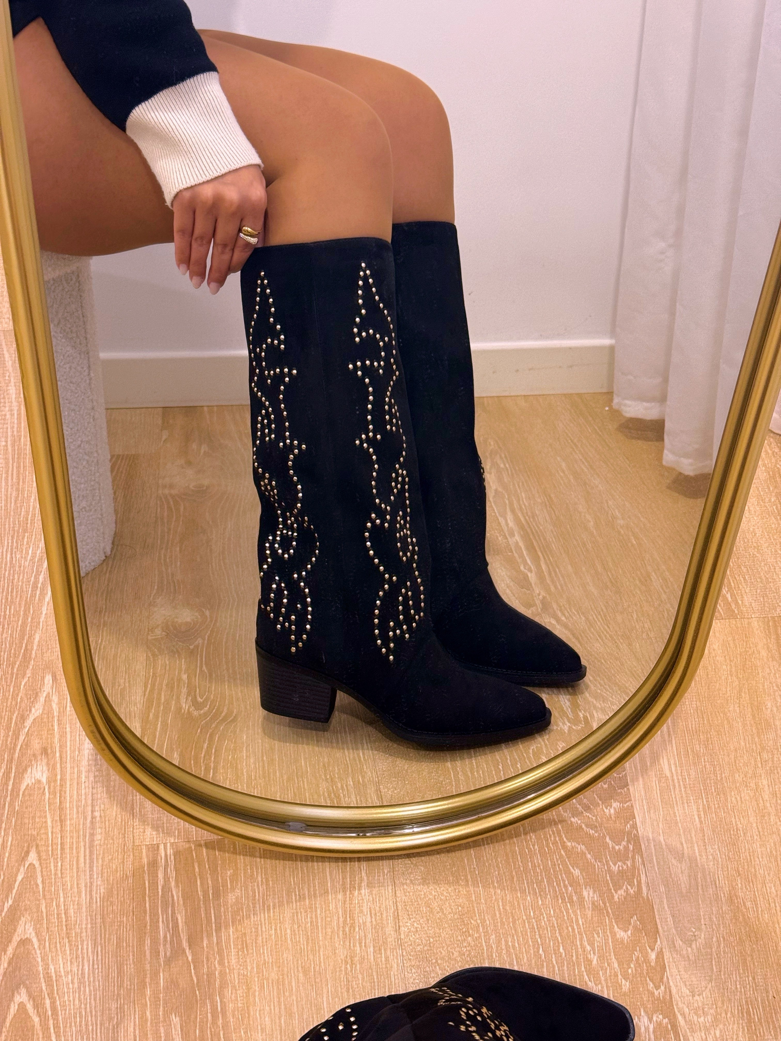 Botas de cano alto em estilo texana, super tendência e muito confortáveis, todas em efeito camurça, com pormenores em tachinhas metálicas. De alta qualidade.