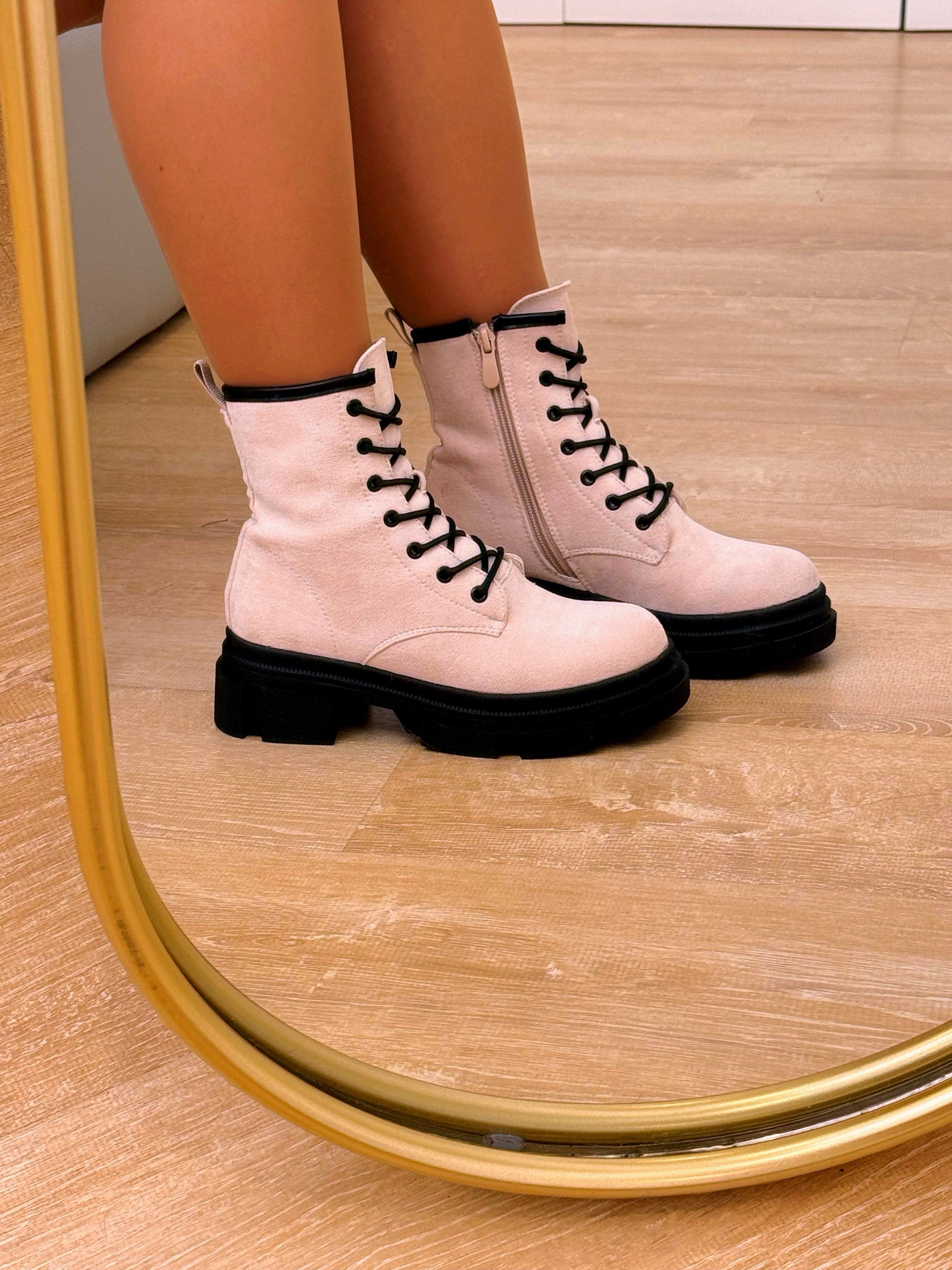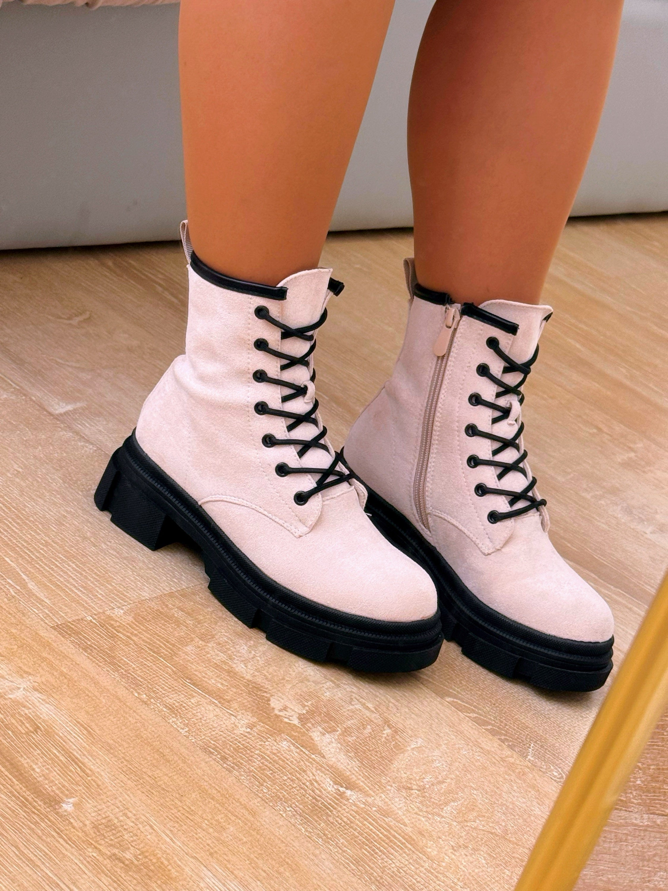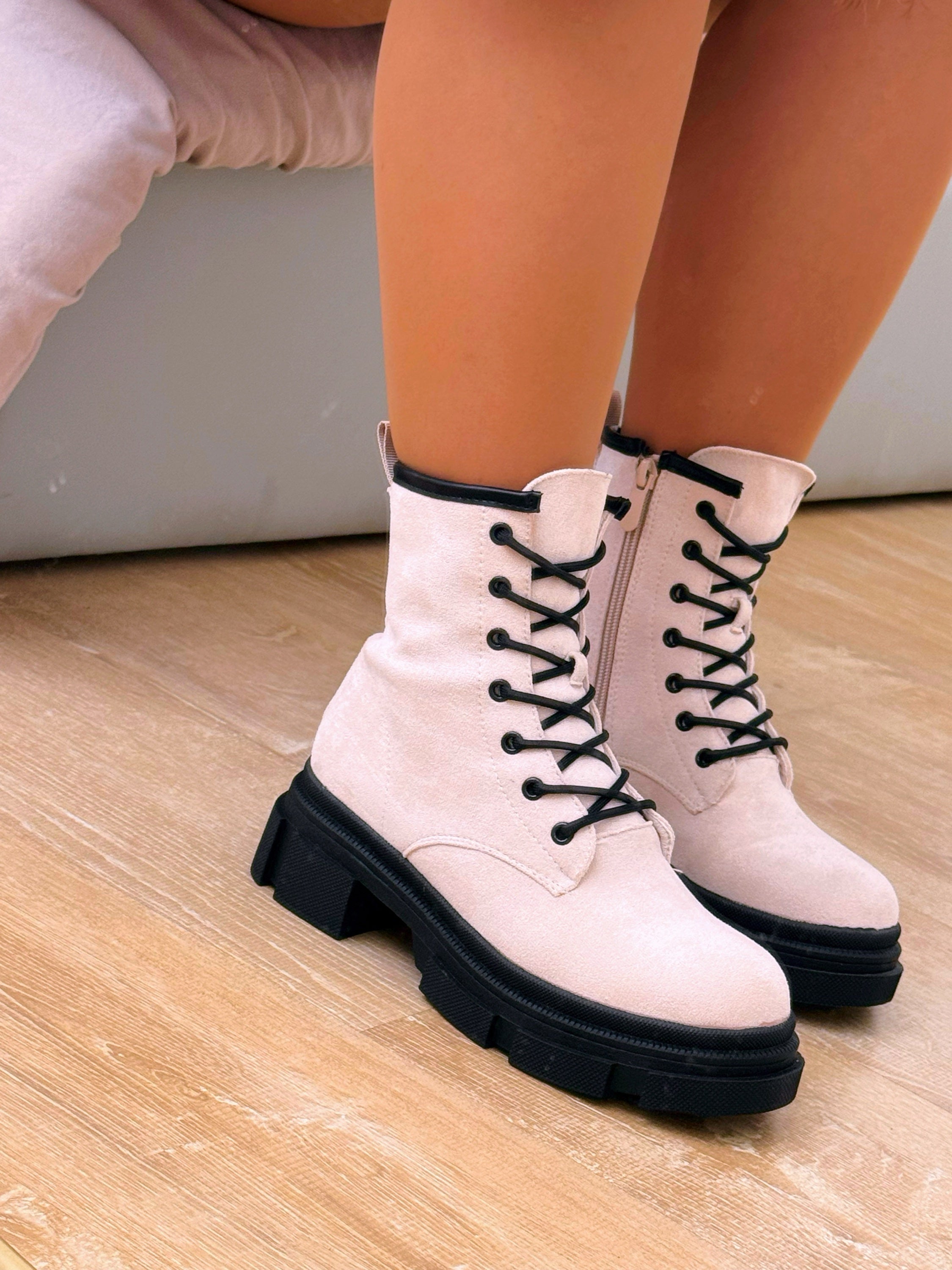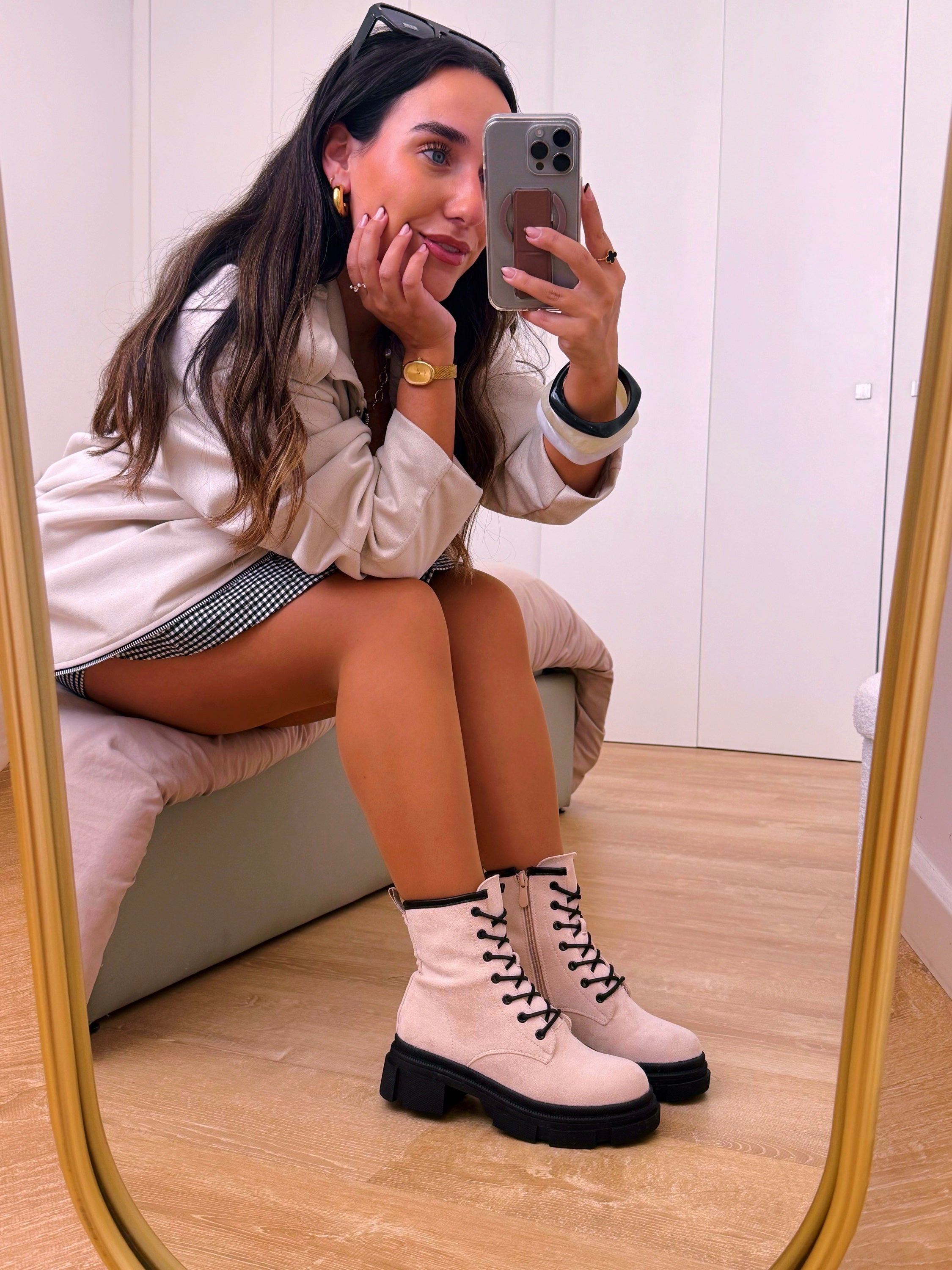 Bota militar com plataforma • efeito camurça bege com pormenores pretos