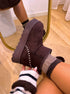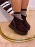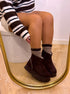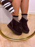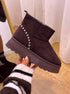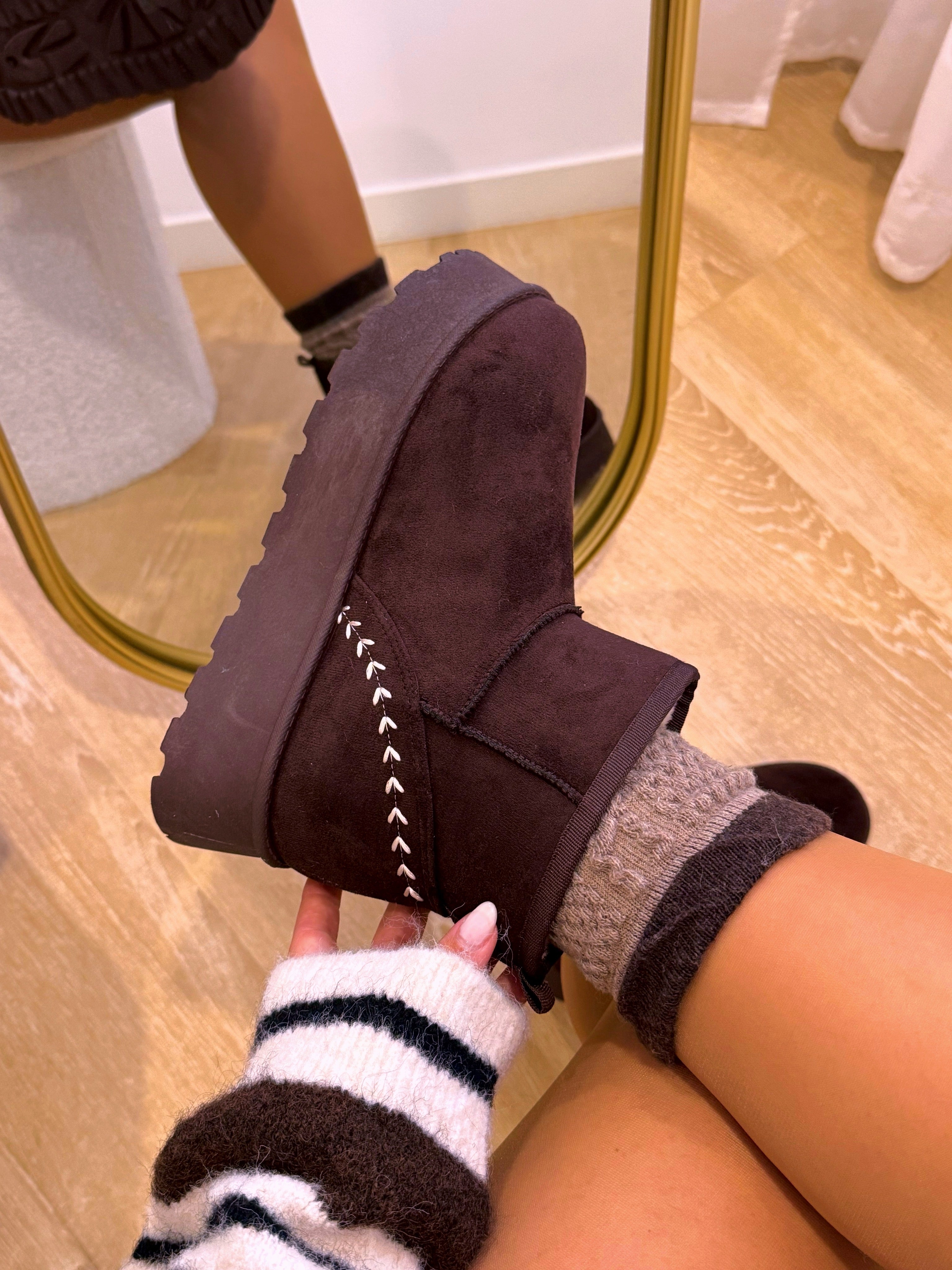 Botas curtas de plataforma, em castanho chocolate, ideais para quem procura conforto sem abdicar de estilo. Com acabamento em camurça sintética macia e interior totalmente forrado em pelinho curto, mantêm os pés quentes e aconchegados nos dias mais frios. A sola tratorada robusta acrescenta altura, estabilidade e um toque moderno ao visual.