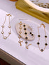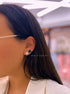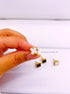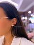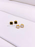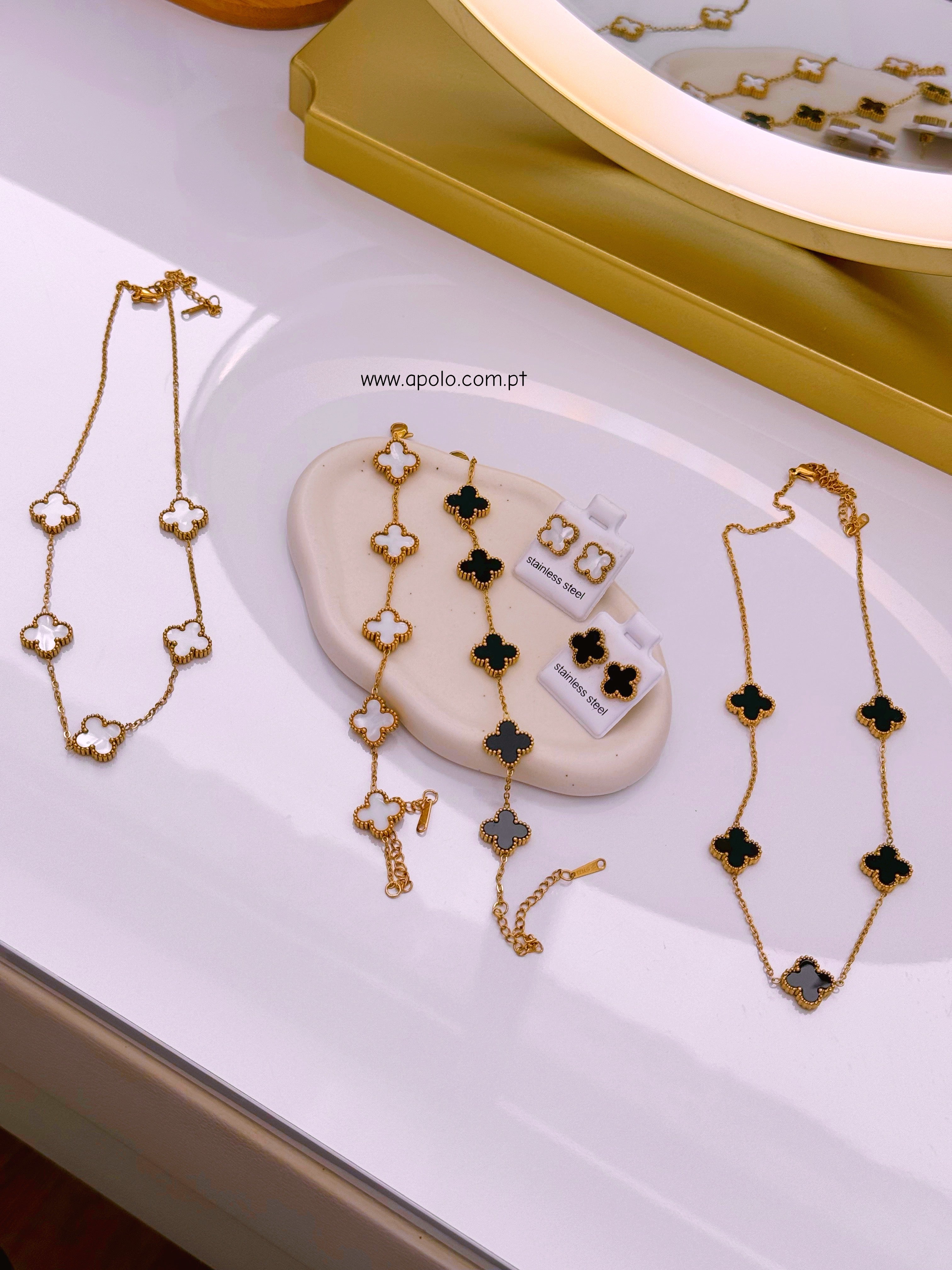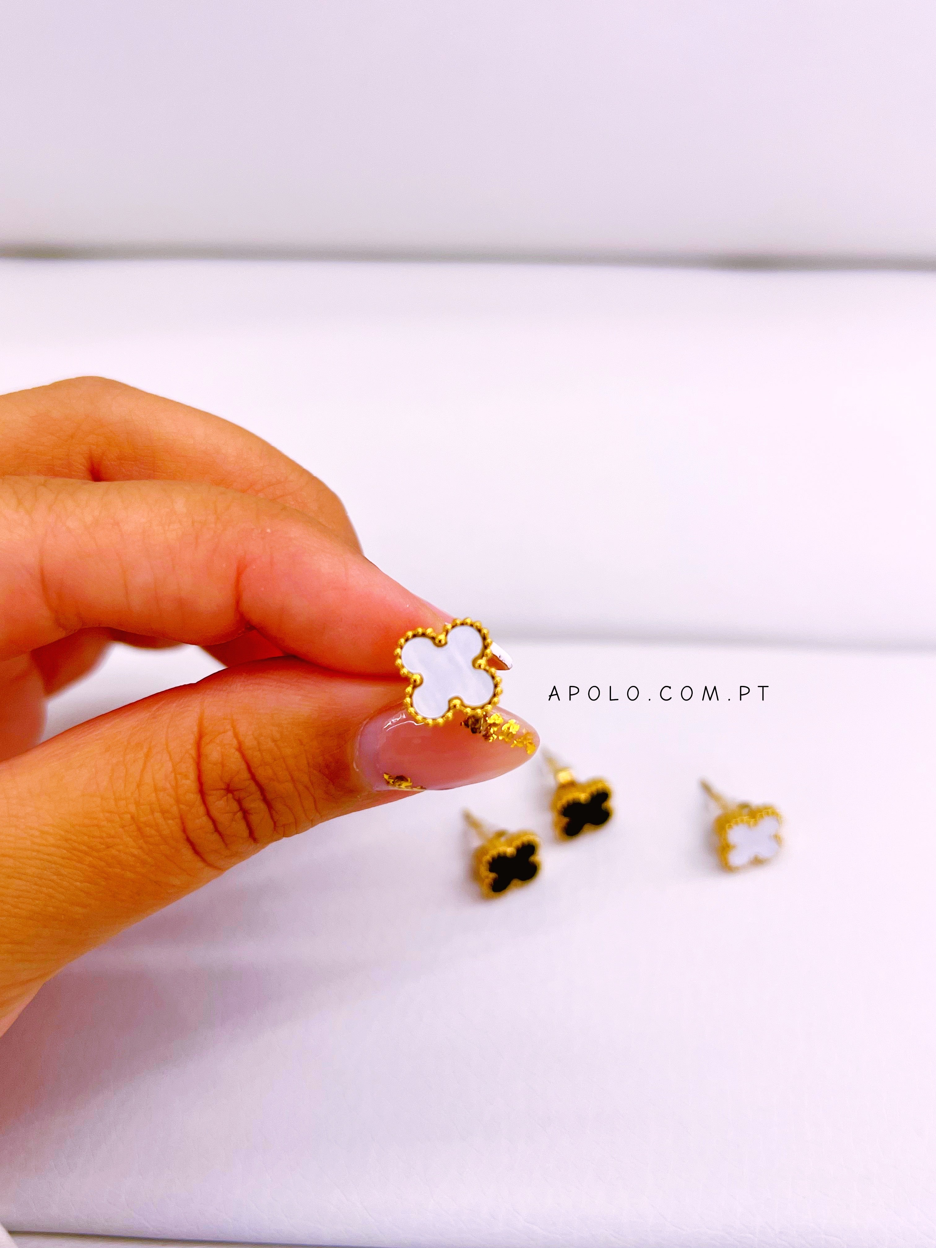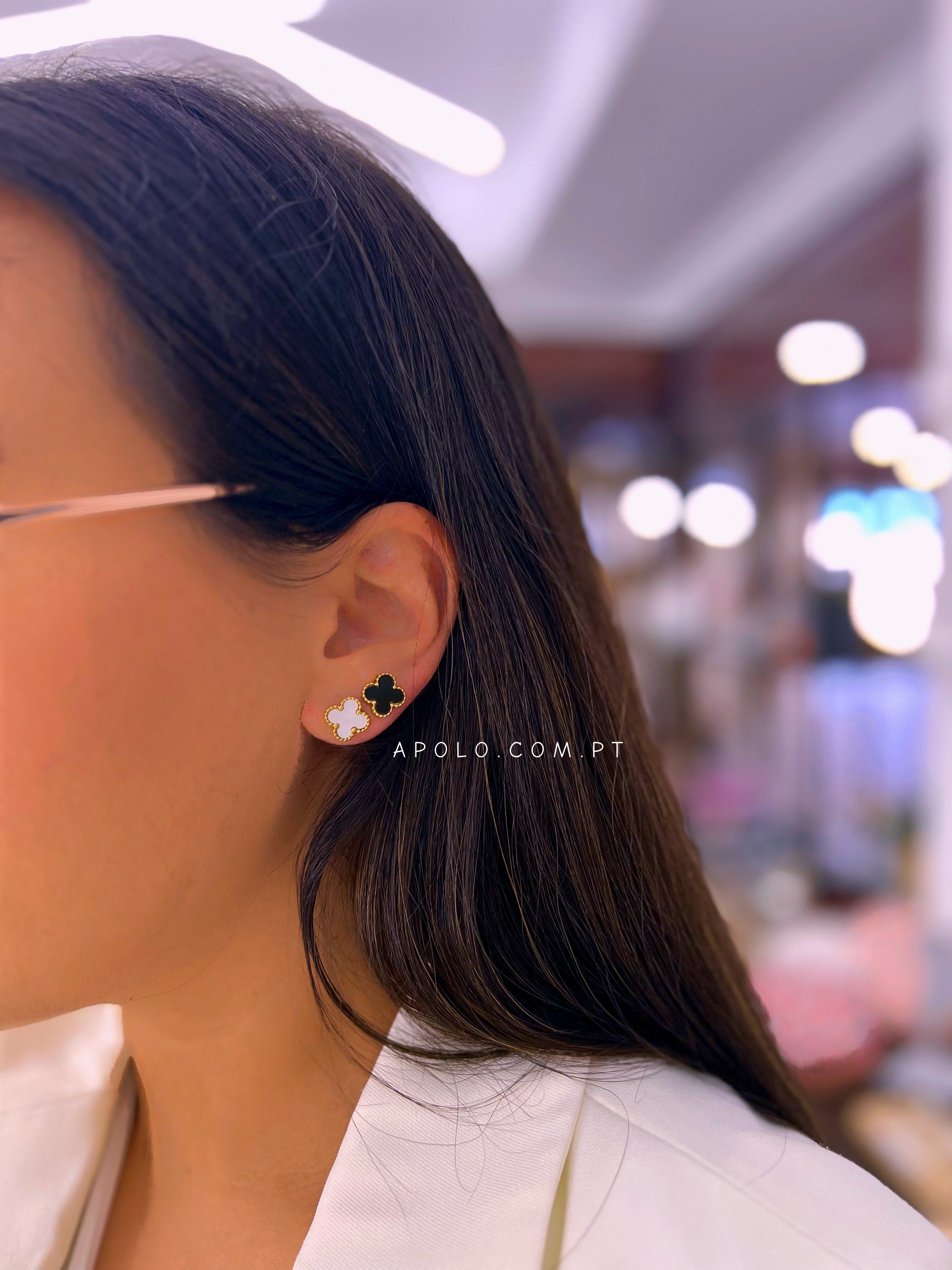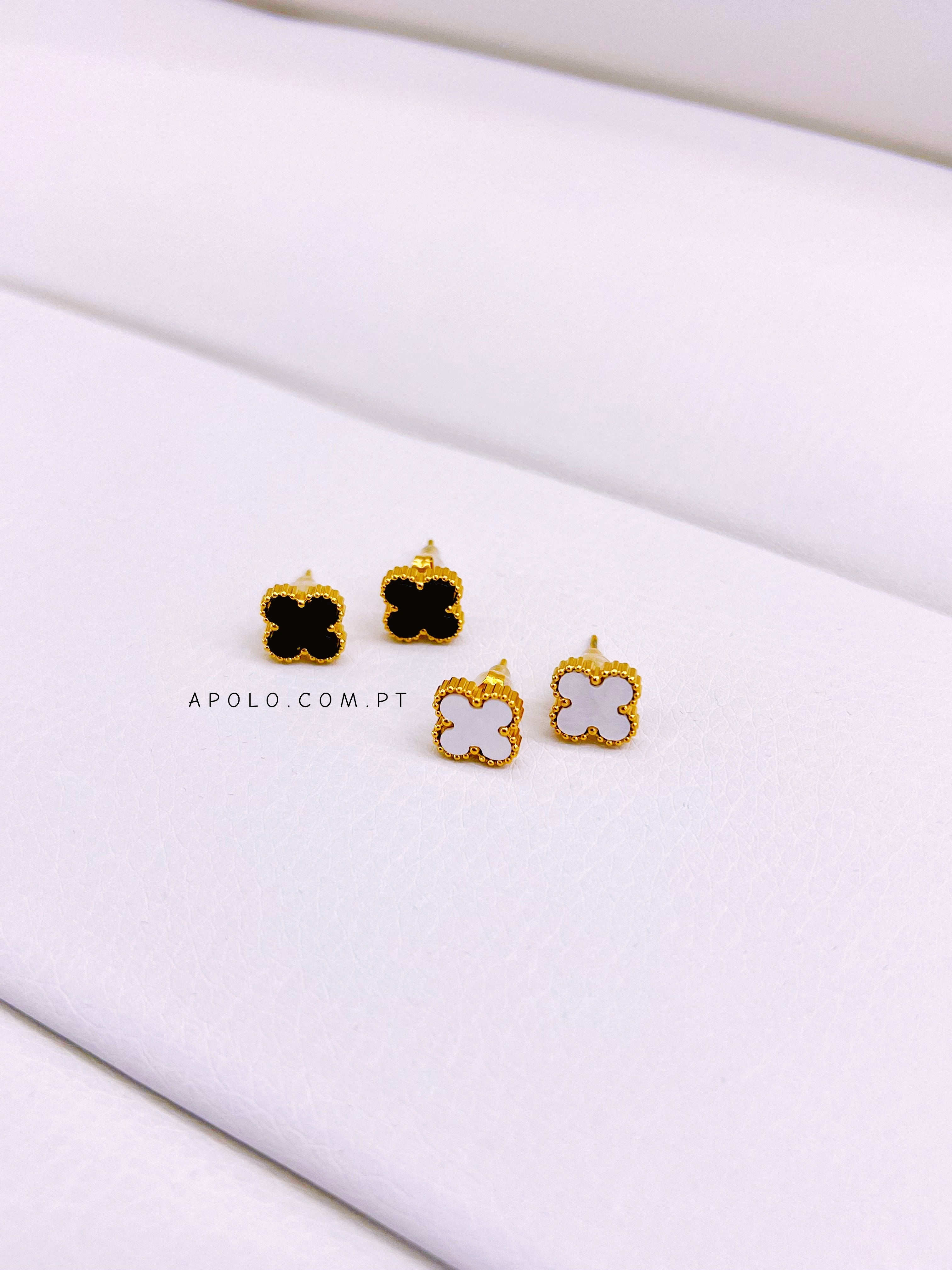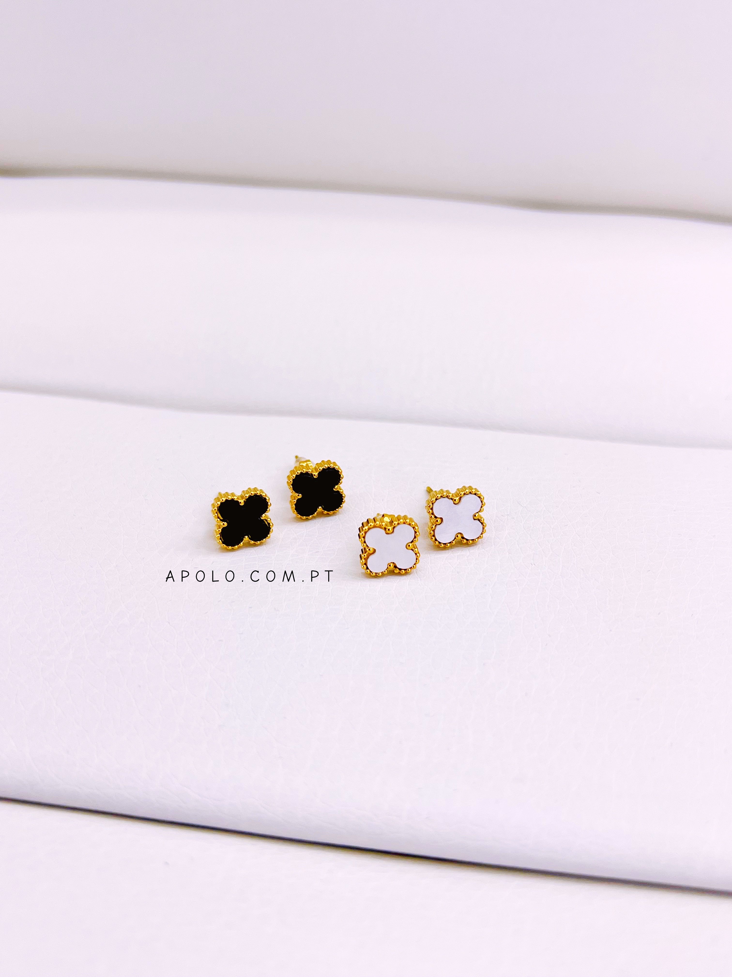 Brincos com formato trevo e preenchidos com efeito madre pérola ou preto.