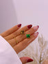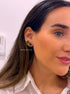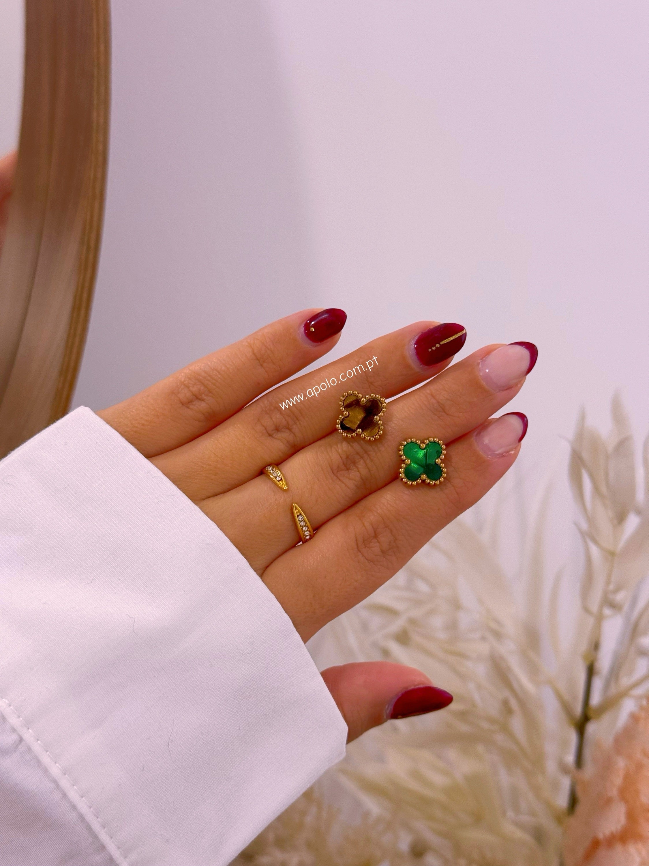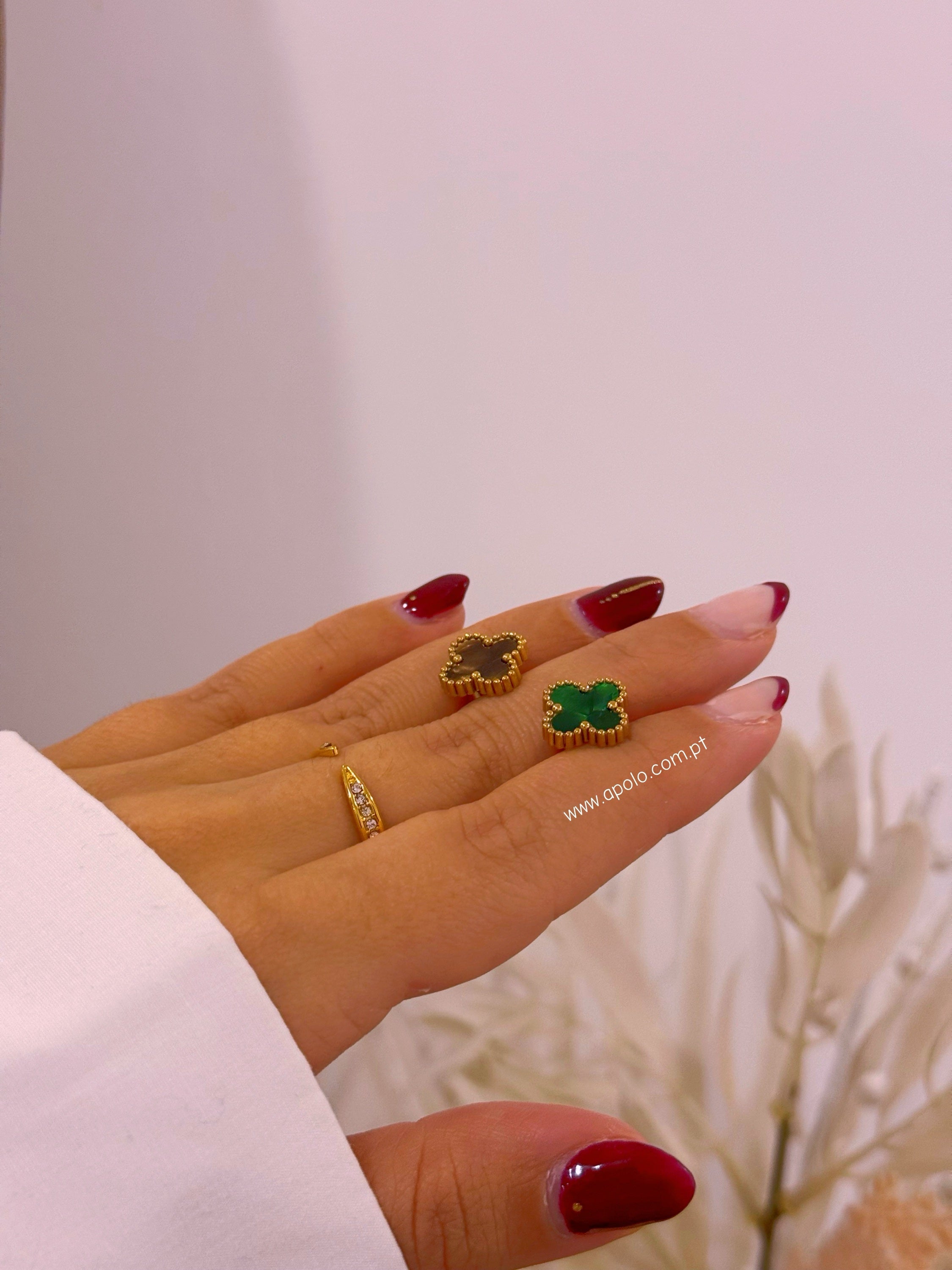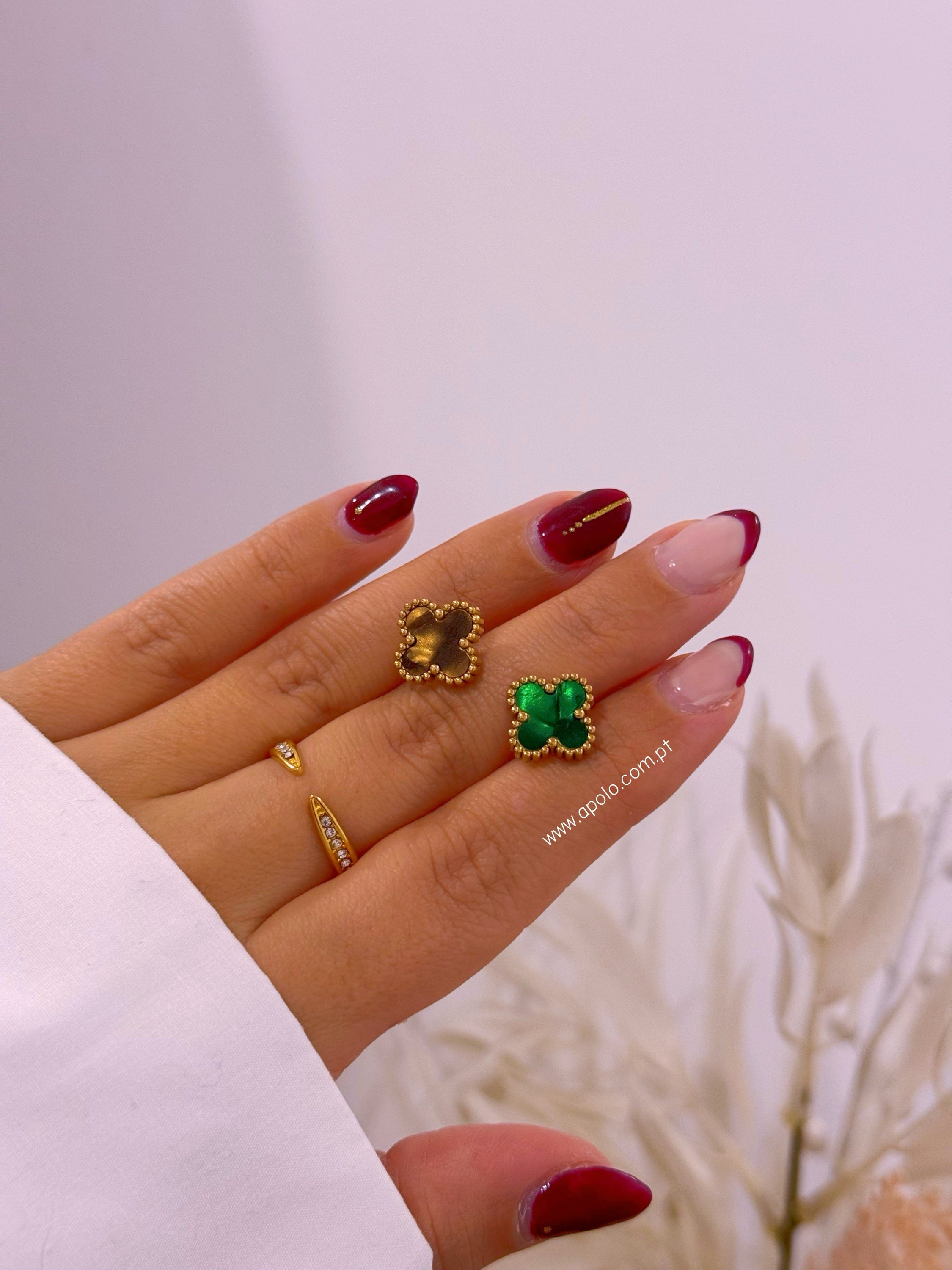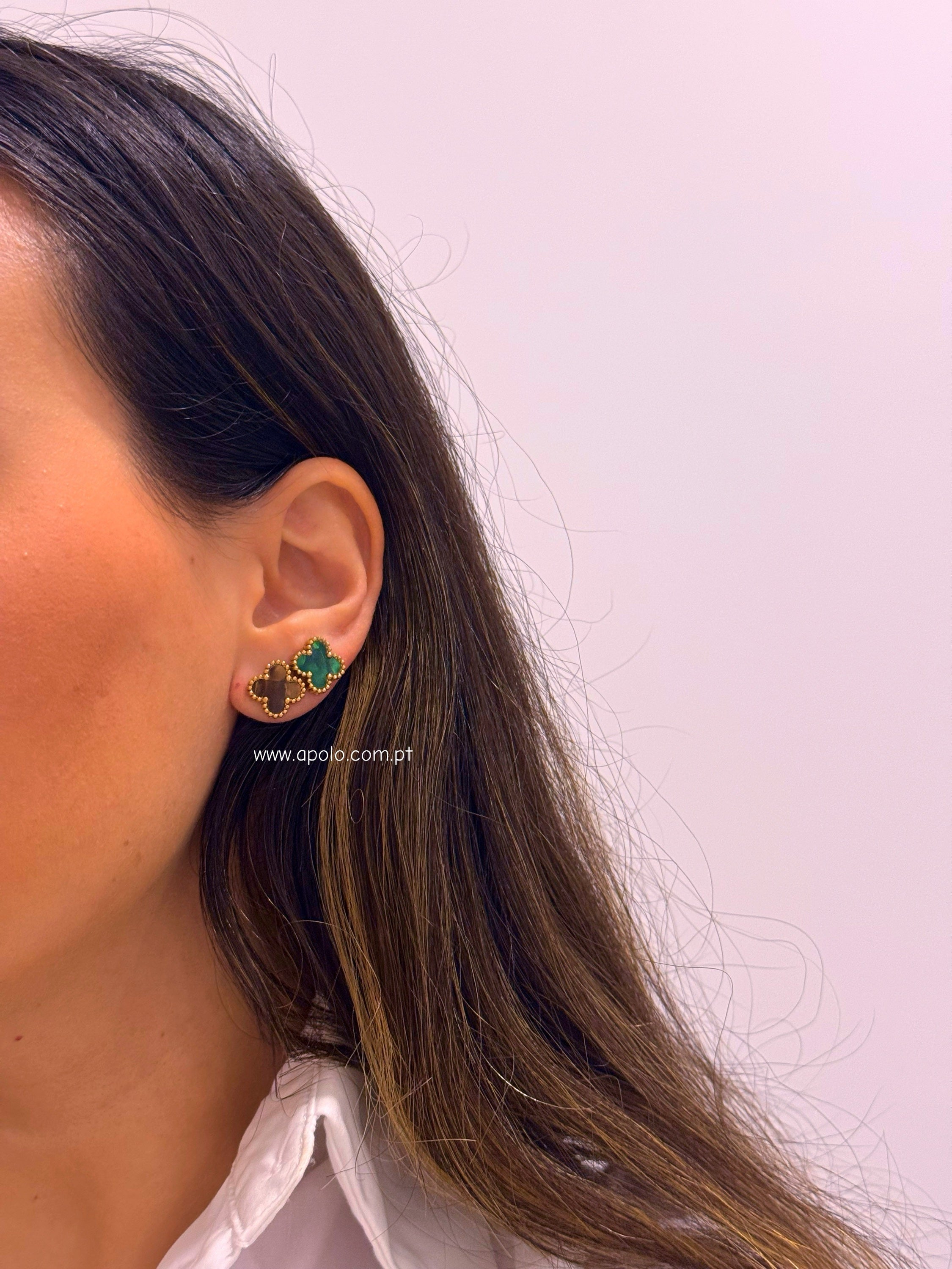Brincos com formato trevo de base dourada, preenchidos com efeito de mármore castanho ou verde esmeralda.