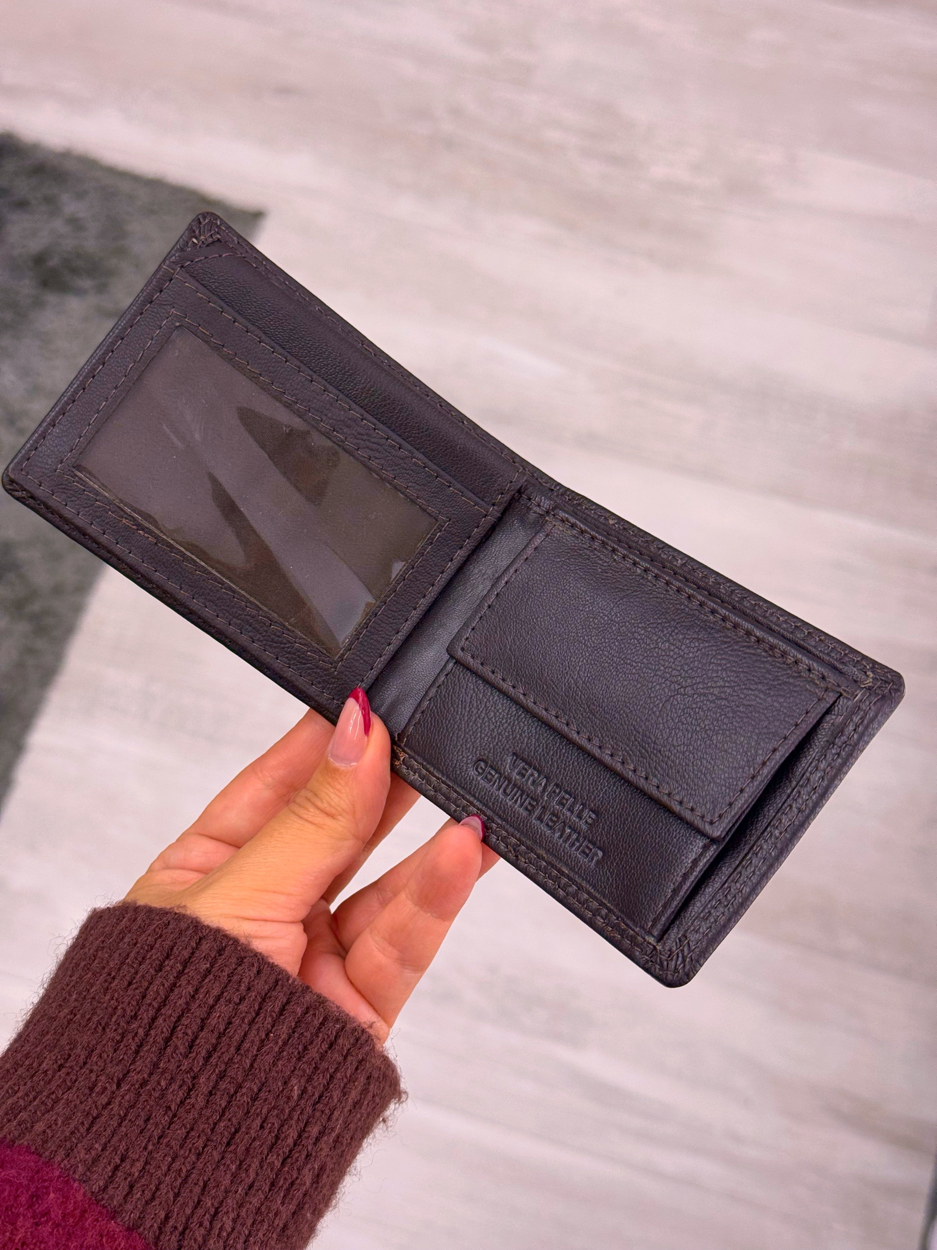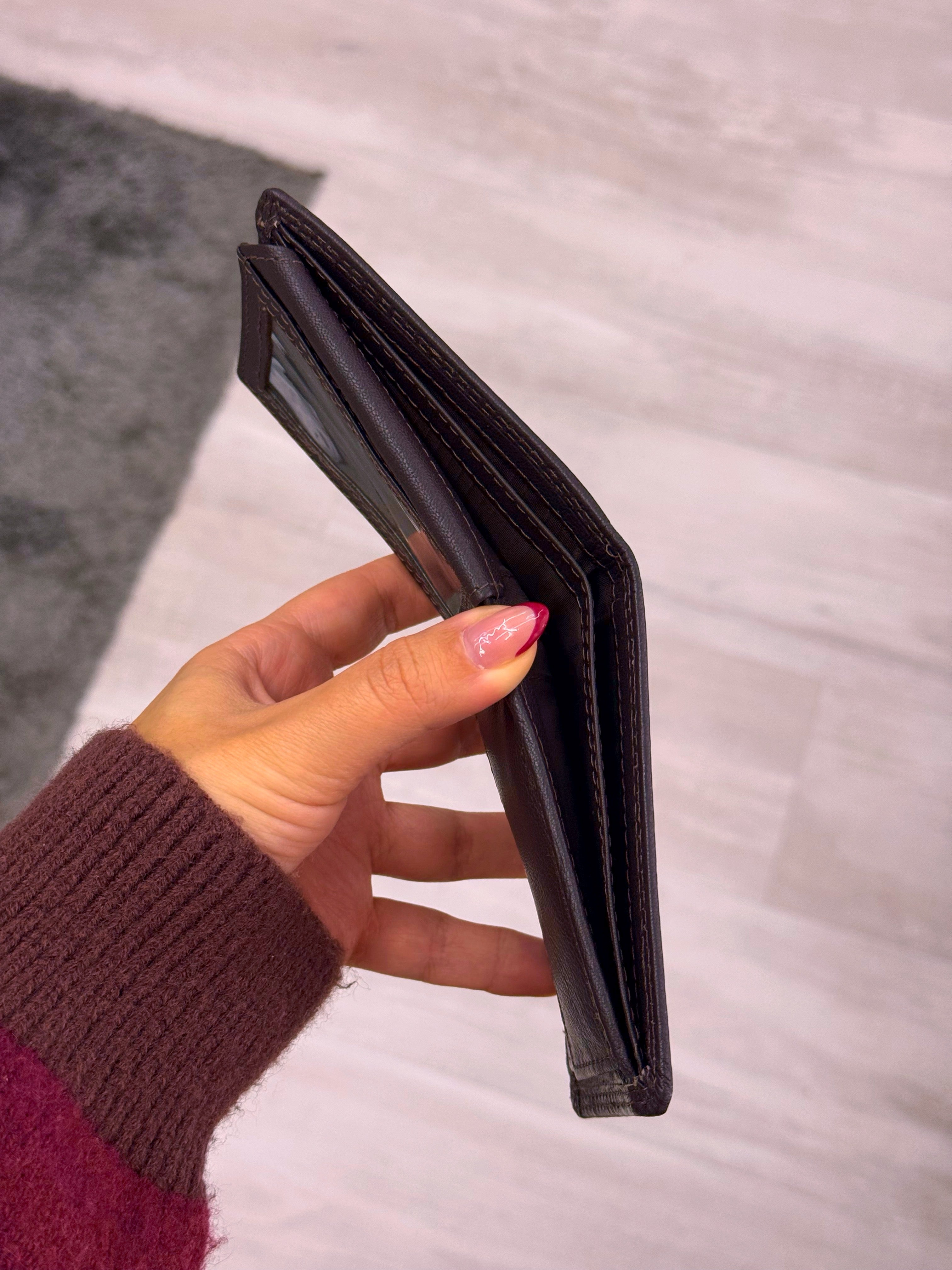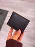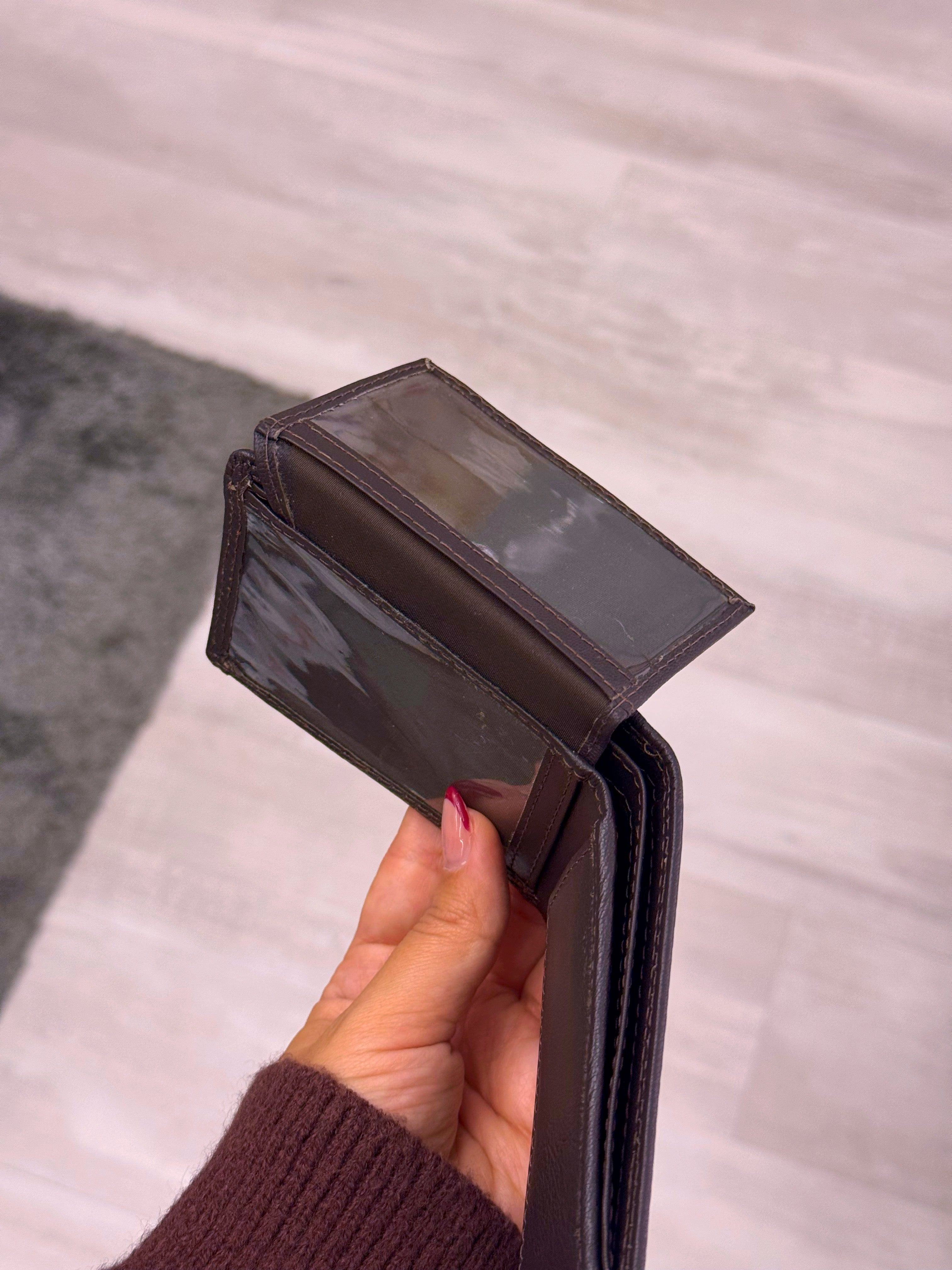 Carteira básica pequena com espaço para cartões, moedas e notas.