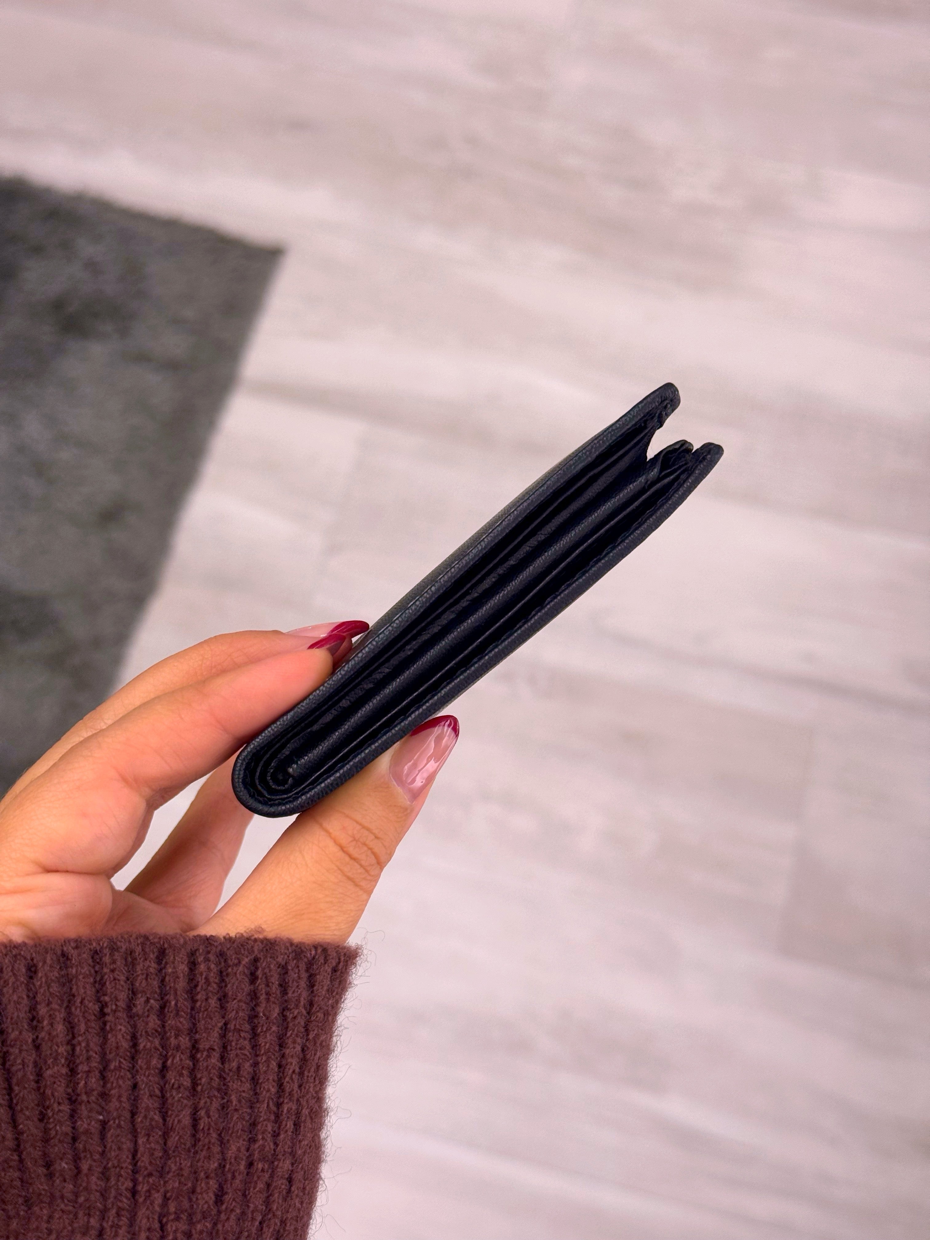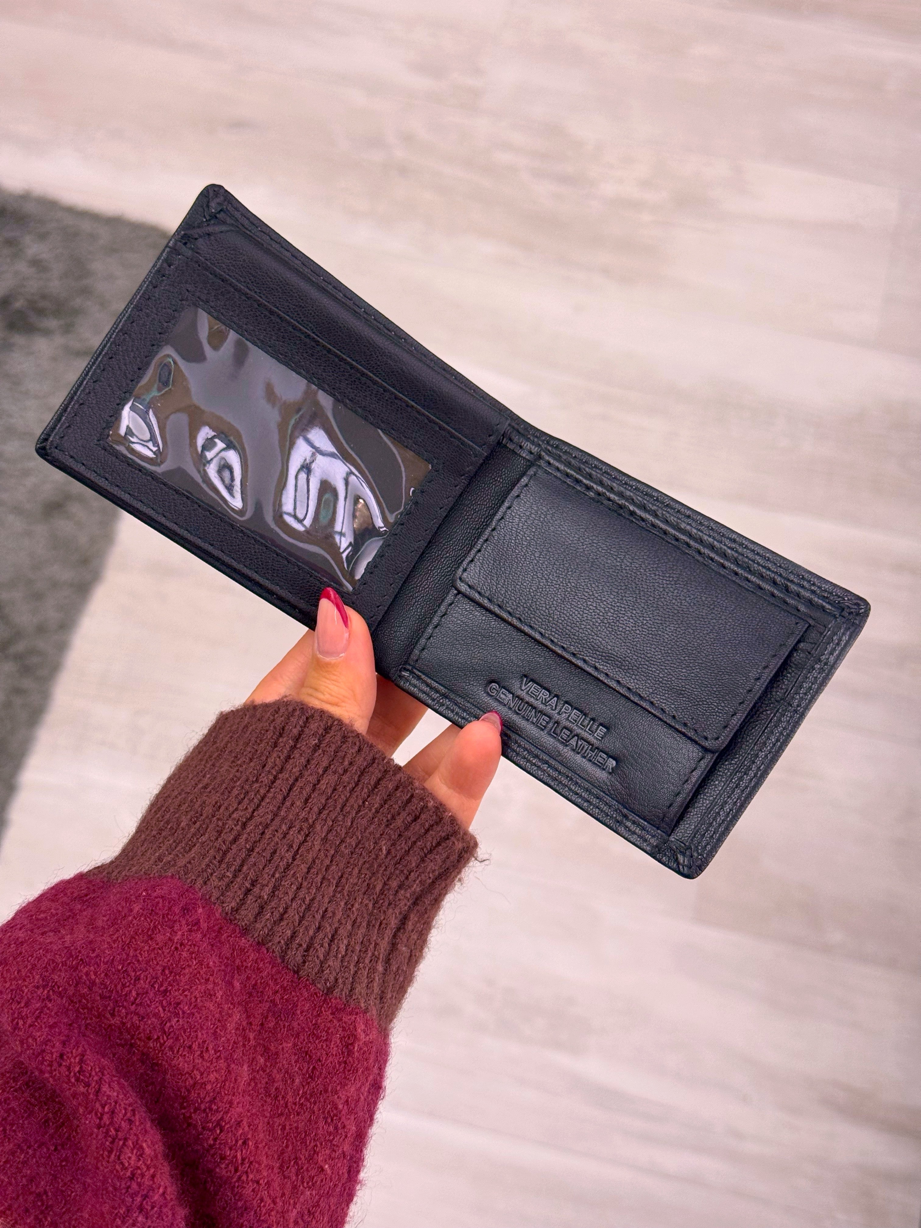 Carteira básica pequena com espaço para cartões, moedas e notas.