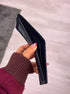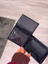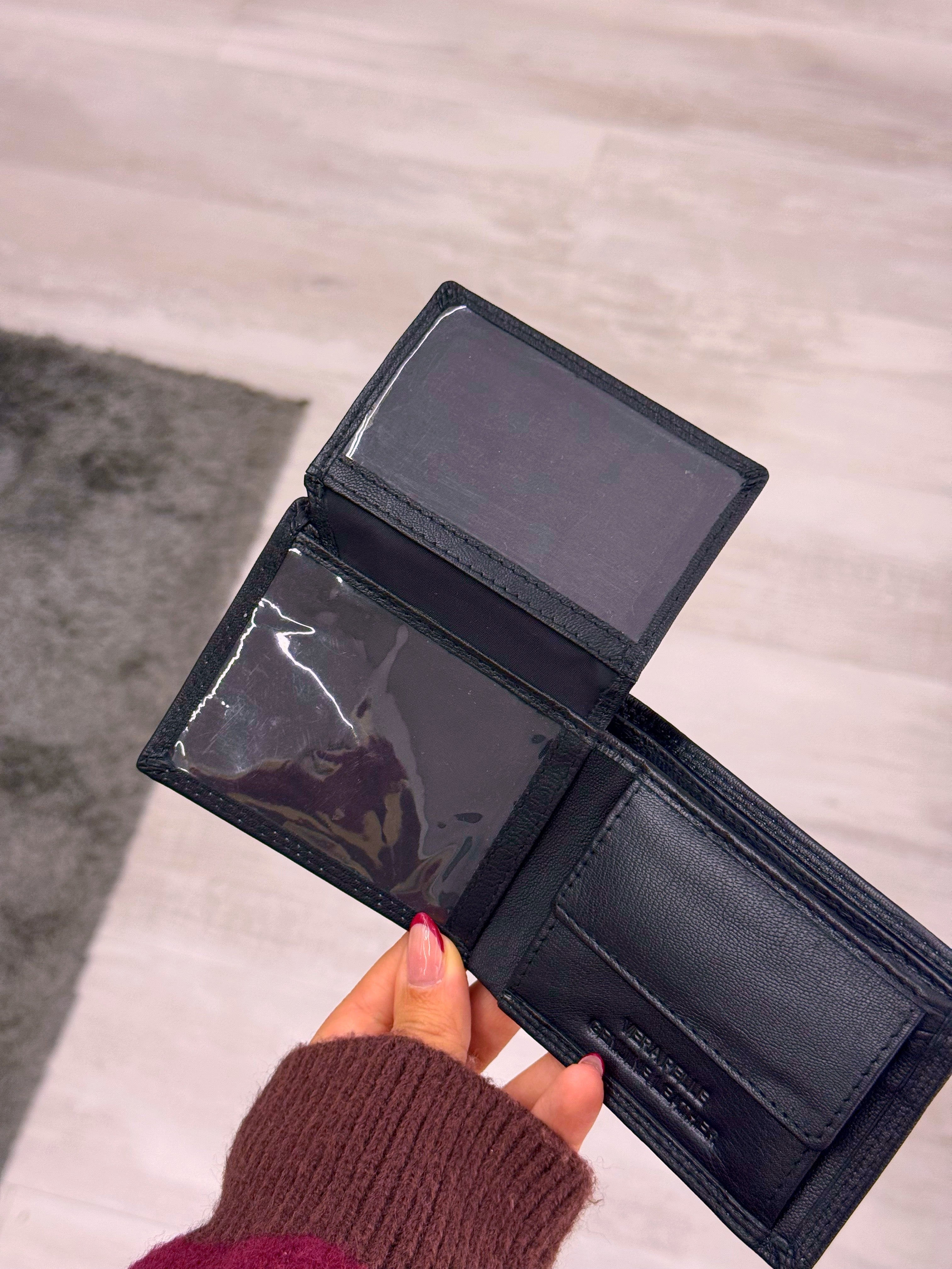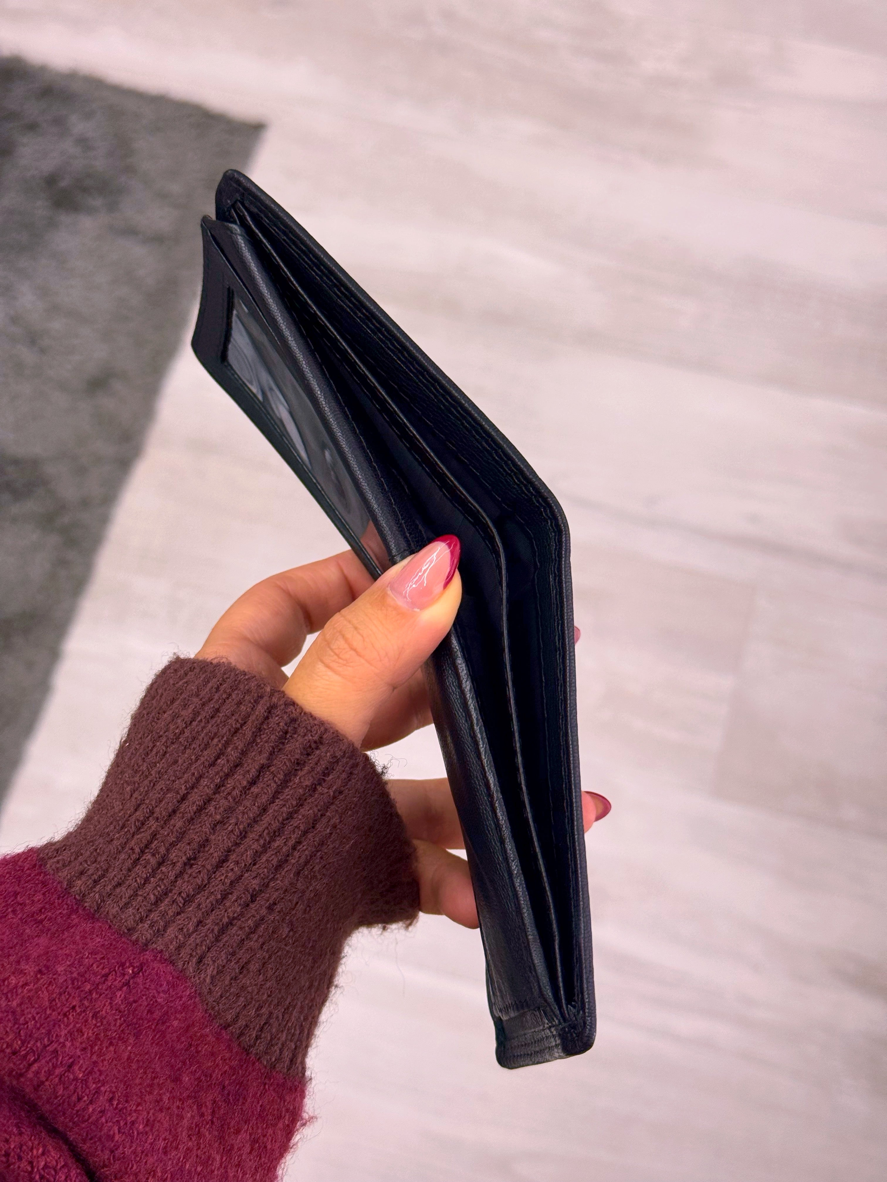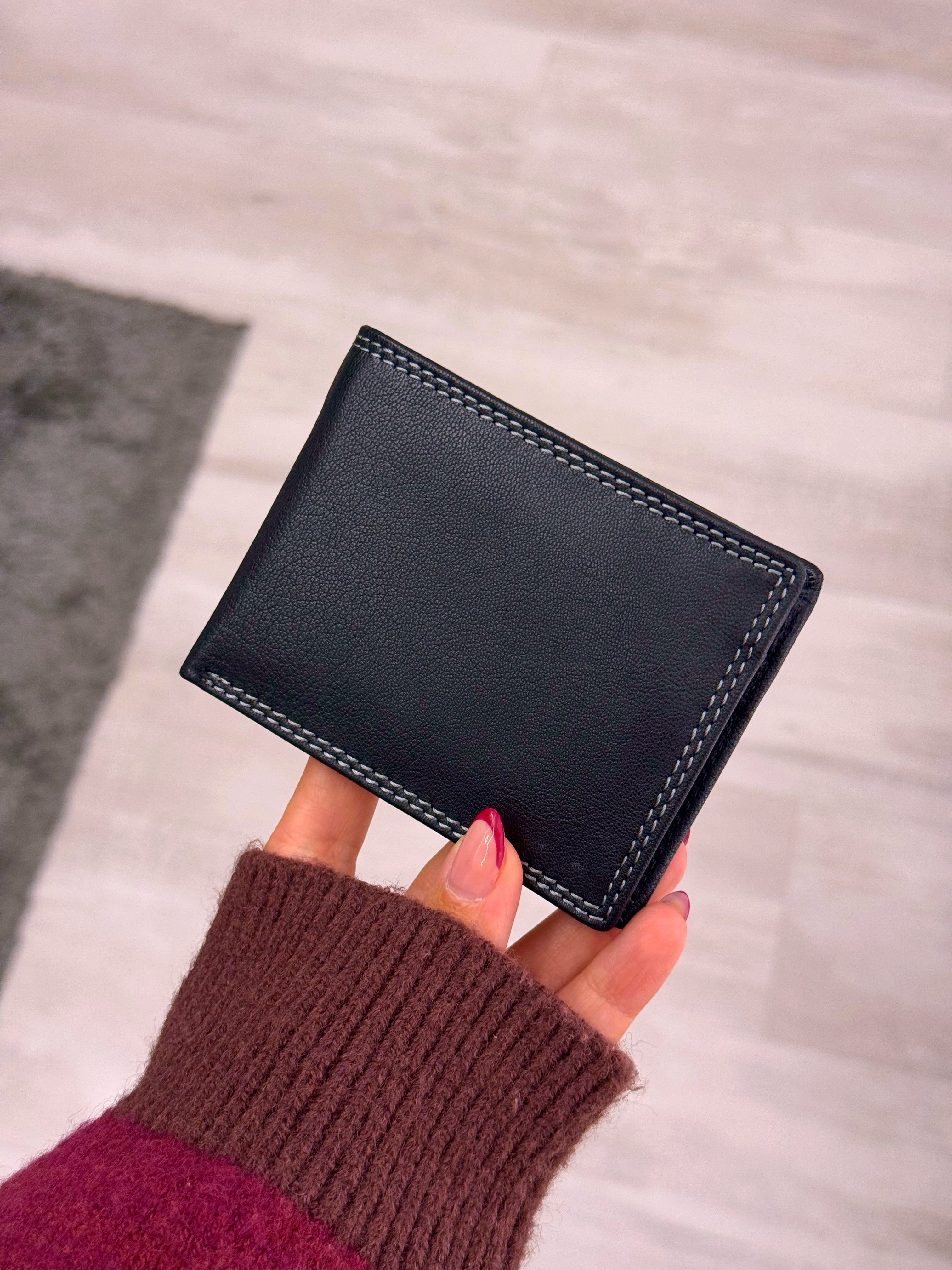 Carteira em pele preta com costura em contraste