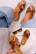 Chinelo de fabrico Nacional, com formato em H castanho e rebordo em dourado.