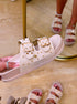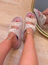 Chinelo com pormenores metálicos dourados e brilhantes em toda a parte das fivelas. As fivelas são ajustáveis, podem abrir e apertar um bocadinho ou alargar. Sola com aproximadamente 3,5 cm.