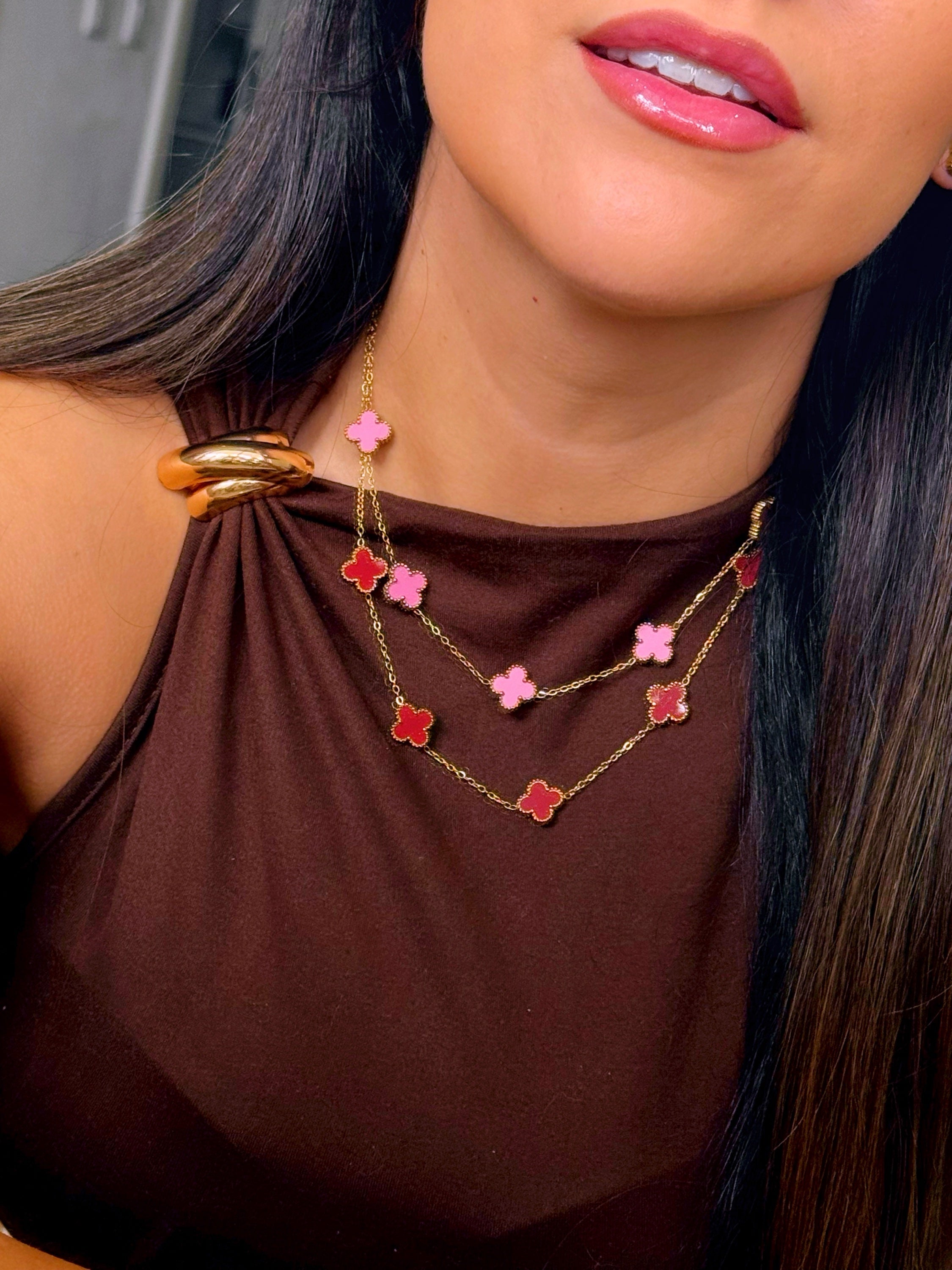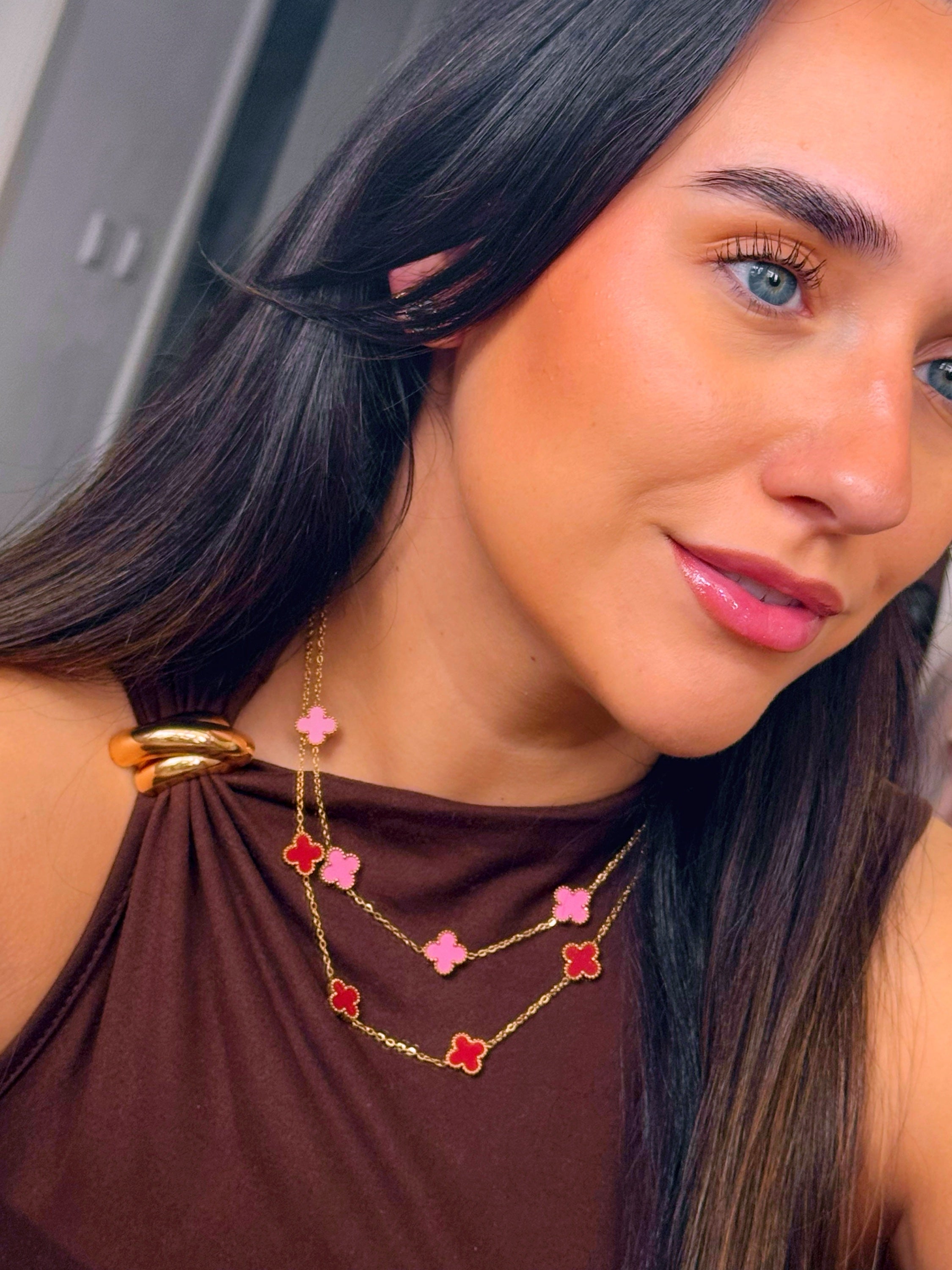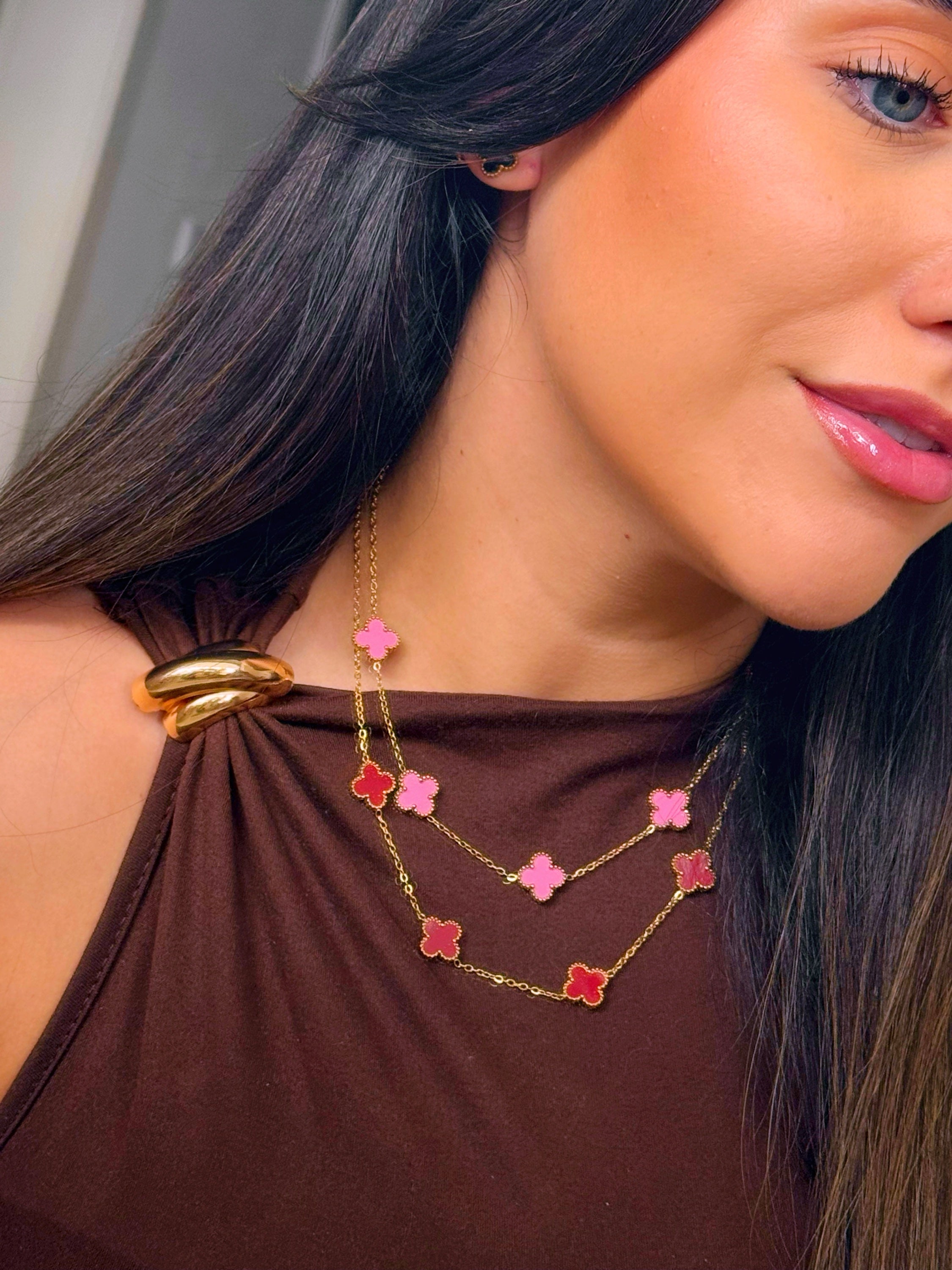 Colar com 5 trevos, esmalte – rosa ou bordô, nesta nova reposição ambos com cor dos 2 lados do trevo.
