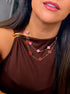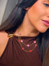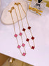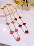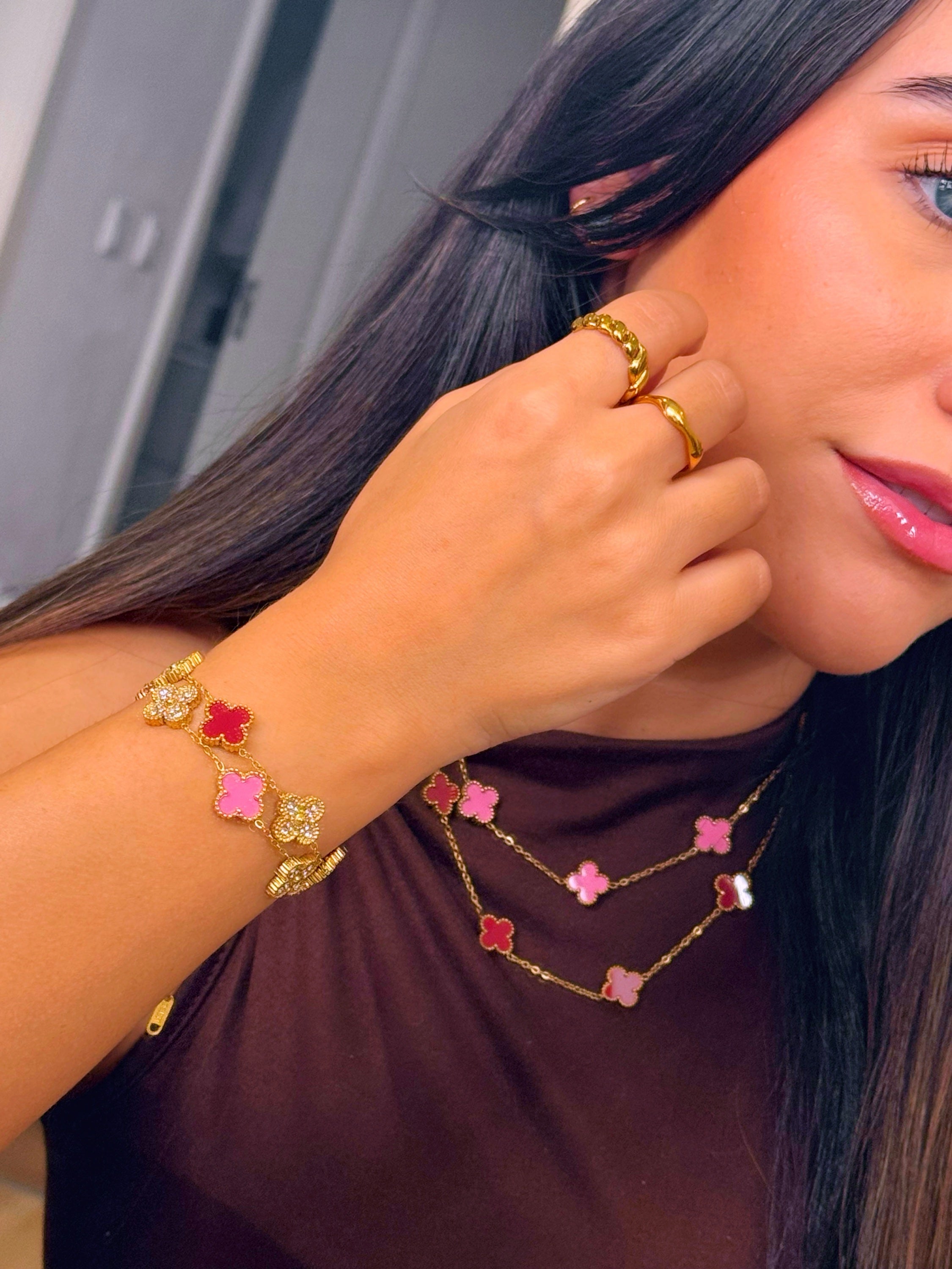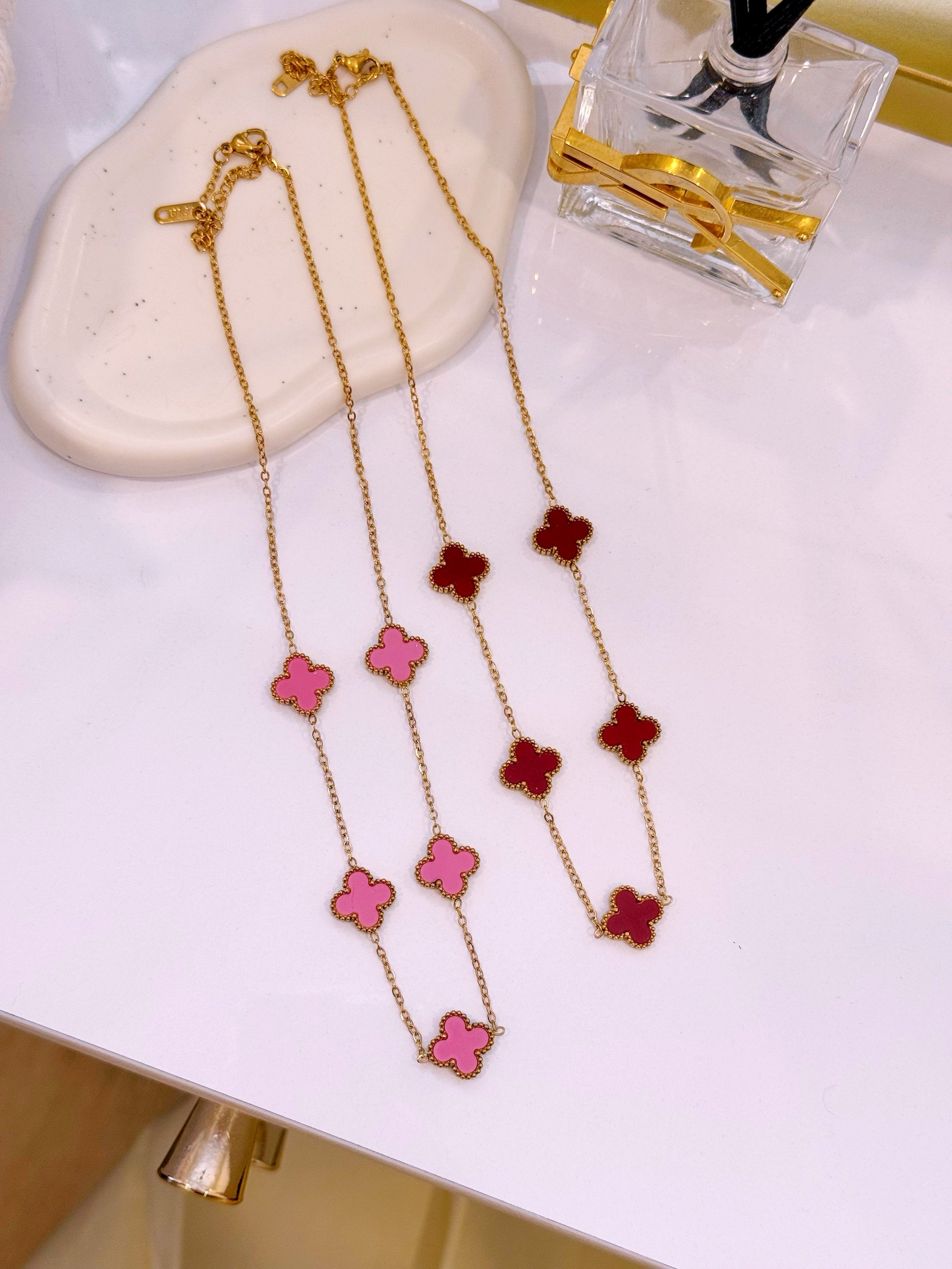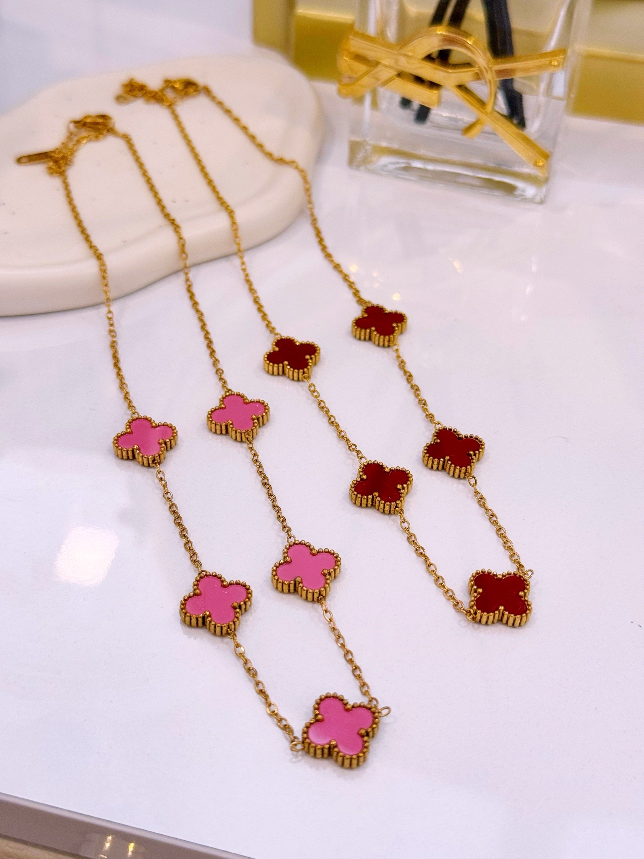 Colar com 5 trevos, esmalte – rosa ou bordô, nesta nova reposição ambos com cor dos 2 lados do trevo.