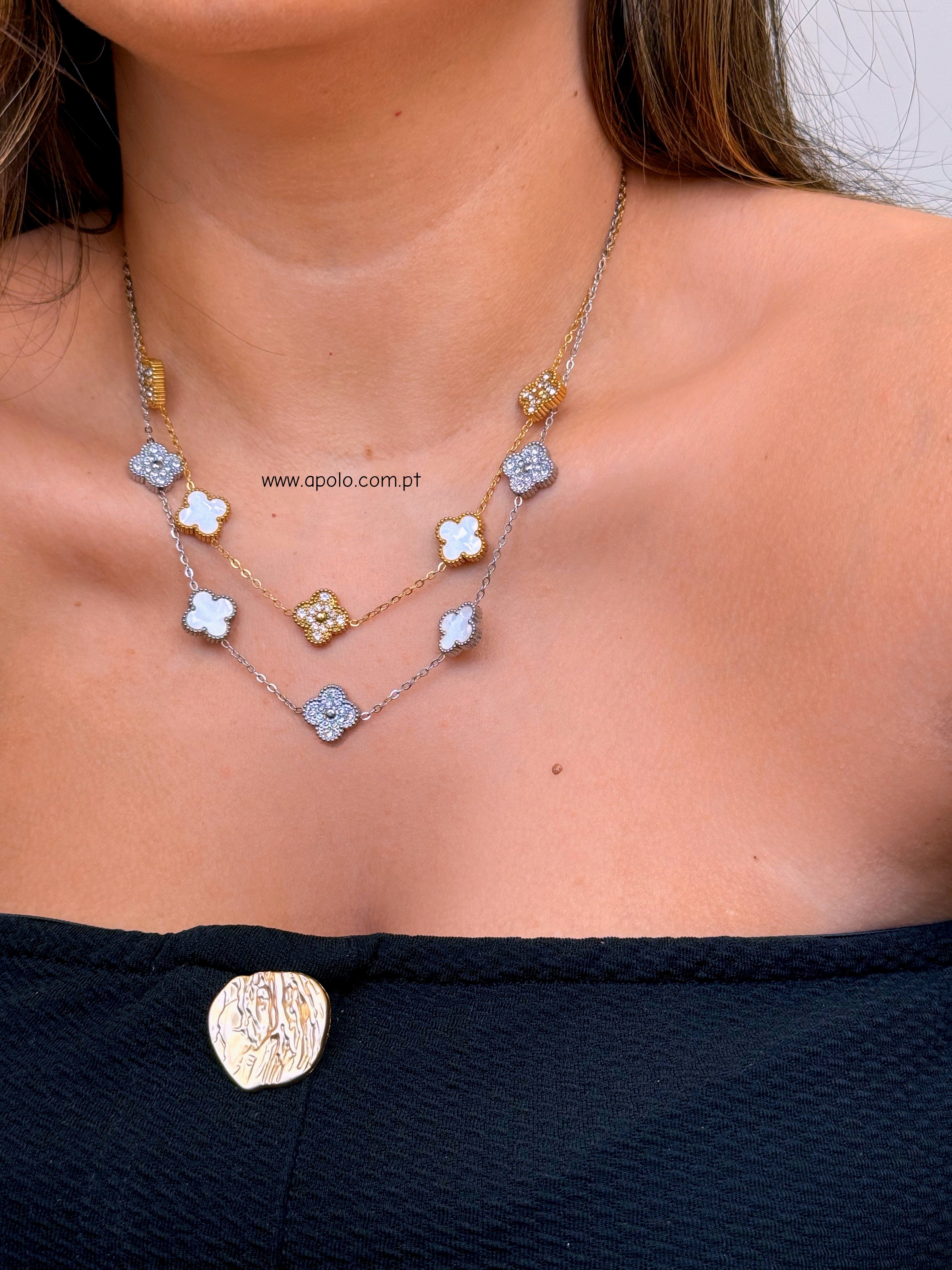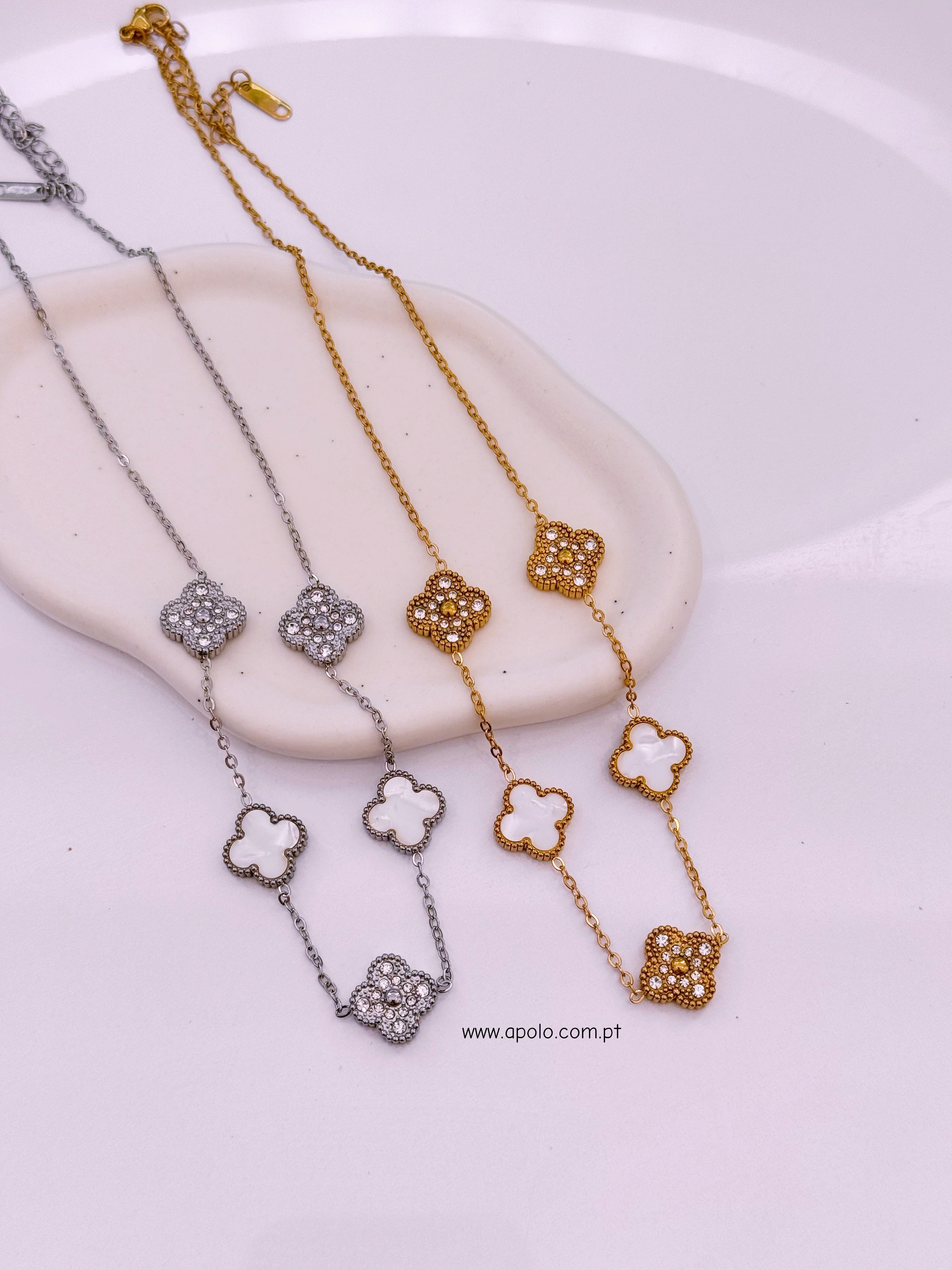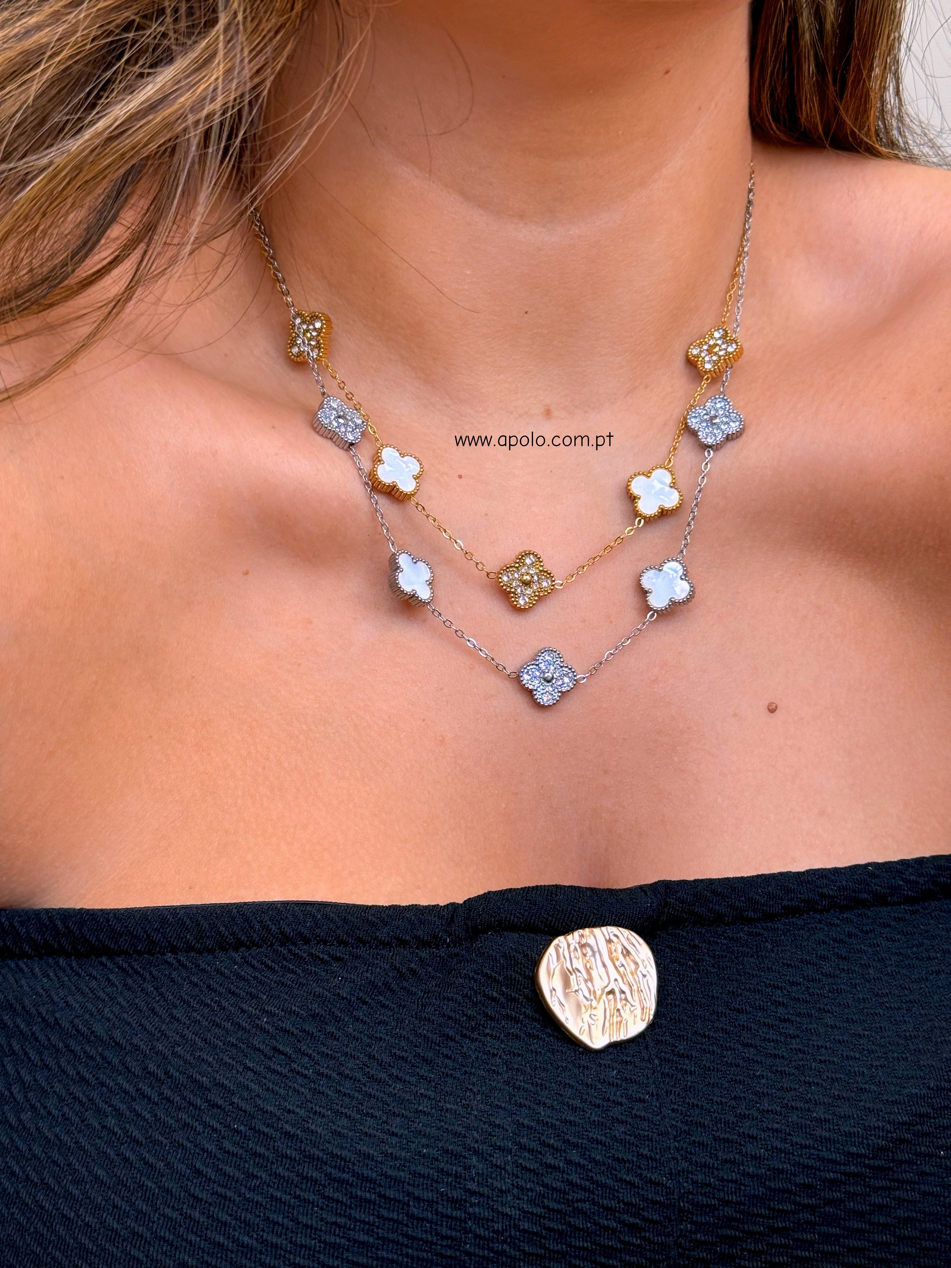 Colar 5 trevos reversíveis com brilhantes e madre pérola | 2 Cores
