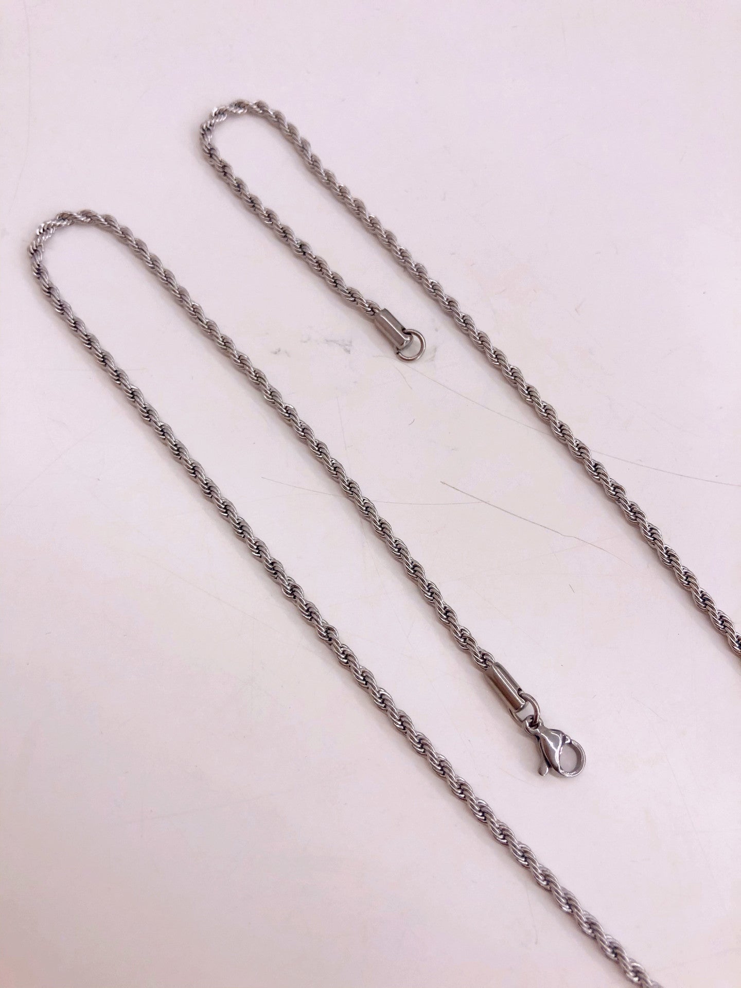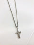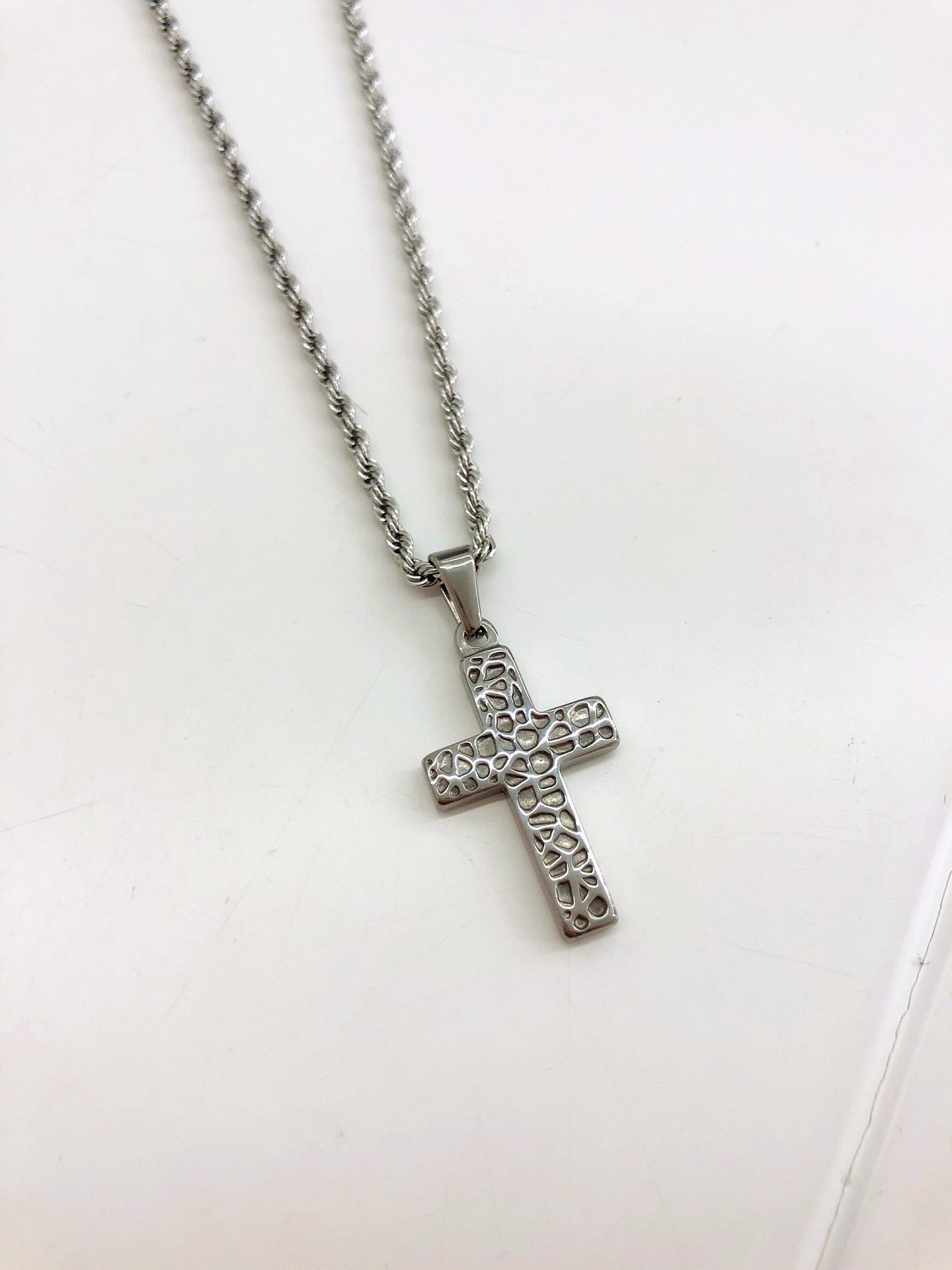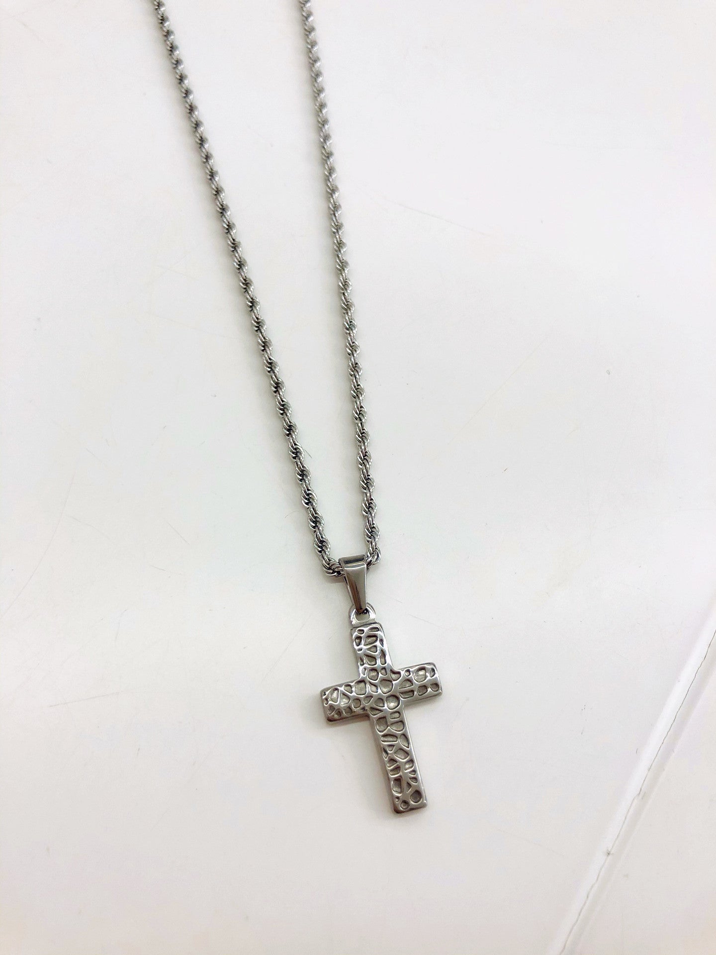 Colar prateado com malha torcida fina e pendente da cruz com um efeito de relevo trabalhado.