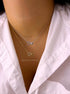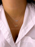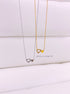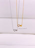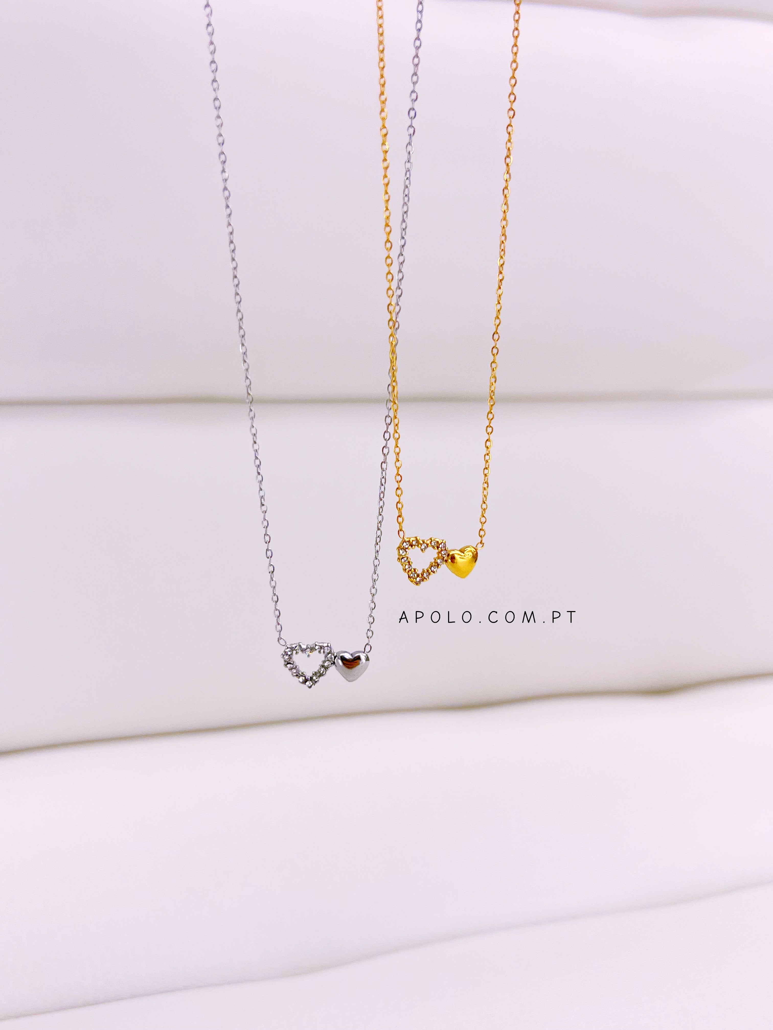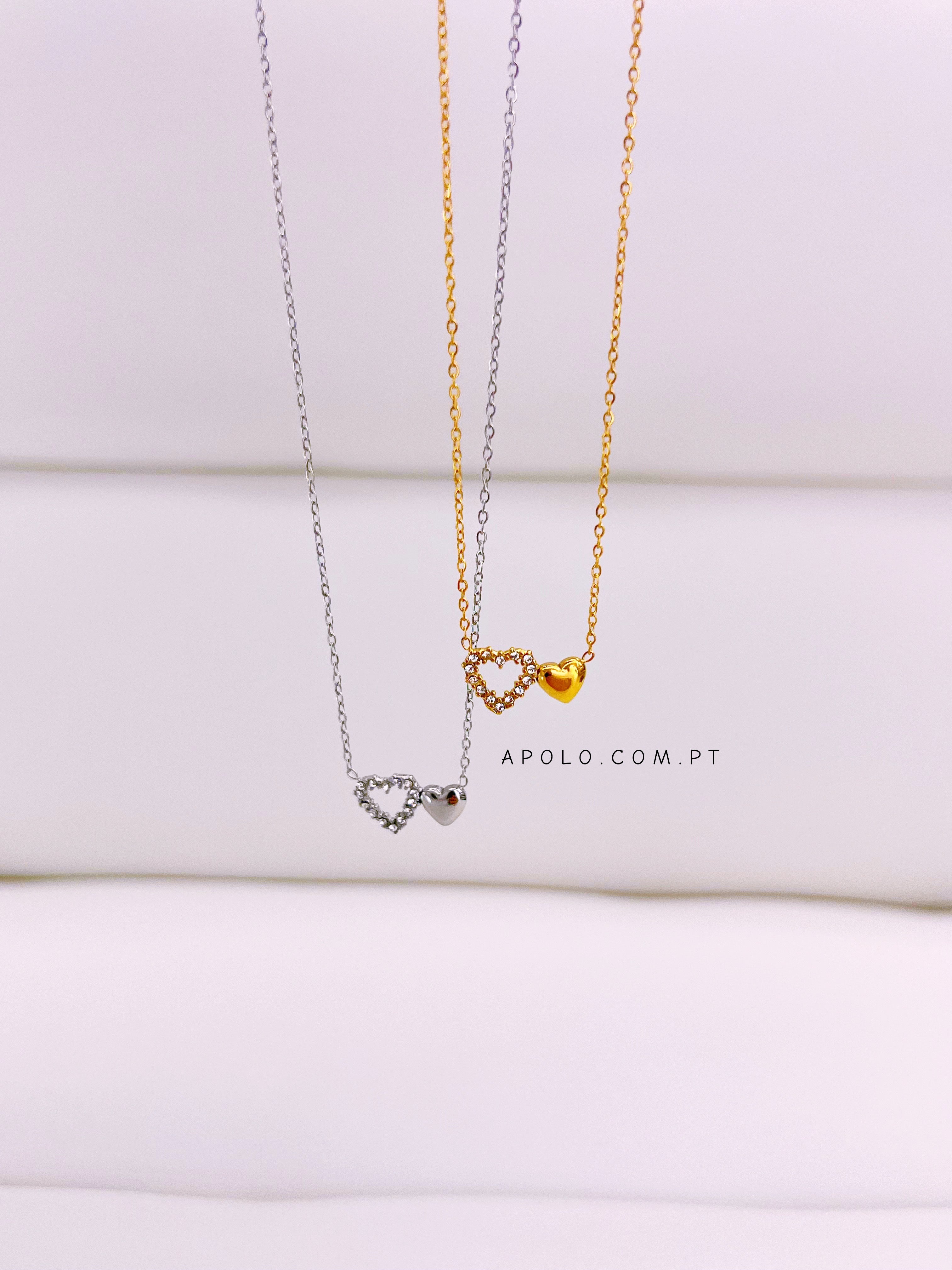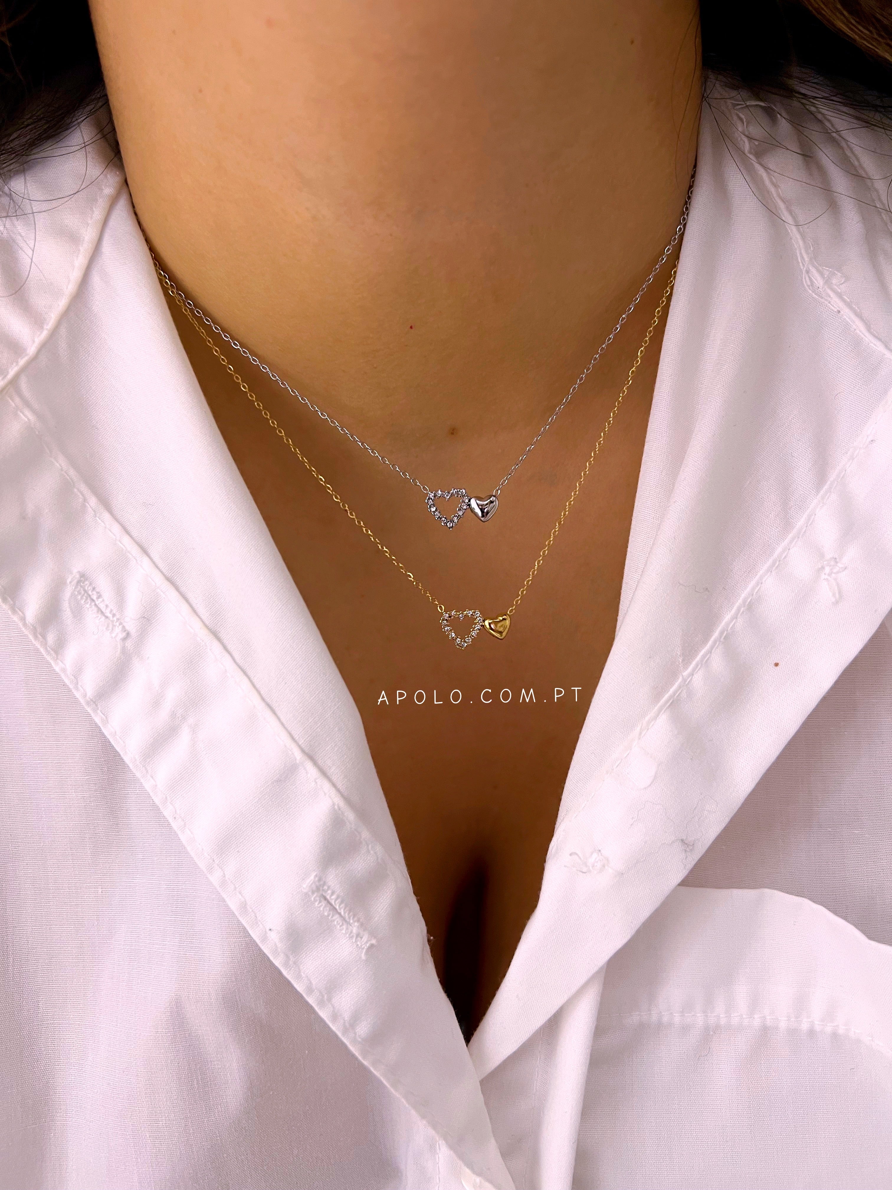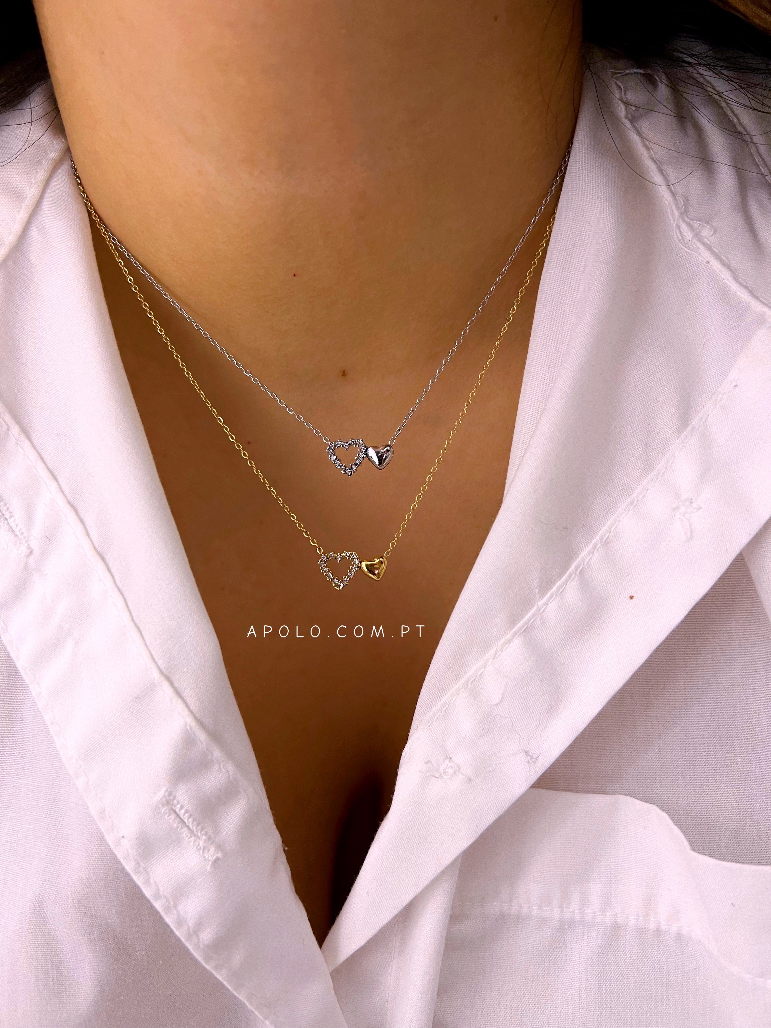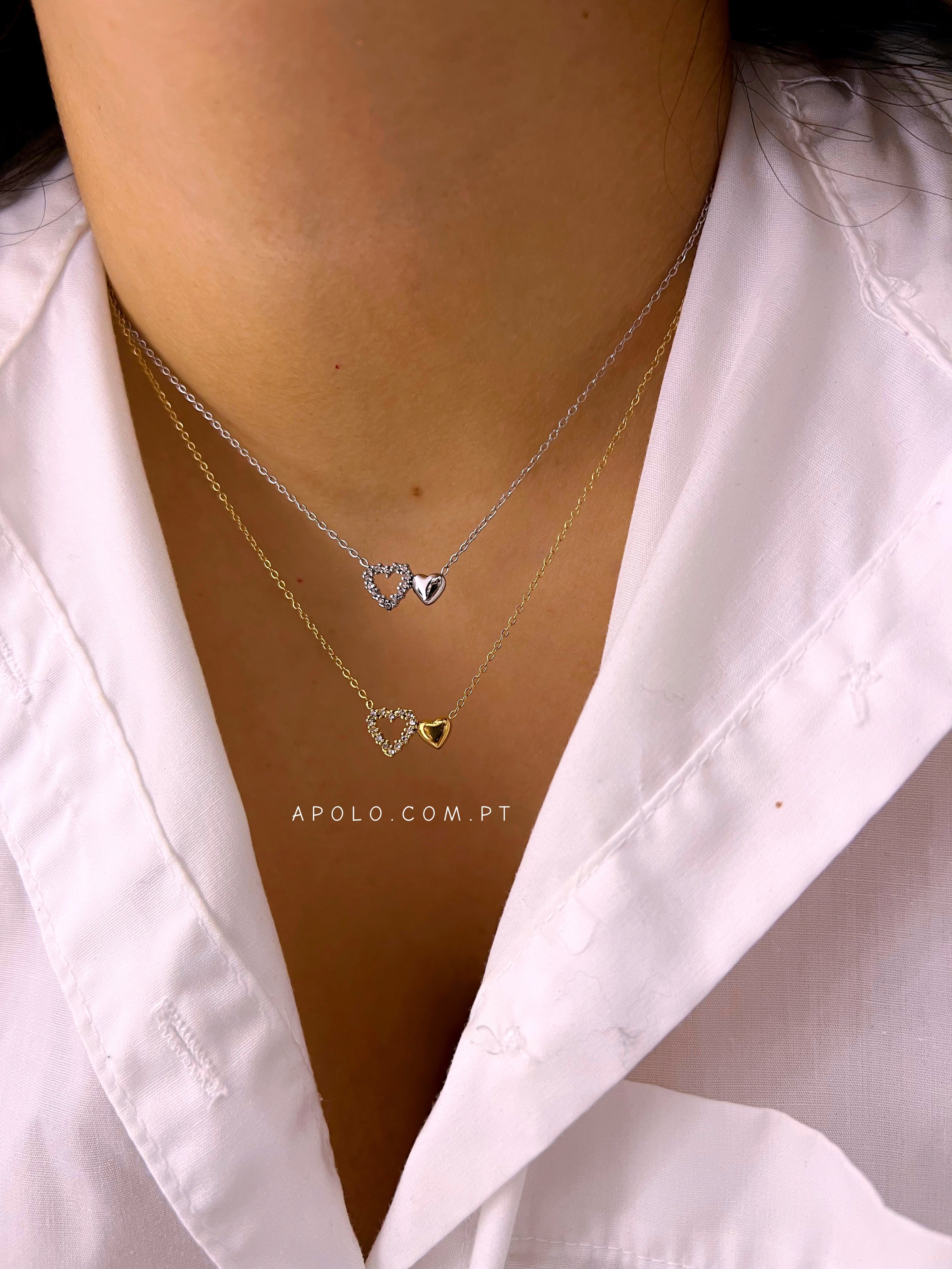 Colar malha fininha com 2 corações unidos, um deles aberto com contorno em brilhantes e o outro maciço liso.