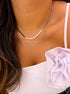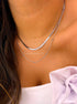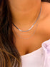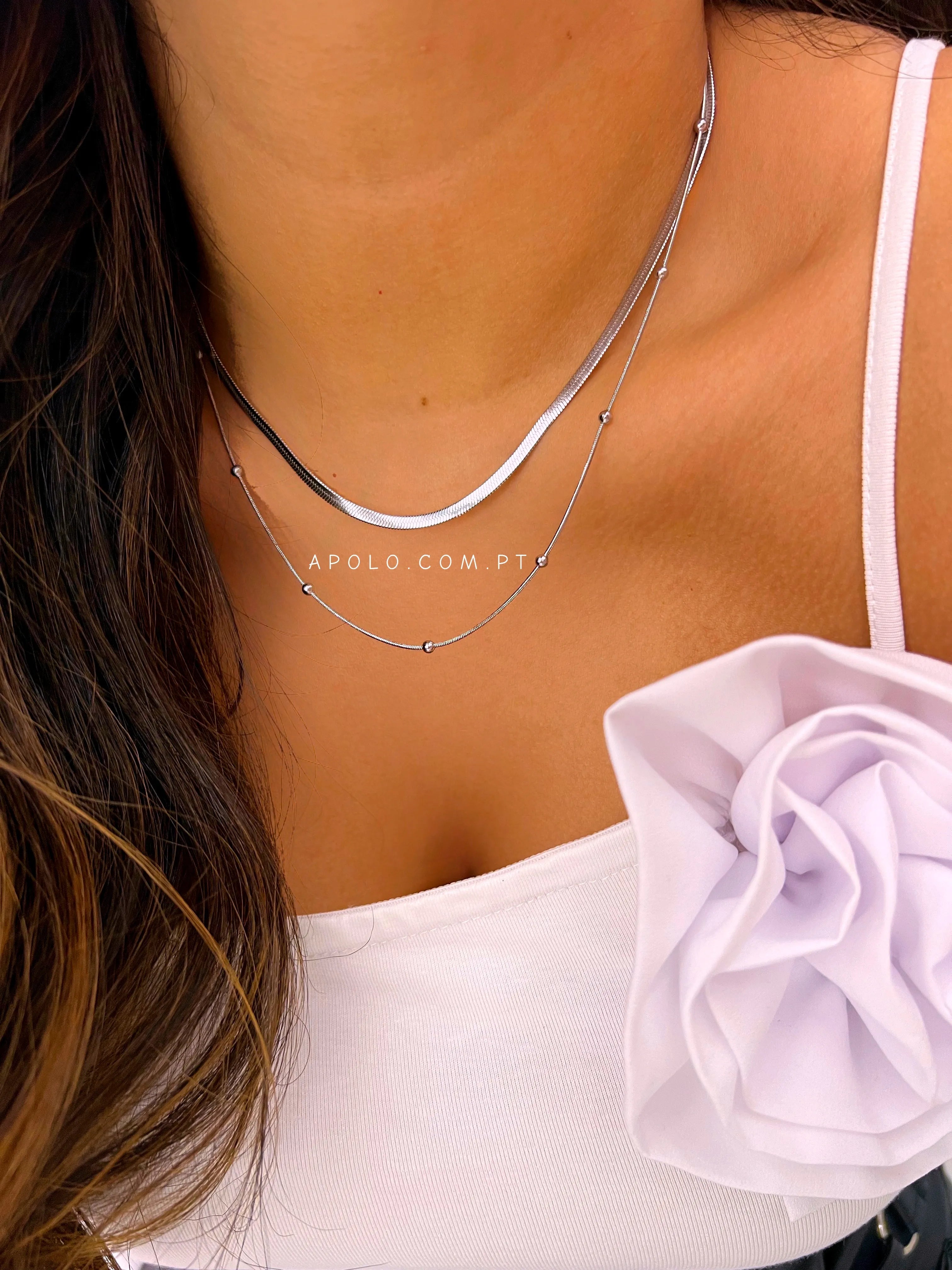 Conjunto de colar prateado de malha achatada e malha fina com bolinhas, sendo a mais curta a malha achatada e a mais comprida a malha fina com bolinhas.