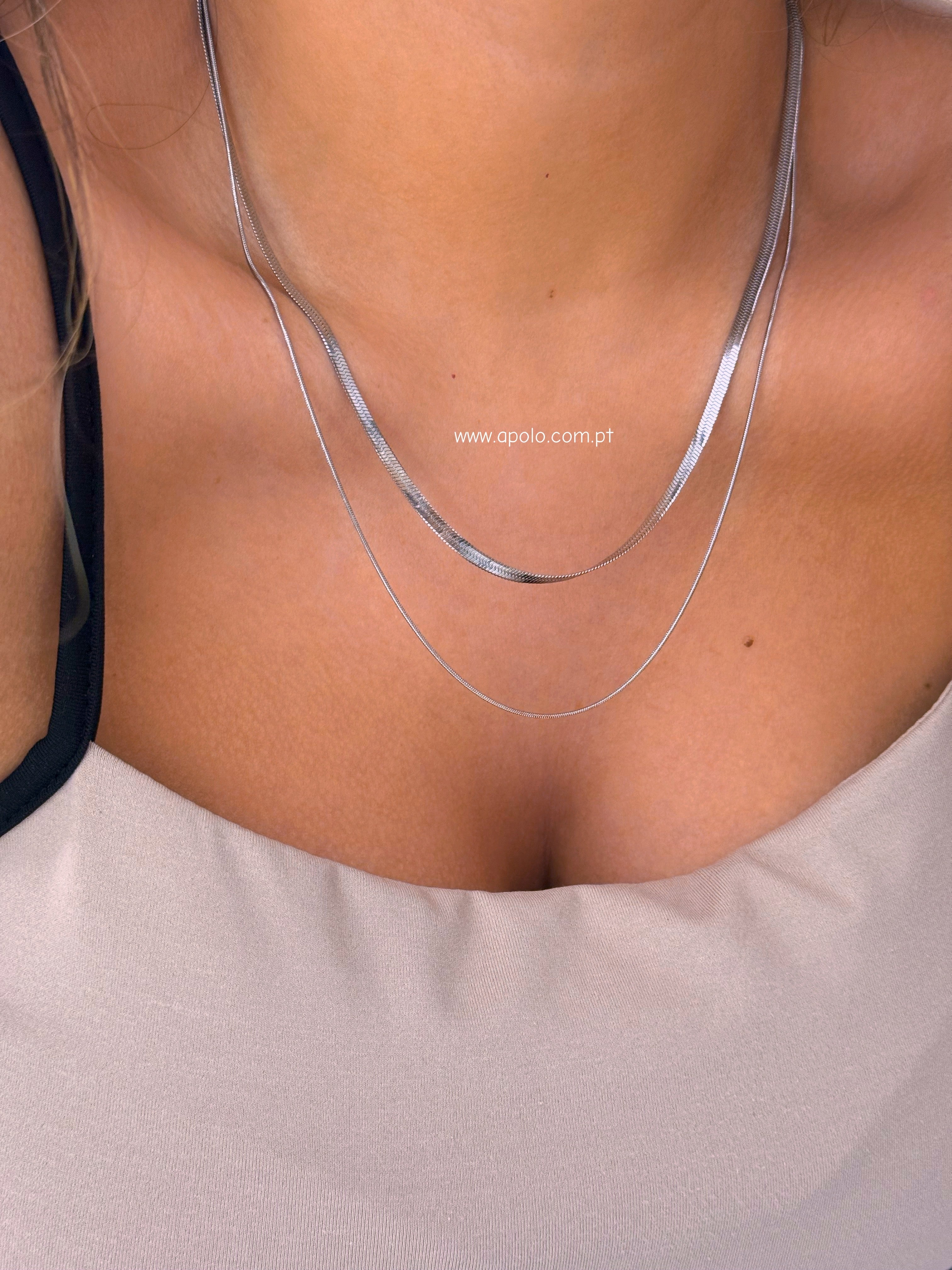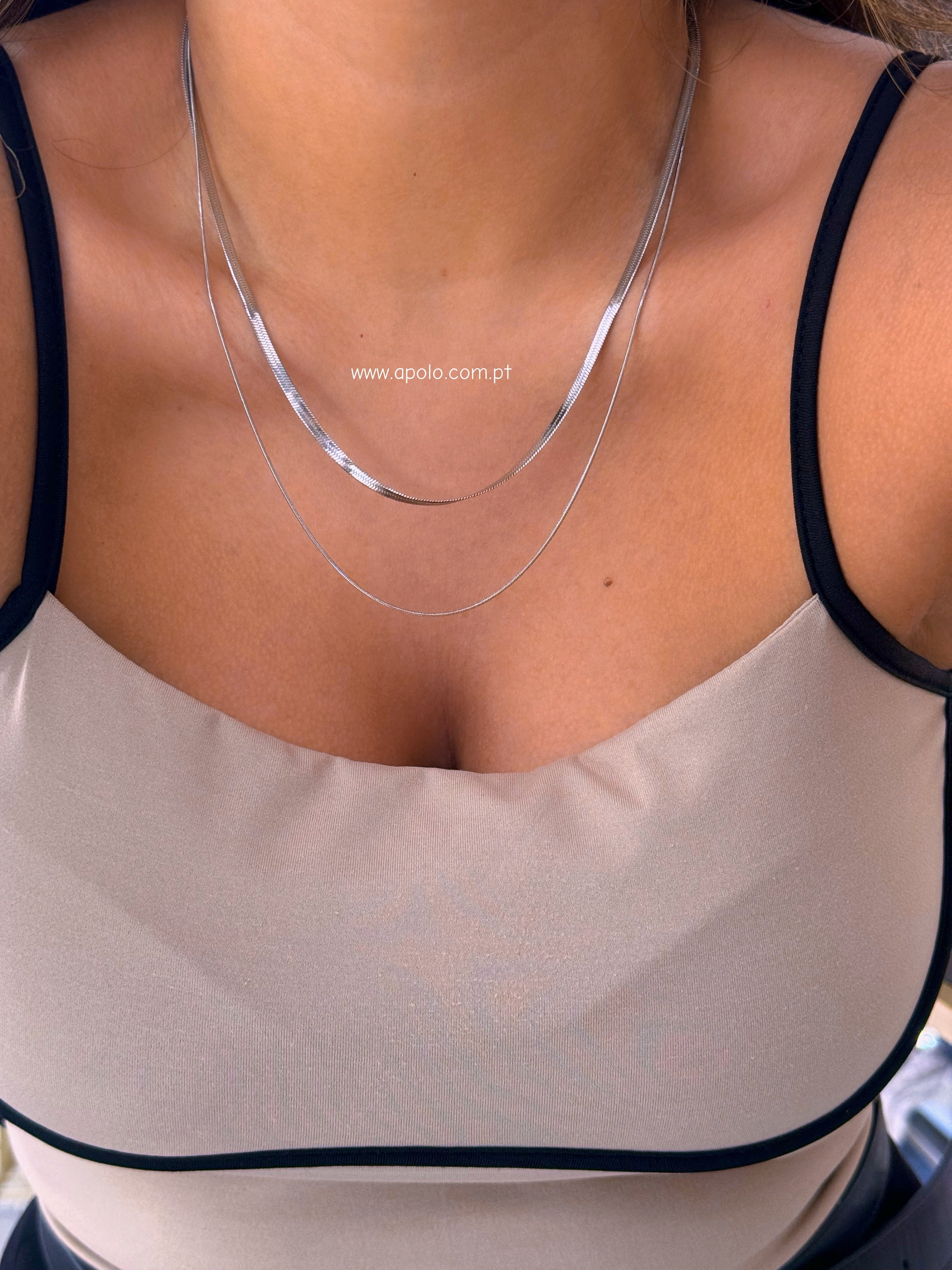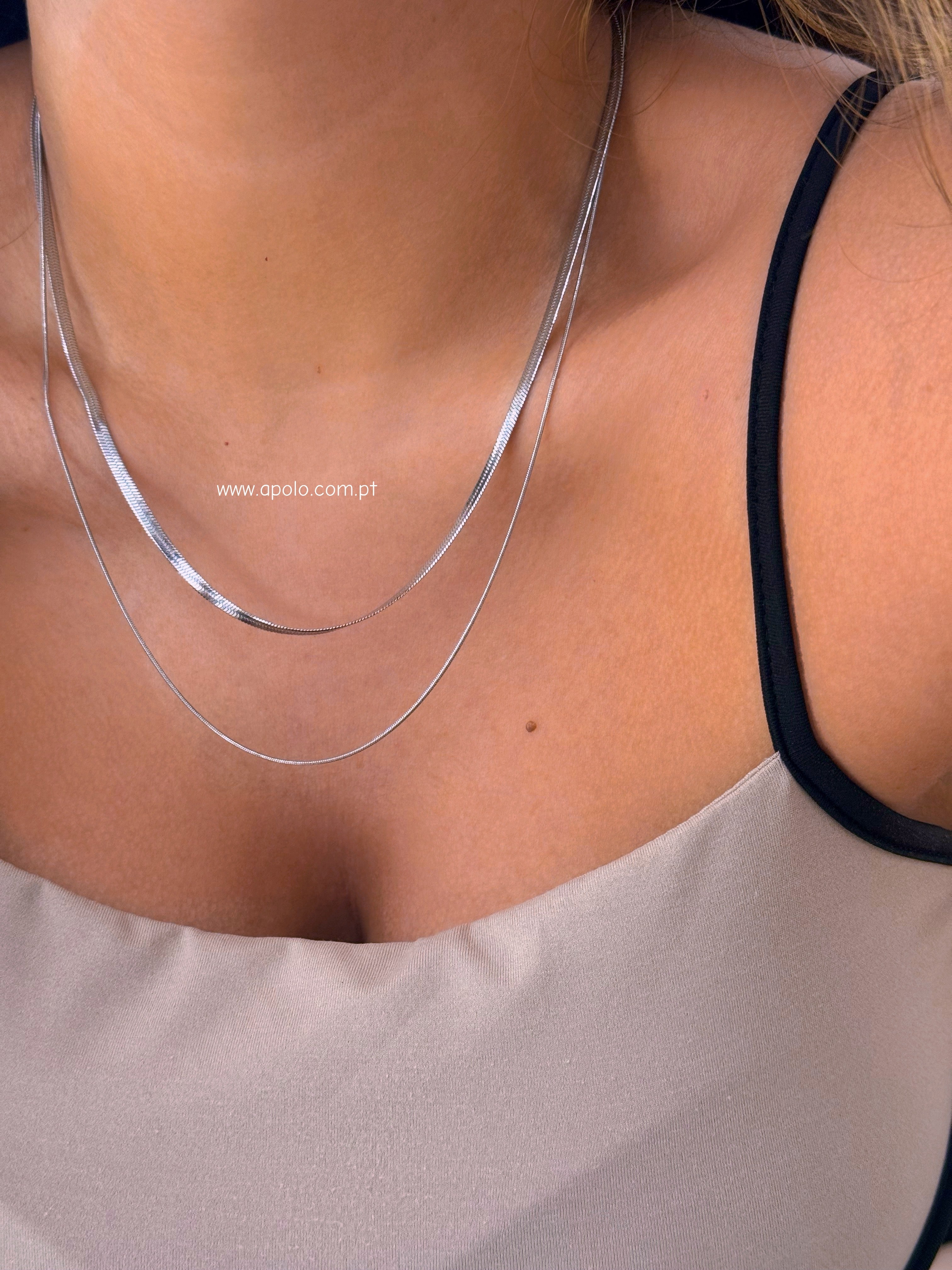 Colar efeito duplo com malha achatada e redonda fininha | Prateado