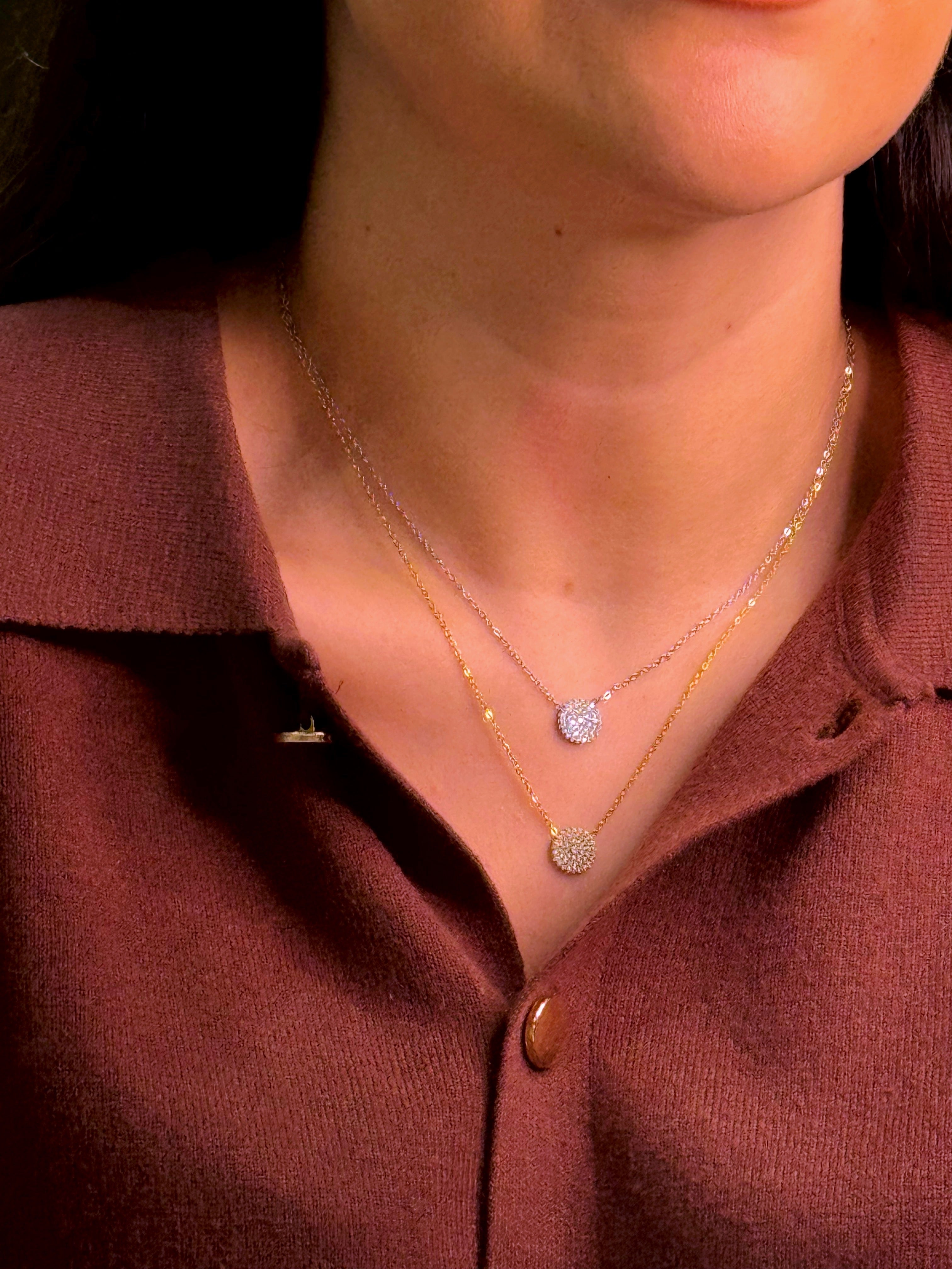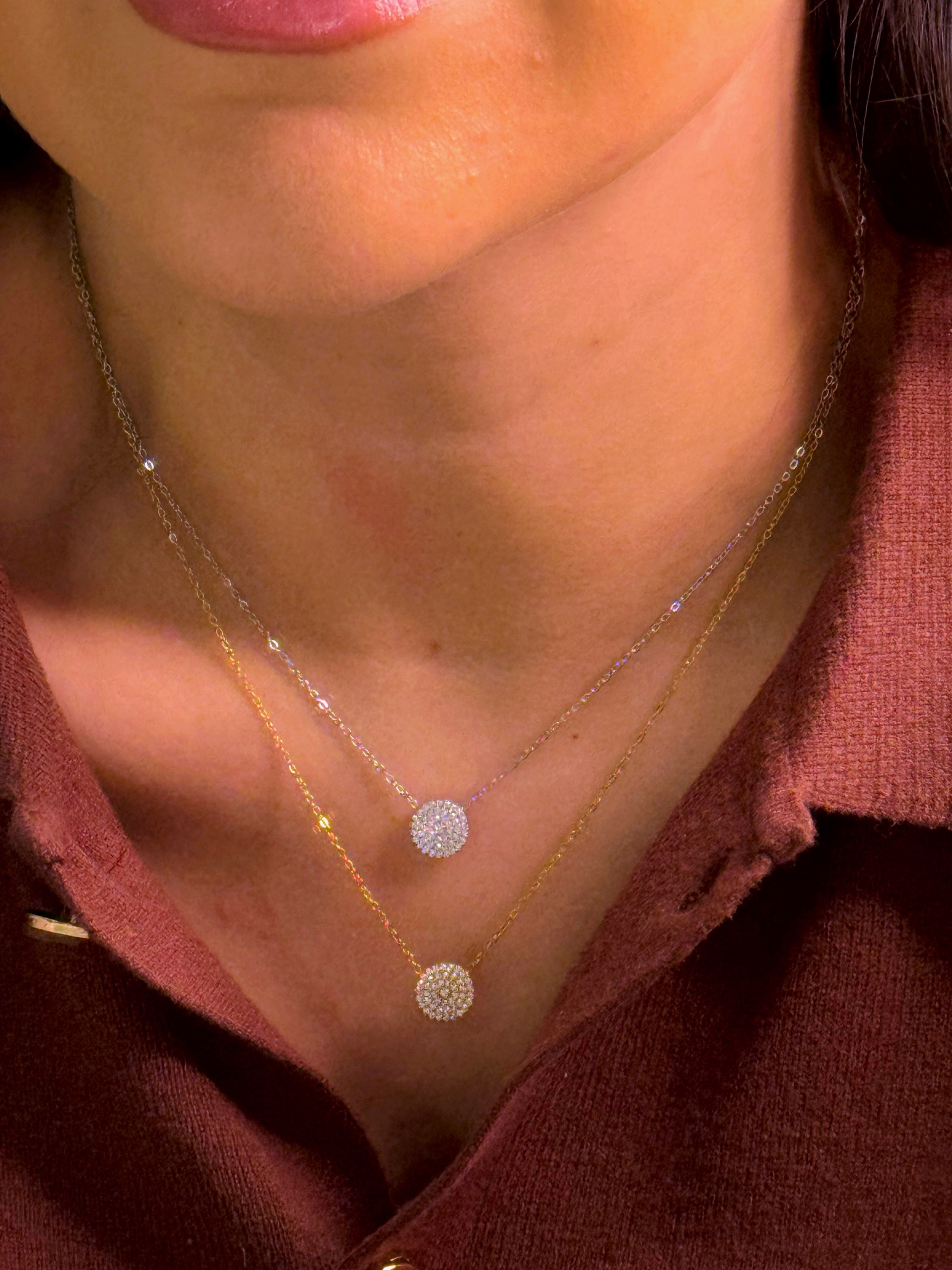 Colar com malha muito fininha e pormenor de círculo com brilhantes ao centro.