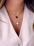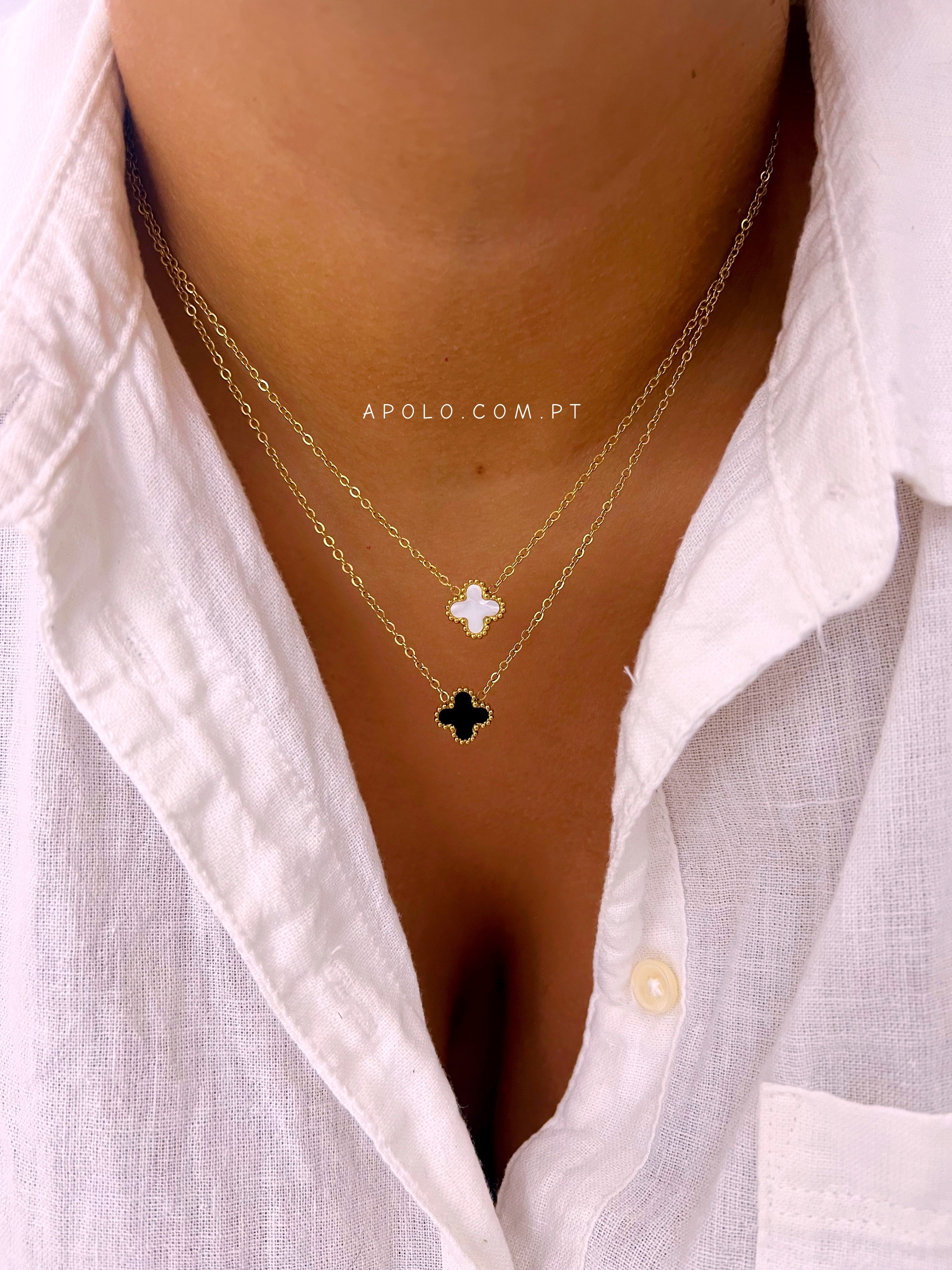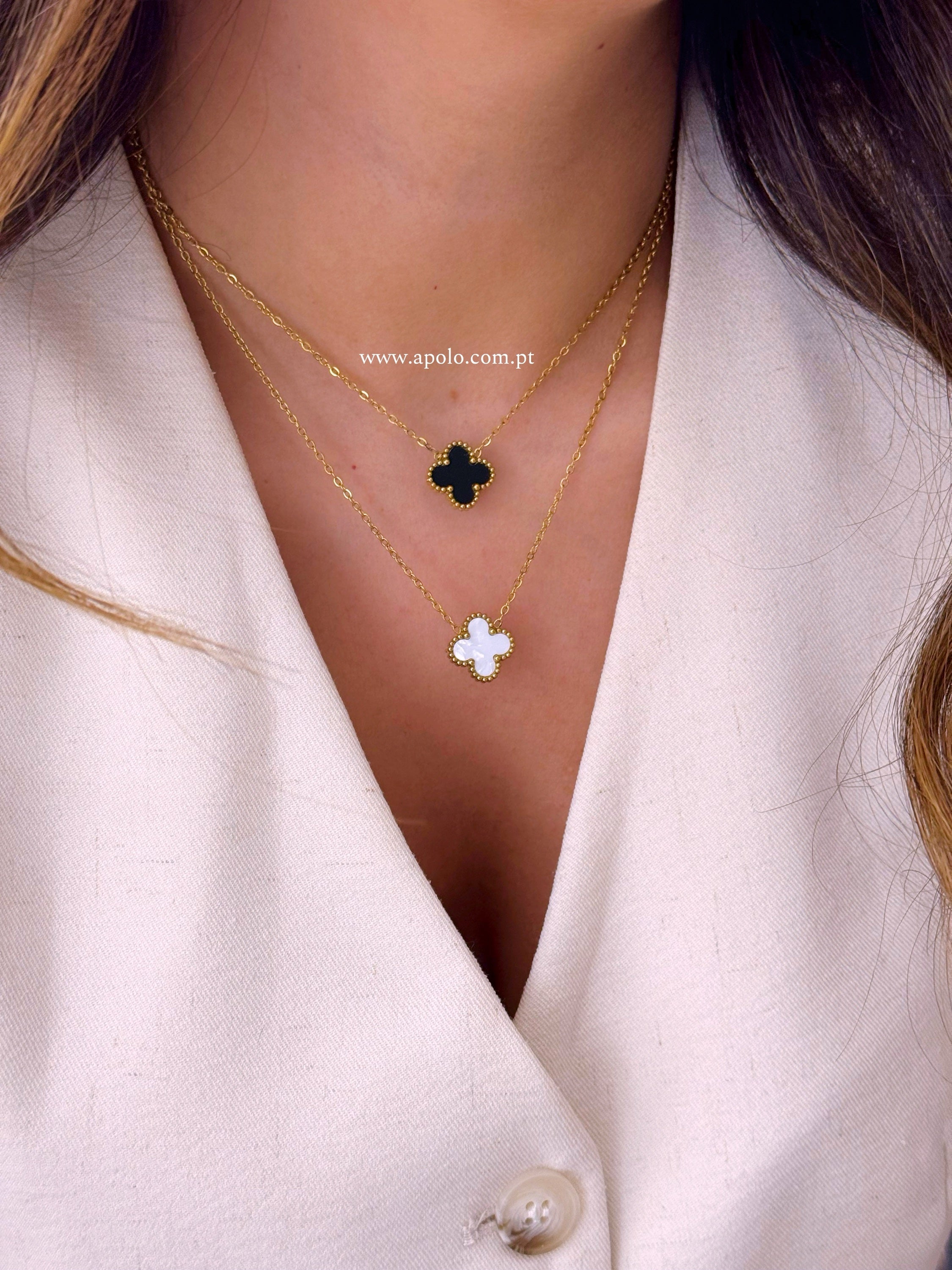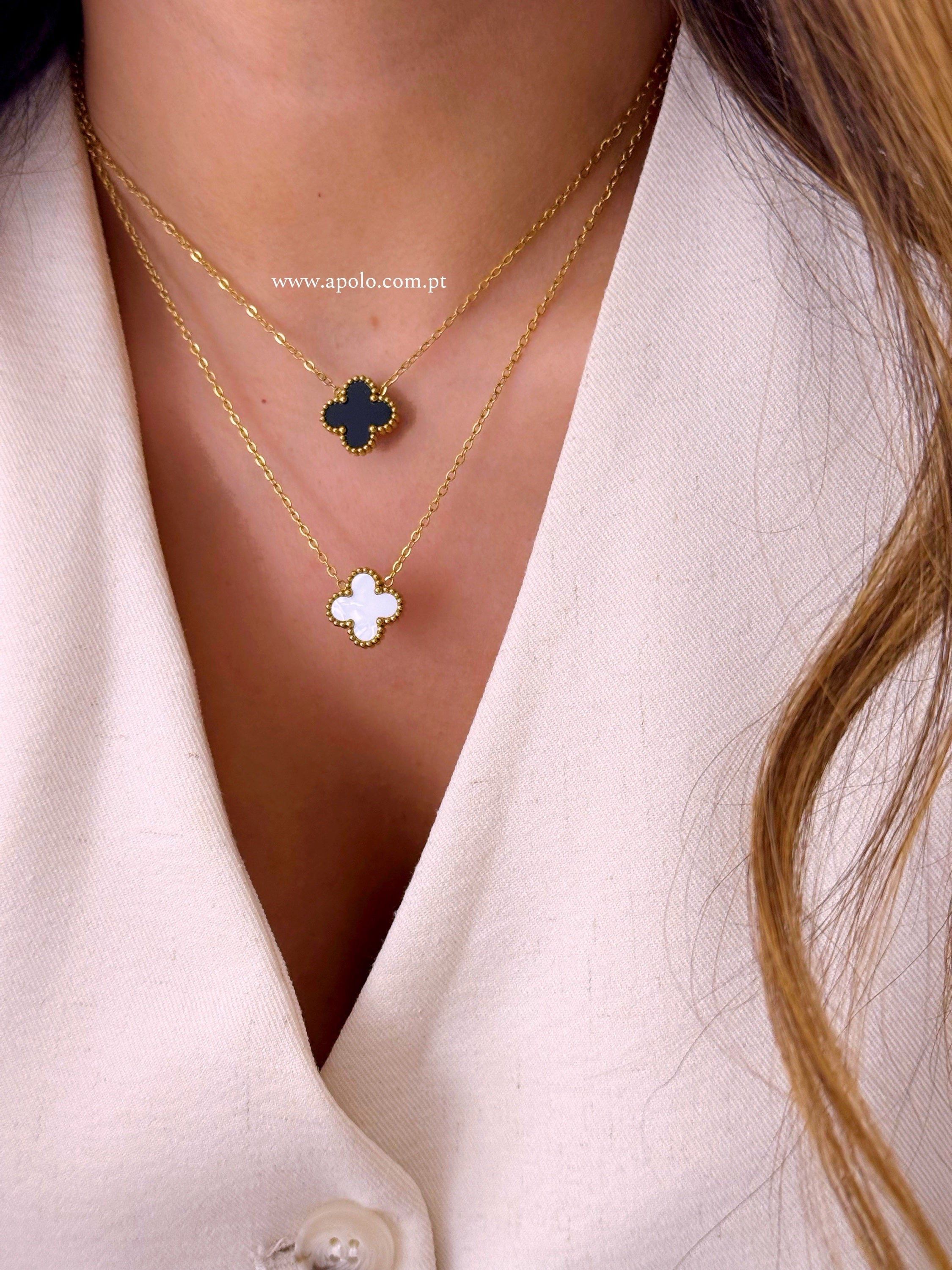 Colar em malha fininha com pendente em formato trevo - madre pérola ou fundo preto.