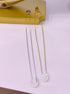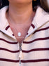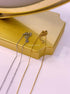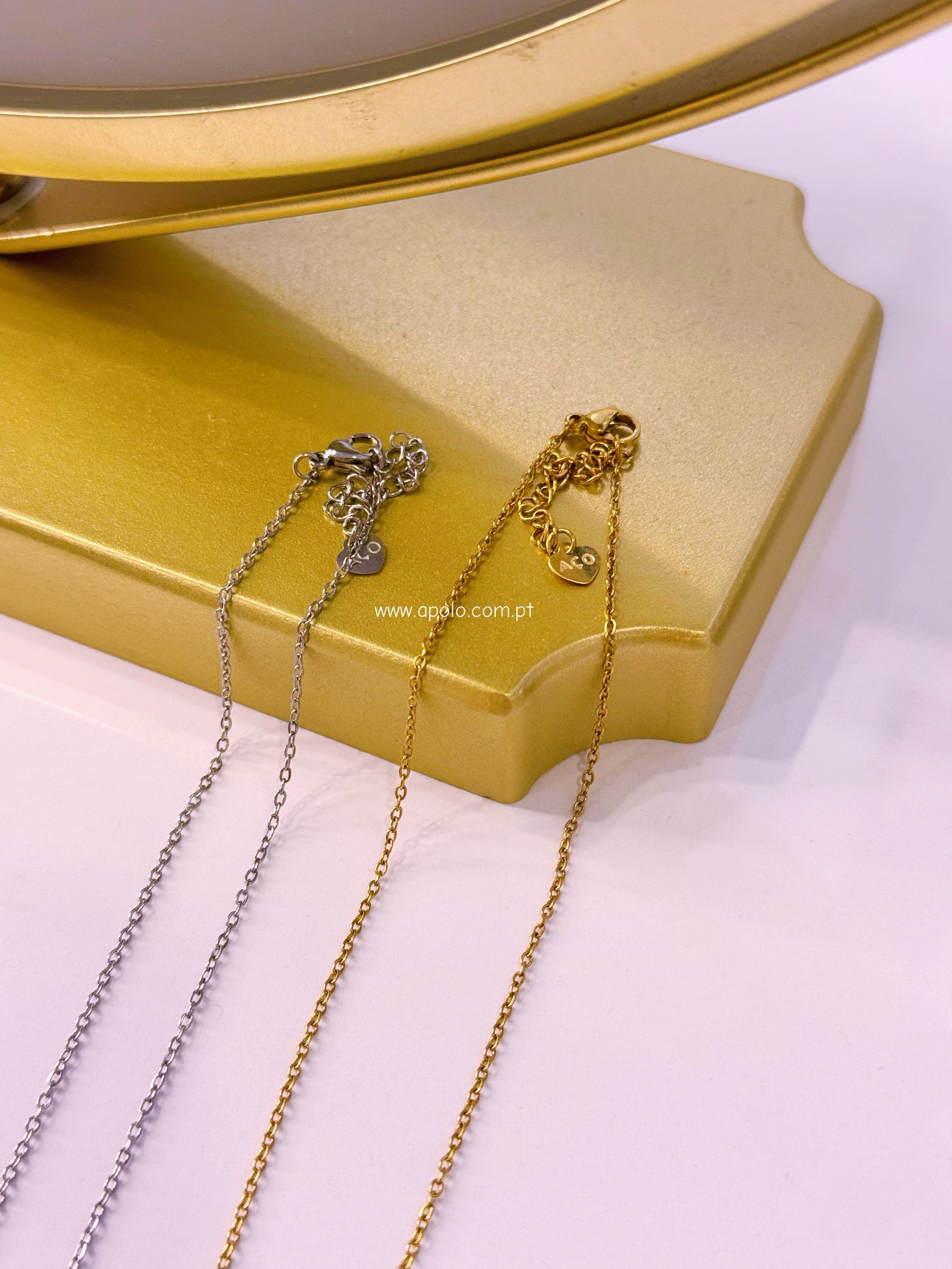 Colar ajustável, com extensão de 5,5 cm, comprimento mínimo de 41 cm e máximo de 46,5 cm.
