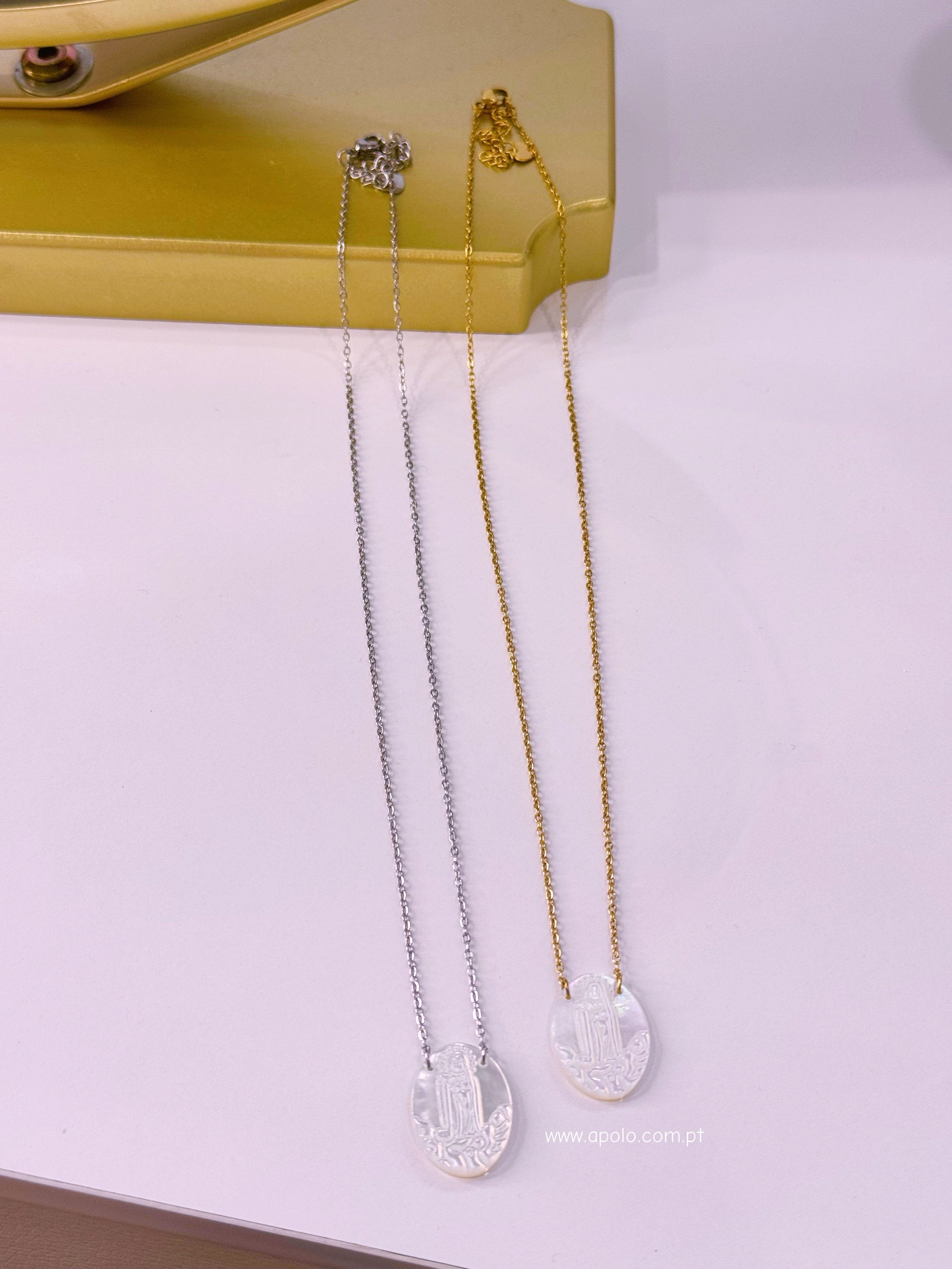 Colar malha fininha com medalha oval com relevo da imagem de Nª Senhora.