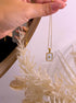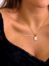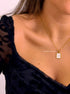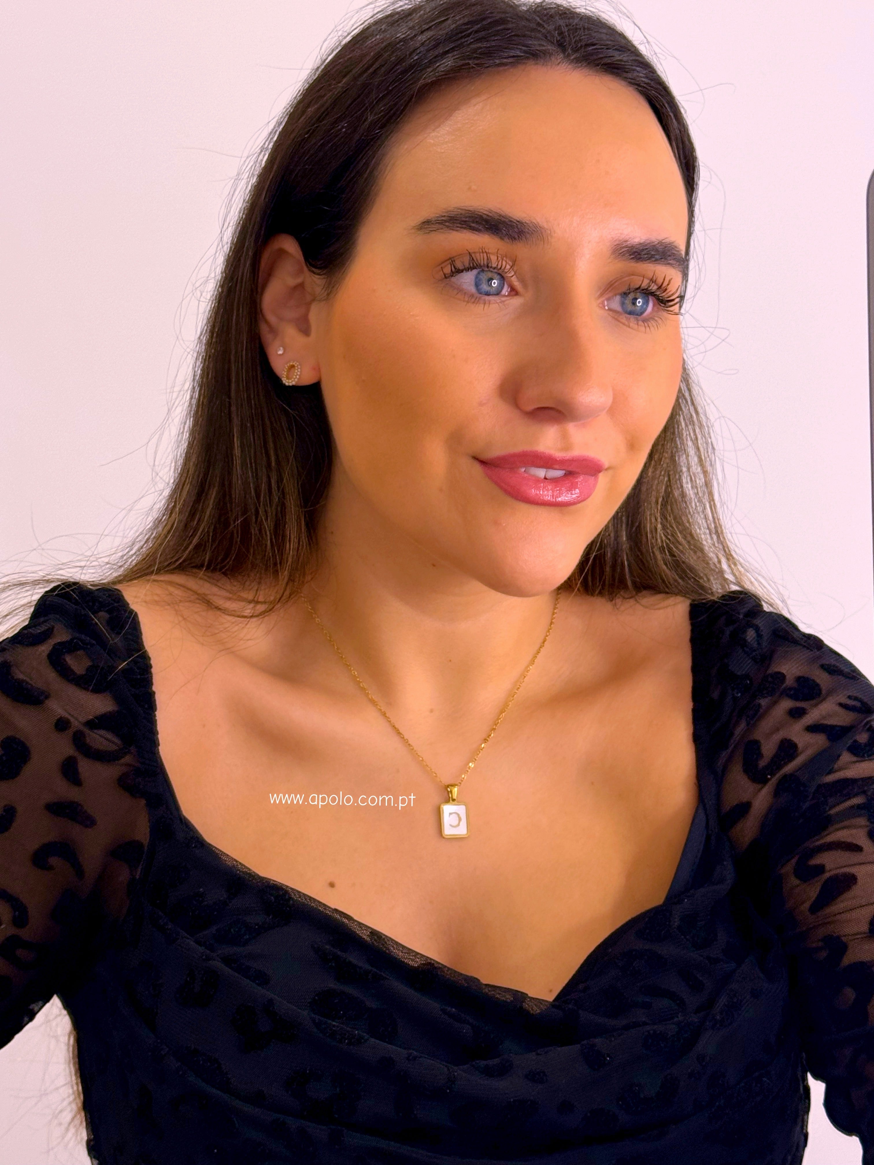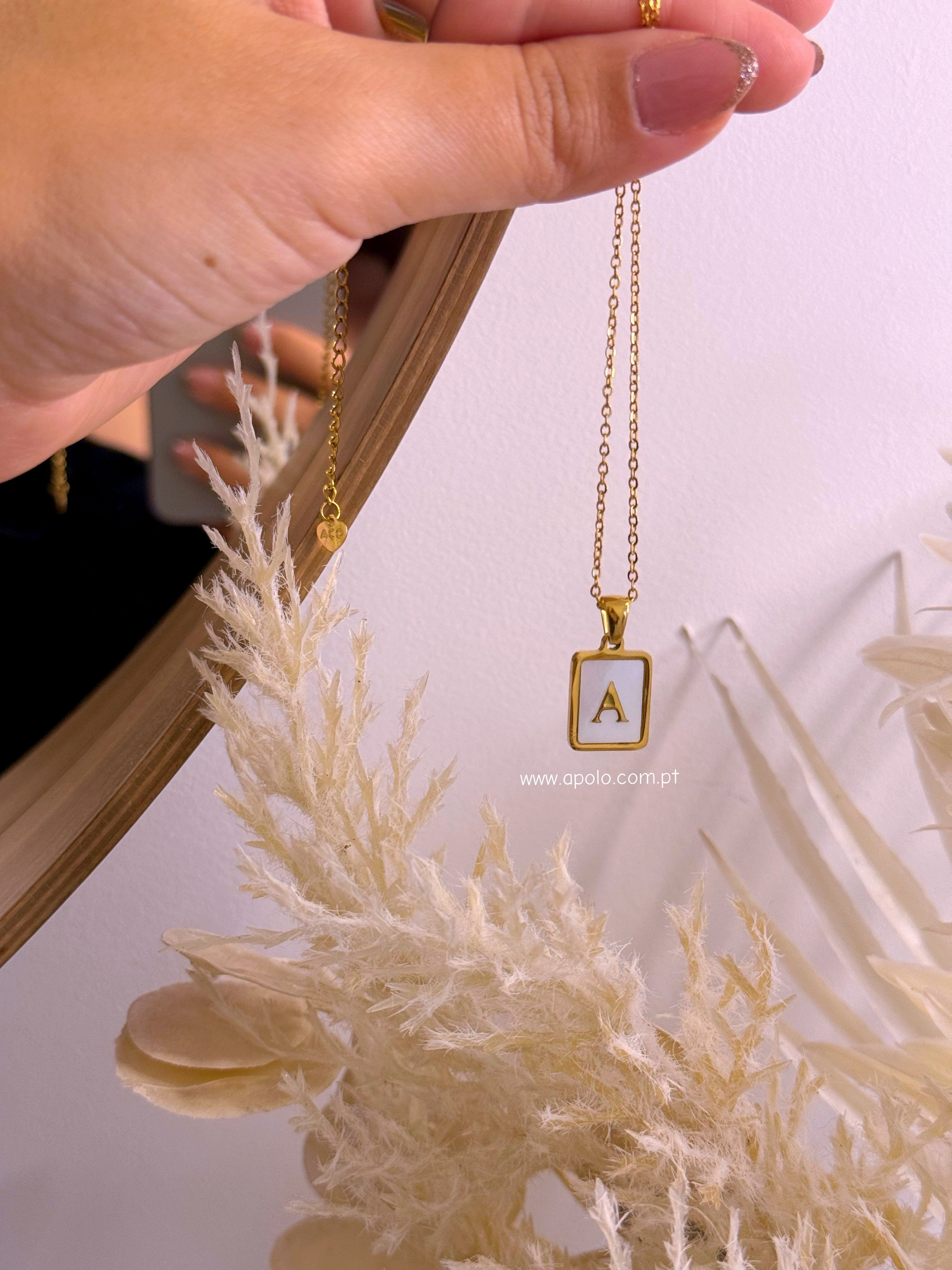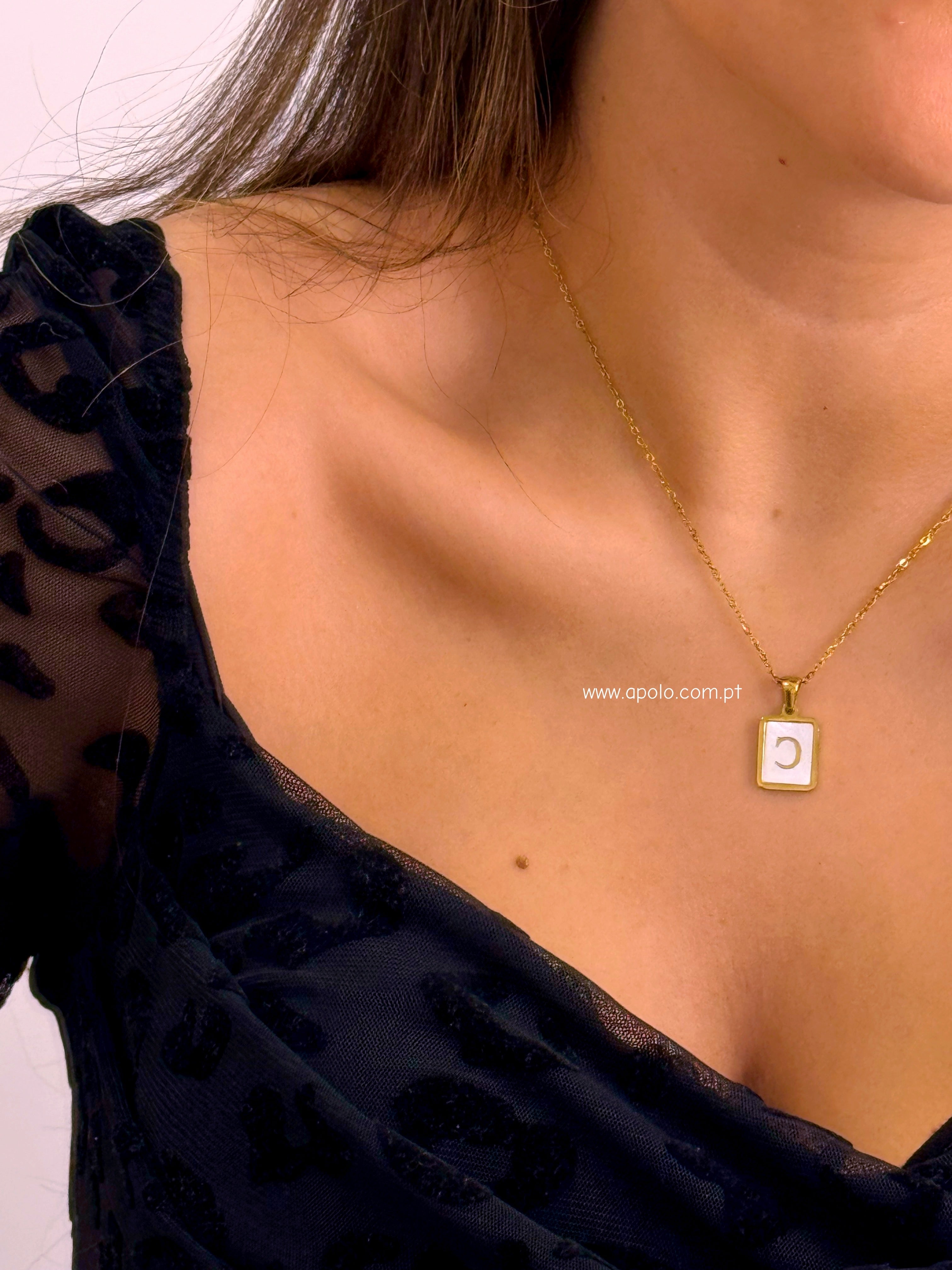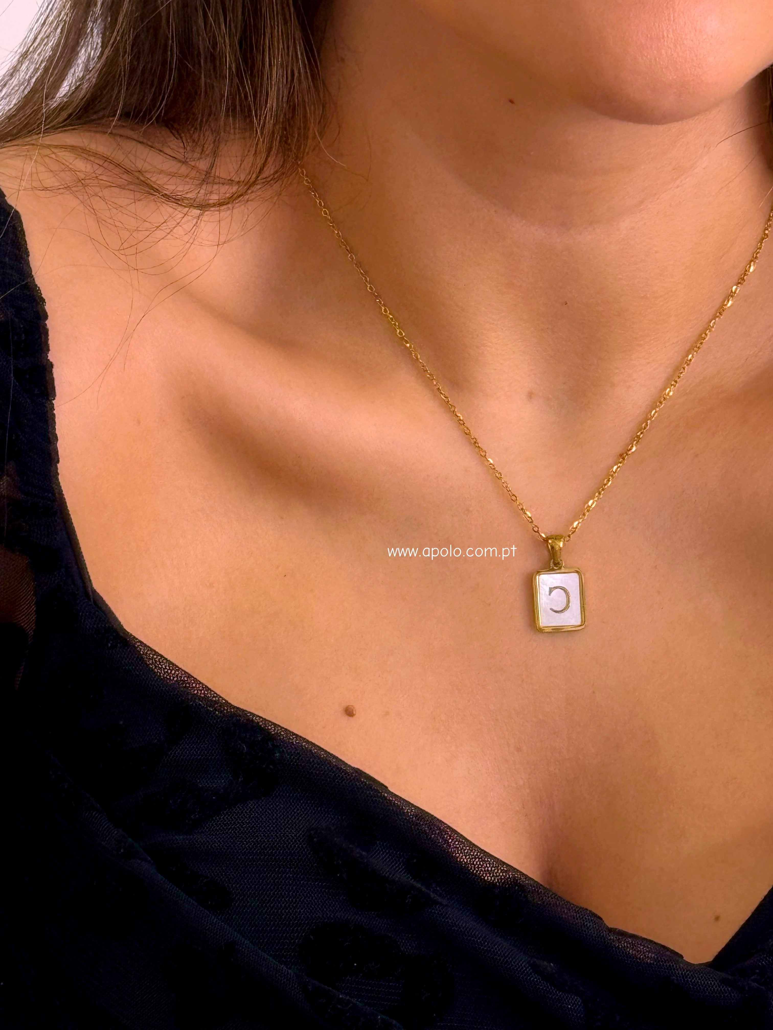 Colar malha fininha com pendente quadrado preenchido em madre pérola e inicial.