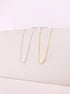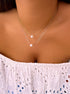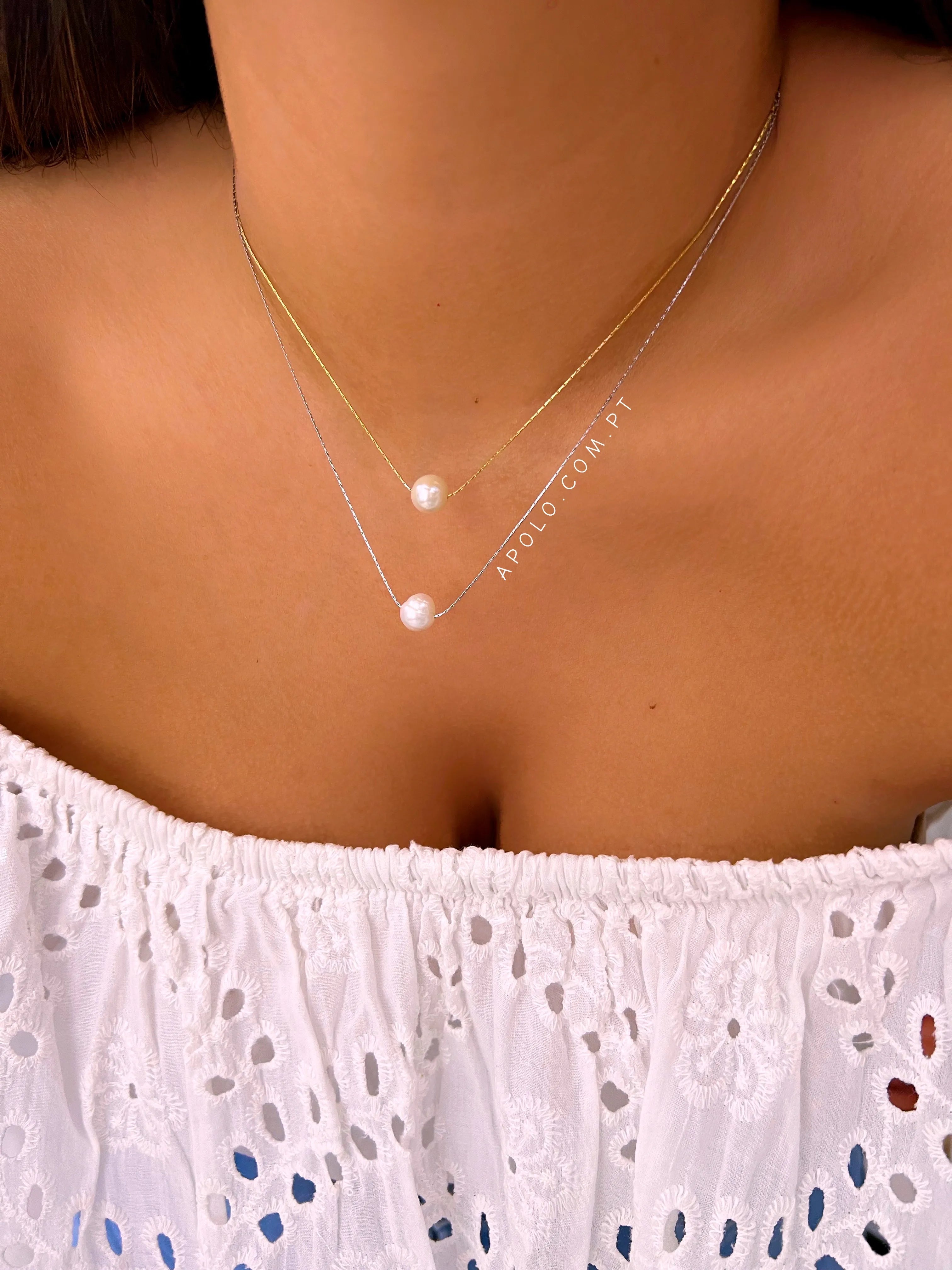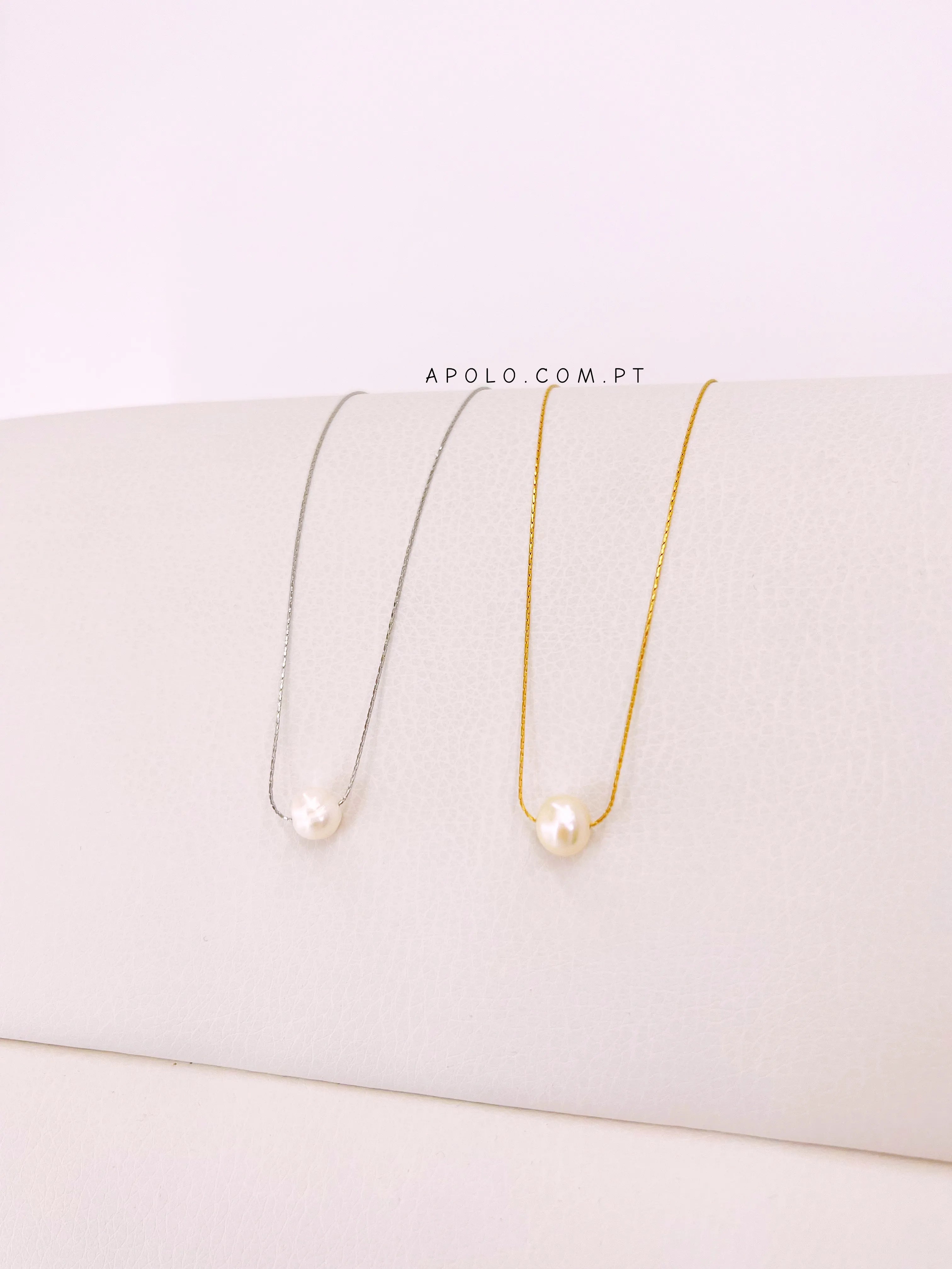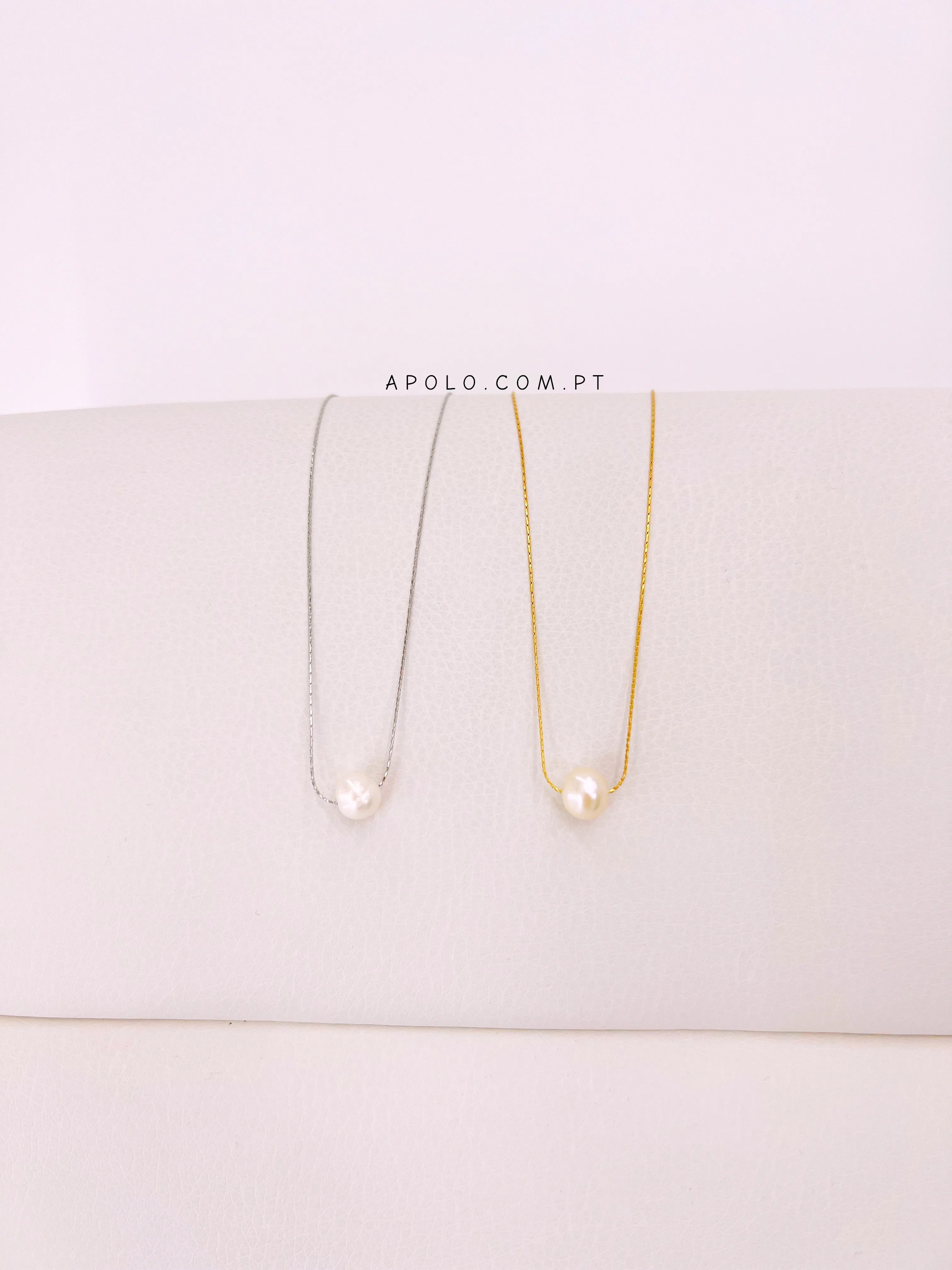 Colar ajustável, com extensão de 5 cm, comprimento mínimo de 42 cm e máximo de 47 cm.