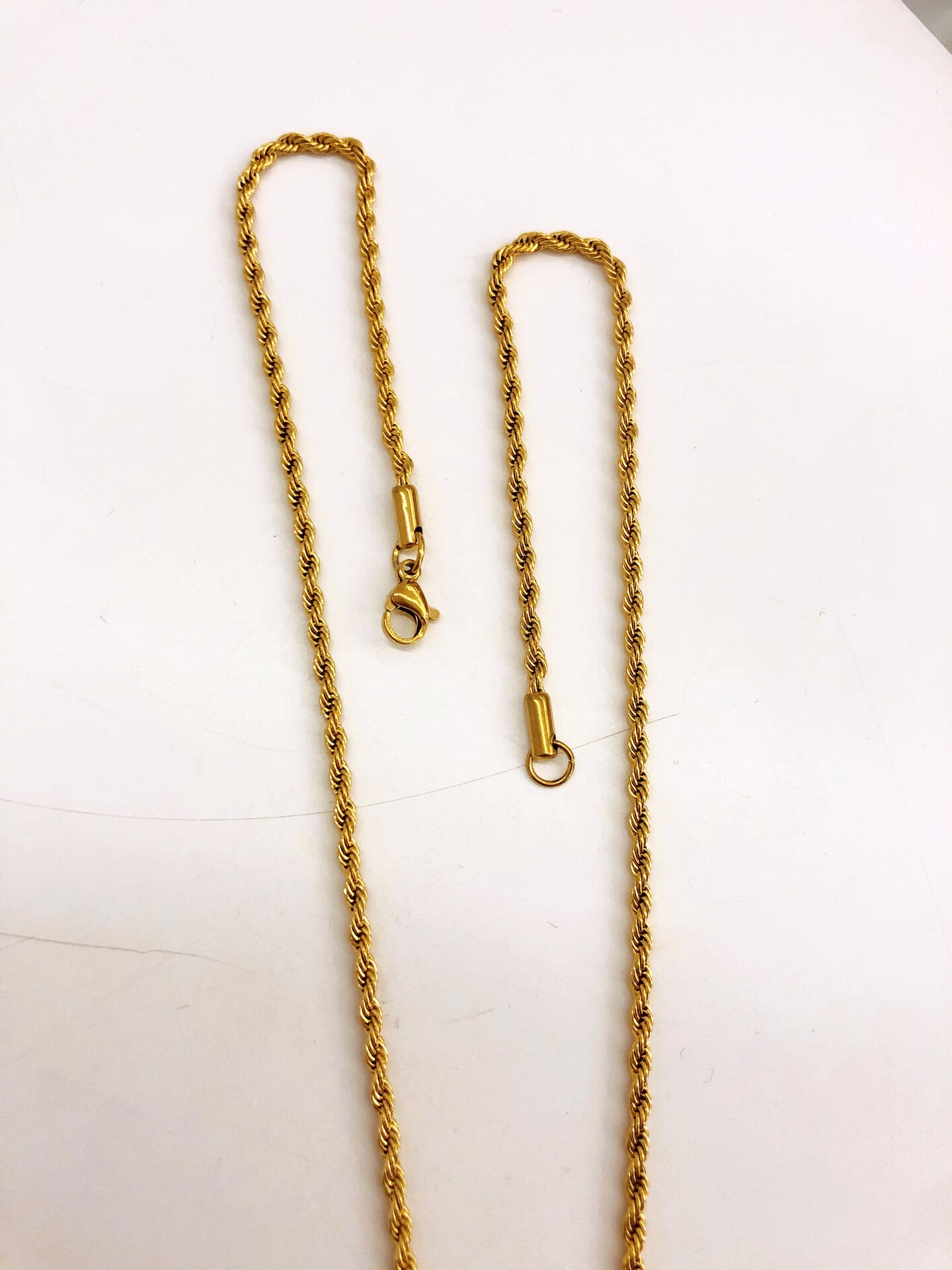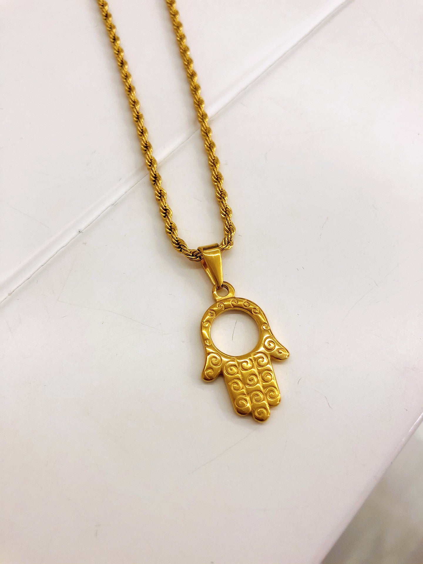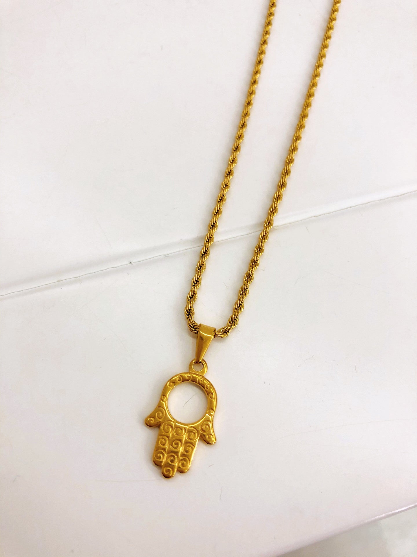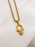 Colar dourado com malha torcida fina e pendente de mão de hamsá/mão de Fátima.