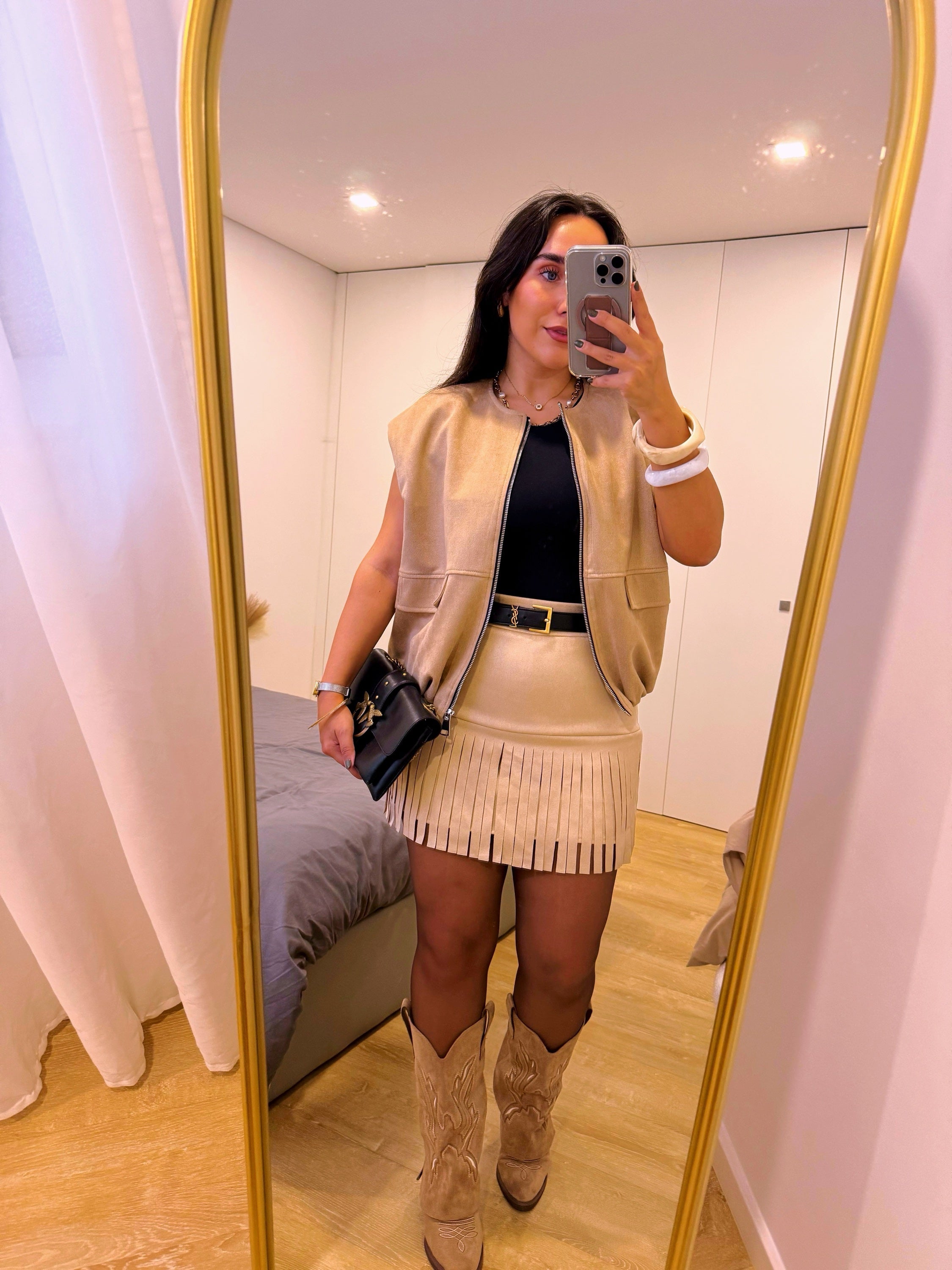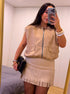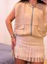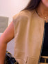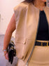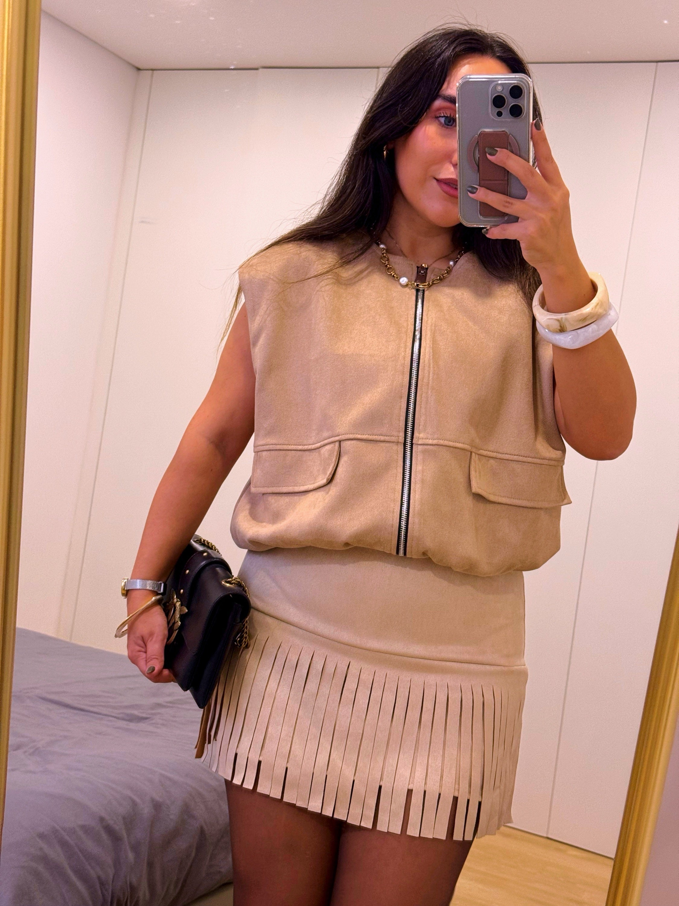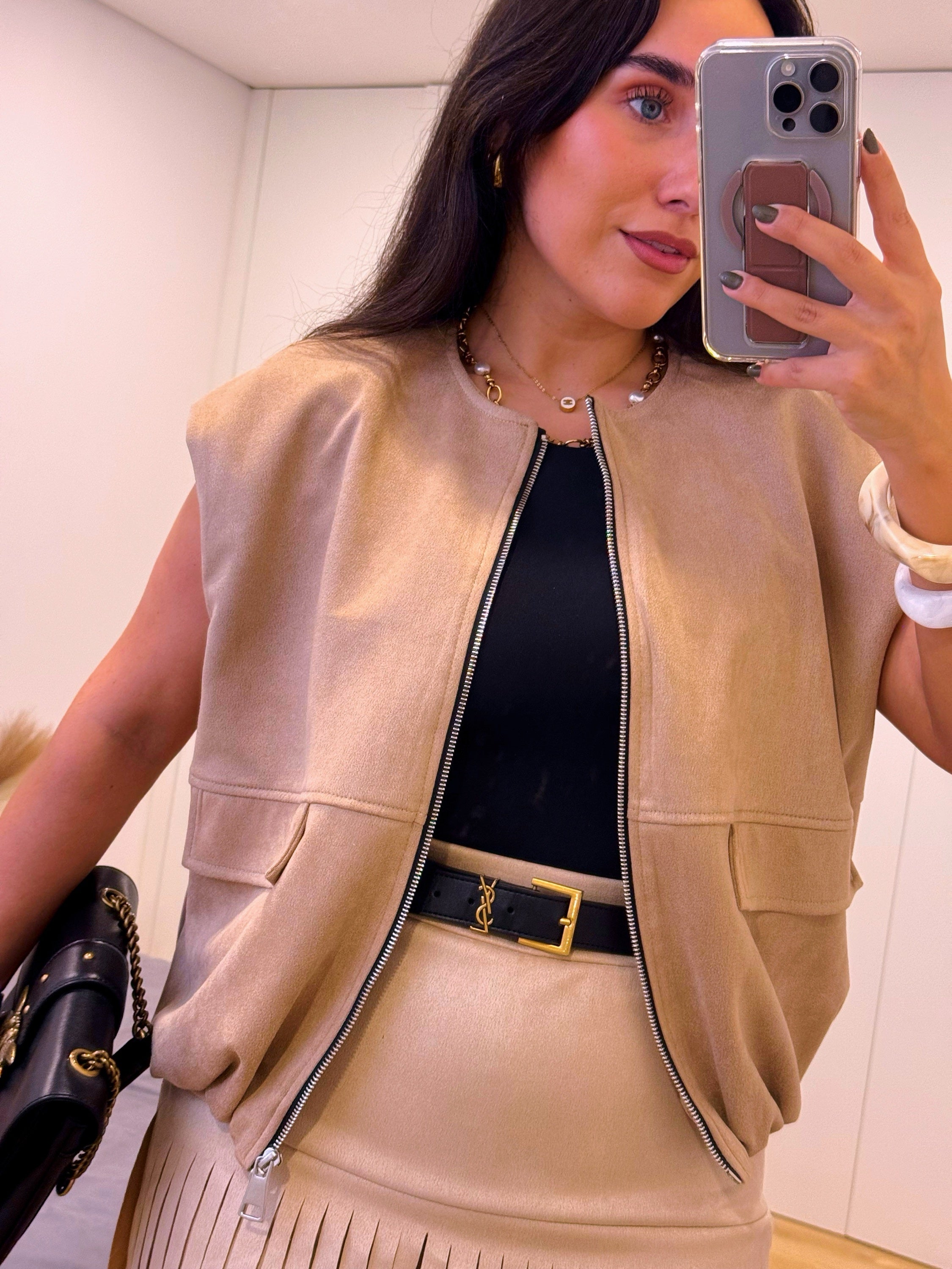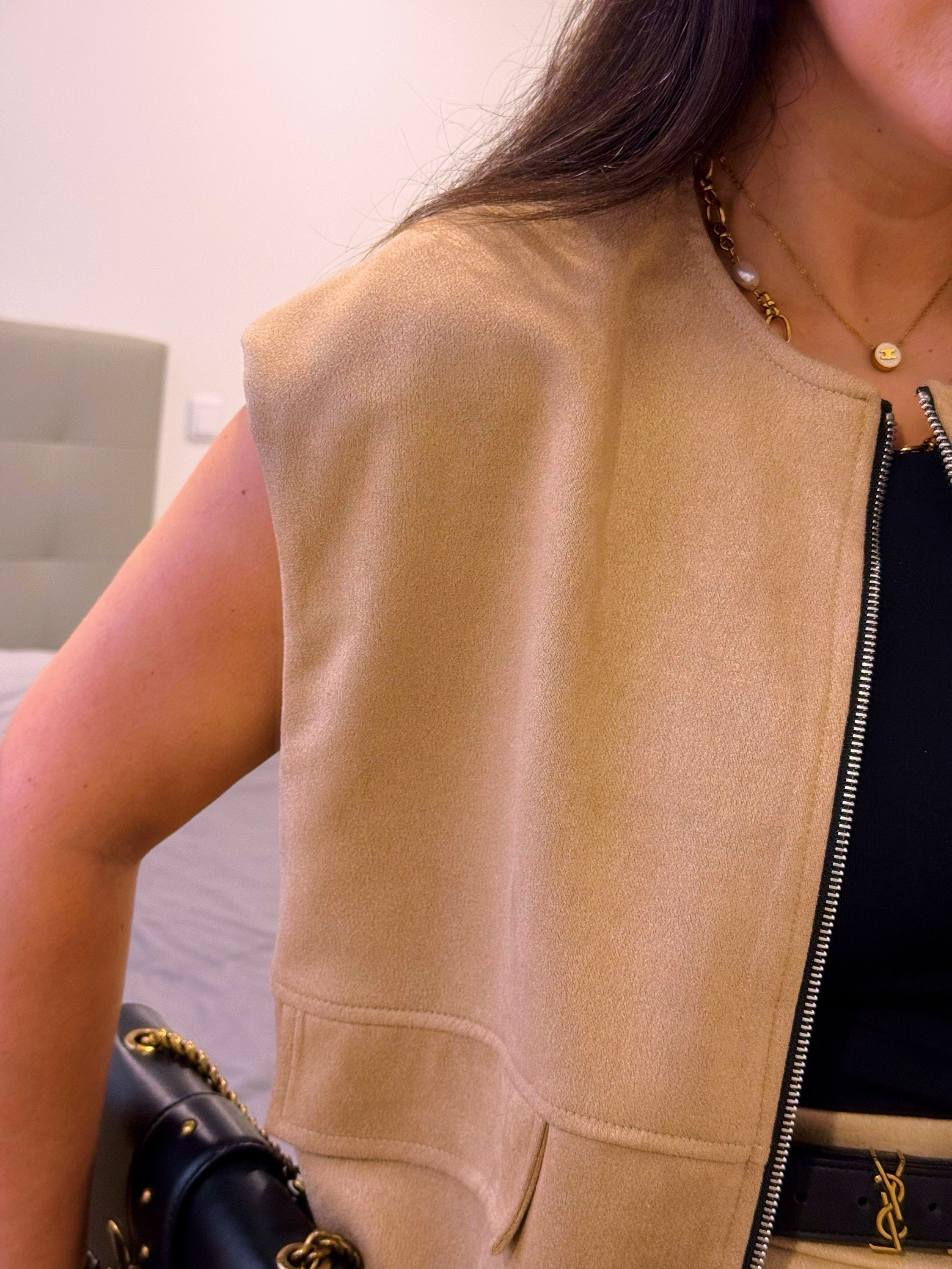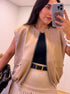 Colete tendência de ótima relação qualidade/preço com efeito de camurça na cor bege.