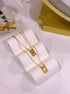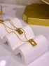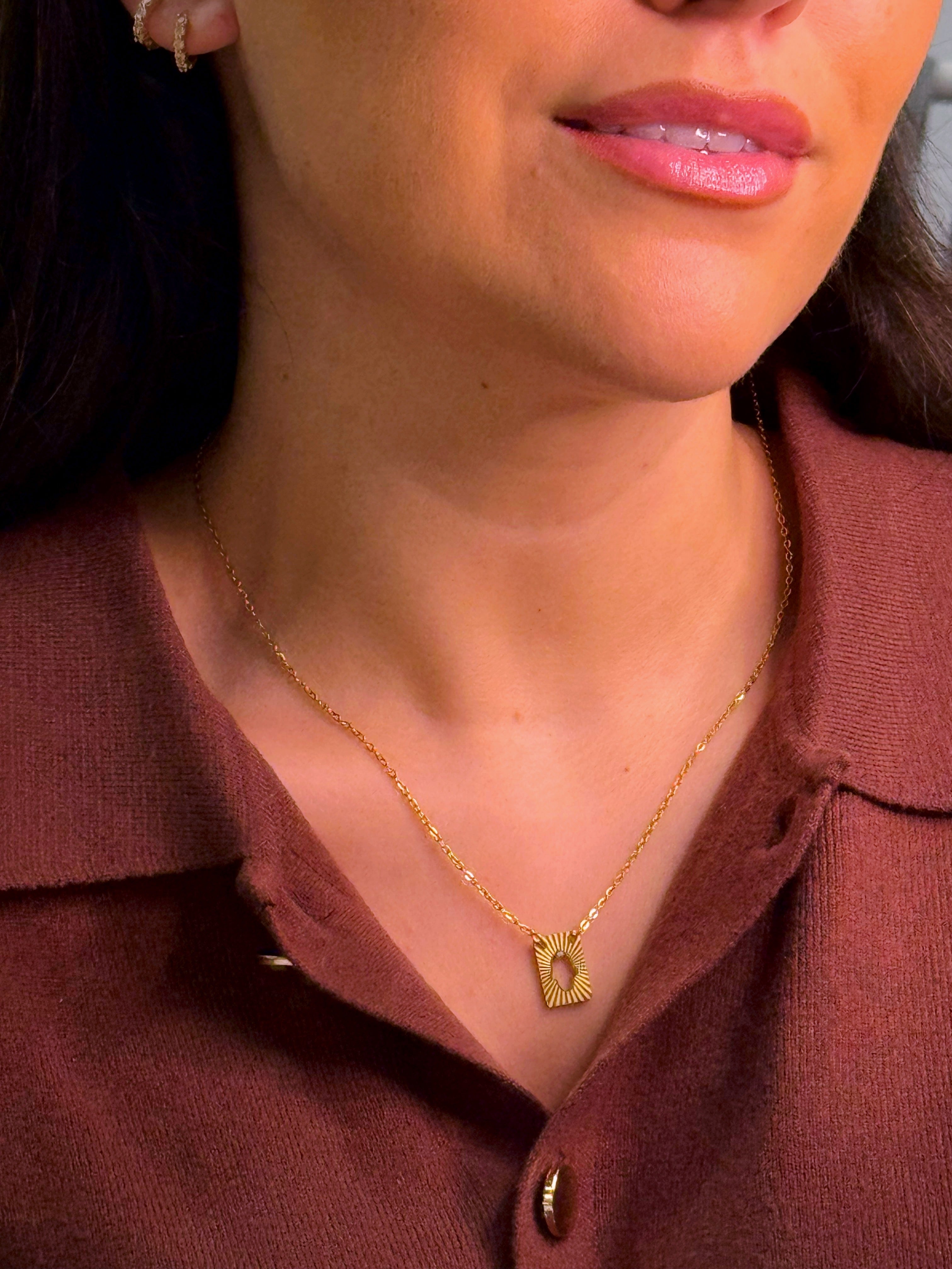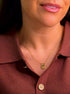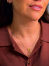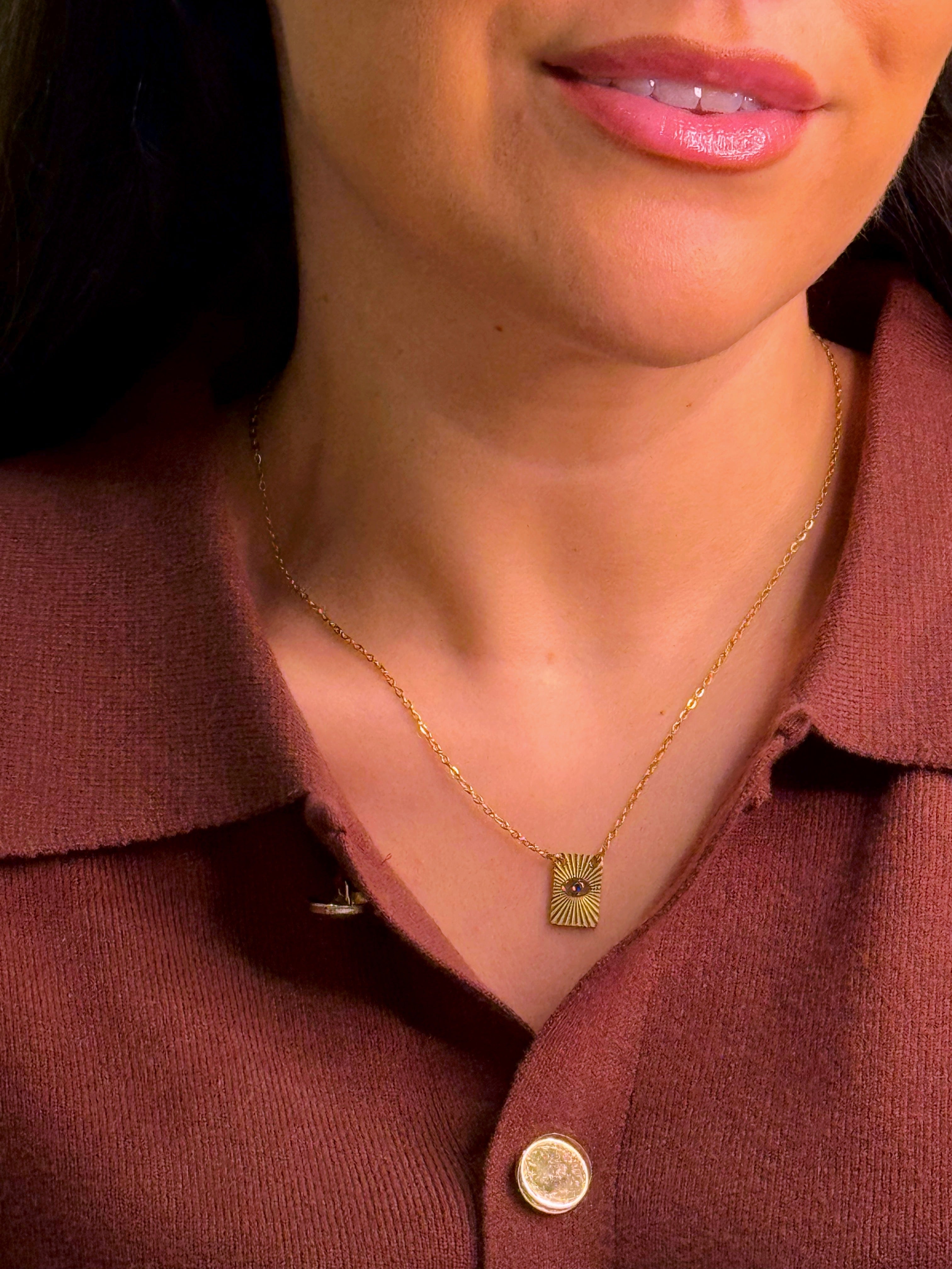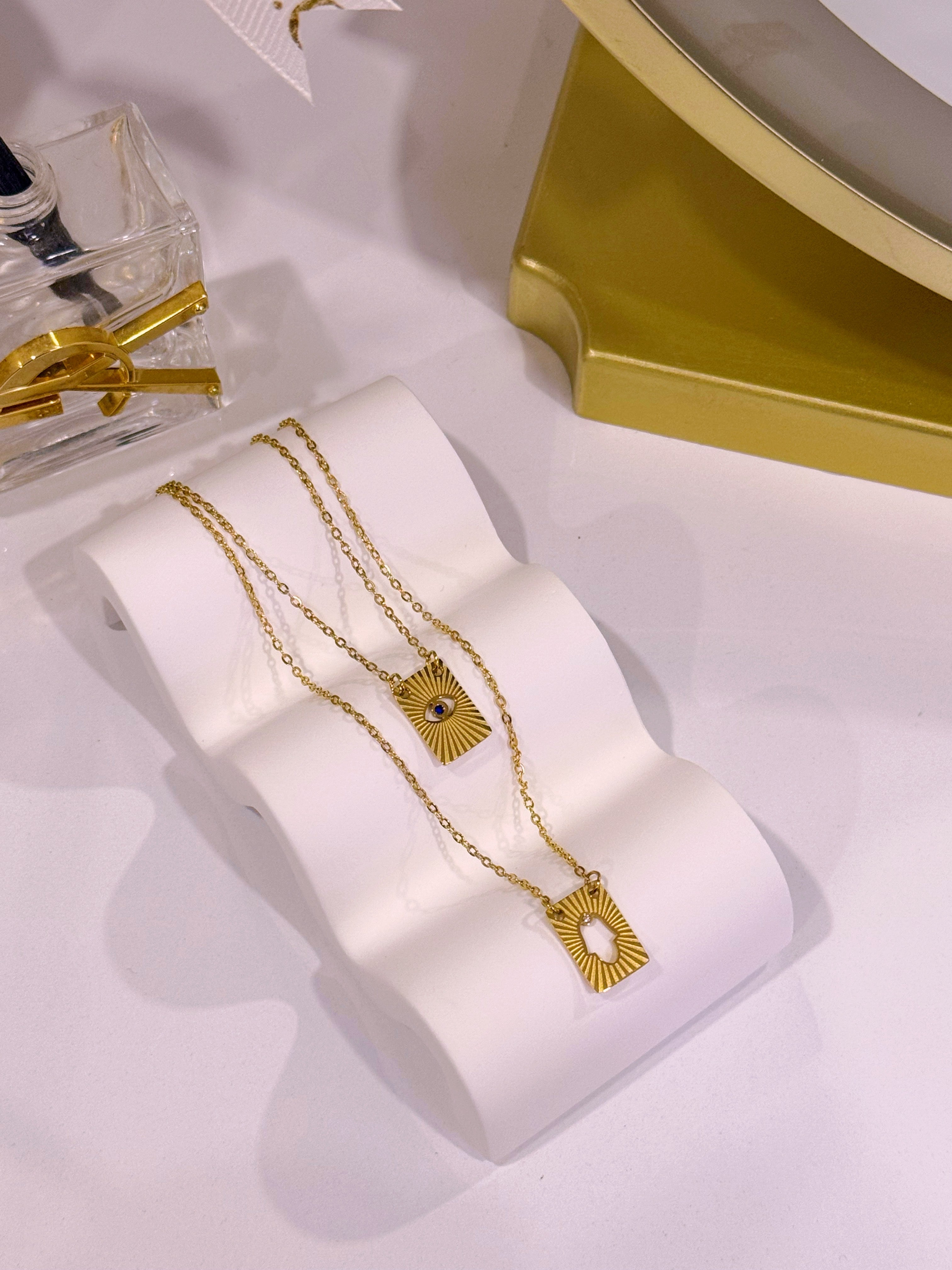 Escapulário de malha fina com, pendentes do olho grego e da mão de Fátima. Nos escapulários um pendente fica para a frente e outro para trás.