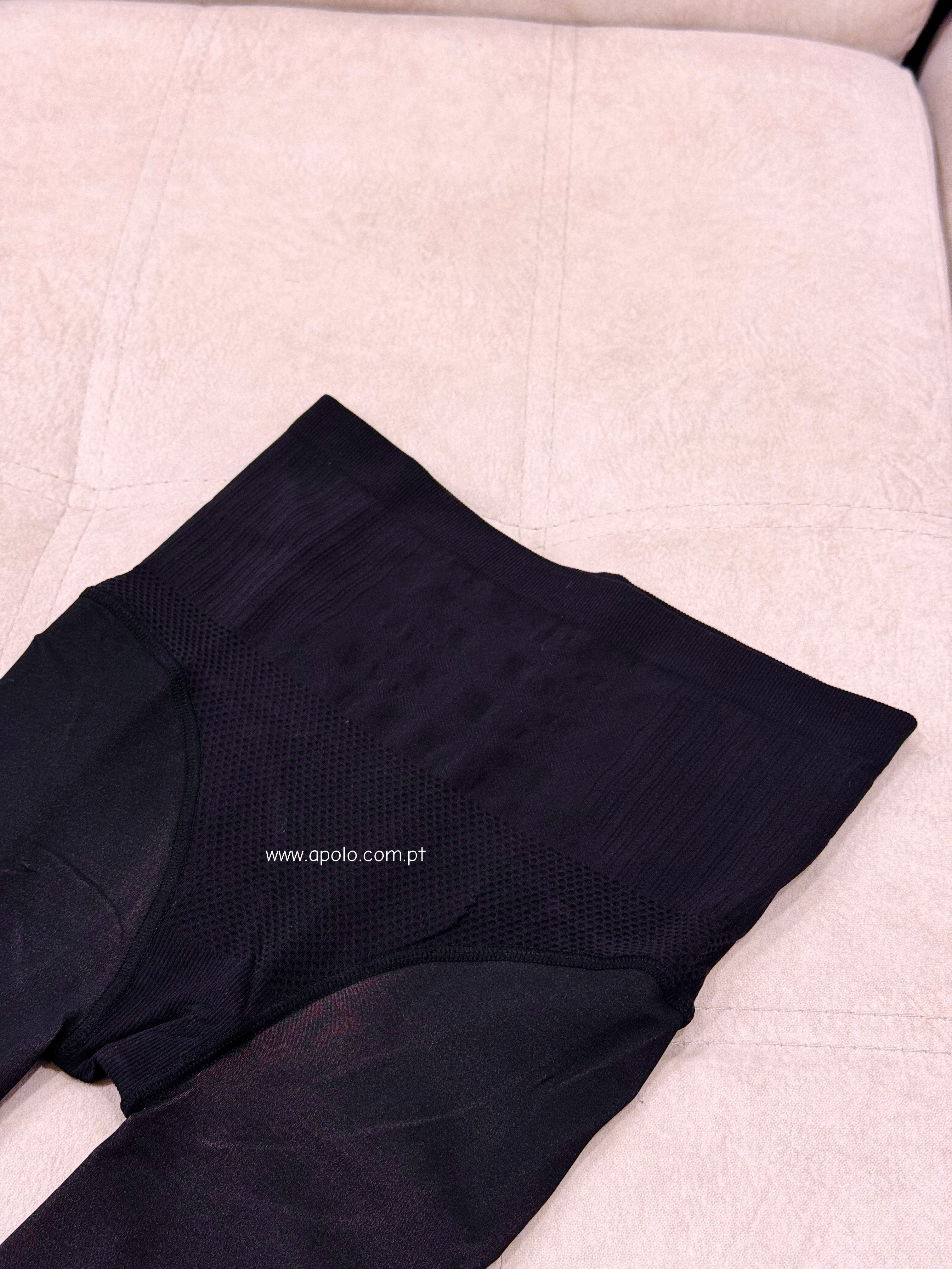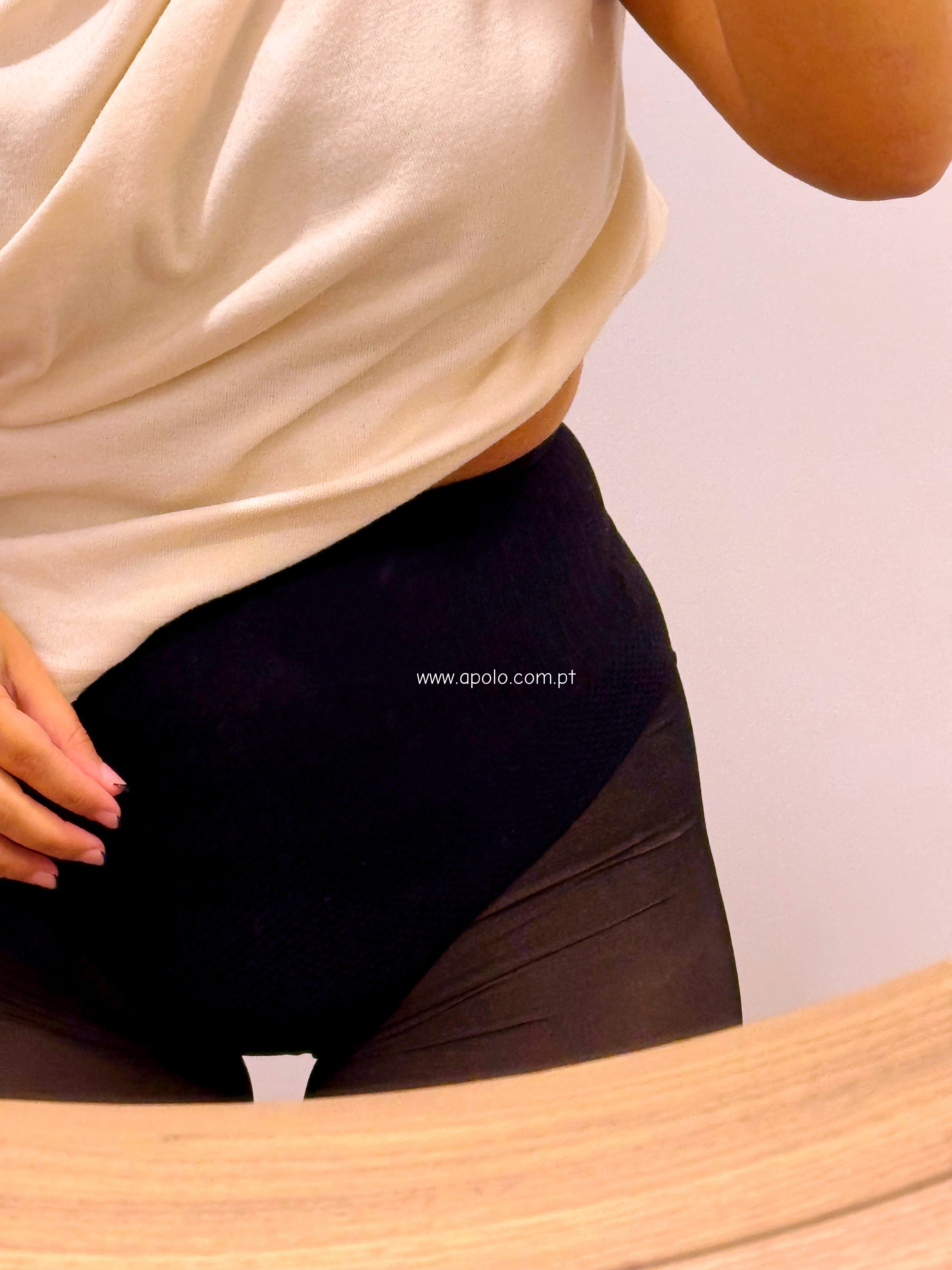 Com bastante elasticidade, com efeito redutor no abdômen, realça o glúteo e afina a cintura.