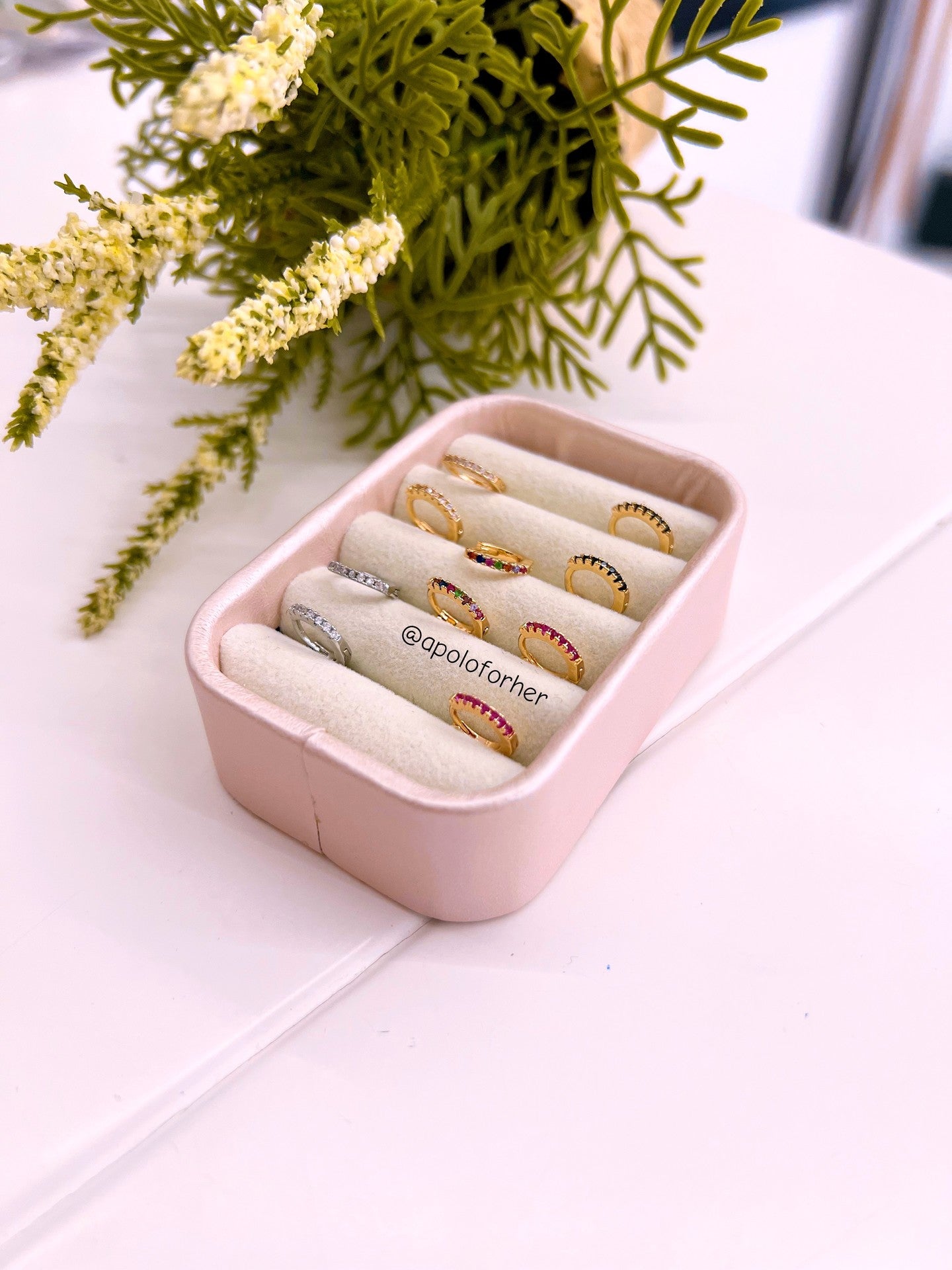 Mini argolinhas preenchidas com uma fila de brilhantes (zircónias), ideais também para 2º e 3º furos.