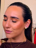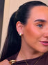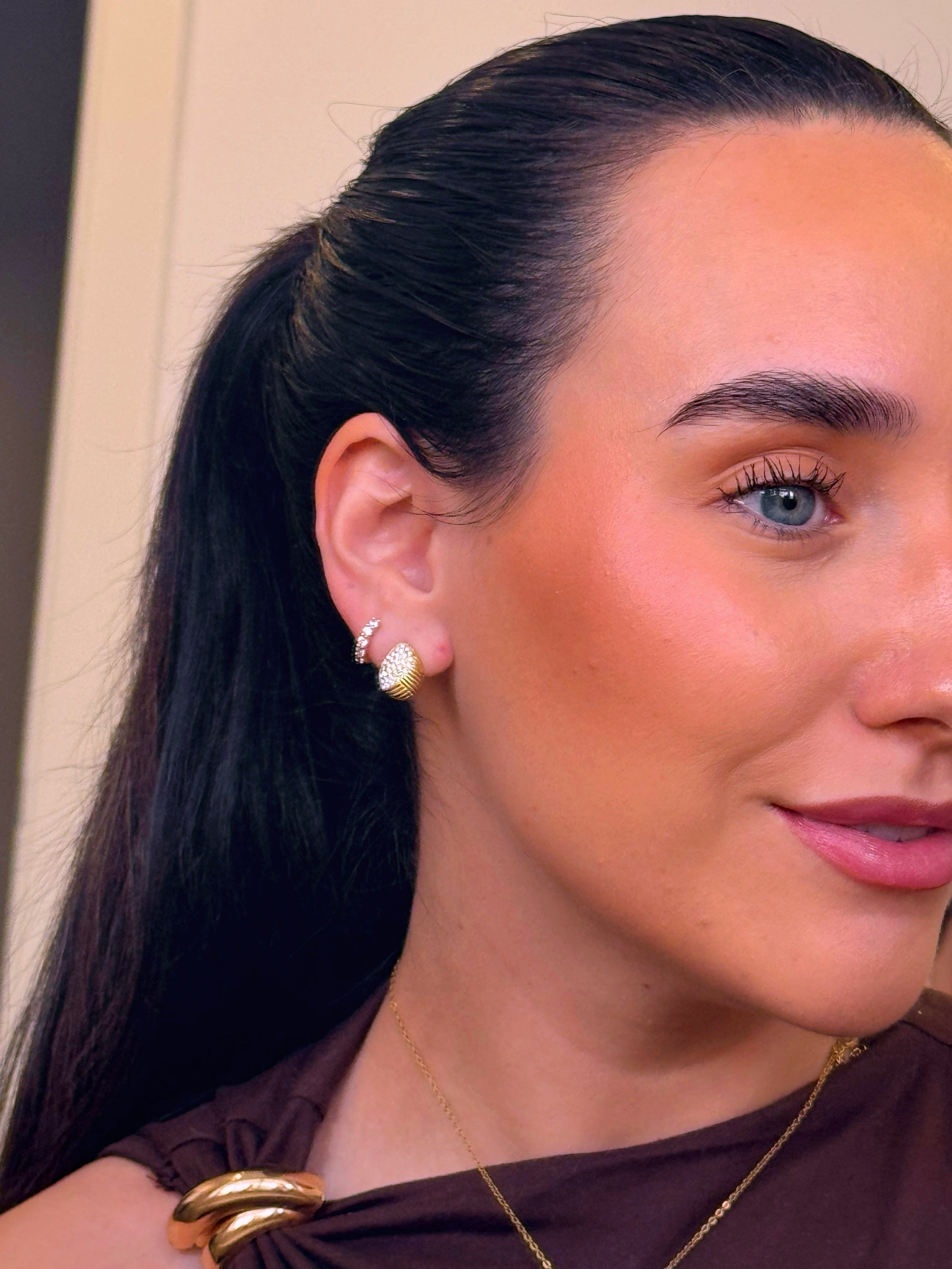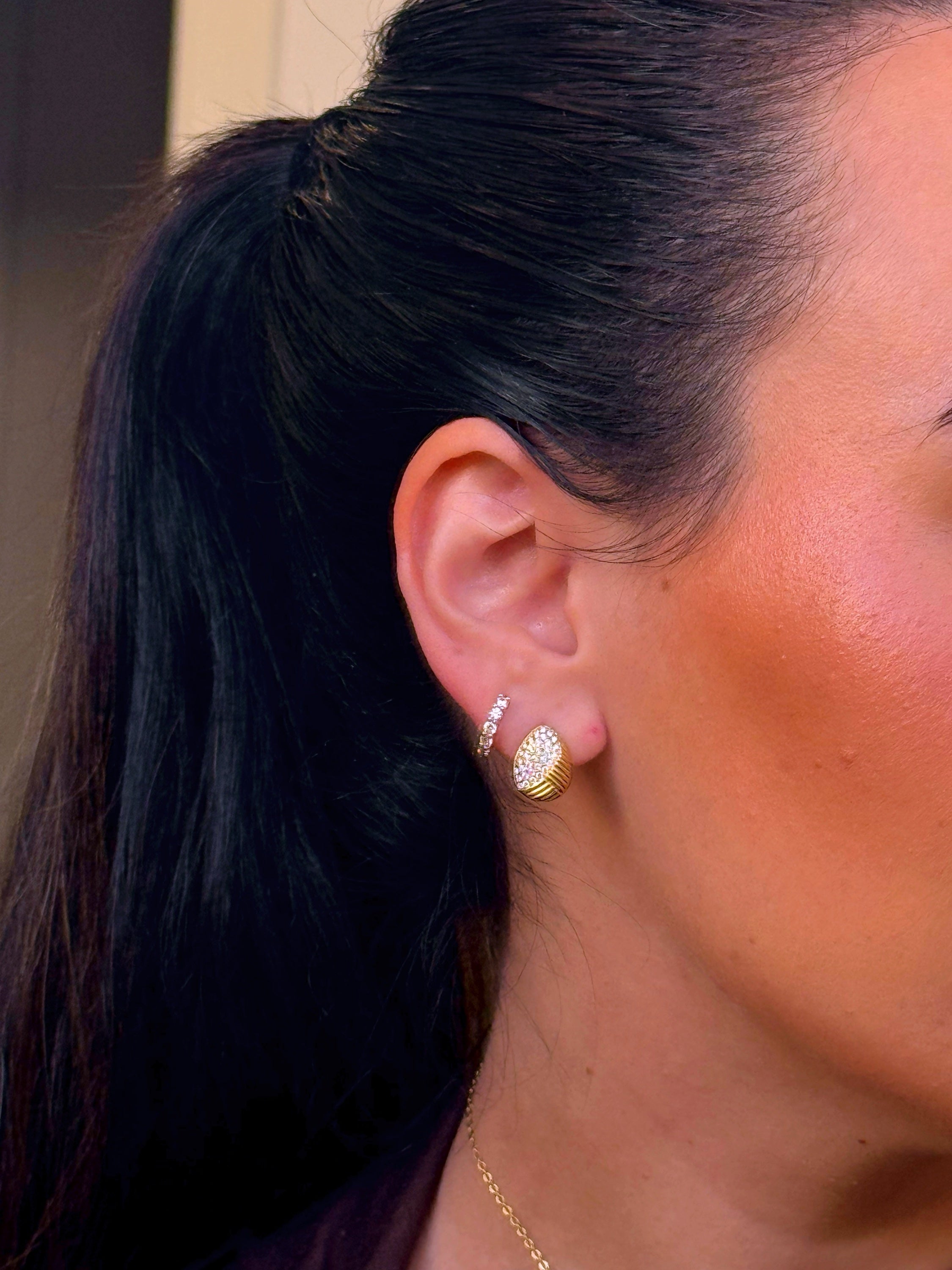 Brincos elegantes com ondinhas em relevos, formato gota, e preenchidos com brilhantes.