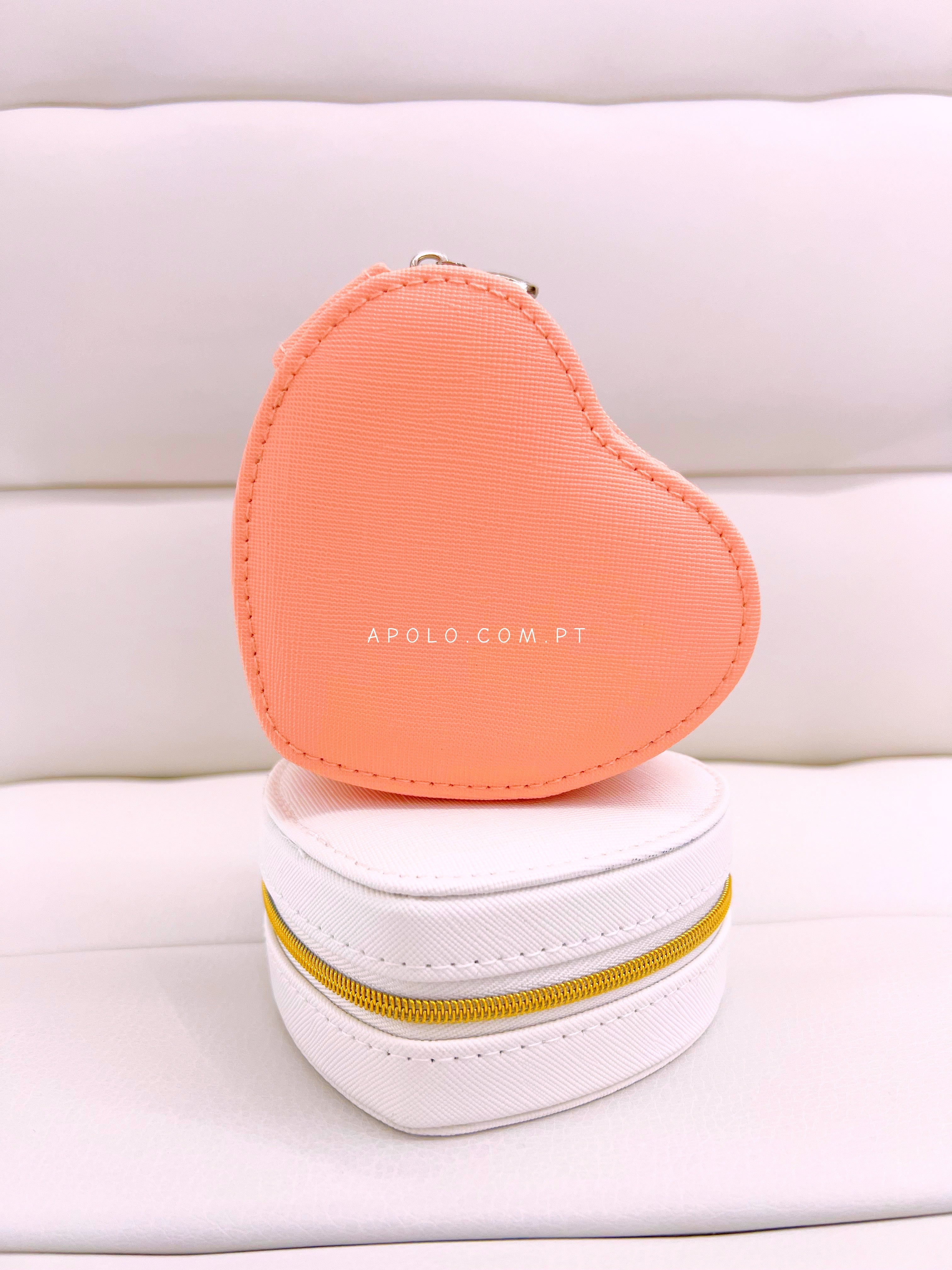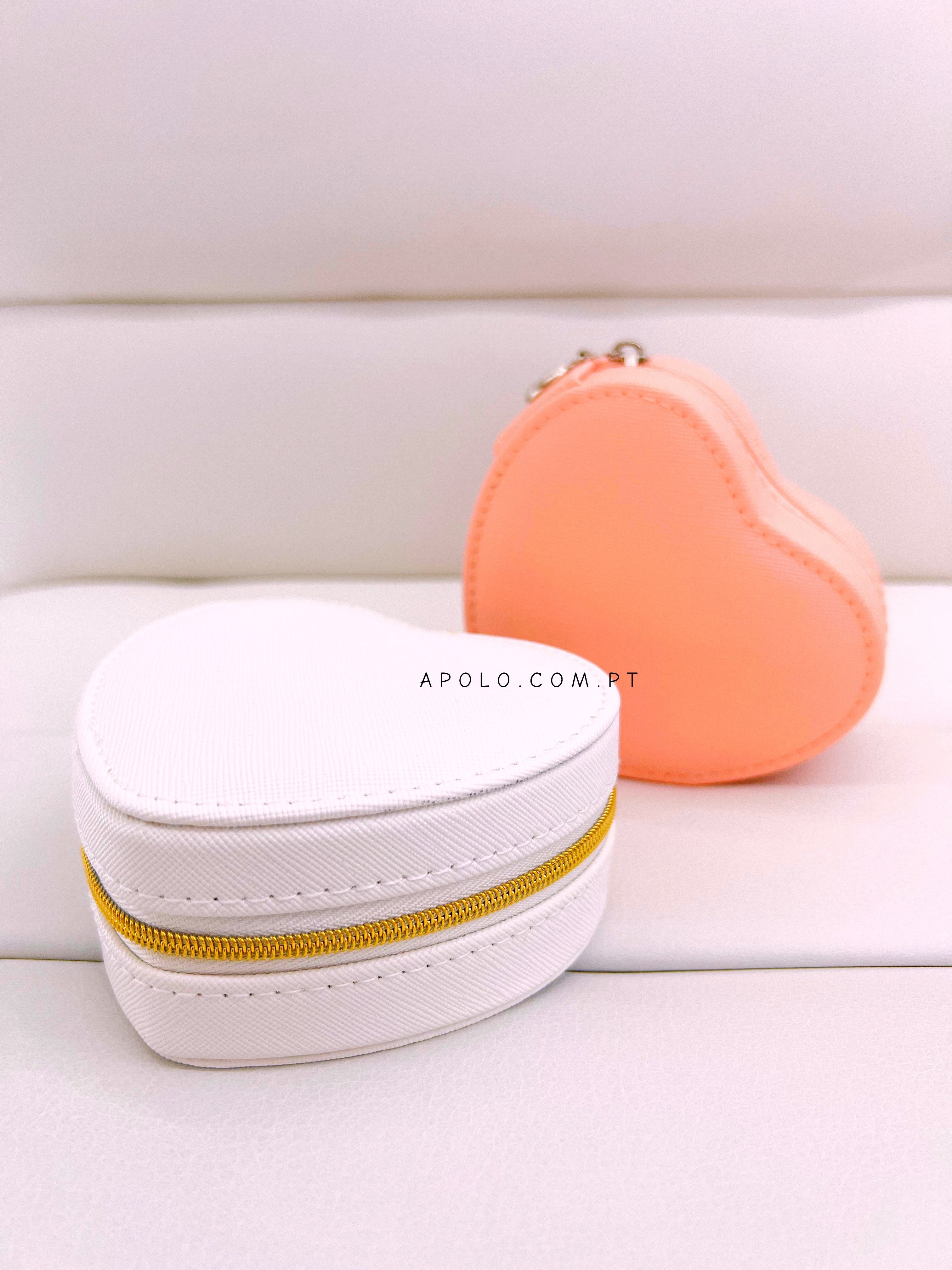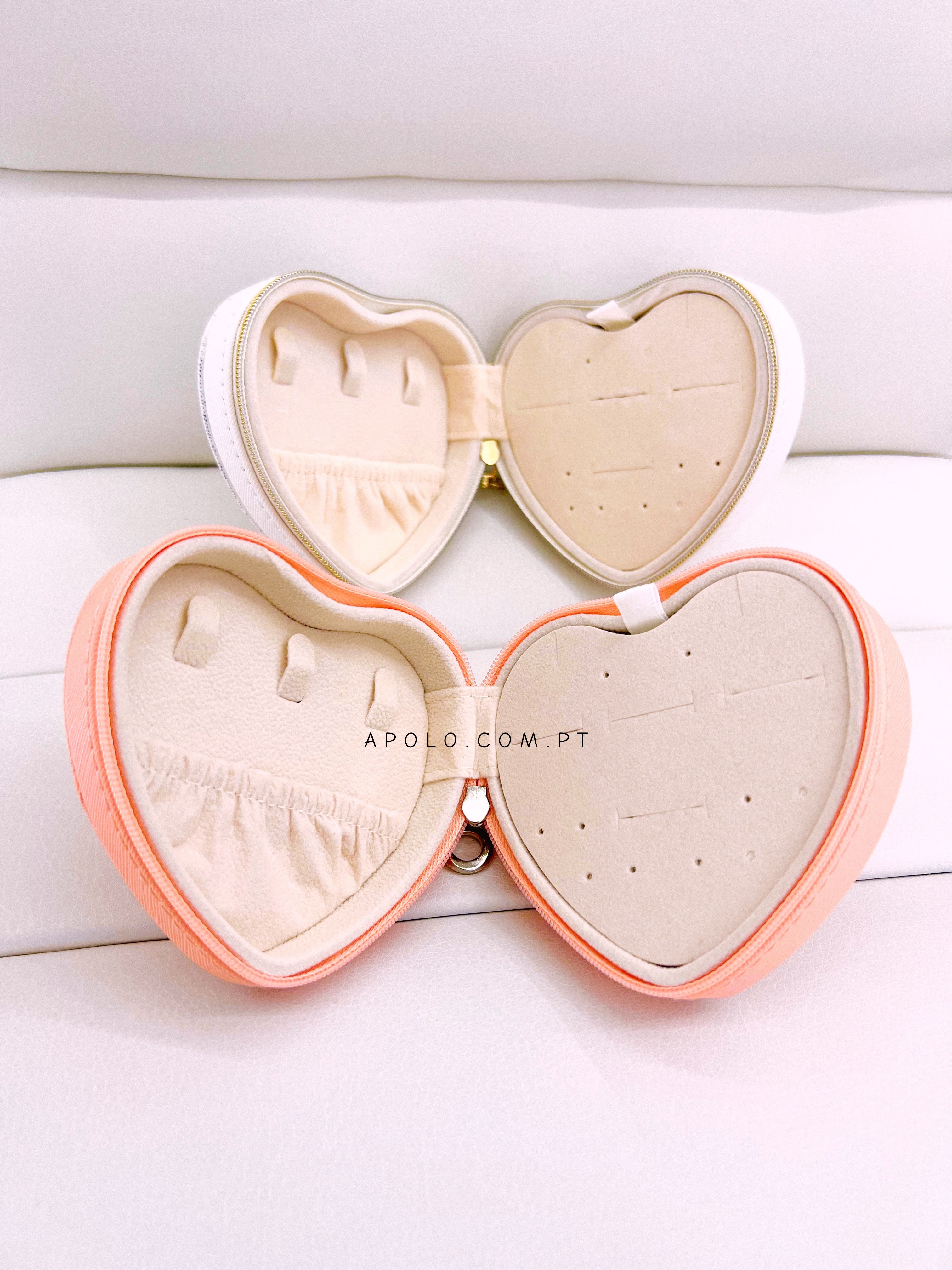 Mini guarda jóias em formato de coração, com vários repartimentos para anéis, colares, brincos e pulseiras.