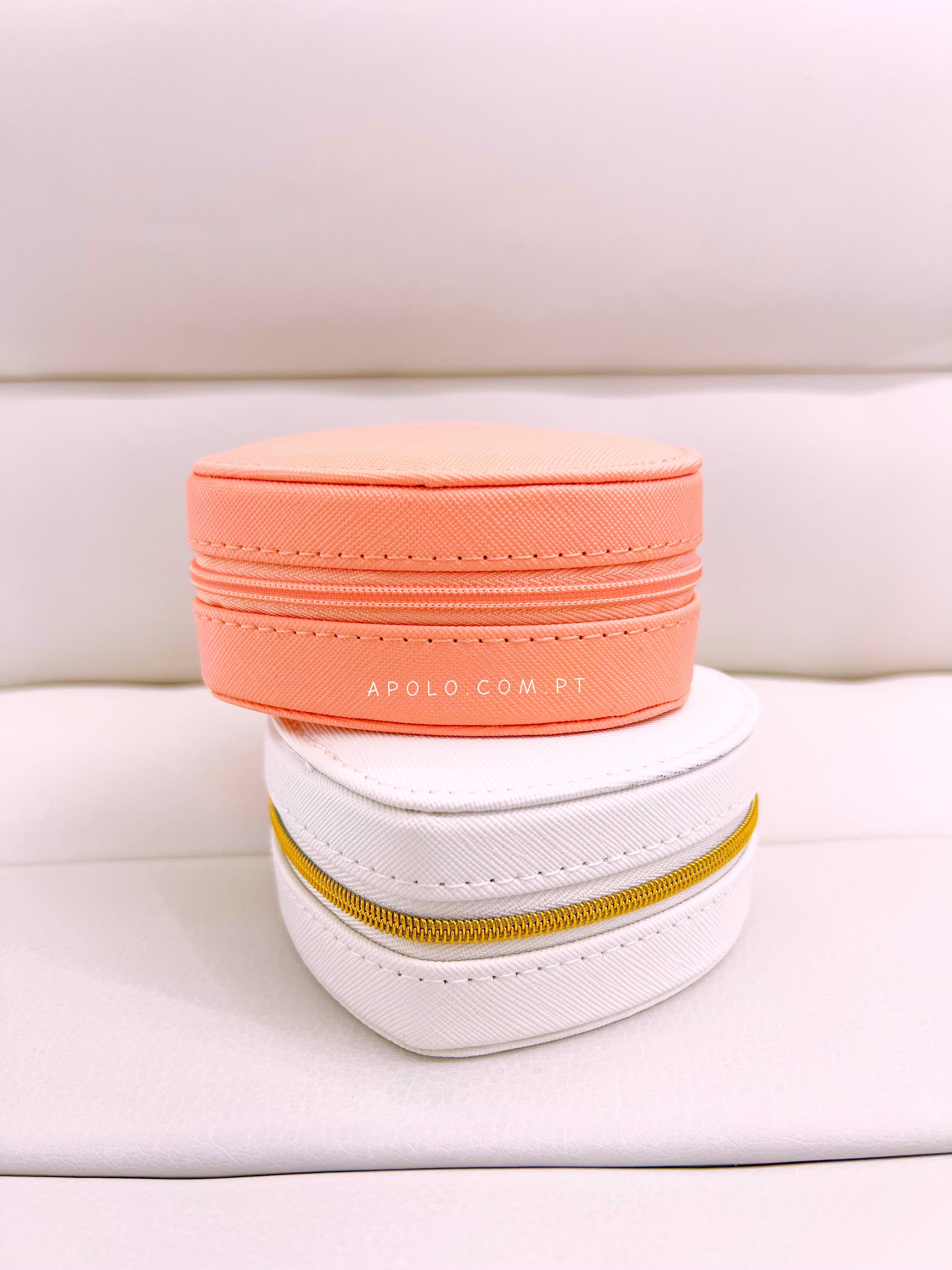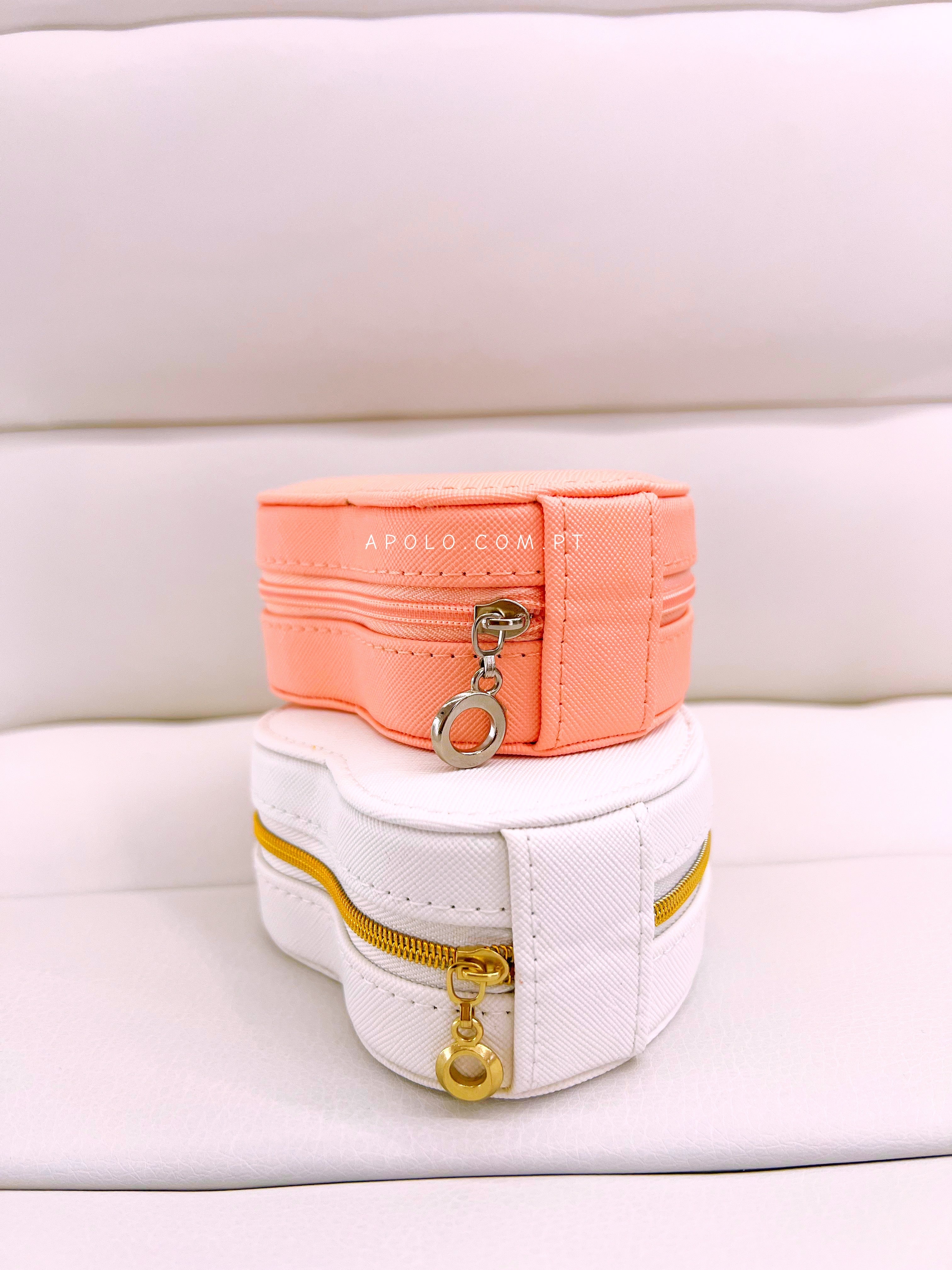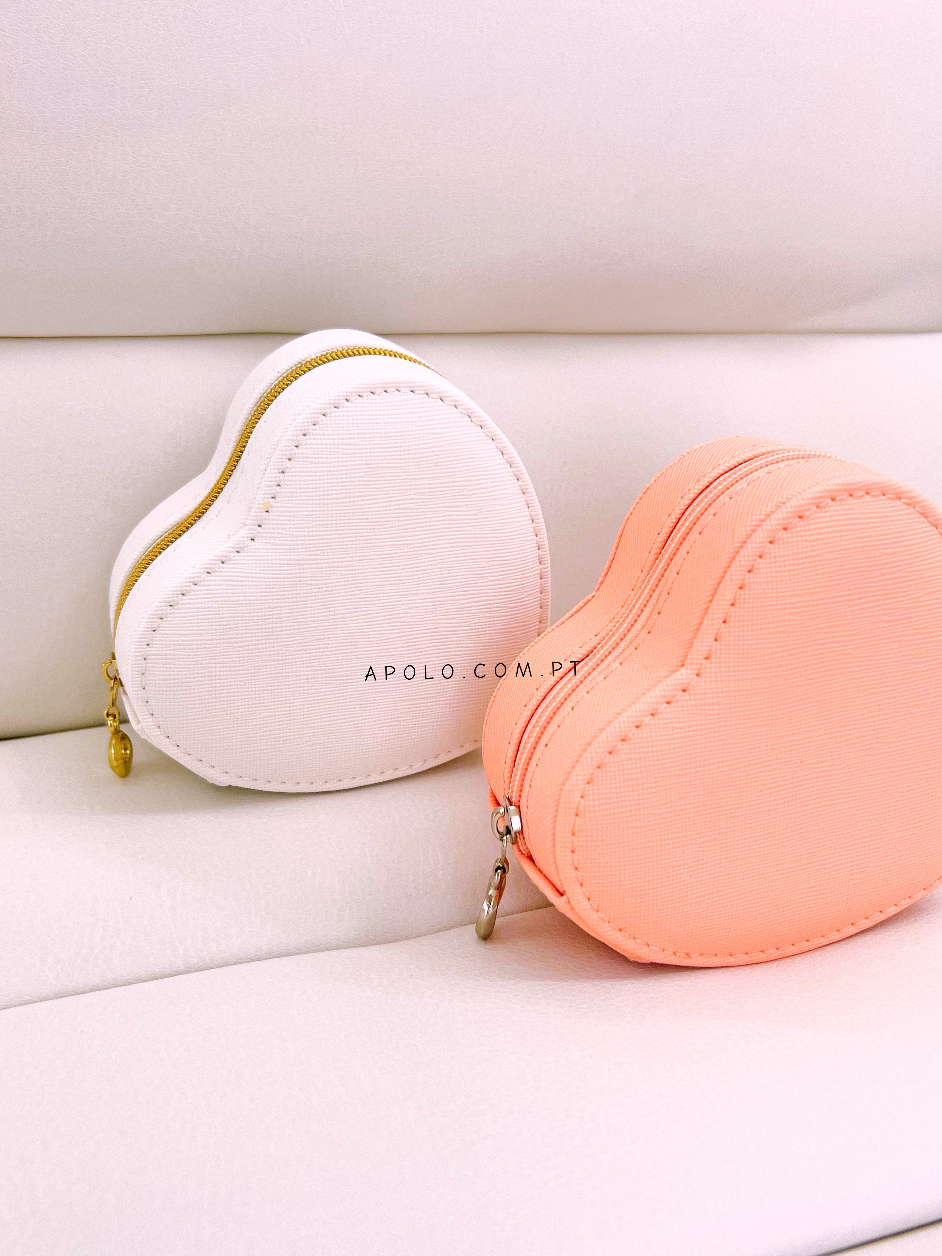 Mini guarda jóias em formato de coração, com vários repartimentos para anéis, colares, brincos e pulseiras.