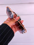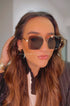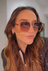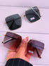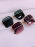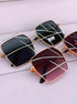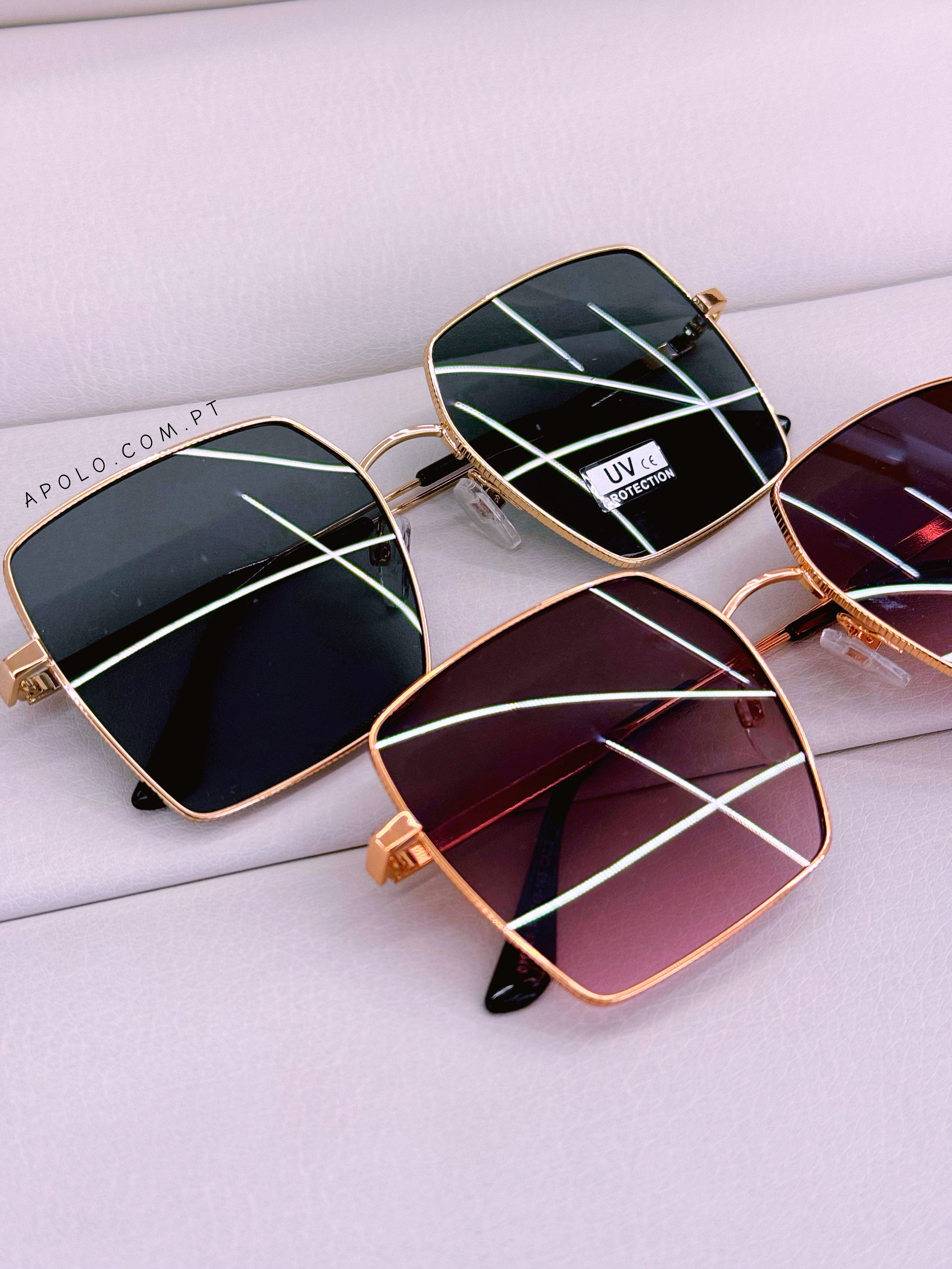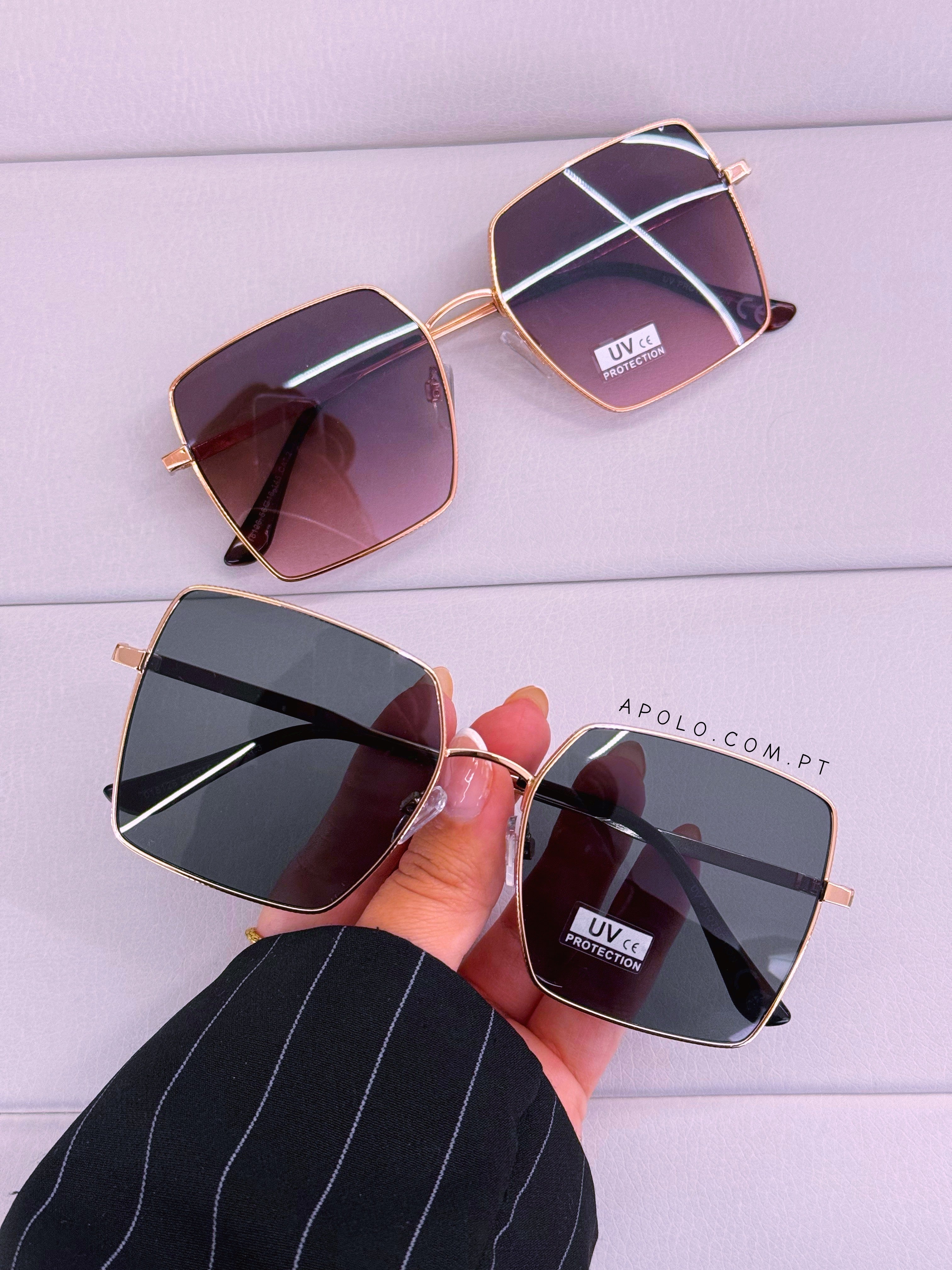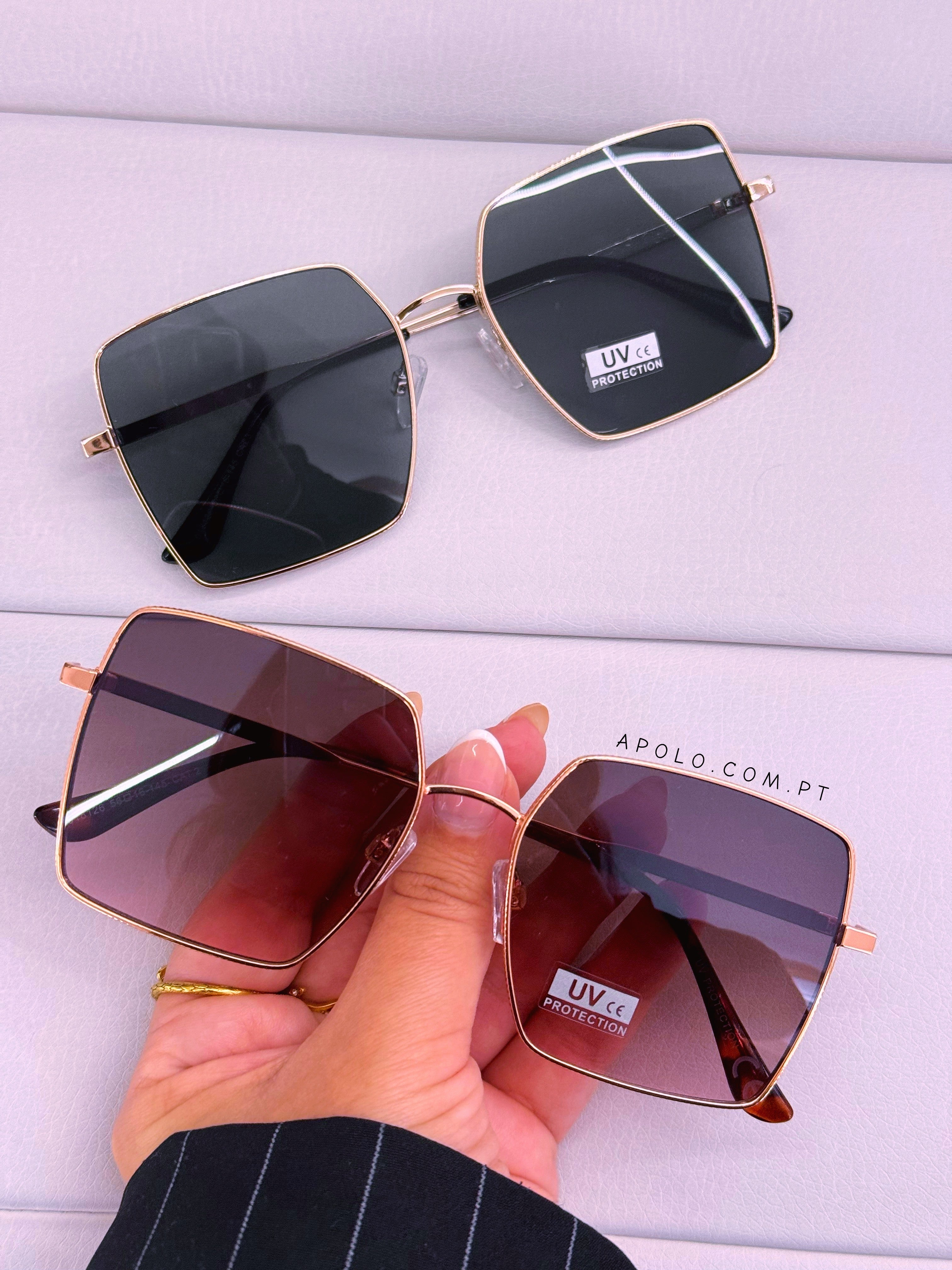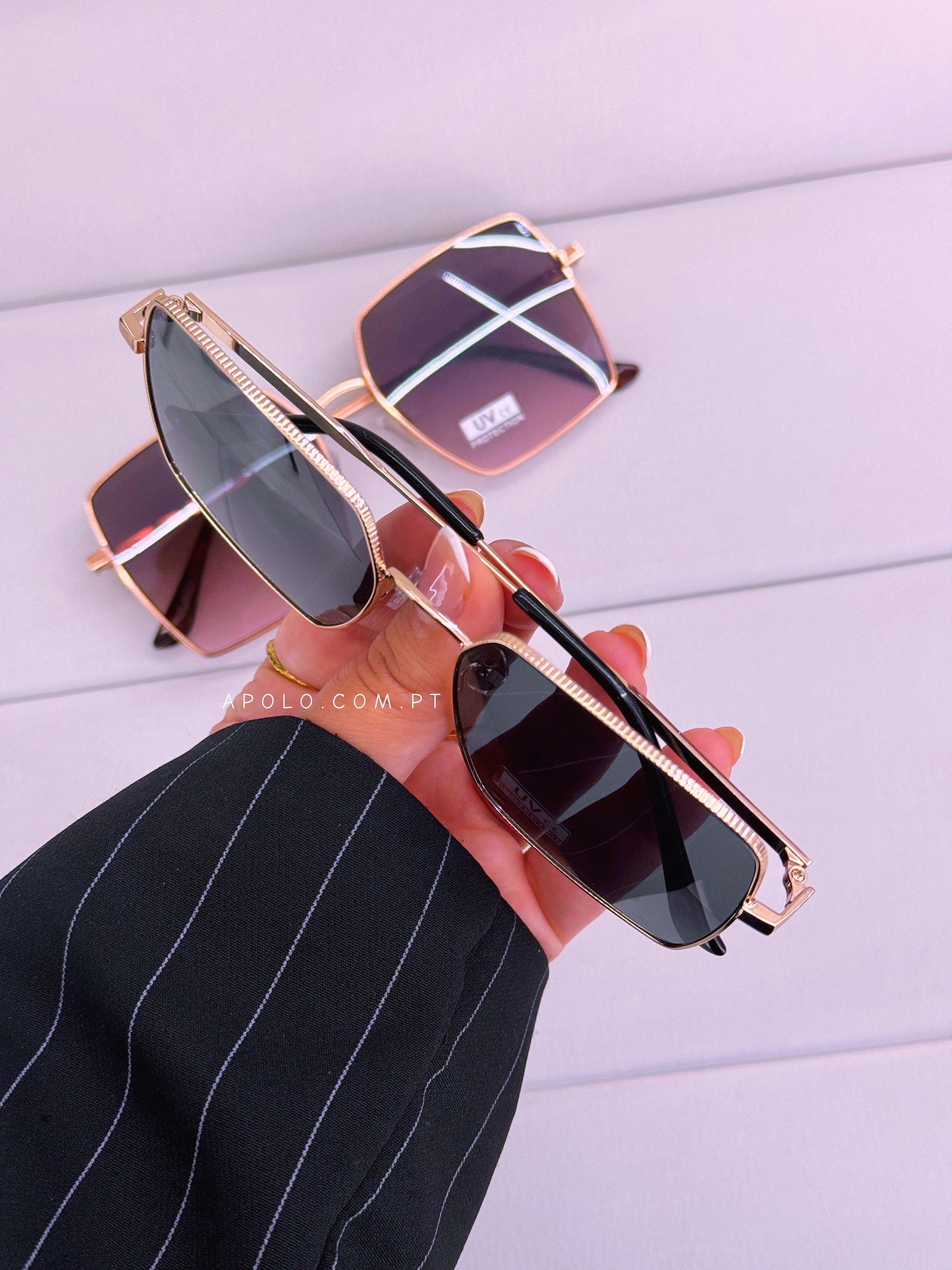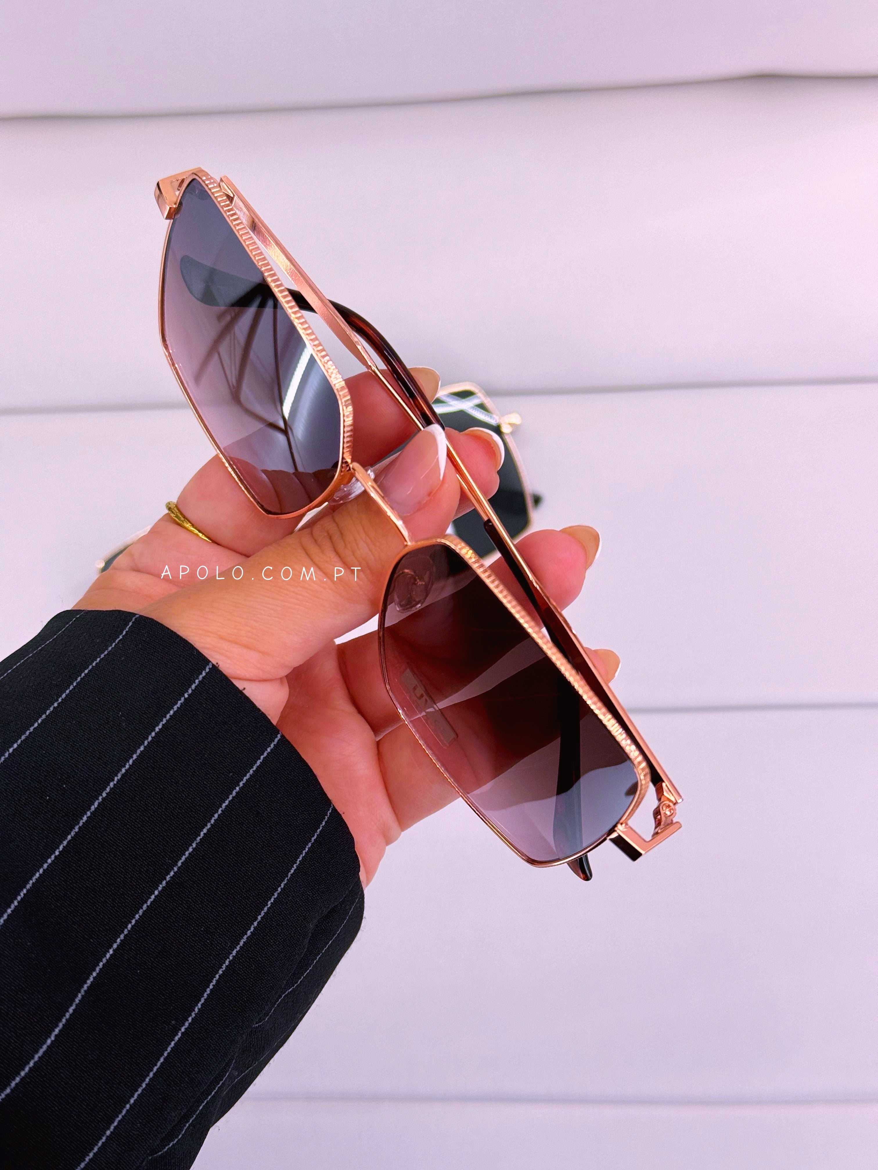 Óculos de metal com armação dourada e lente preta ou armação rose gold e lente com degradê rosa.