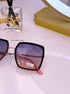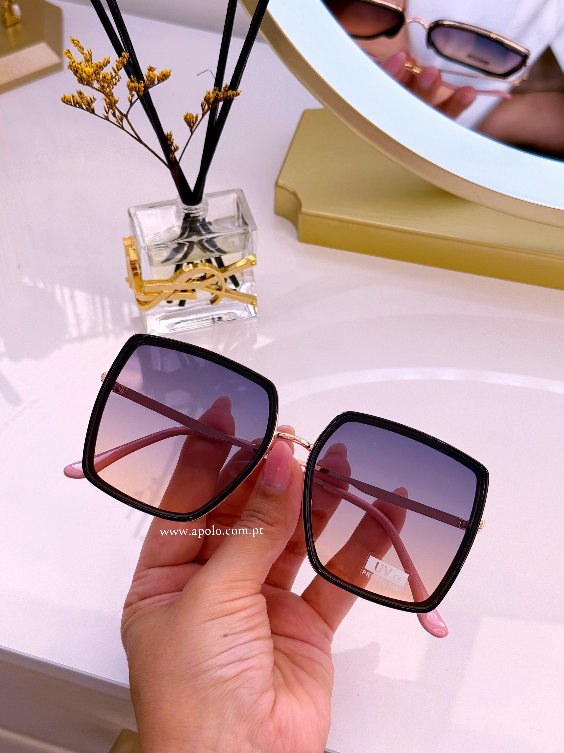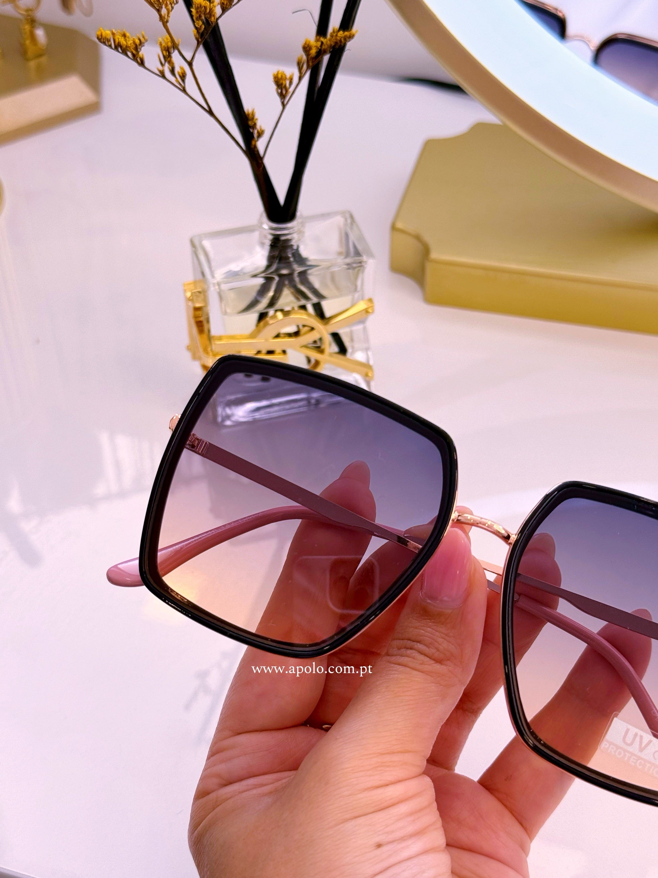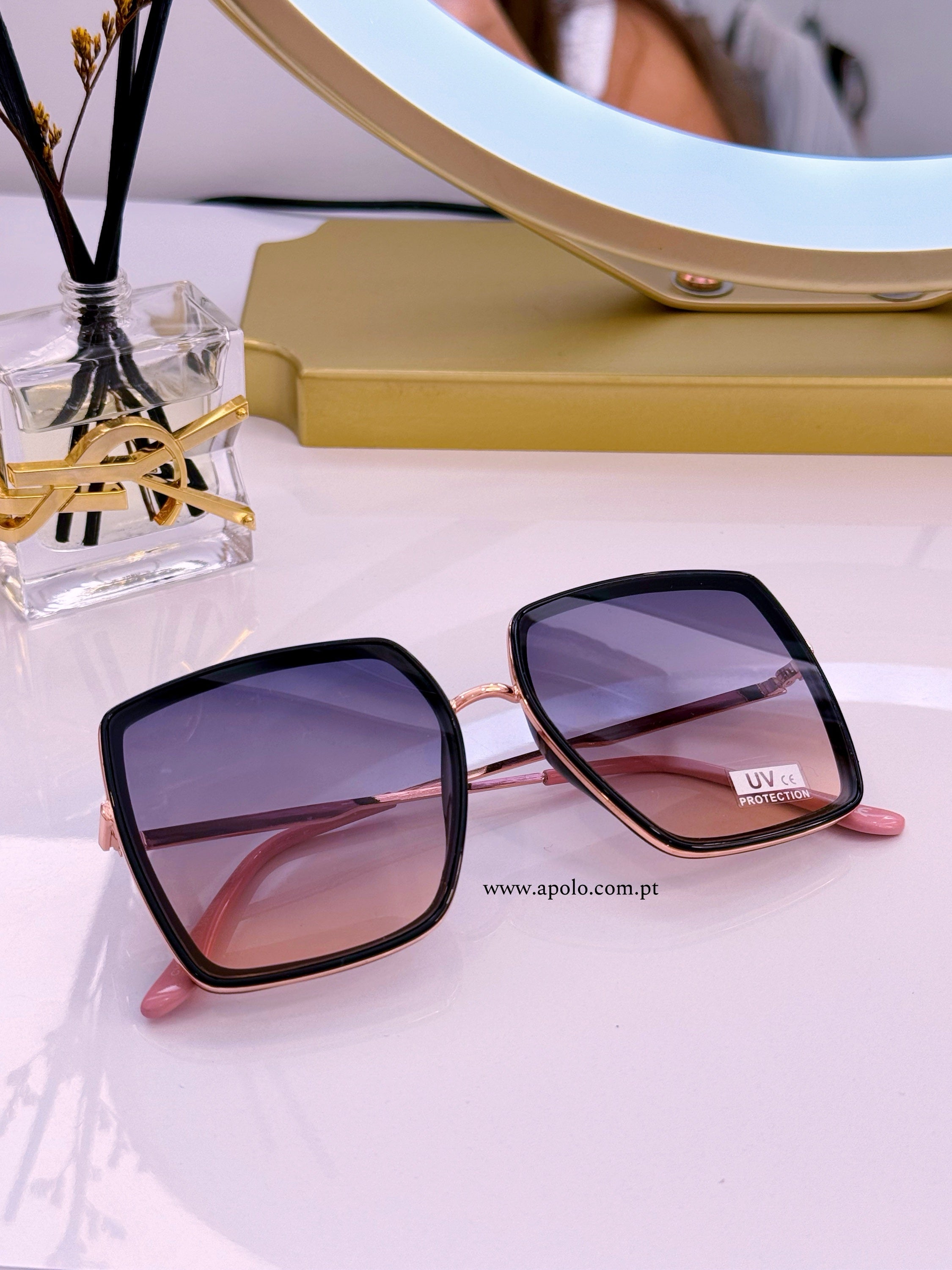Óculos com armação em massa e metal rose gold e preto, com lente degradê azul/rosado.