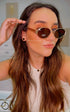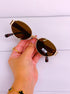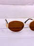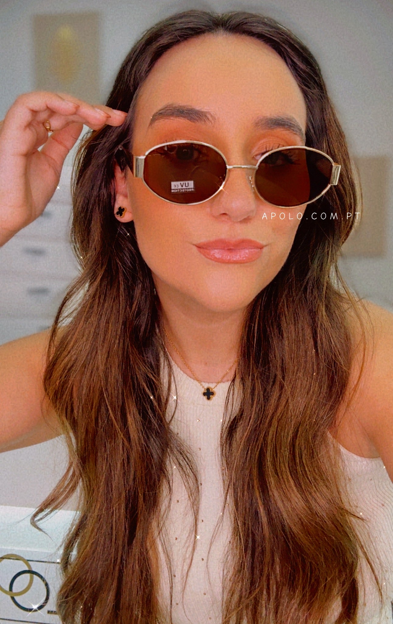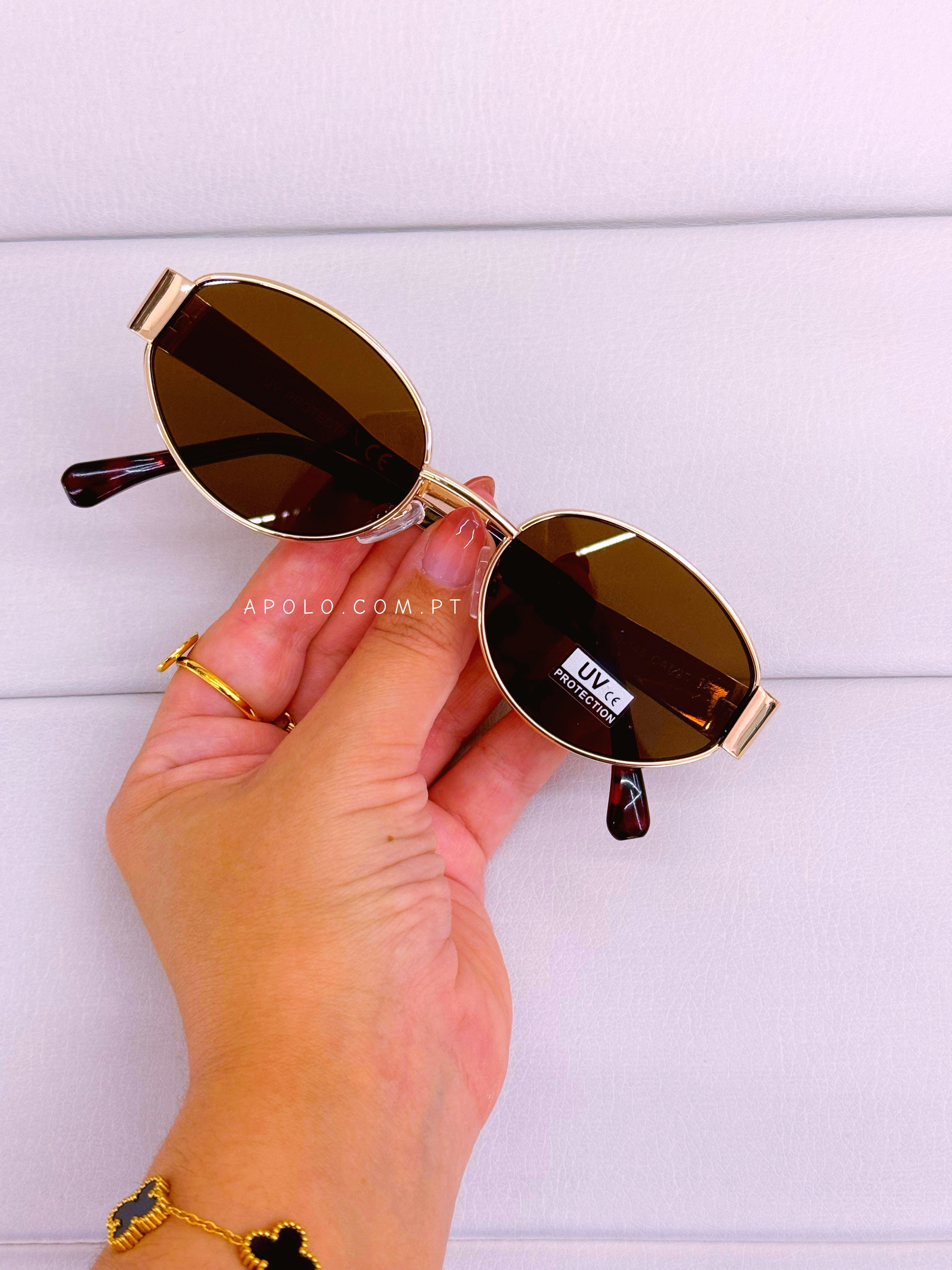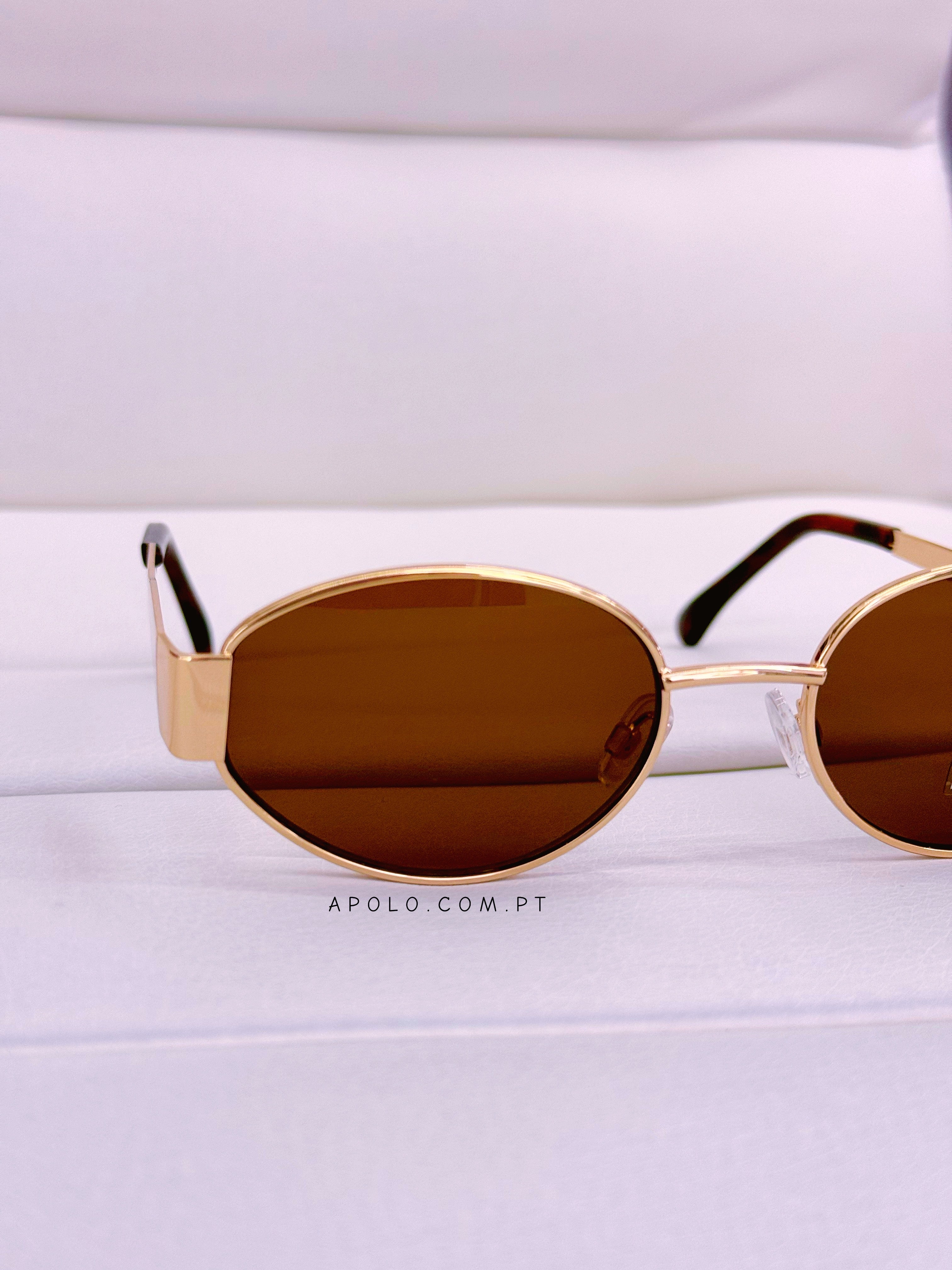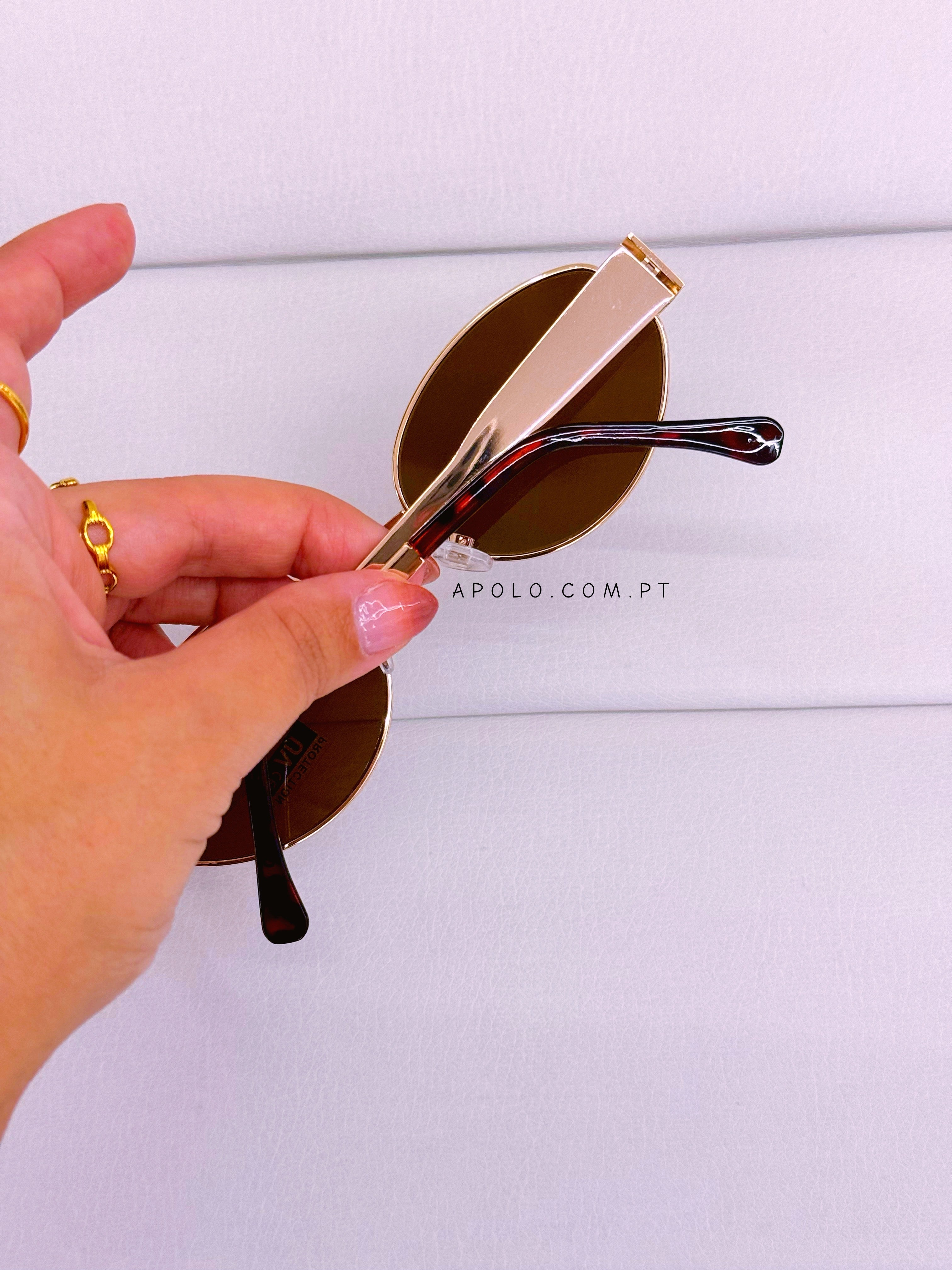 Óculos de metal com lente oval de cor castanha e armação dourada clara.