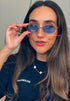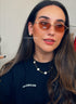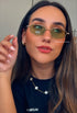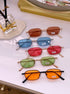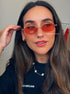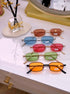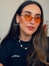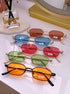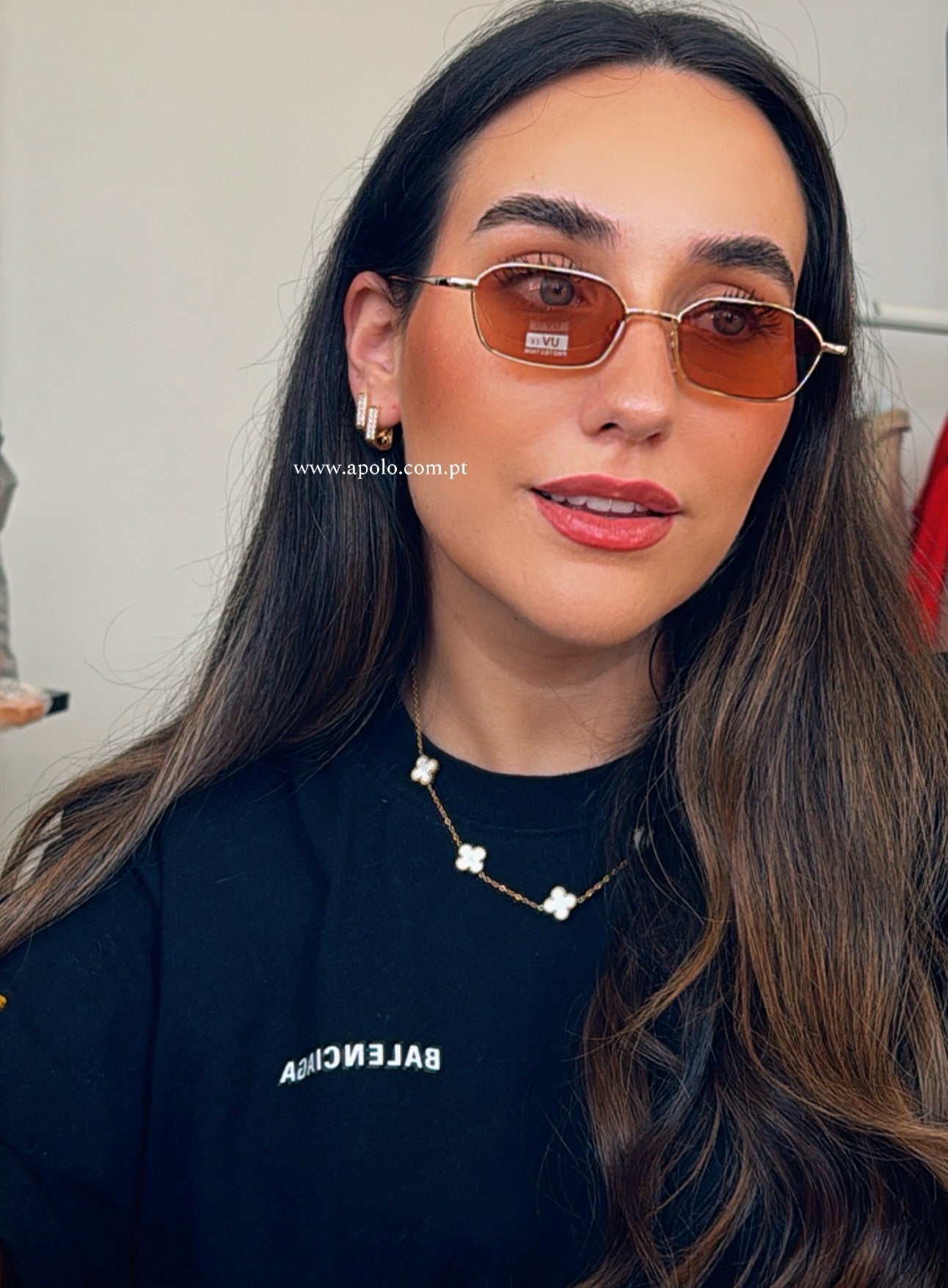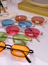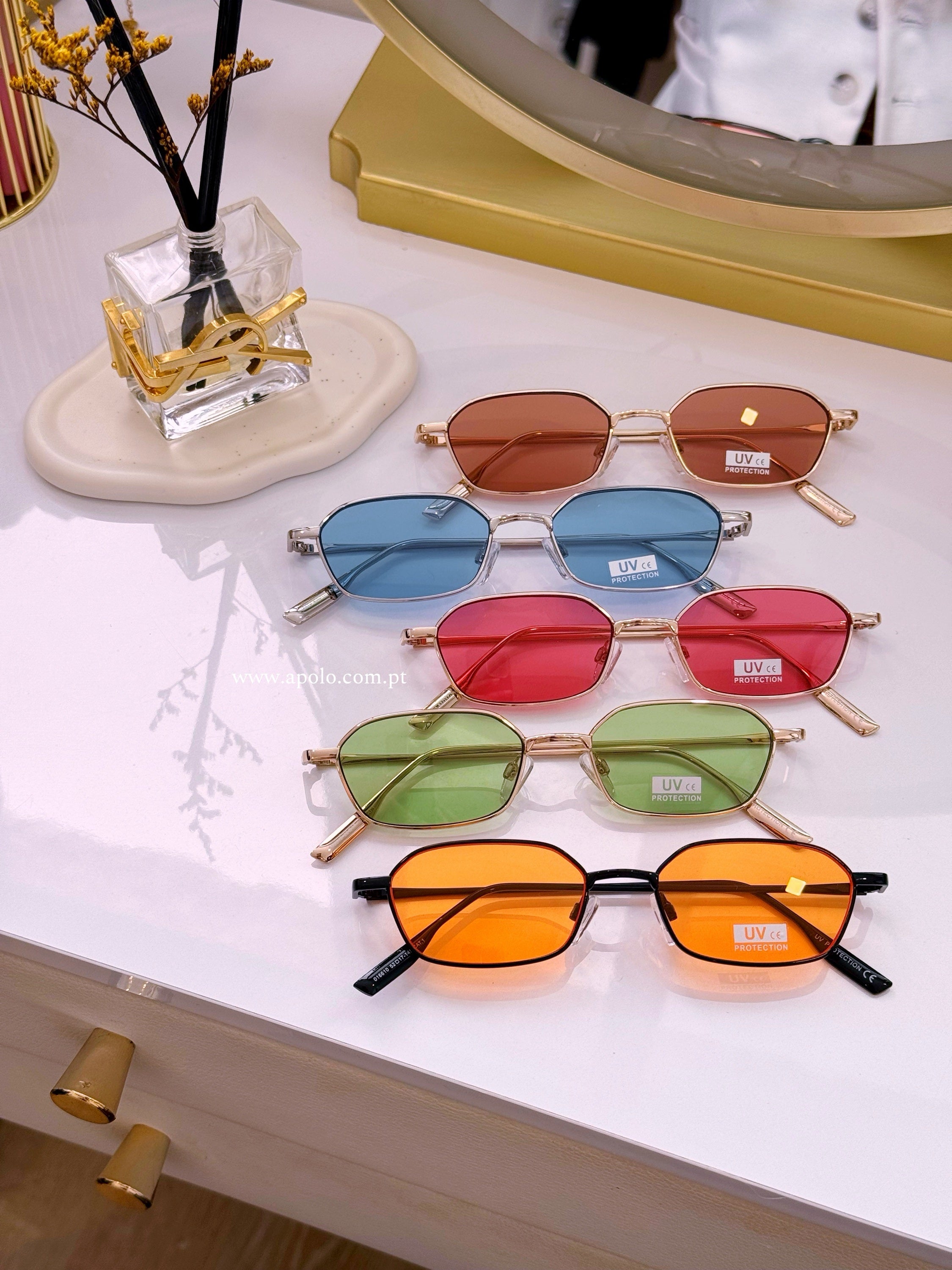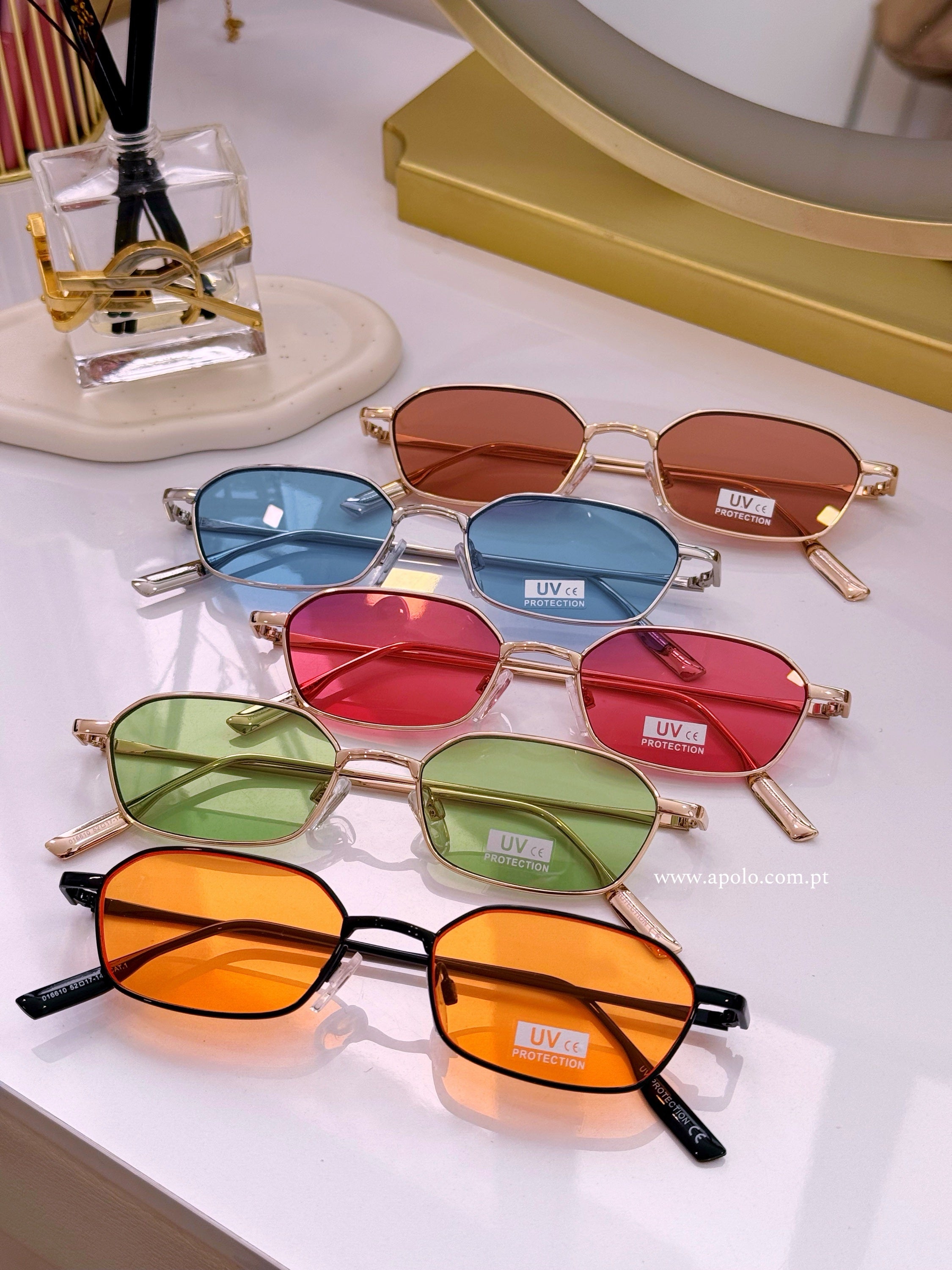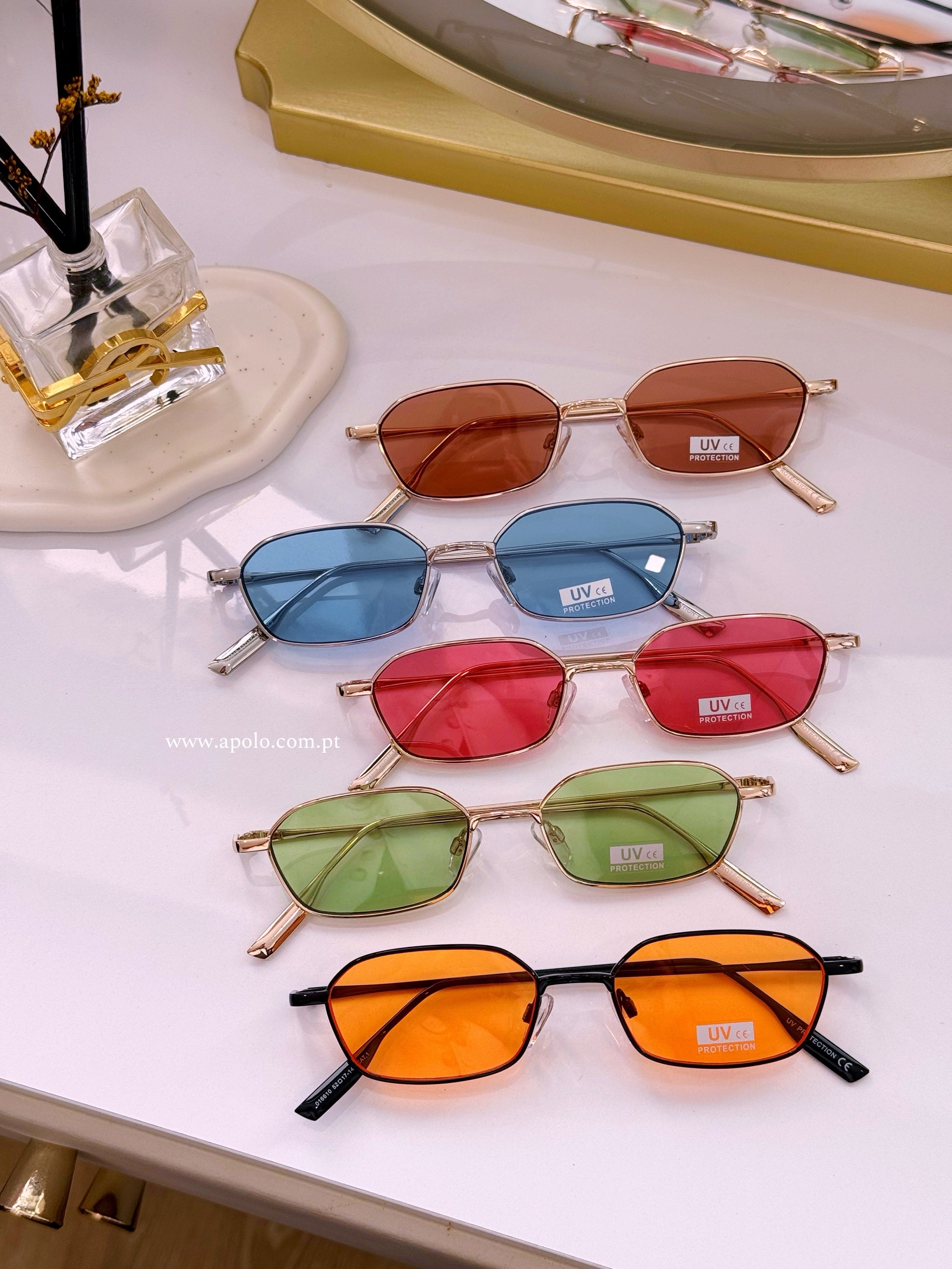 Óculos pequenos com hastes de metal e com lentes coloridas.