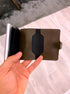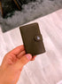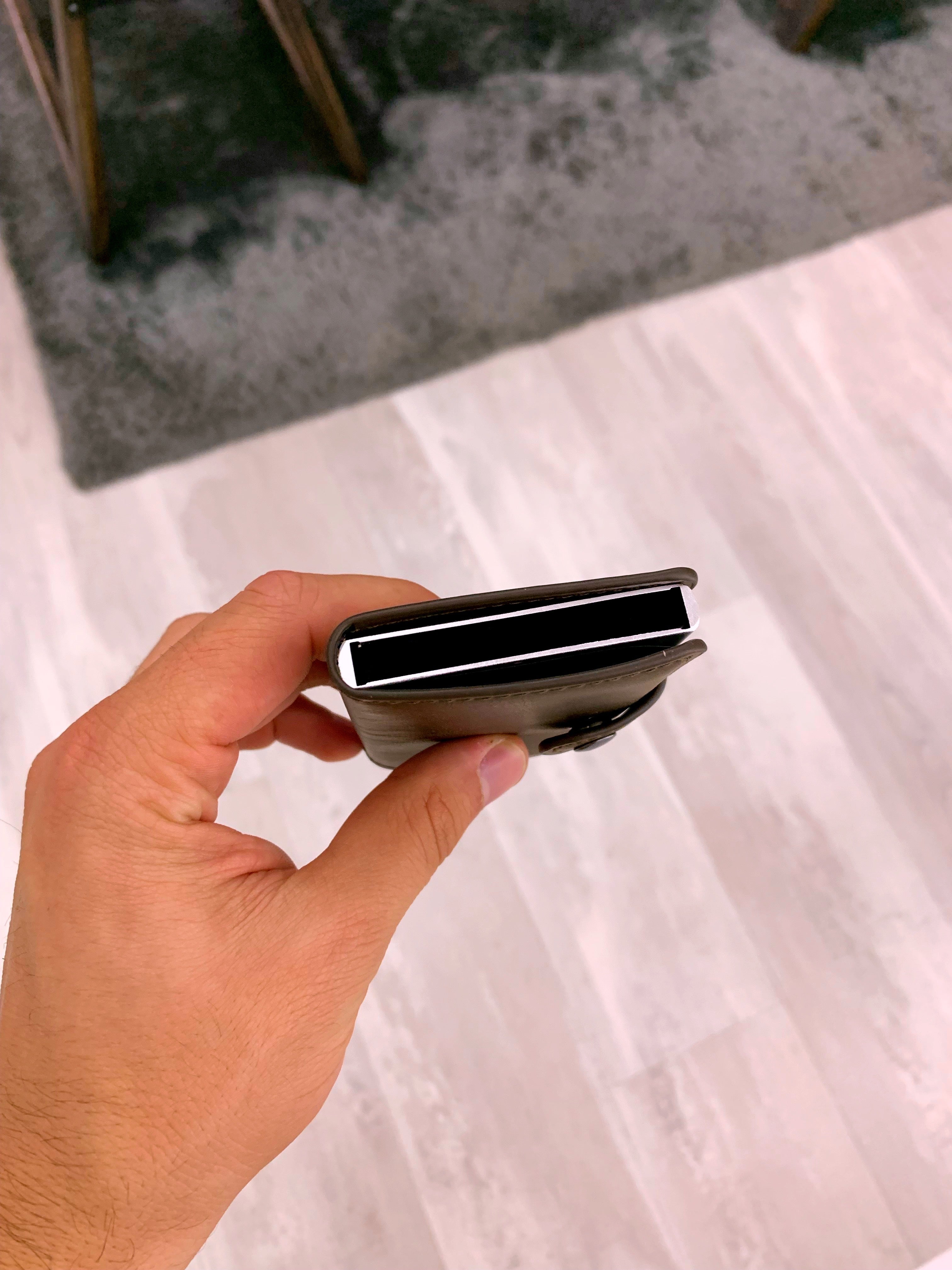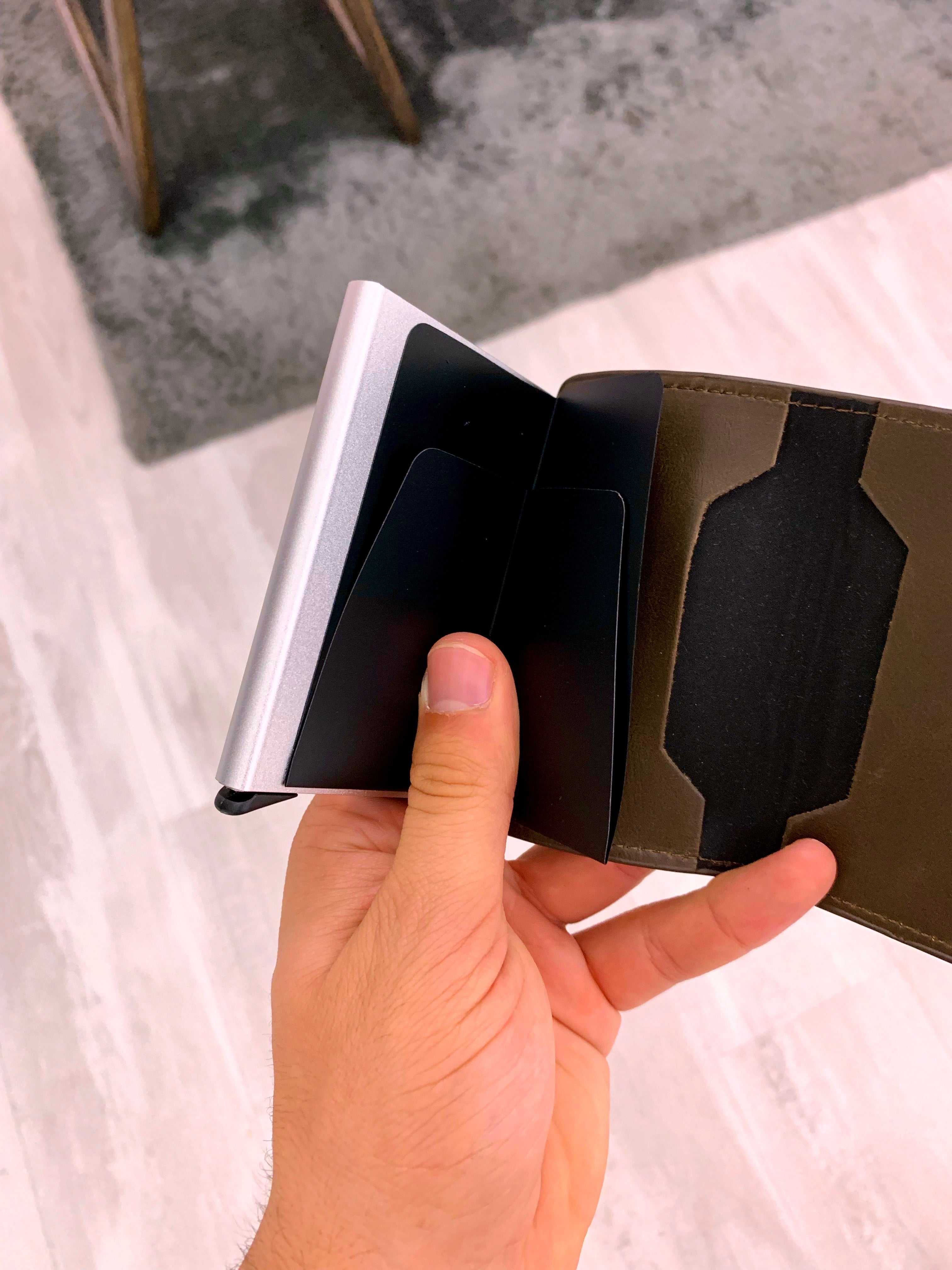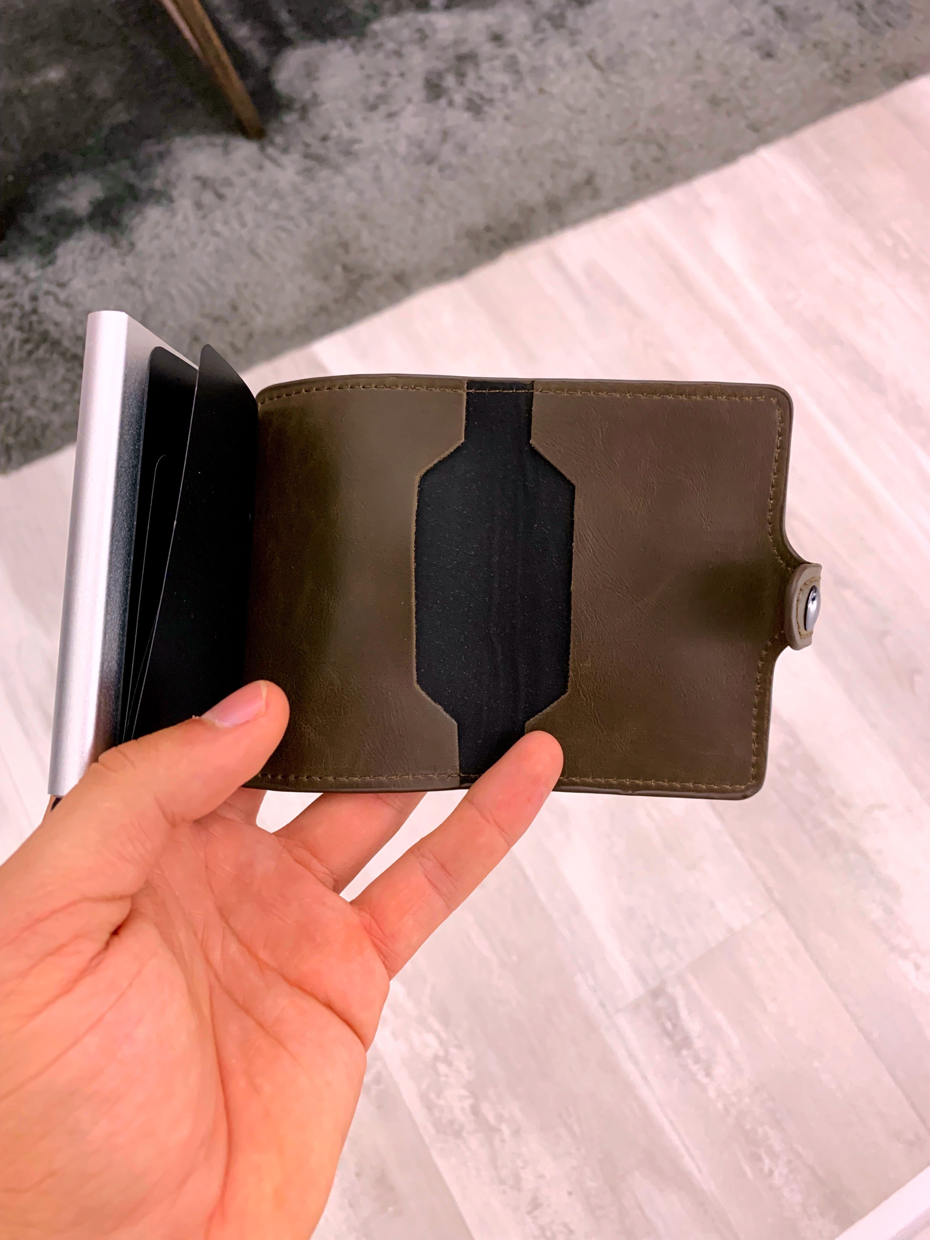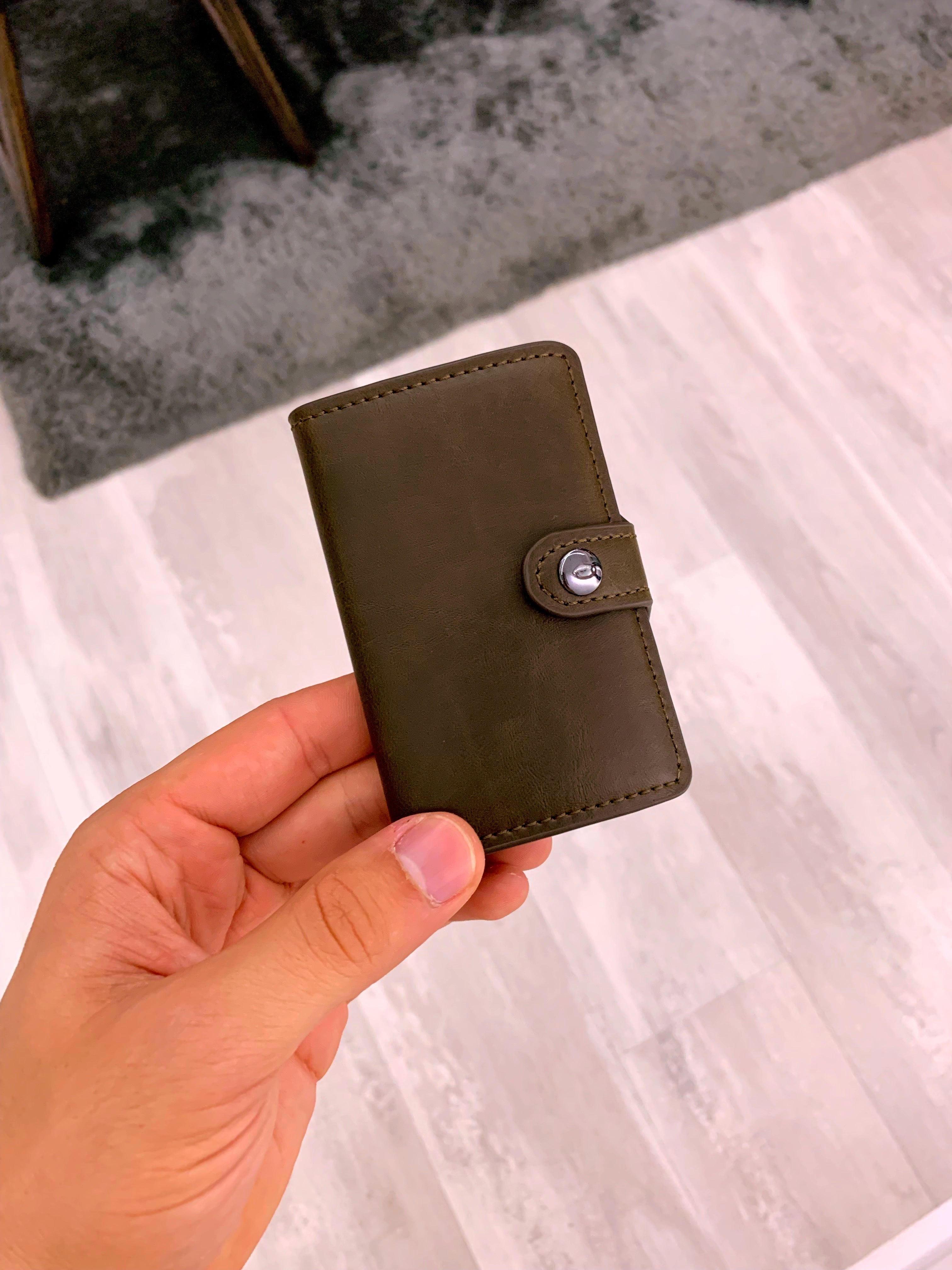 Porta cartões em formato de caixa de metal para cartões com capa e fecho de mola.