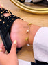 Pulseira de pé corrente com pendentes ligados à praia/mar: uma conchinha, uma parte de sereia, uma estrela, um coração e uma pedrinha em tons bege.